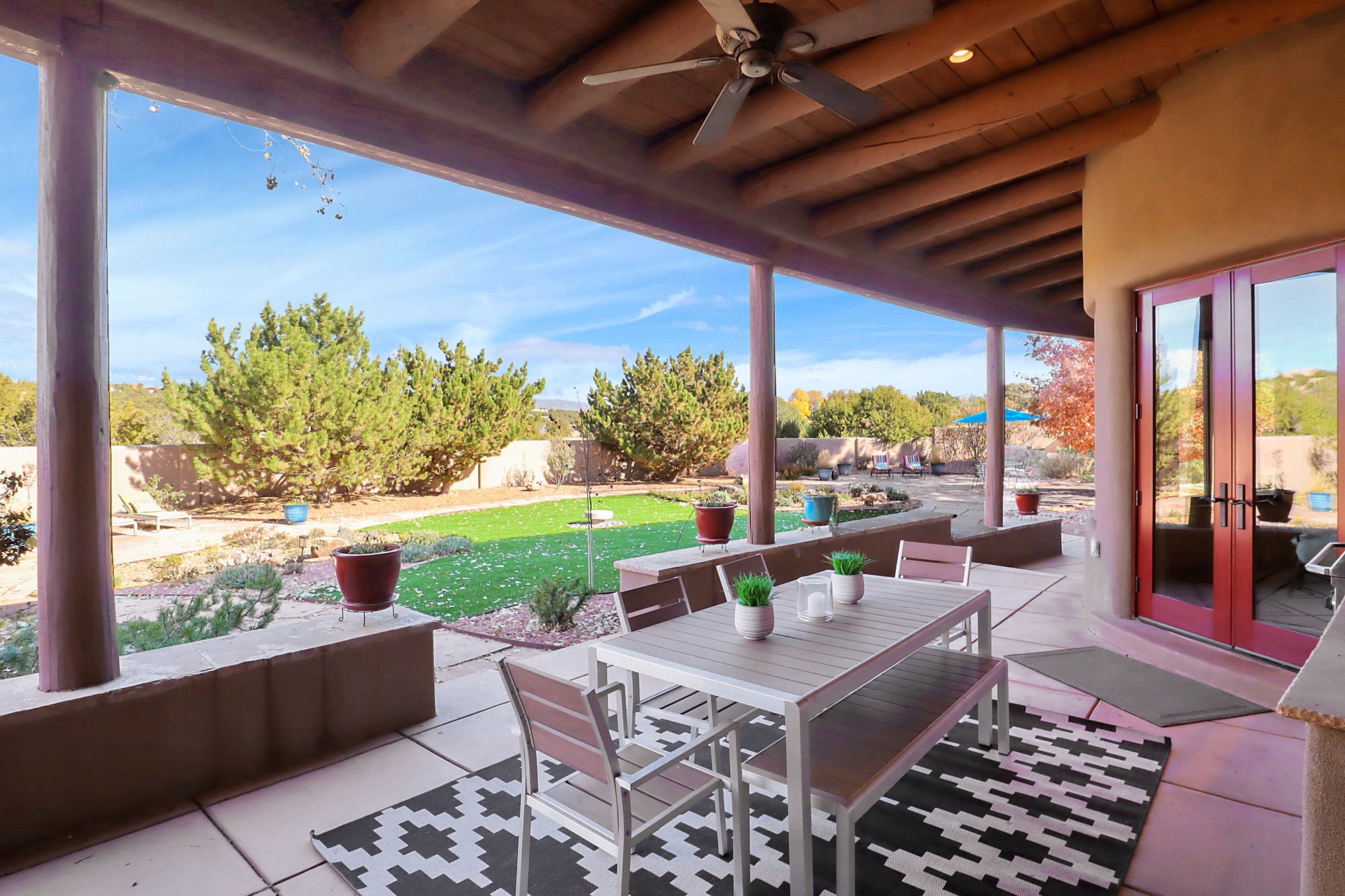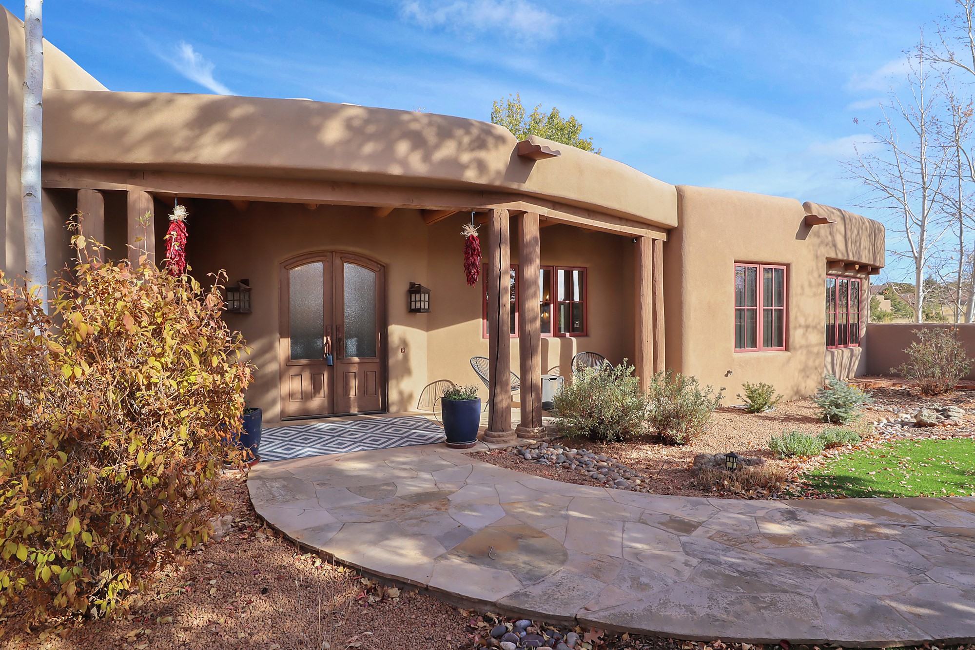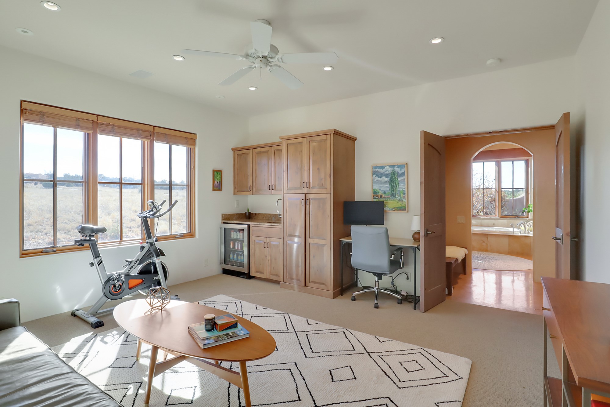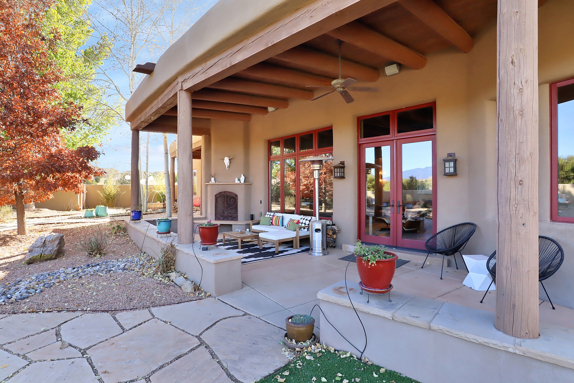 Discover an air of sophistication in this 4-bedroom, 4.5-bathroom residence spanning over 4,000 sq ft, including an executive office and charming attached casita, all nestled on 3 .5 acres in the serene enclave of Tierra Preciosa. Magnificent views of the Sangre de Cristo and Jemez mountains add a touch of splendor throughout the home. A spacious portal beckons you to the backyard oasis with an outdoor kitchen and fireplace that provides an idyllic setting for stylish and comfortable entertaining. Inside, the living room and master bedroom fireplaces, coupled with vigas and beams, infuse the ambiance with warmth and charm. The master suite boasts an adjoining flexible living space with a wet bar, complemented by a spacious master bath and walk-in closet. The generously appointed chef's kitchen, equipped with high-end appliances and a built-in hutch, transforms hosting into a delightful experience. The attached casita includes a full bath and a kiva fireplace to graciously accommodate visitors or serve as an ideal work-at-home space. Throughout the home, a harmonious blend of stone and natural wood textures enhances the overall design, creating an aesthetic of timeless luxury with modern features. Practical amenities abound, including a three-car heated garage, spacious closets, lighted niches, a well-equipped laundry room with plenty of storage and a sink, a walk-in pantry, ensuite bathrooms in every bedroom, integrated stereo speakers throughout. Radiant in-floor heating and central A/C provide year-round comfort. Notably, there are no HOA dues, and road maintenance is handled by a dedicated REUMA board.