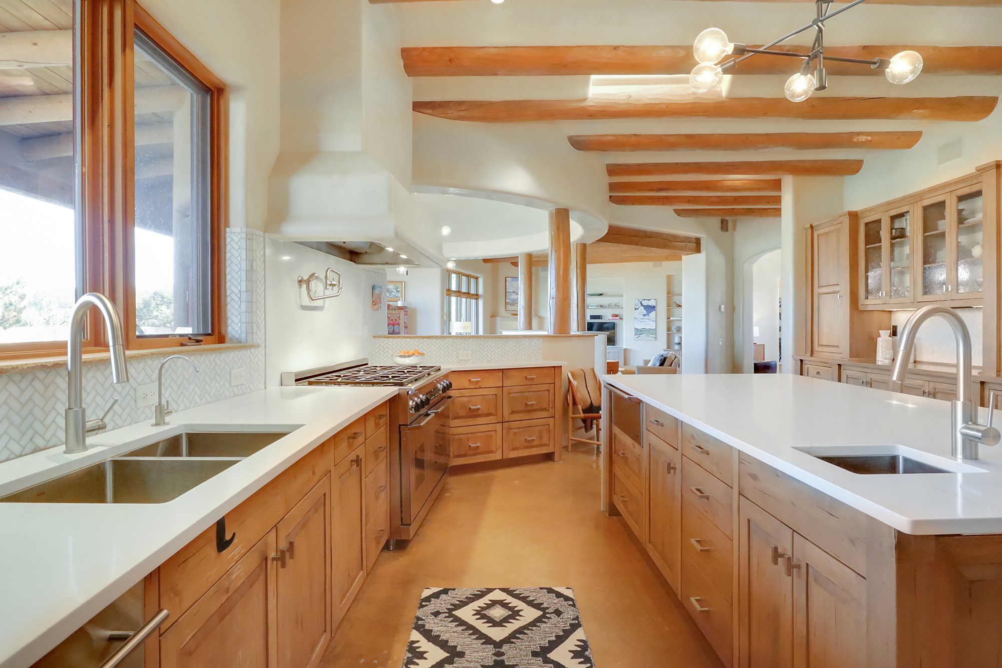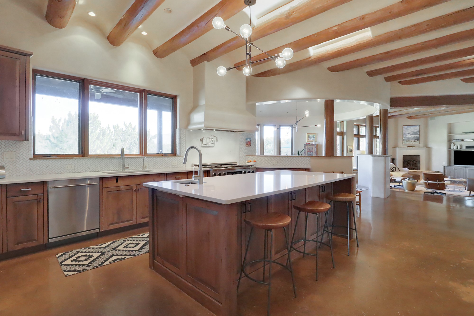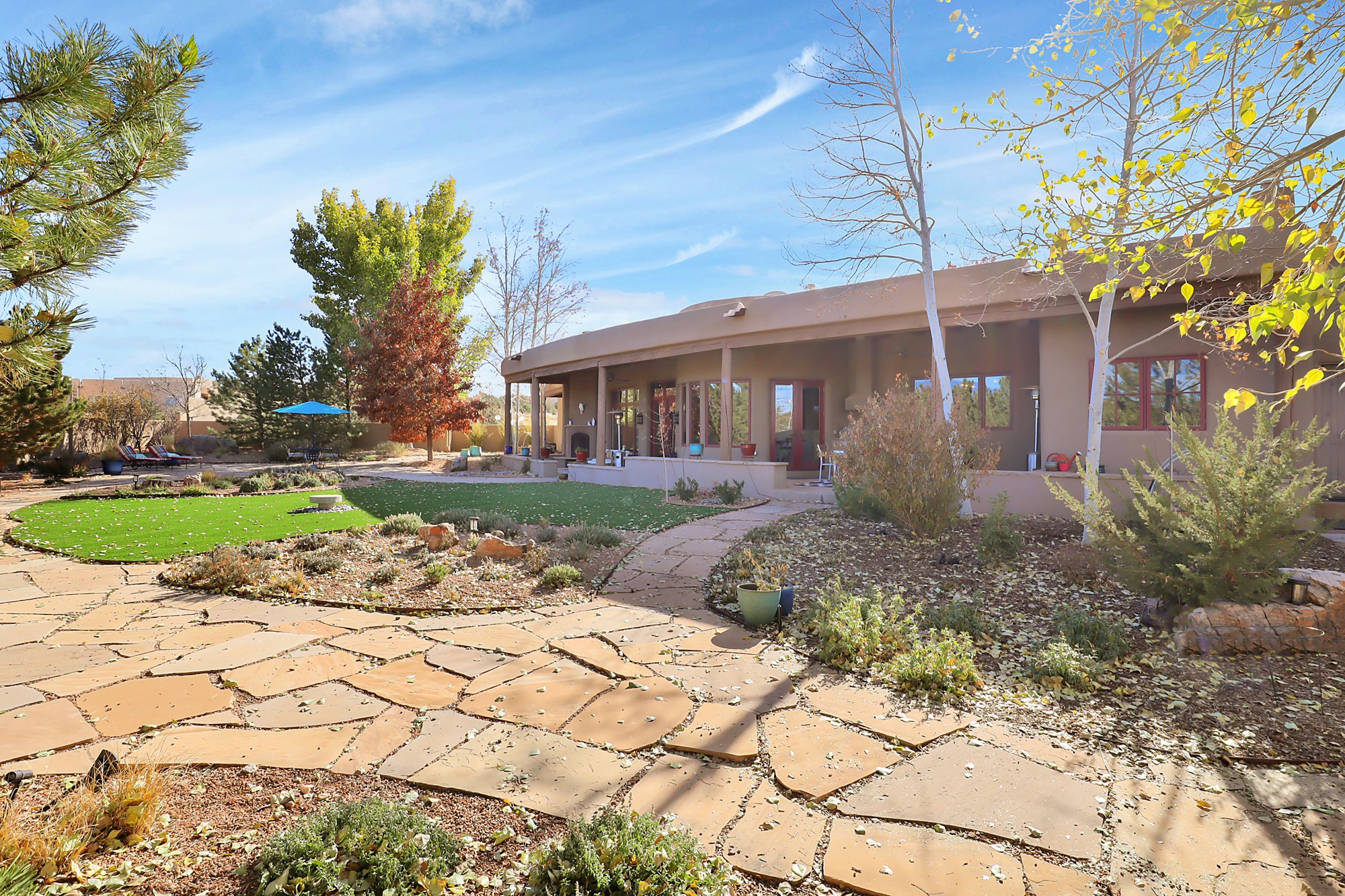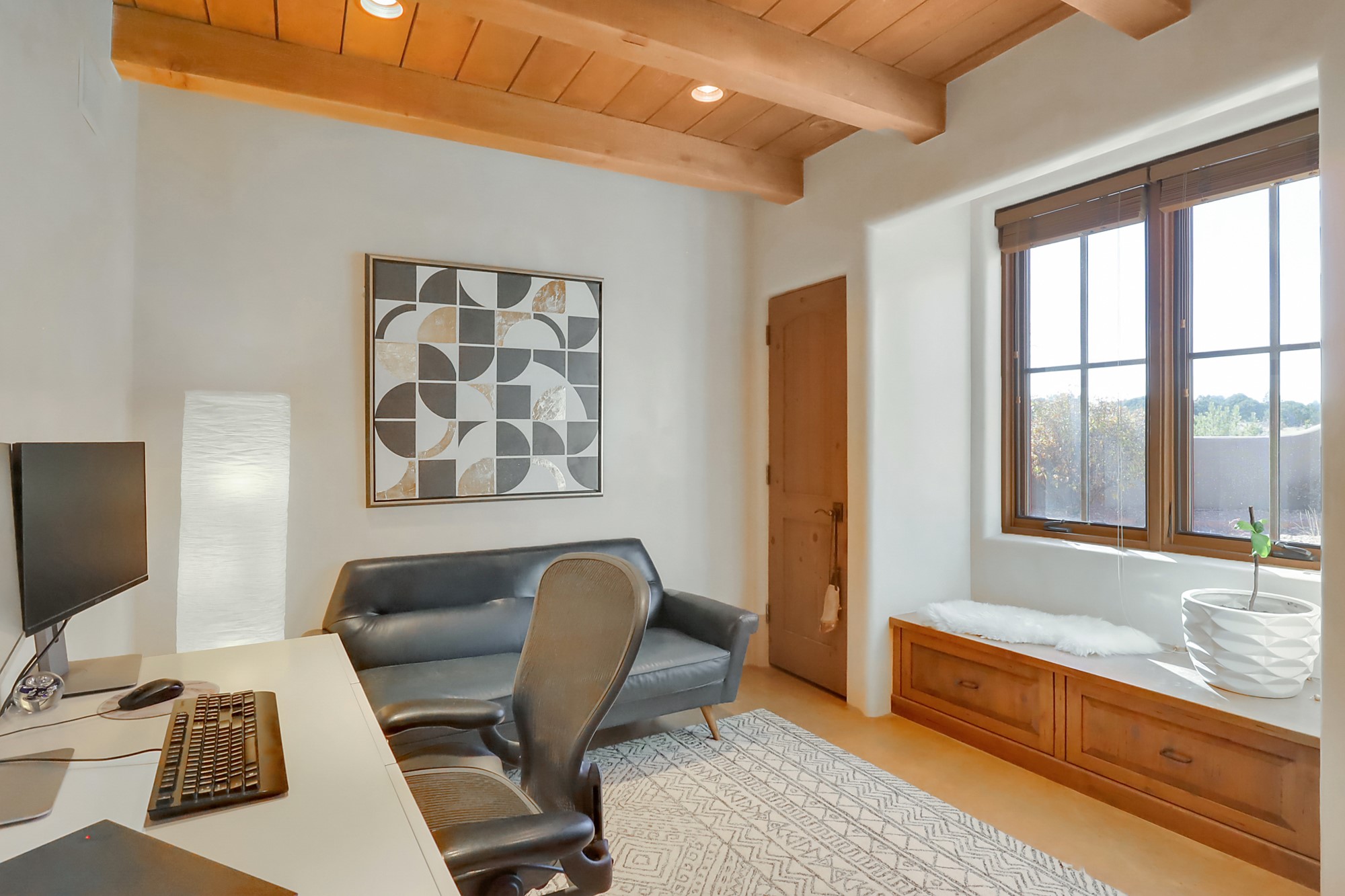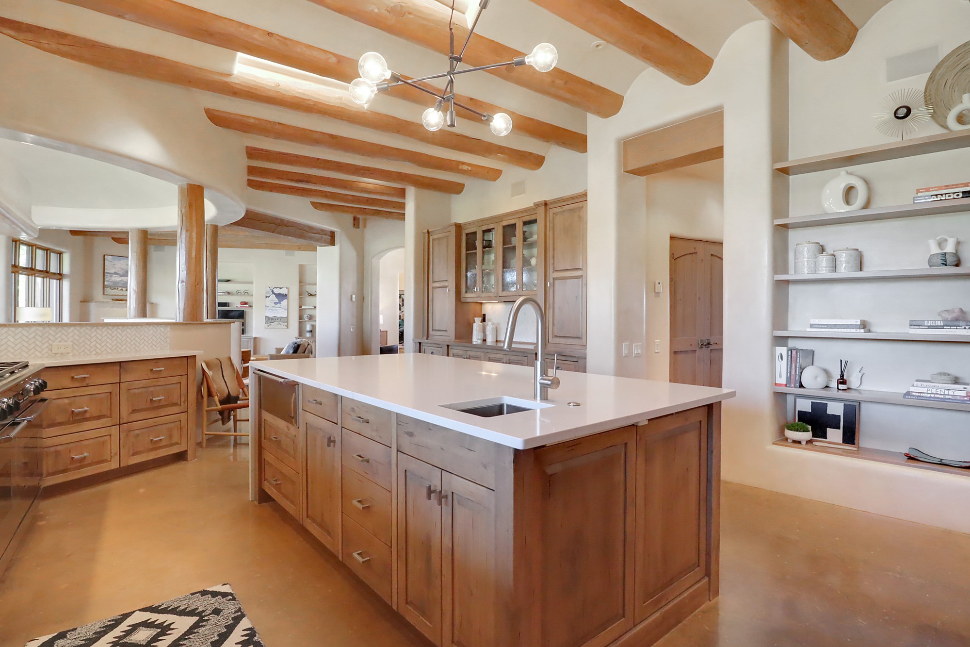 Discover an air of sophistication in this 4-bedroom, 4.5-bathroom residence spanning over 4,000 sq ft, including an executive office and charming attached casita, all nestled on 3 .5 acres in the serene enclave of Tierra Preciosa. Magnificent views of the Sangre de Cristo and Jemez mountains add a touch of splendor throughout the home. A spacious portal beckons you to the backyard oasis with an outdoor kitchen and fireplace that provides an idyllic setting for stylish and comfortable entertaining. Inside, the living room and master bedroom fireplaces, coupled with vigas and beams, infuse the ambiance with warmth and charm. The master suite boasts an adjoining flexible living space with a wet bar, complemented by a spacious master bath and walk-in closet. The generously appointed chef's kitchen, equipped with high-end appliances and a built-in hutch, transforms hosting into a delightful experience. The attached casita includes a full bath and a kiva fireplace to graciously accommodate visitors or serve as an ideal work-at-home space. Throughout the home, a harmonious blend of stone and natural wood textures enhances the overall design, creating an aesthetic of timeless luxury with modern features. Practical amenities abound, including a three-car heated garage, spacious closets, lighted niches, a well-equipped laundry room with plenty of storage and a sink, a walk-in pantry, ensuite bathrooms in every bedroom, integrated stereo speakers throughout. Radiant in-floor heating and central A/C provide year-round comfort. Notably, there are no HOA dues, and road maintenance is handled by a dedicated REUMA board.