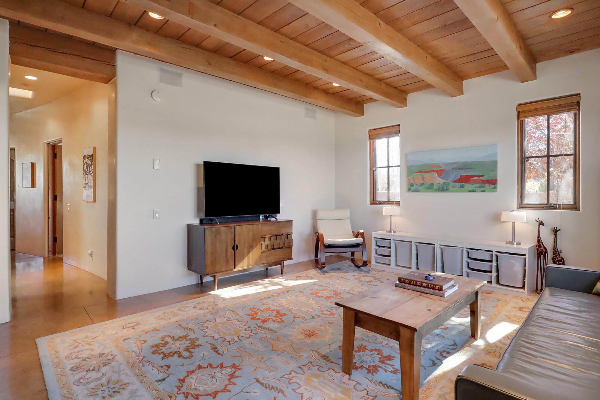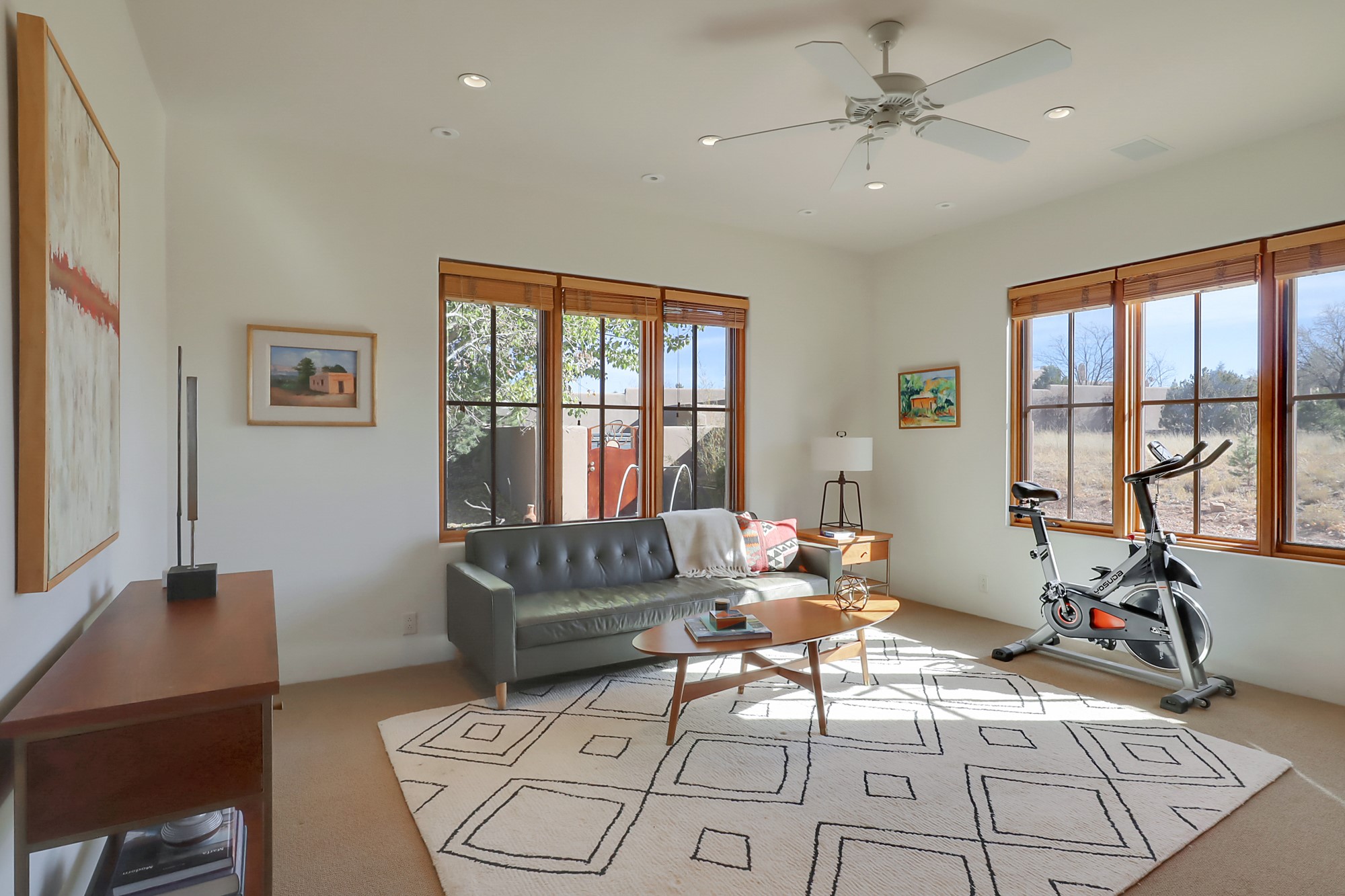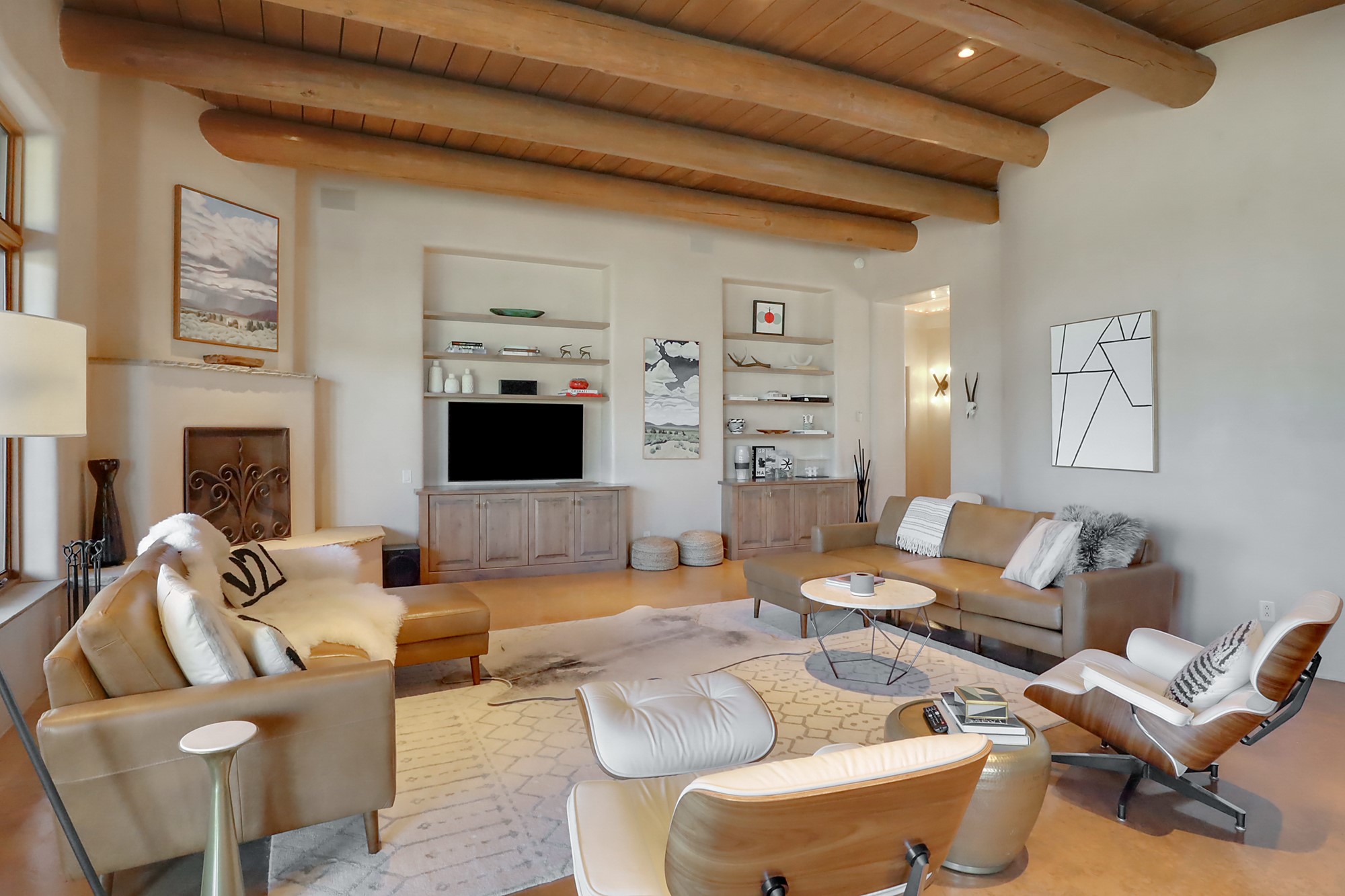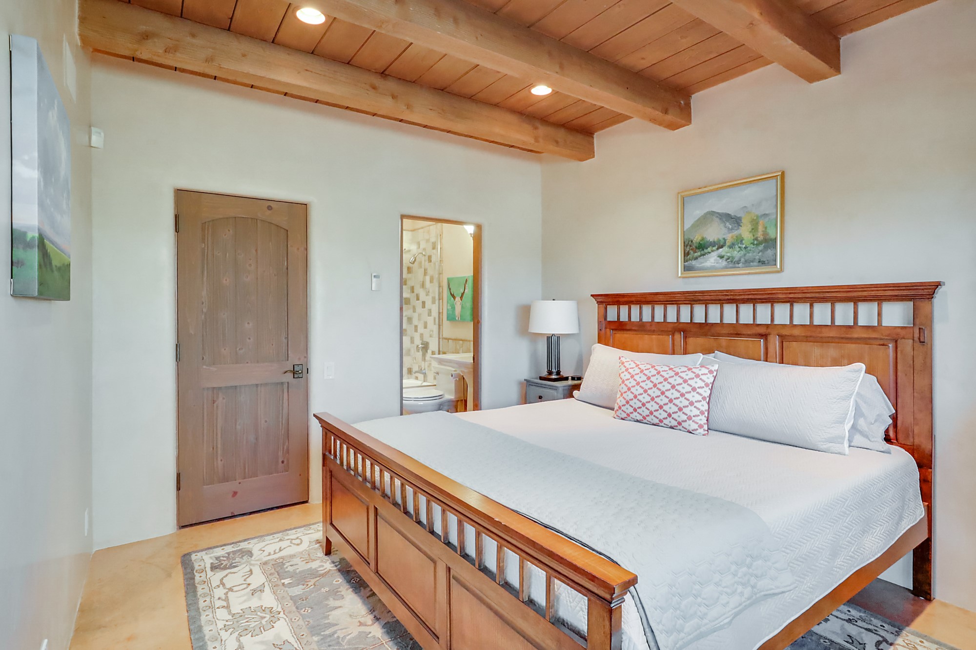 Discover an air of sophistication in this 4-bedroom, 4.5-bathroom residence spanning over 4,000 sq ft, including an executive office and charming attached casita, all nestled on 3 .5 acres in the serene enclave of Tierra Preciosa. Magnificent views of the Sangre de Cristo and Jemez mountains add a touch of splendor throughout the home. A spacious portal beckons you to the backyard oasis with an outdoor kitchen and fireplace that provides an idyllic setting for stylish and comfortable entertaining. Inside, the living room and master bedroom fireplaces, coupled with vigas and beams, infuse the ambiance with warmth and charm. The master suite boasts an adjoining flexible living space with a wet bar, complemented by a spacious master bath and walk-in closet. The generously appointed chef's kitchen, equipped with high-end appliances and a built-in hutch, transforms hosting into a delightful experience. The attached casita includes a full bath and a kiva fireplace to graciously accommodate visitors or serve as an ideal work-at-home space. Throughout the home, a harmonious blend of stone and natural wood textures enhances the overall design, creating an aesthetic of timeless luxury with modern features. Practical amenities abound, including a three-car heated garage, spacious closets, lighted niches, a well-equipped laundry room with plenty of storage and a sink, a walk-in pantry, ensuite bathrooms in every bedroom, integrated stereo speakers throughout. Radiant in-floor heating and central A/C provide year-round comfort. Notably, there are no HOA dues, and road maintenance is handled by a dedicated REUMA board.