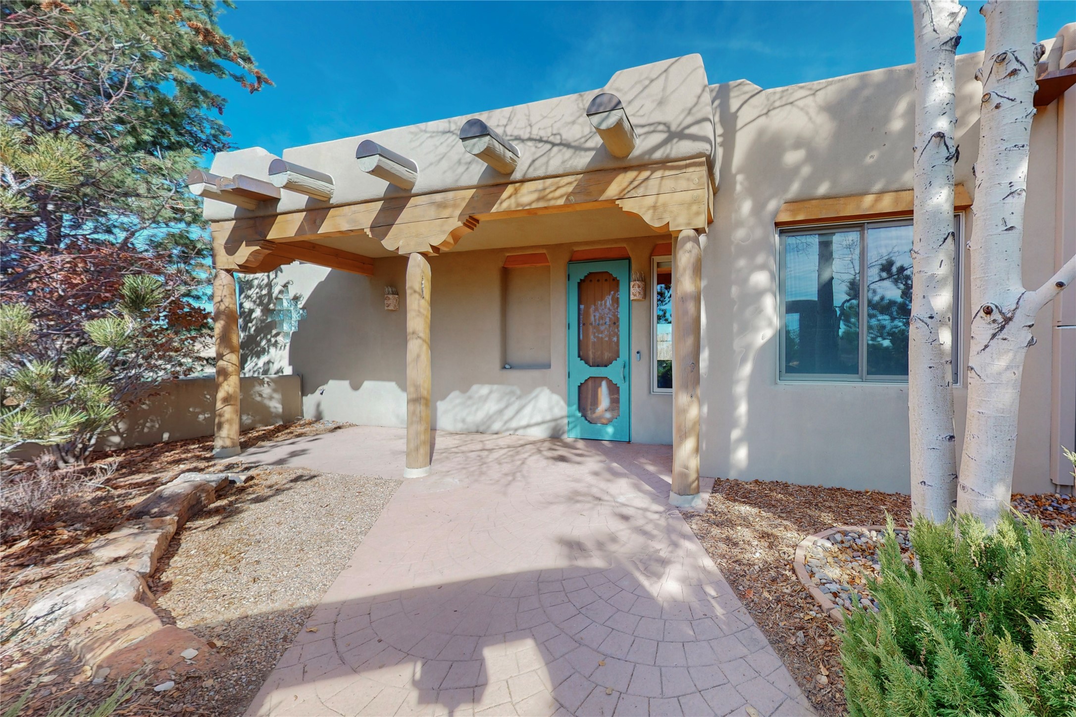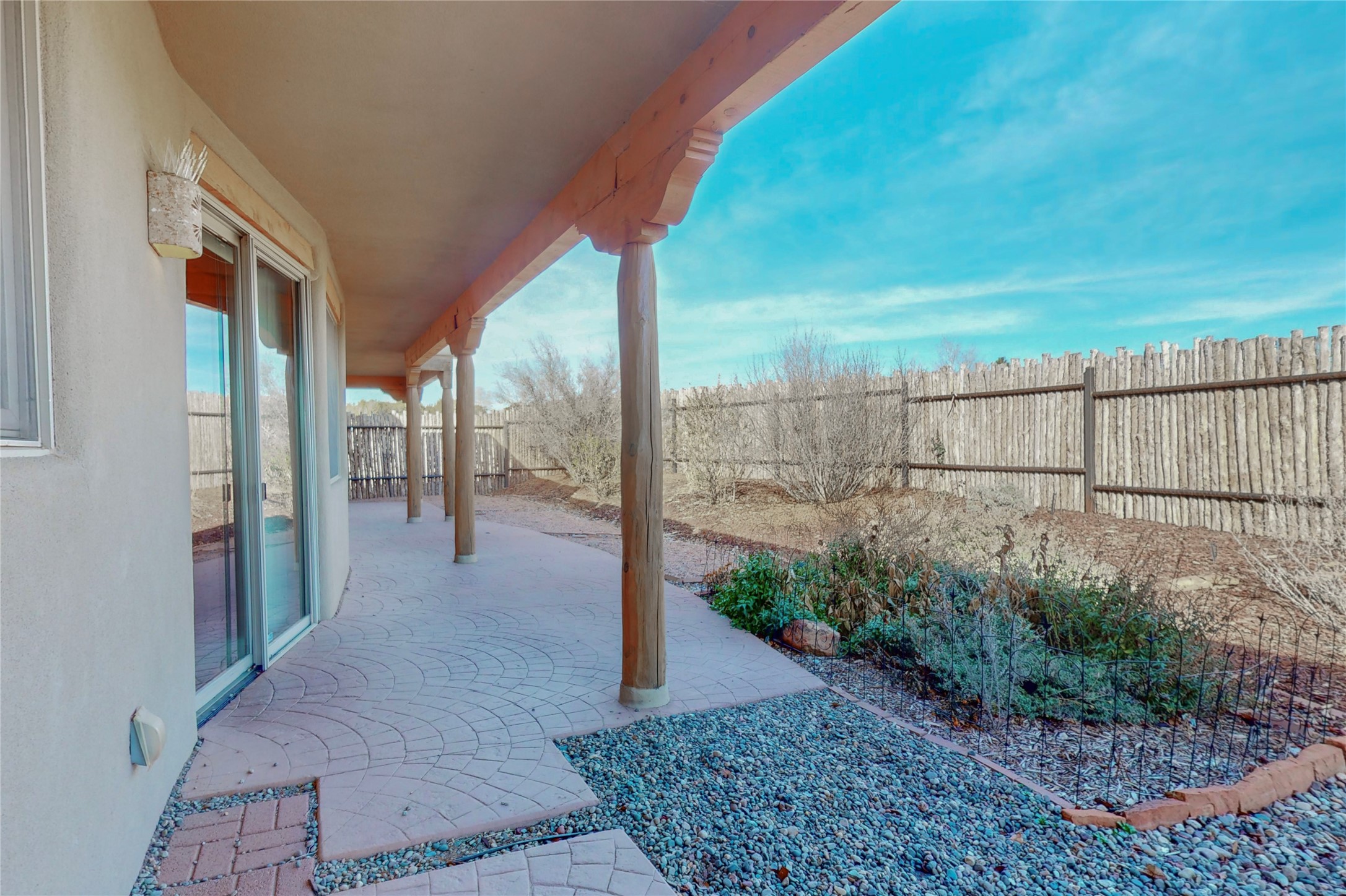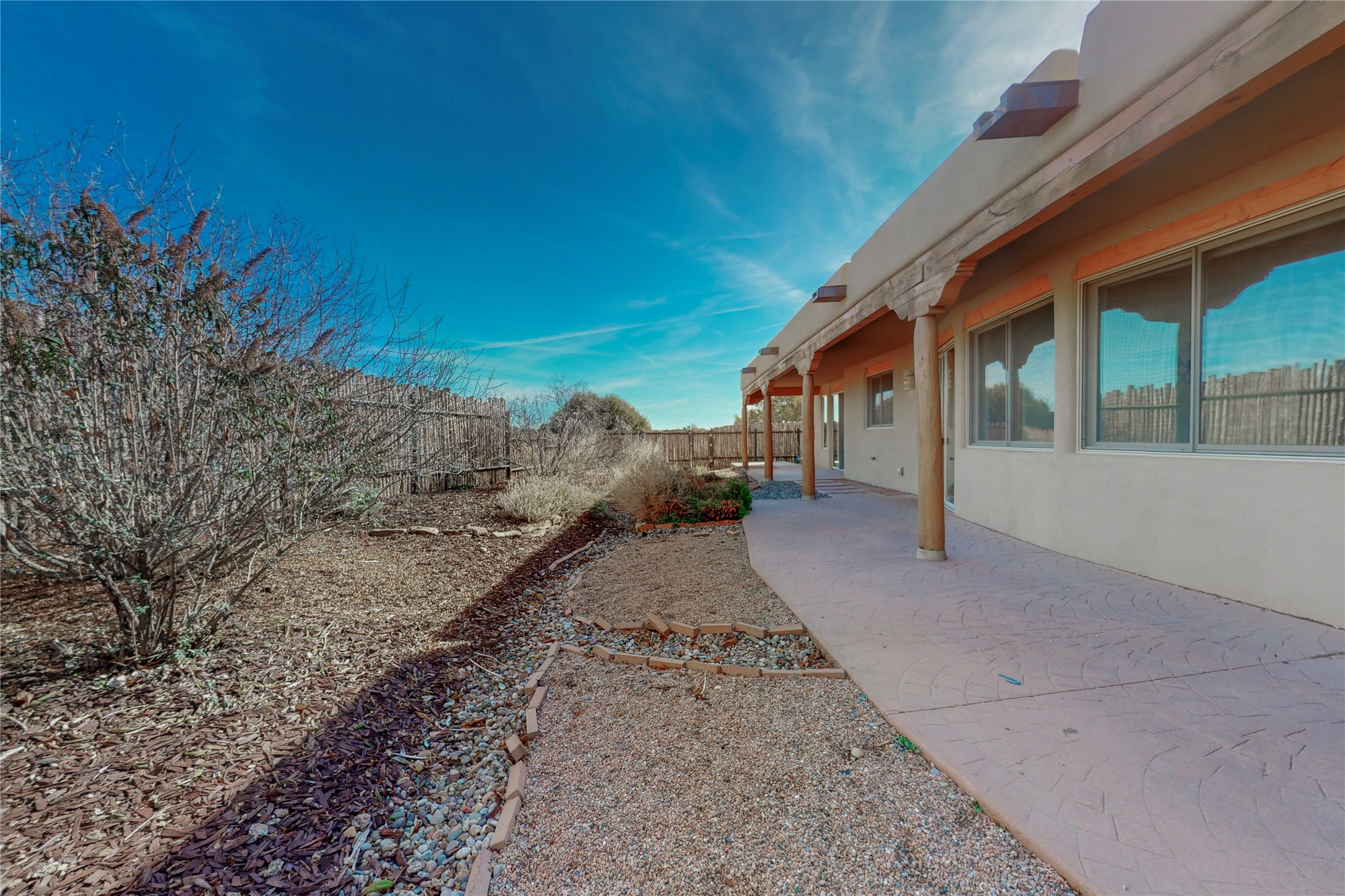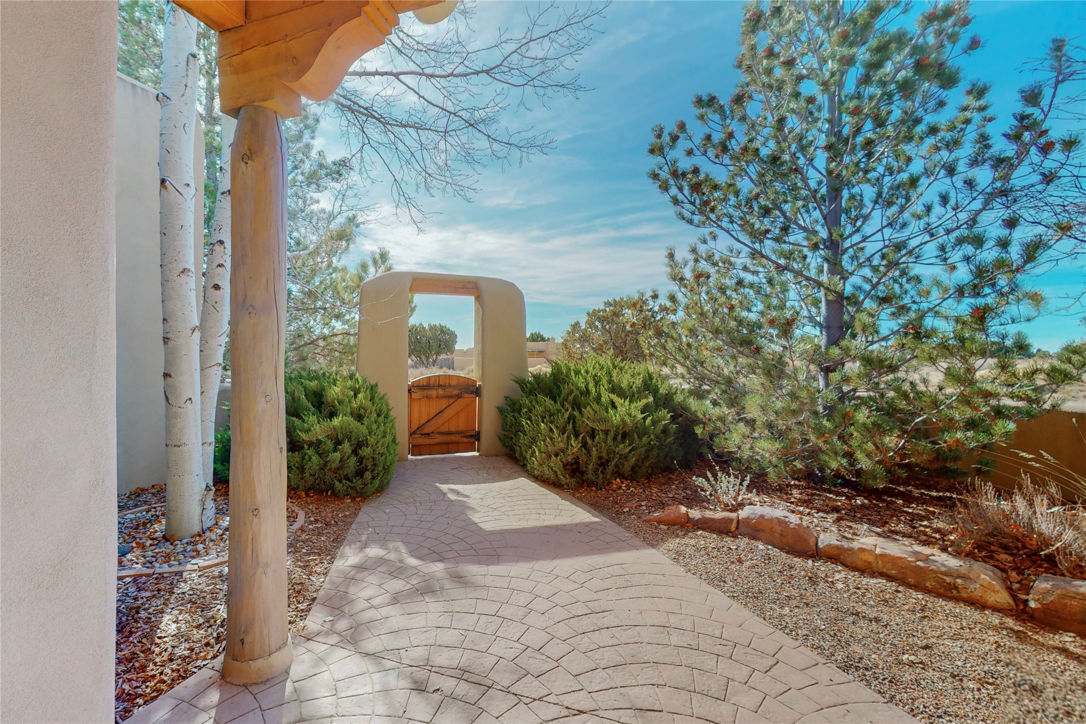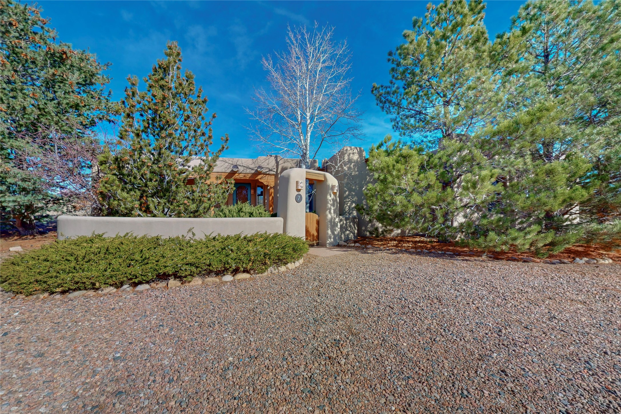 Enter through a private front courtyard with established landscaping and mature trees to this elegant single-level Eldorado home with a generous covered portal and classic Santa Fe details. Open concept living room/dining room with high ceilings, vigas, and plastered kiva fireplace. Cook's kitchen includes a large island, pantry, breakfast area, stainless appliances, granite countertops, and a built-in desk. An outdoor patio with coyote fencing for privacy and securing furry friends is just off the dining area, perfect for entertaining. Built on a 1.7-acre lot, the home includes a second living area off the kitchen with a kiva fireplace, which would make a great media or game room. An office/studio space off this bonus room is very private with endless potential (originally a third garage bay). The primary bathroom has double sinks, tall countertops, a separate shower and tub, as well as a large walk-in closet. Separate laundry room. Lots of storage. Heated garage. Just a 20-minute drive to Downtown Santa Fe. The Eldorado community offers hiking/biking trails, a grocery store, a seasonal pool, a library, a Senior Center, a dog park, restaurants, and many other amenities. Schedule a showing today.