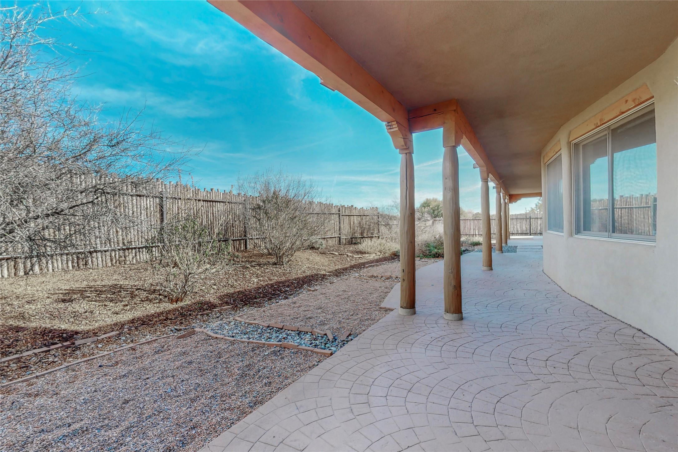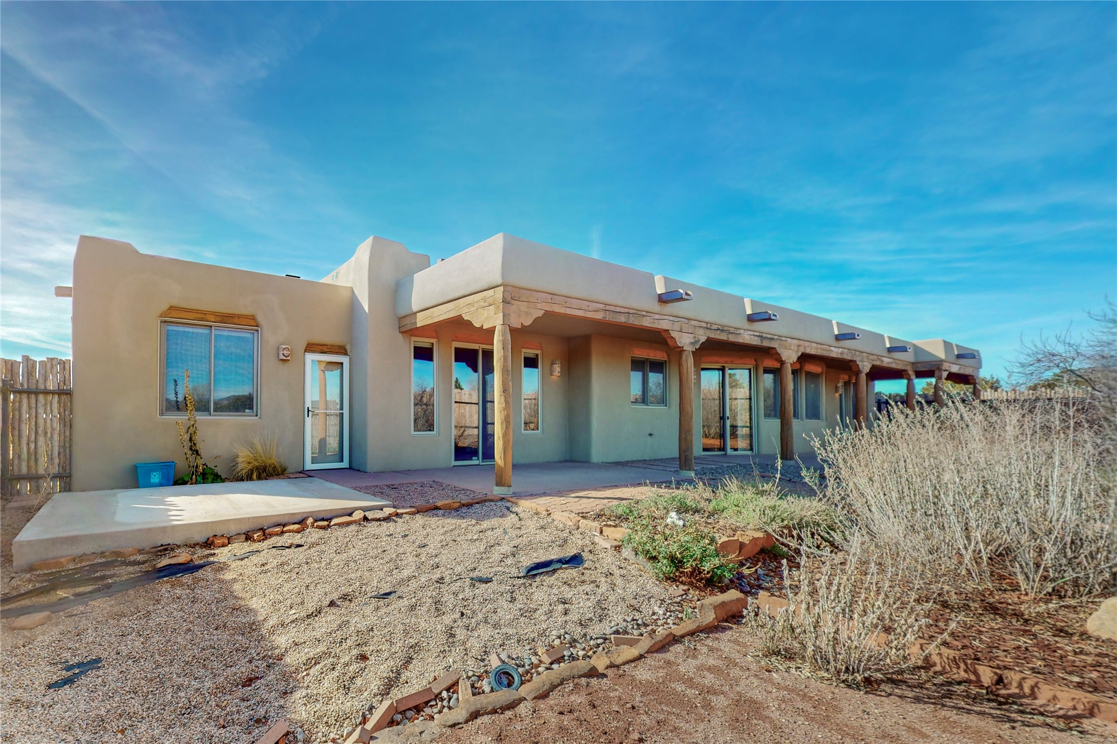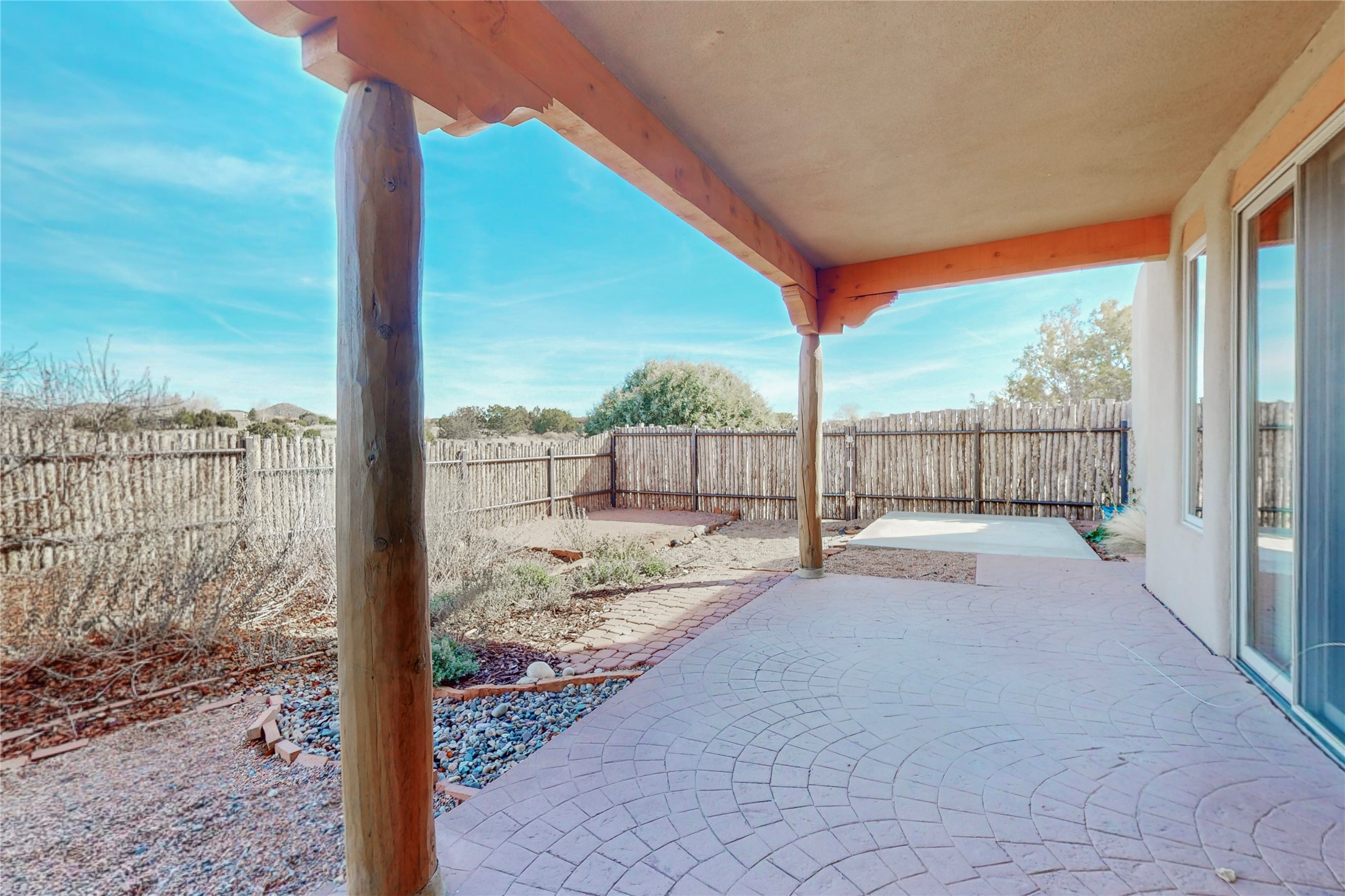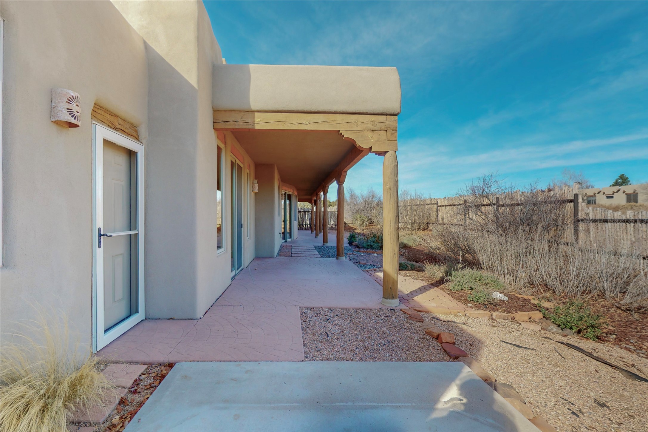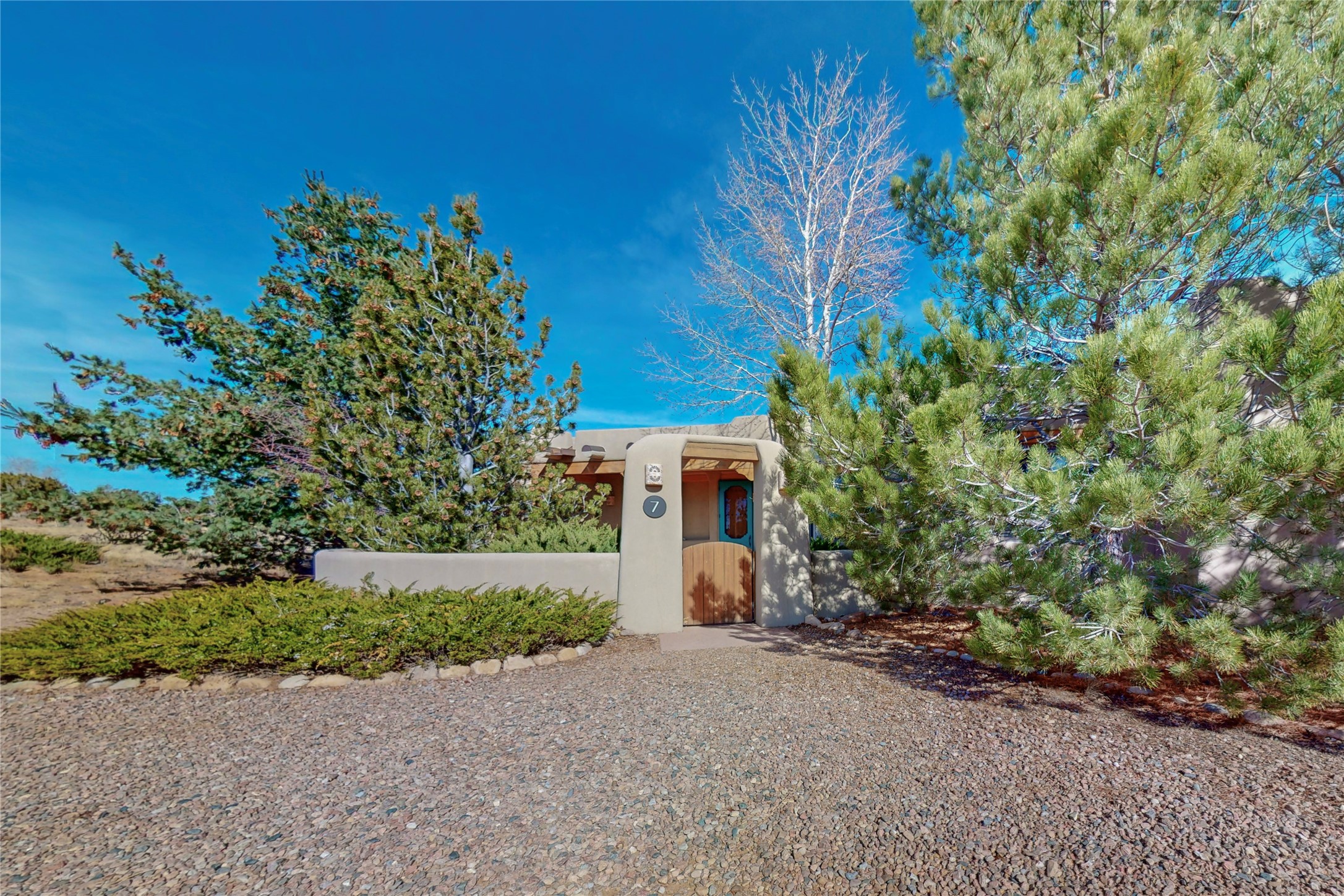 Enter through a private front courtyard with established landscaping and mature trees to this elegant single-level Eldorado home with a generous covered portal and classic Santa Fe details. Open concept living room/dining room with high ceilings, vigas, and plastered kiva fireplace. Cook's kitchen includes a large island, pantry, breakfast area, stainless appliances, granite countertops, and a built-in desk. An outdoor patio with coyote fencing for privacy and securing furry friends is just off the dining area, perfect for entertaining. Built on a 1.7-acre lot, the home includes a second living area off the kitchen with a kiva fireplace, which would make a great media or game room. An office/studio space off this bonus room is very private with endless potential (originally a third garage bay). The primary bathroom has double sinks, tall countertops, a separate shower and tub, as well as a large walk-in closet. Separate laundry room. Lots of storage. Heated garage. Just a 20-minute drive to Downtown Santa Fe. The Eldorado community offers hiking/biking trails, a grocery store, a seasonal pool, a library, a Senior Center, a dog park, restaurants, and many other amenities. Schedule a showing today.