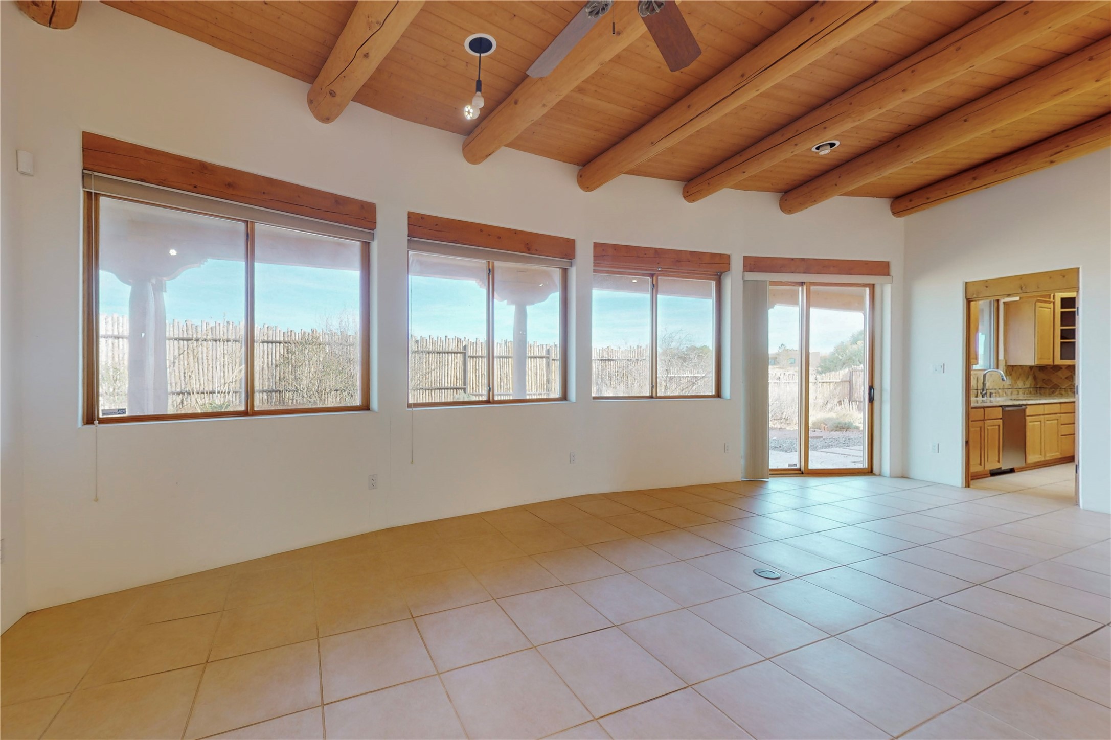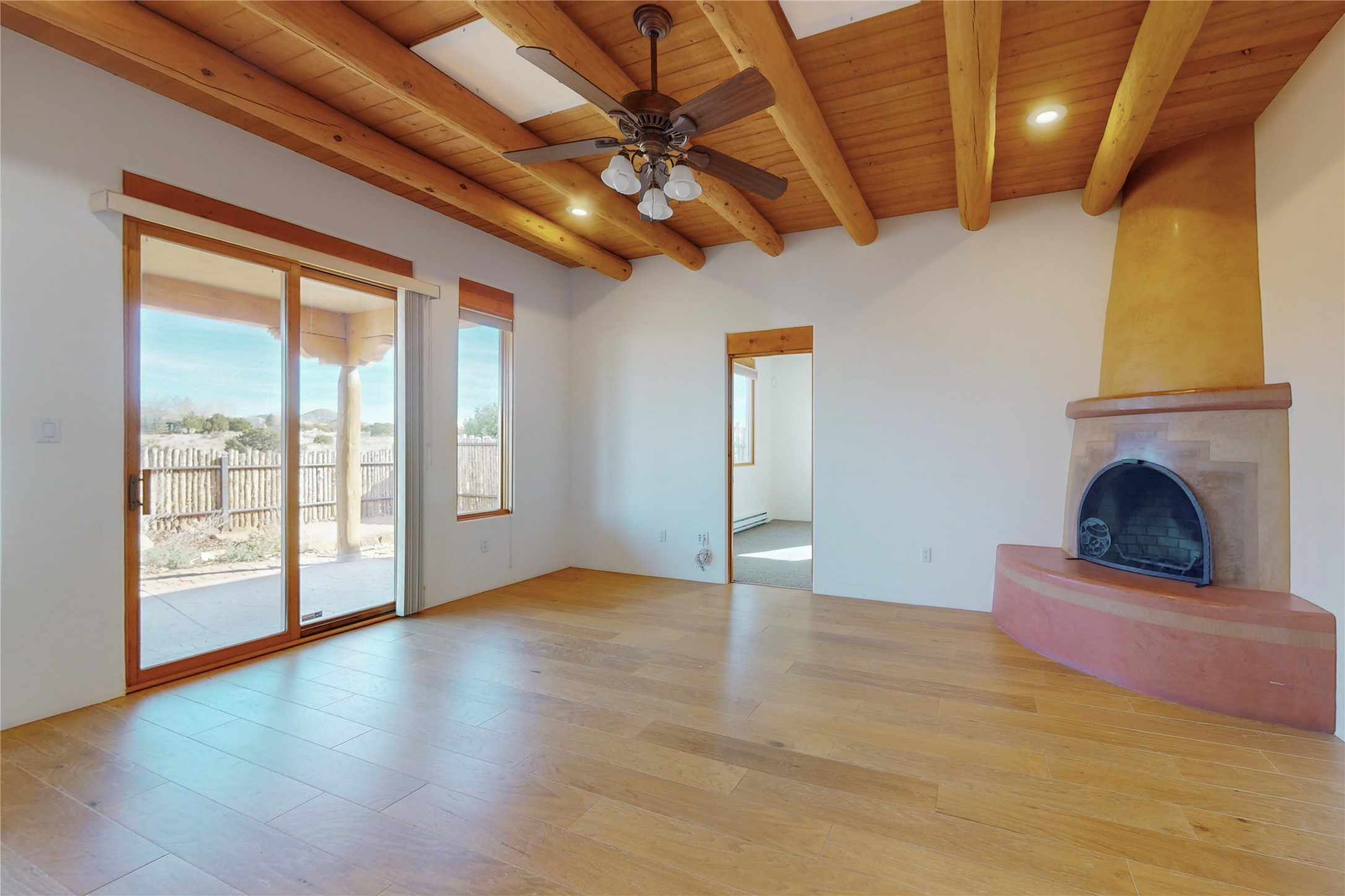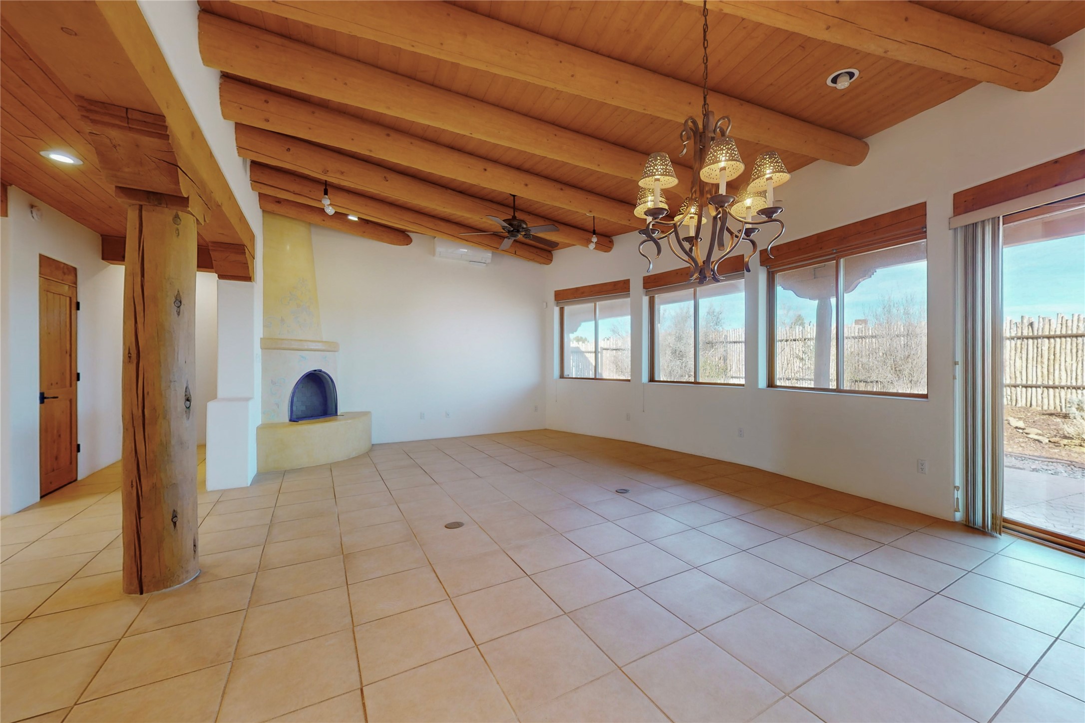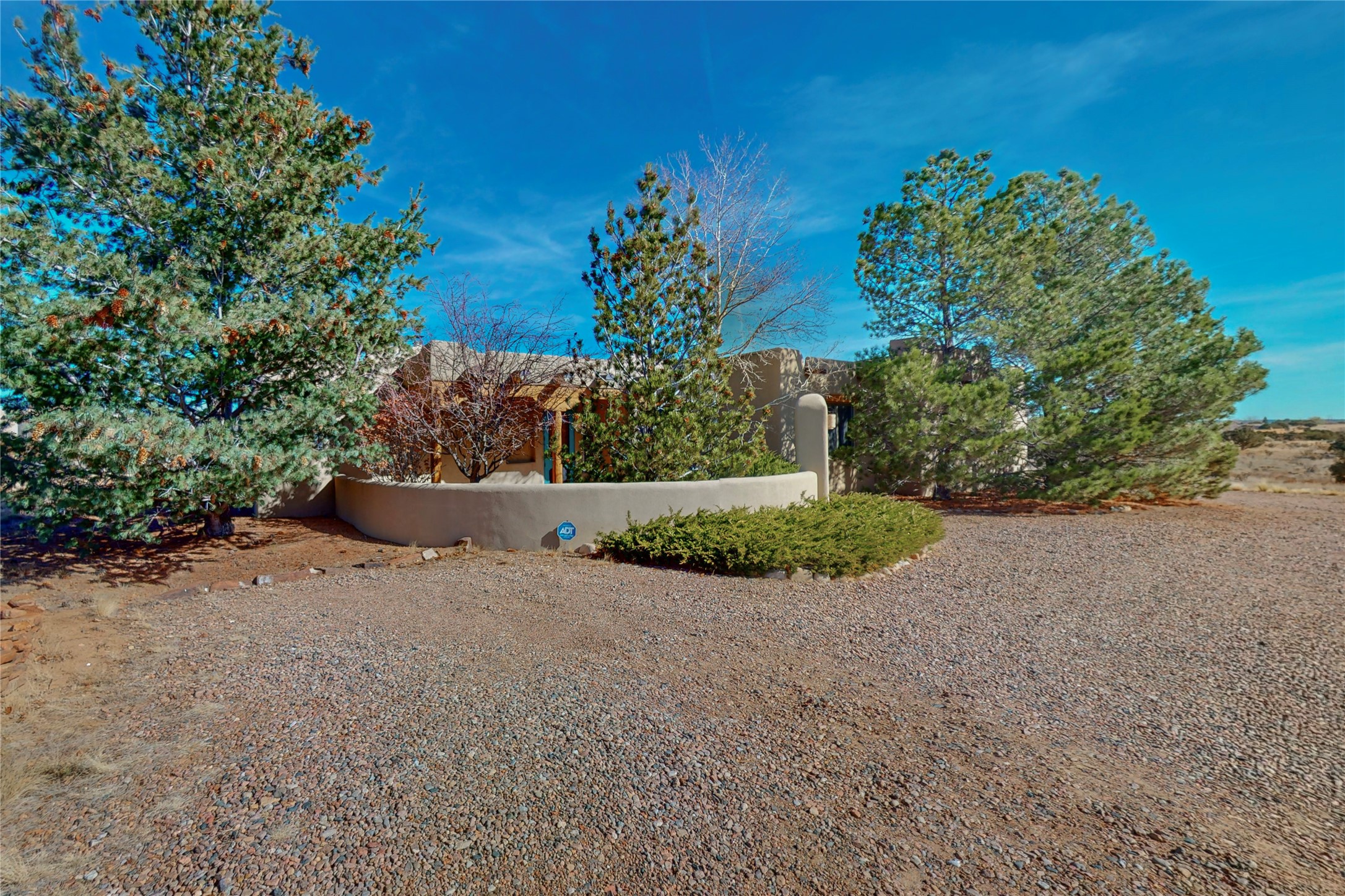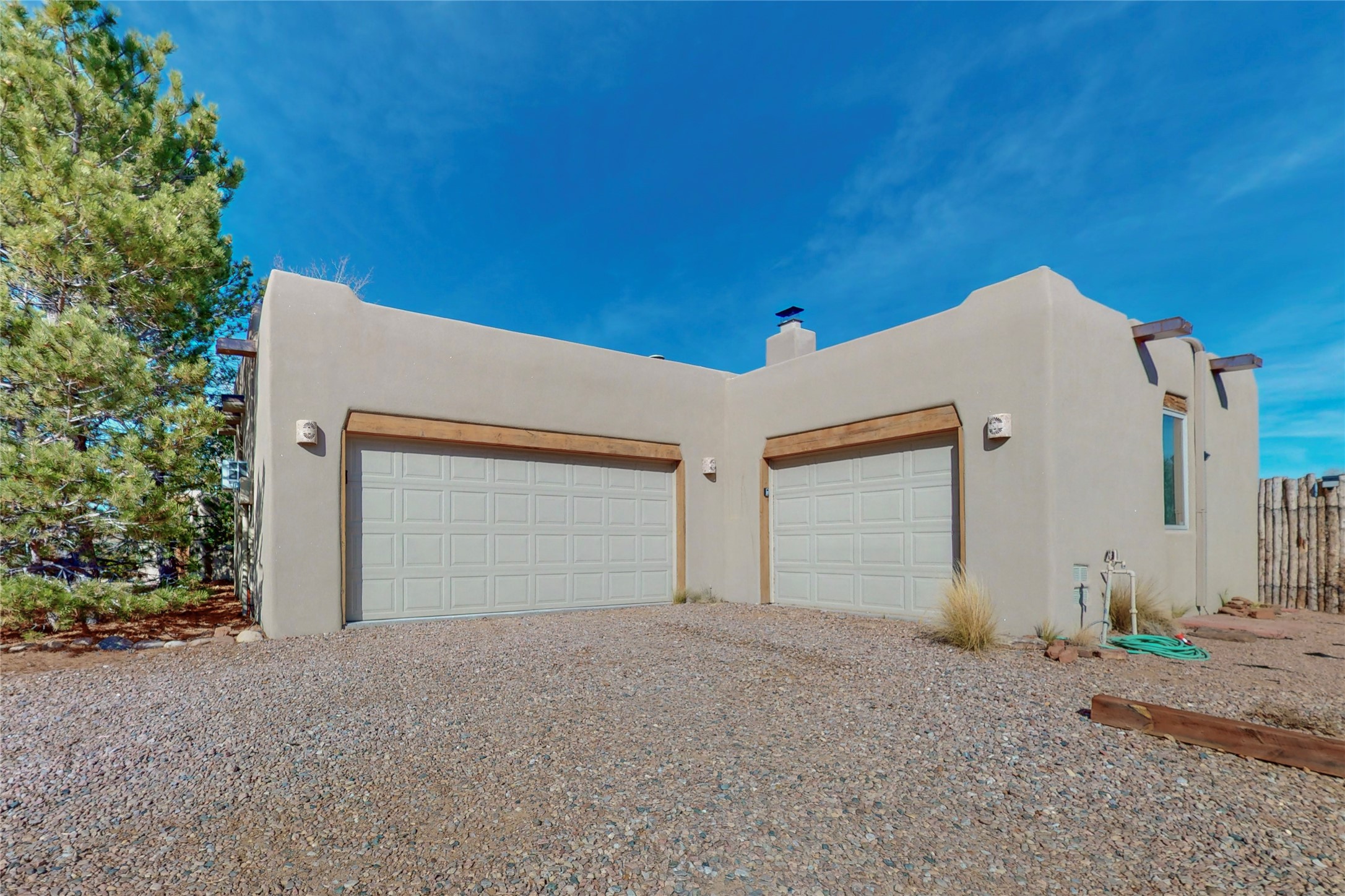 Enter through a private front courtyard with established landscaping and mature trees to this elegant single-level Eldorado home with a generous covered portal and classic Santa Fe details. Open concept living room/dining room with high ceilings, vigas, and plastered kiva fireplace. Cook's kitchen includes a large island, pantry, breakfast area, stainless appliances, granite countertops, and a built-in desk. An outdoor patio with coyote fencing for privacy and securing furry friends is just off the dining area, perfect for entertaining. Built on a 1.7-acre lot, the home includes a second living area off the kitchen with a kiva fireplace, which would make a great media or game room. An office/studio space off this bonus room is very private with endless potential (originally a third garage bay). The primary bathroom has double sinks, tall countertops, a separate shower and tub, as well as a large walk-in closet. Separate laundry room. Lots of storage. Heated garage. Just a 20-minute drive to Downtown Santa Fe. The Eldorado community offers hiking/biking trails, a grocery store, a seasonal pool, a library, a Senior Center, a dog park, restaurants, and many other amenities. Schedule a showing today.