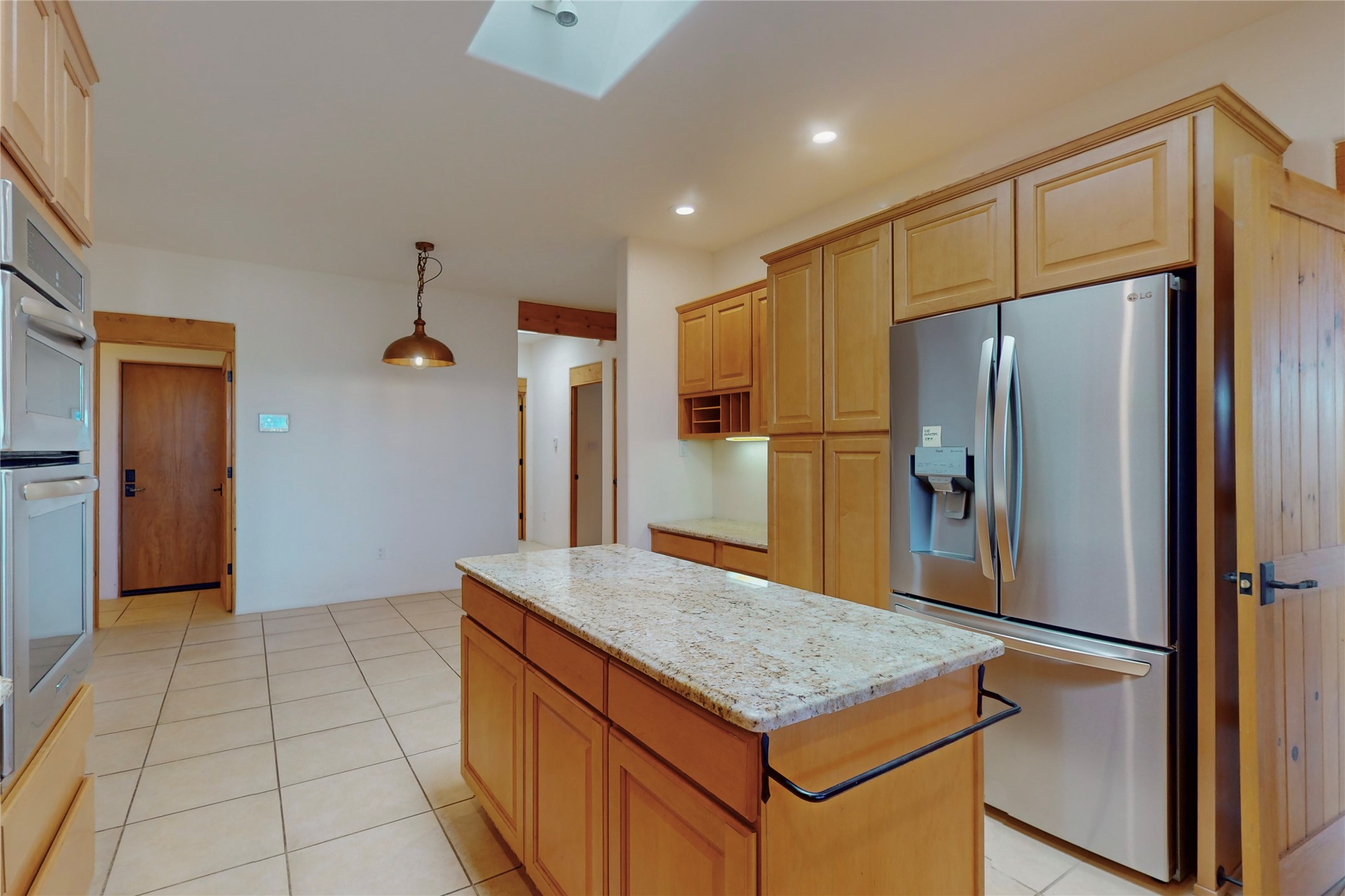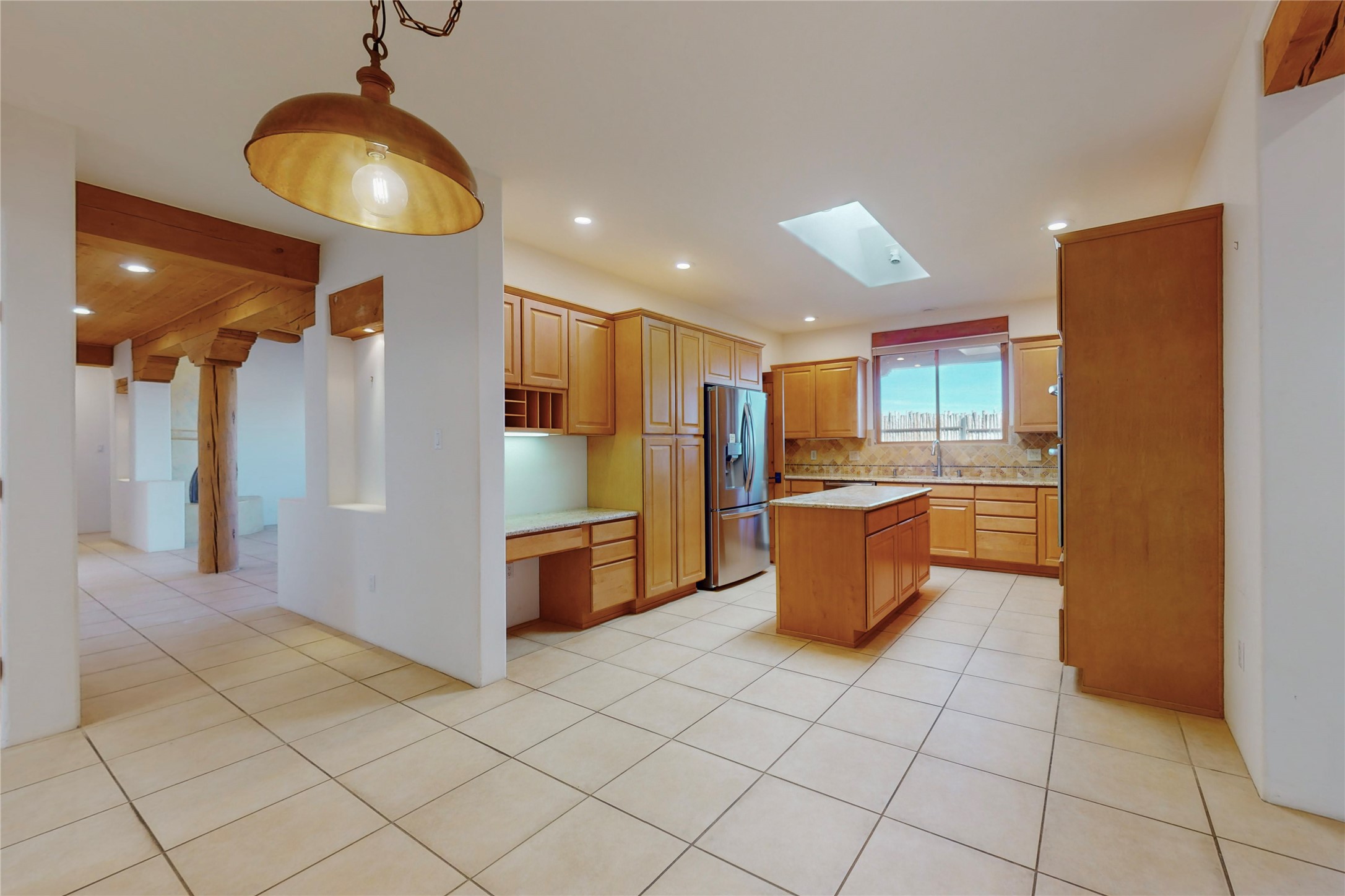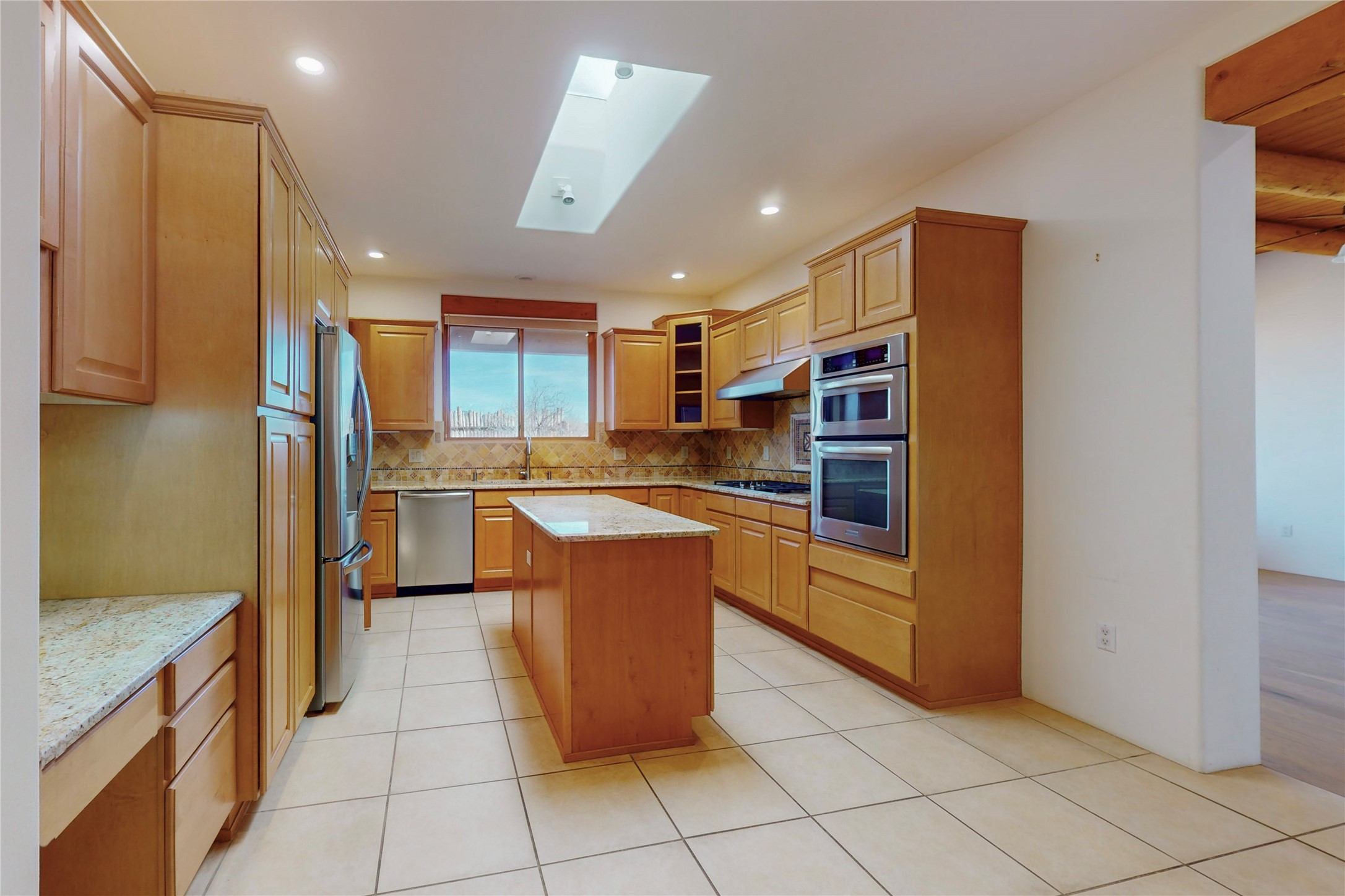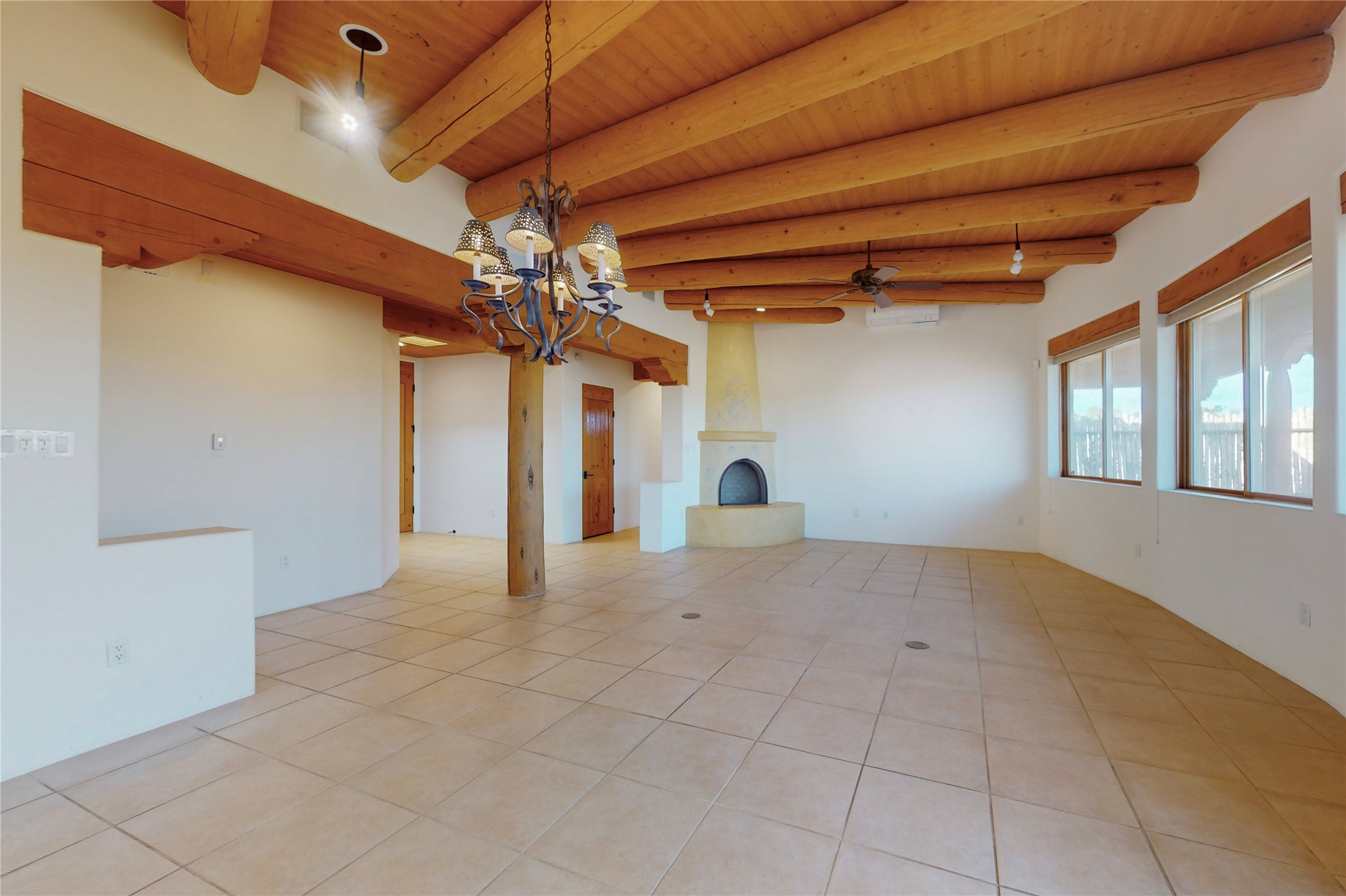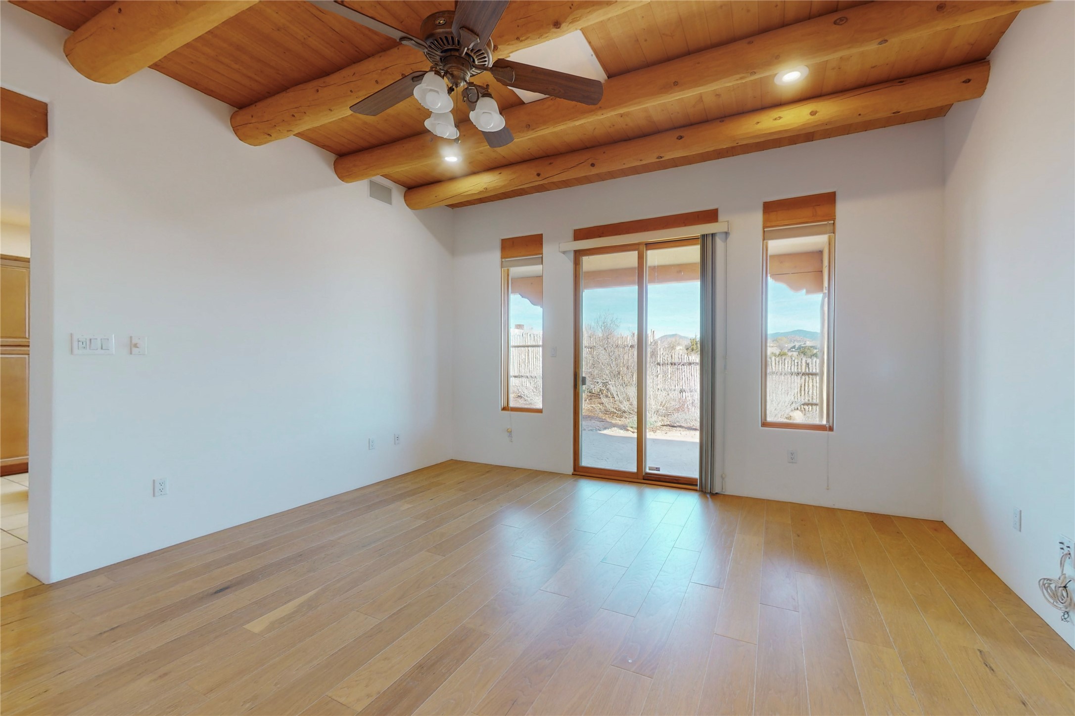Enter through a private front courtyard with established landscaping and mature trees to this elegant single-level Eldorado home with a generous covered portal and classic Santa Fe details. Open concept living room/dining room with high ceilings, vigas, and plastered kiva fireplace. Cook's kitchen includes a large island, pantry, breakfast area, stainless appliances, granite countertops, and a built-in desk. An outdoor patio with coyote fencing for privacy and securing furry friends is just off the dining area, perfect for entertaining. Built on a 1.7-acre lot, the home includes a second living area off the kitchen with a kiva fireplace, which would make a great media or game room. An office/studio space off this bonus room is very private with endless potential (originally a third garage bay). The primary bathroom has double sinks, tall countertops, a separate shower and tub, as well as a large walk-in closet. Separate laundry room. Lots of storage. Heated garage. Just a 20-minute drive to Downtown Santa Fe. The Eldorado community offers hiking/biking trails, a grocery store, a seasonal pool, a library, a Senior Center, a dog park, restaurants, and many other amenities. Schedule a showing today.