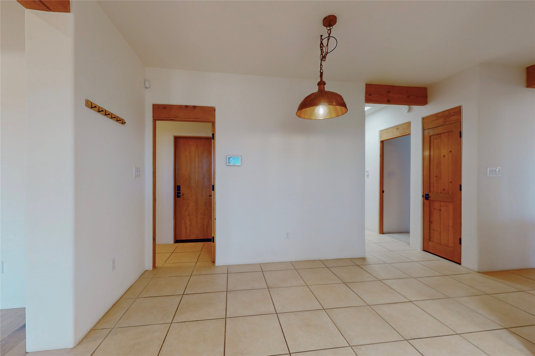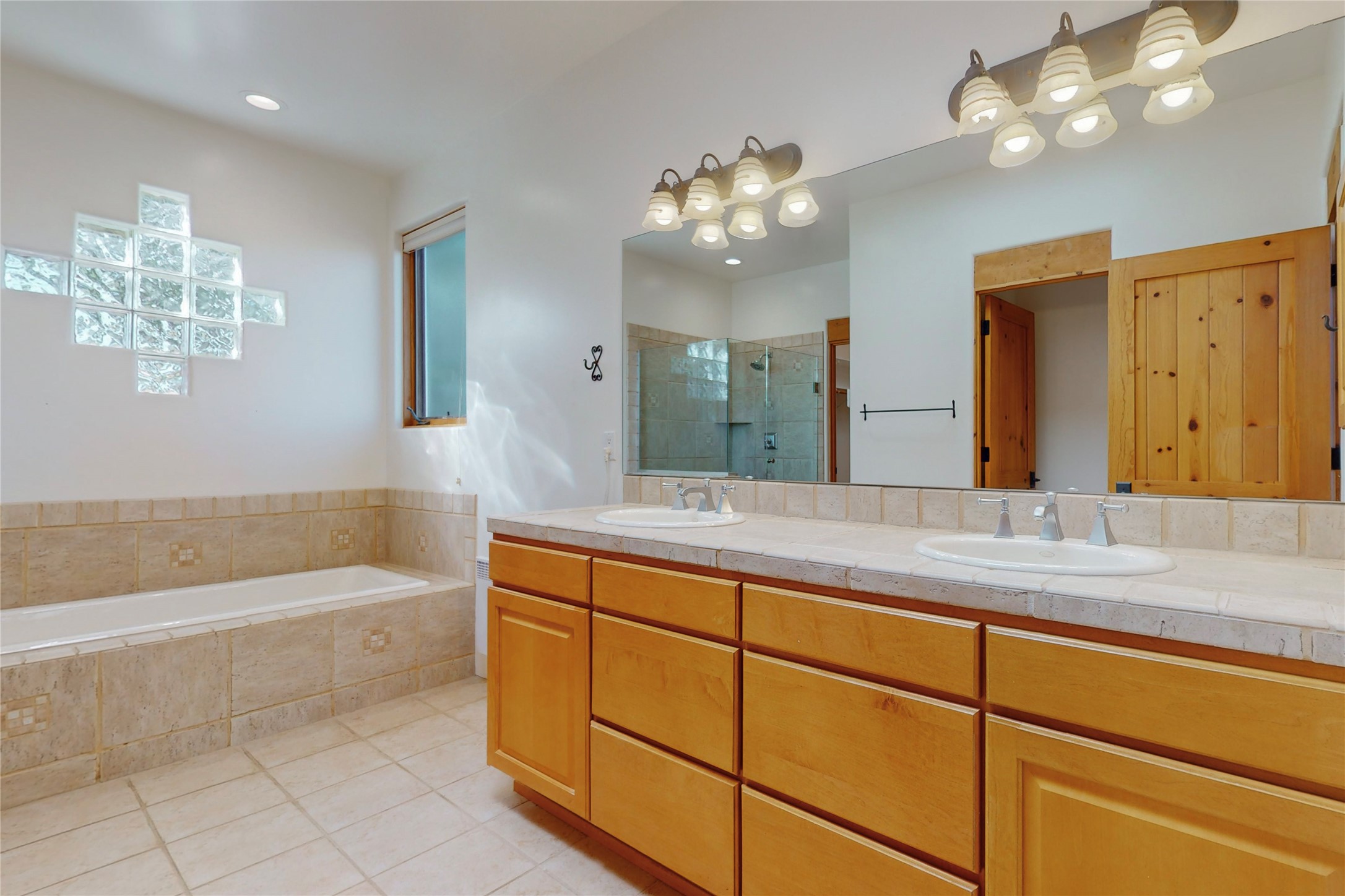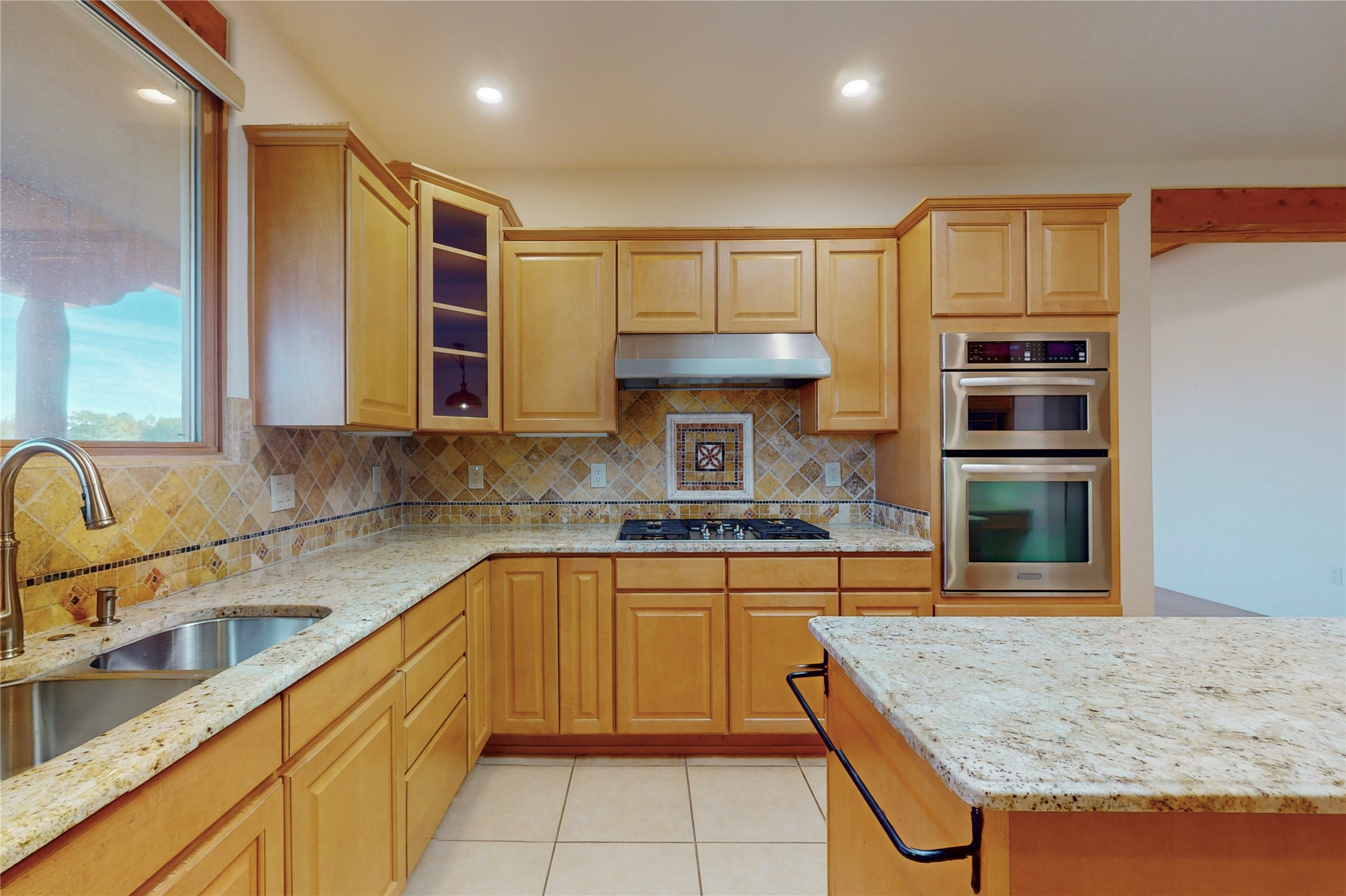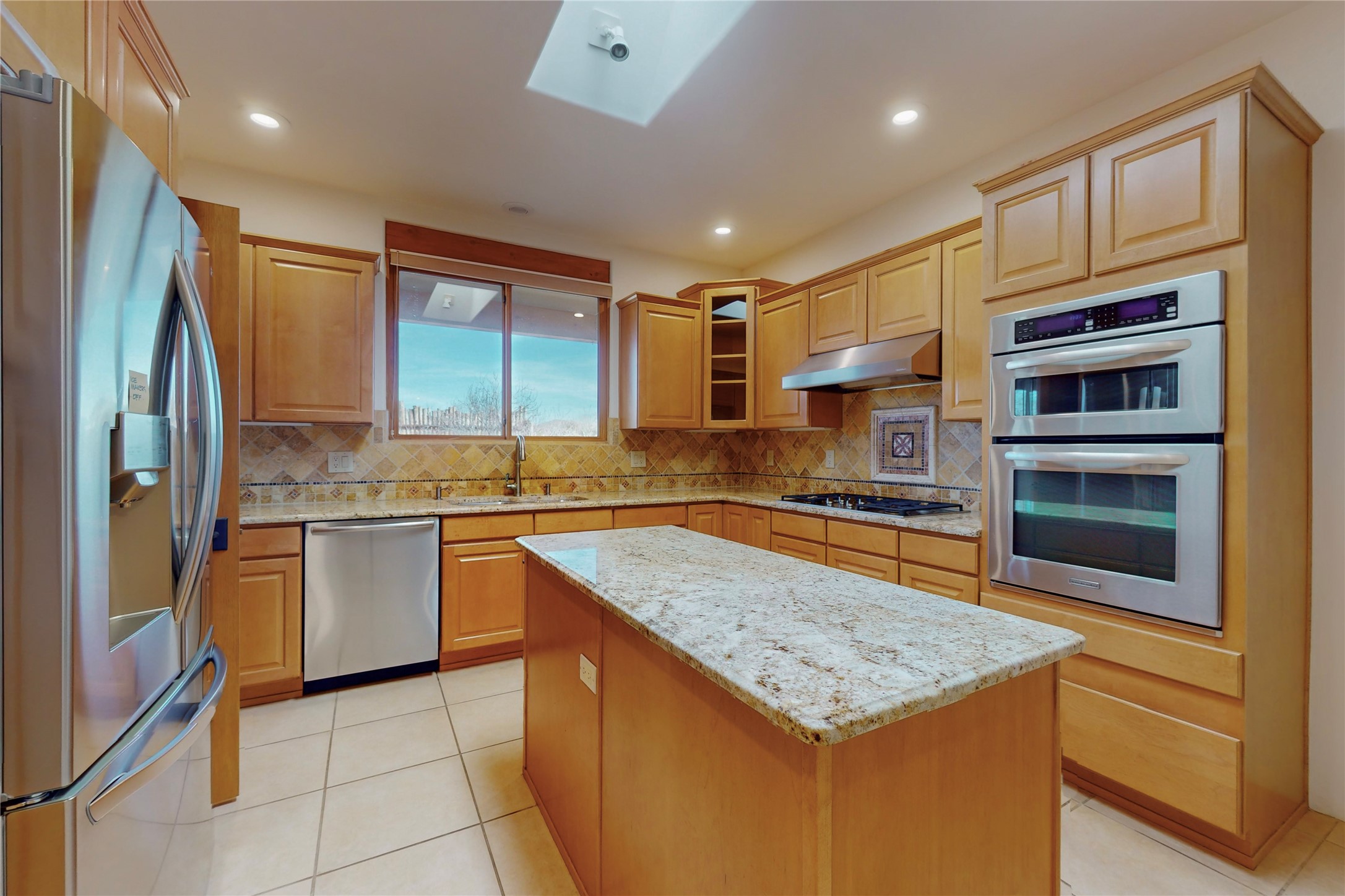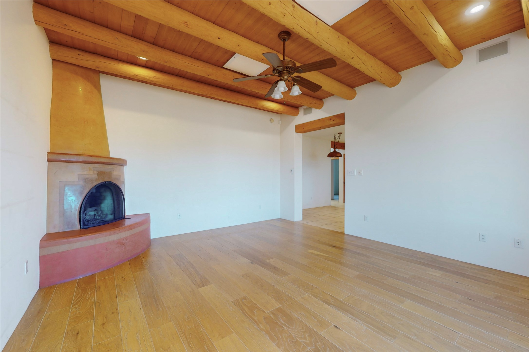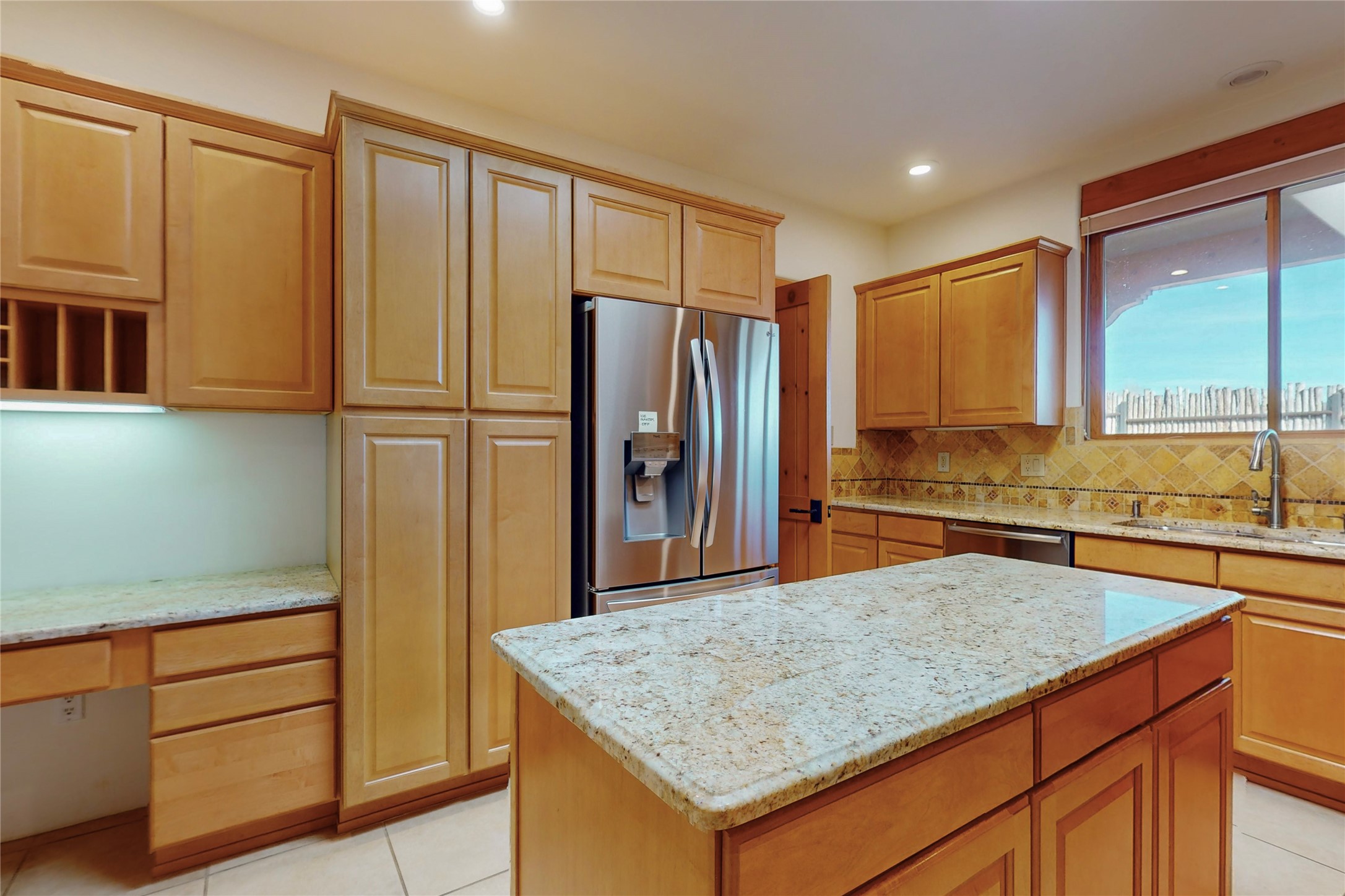 Enter through a private front courtyard with established landscaping and mature trees to this elegant single-level Eldorado home with a generous covered portal and classic Santa Fe details. Open concept living room/dining room with high ceilings, vigas, and plastered kiva fireplace. Cook's kitchen includes a large island, pantry, breakfast area, stainless appliances, granite countertops, and a built-in desk. An outdoor patio with coyote fencing for privacy and securing furry friends is just off the dining area, perfect for entertaining. Built on a 1.7-acre lot, the home includes a second living area off the kitchen with a kiva fireplace, which would make a great media or game room. An office/studio space off this bonus room is very private with endless potential (originally a third garage bay). The primary bathroom has double sinks, tall countertops, a separate shower and tub, as well as a large walk-in closet. Separate laundry room. Lots of storage. Heated garage. Just a 20-minute drive to Downtown Santa Fe. The Eldorado community offers hiking/biking trails, a grocery store, a seasonal pool, a library, a Senior Center, a dog park, restaurants, and many other amenities. Schedule a showing today.