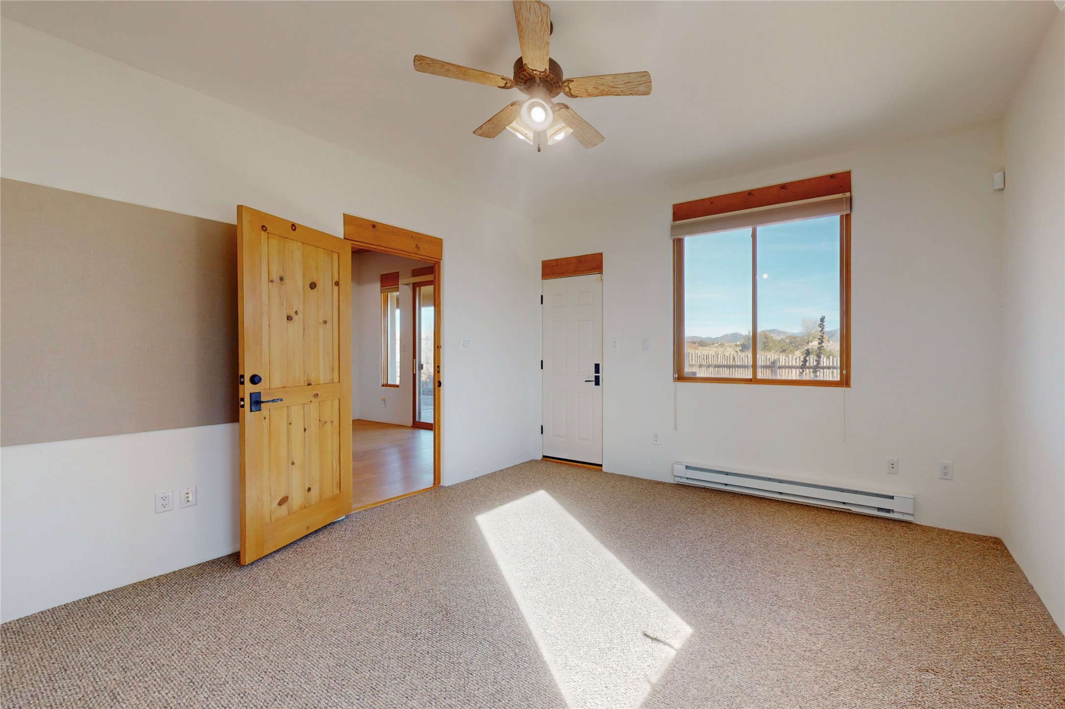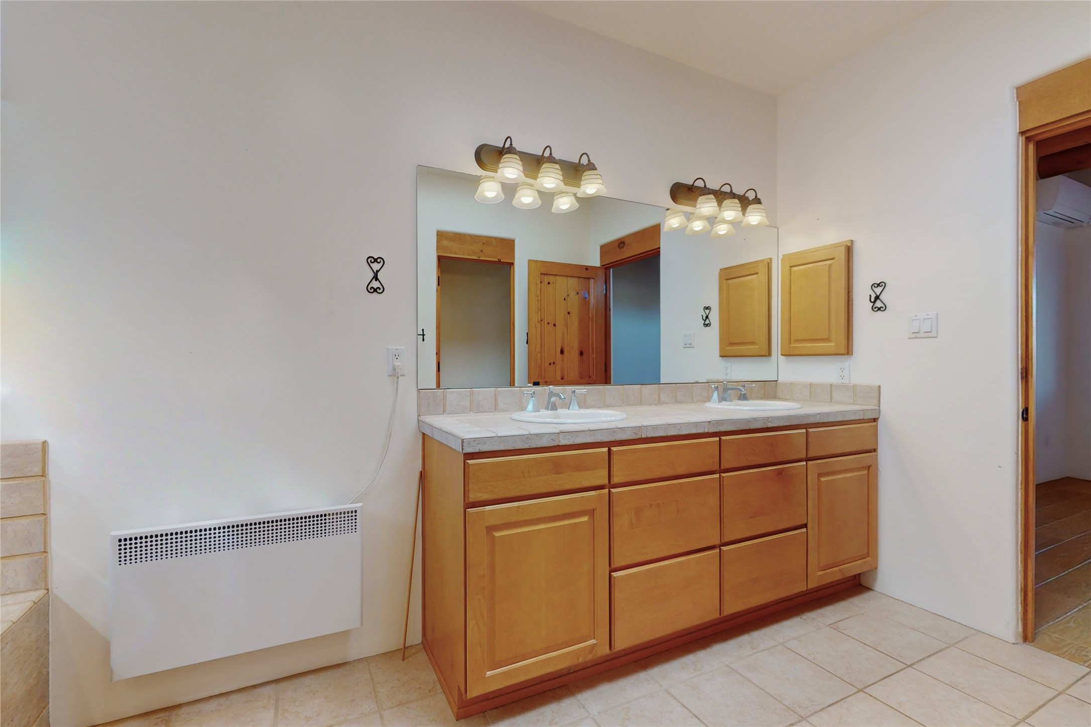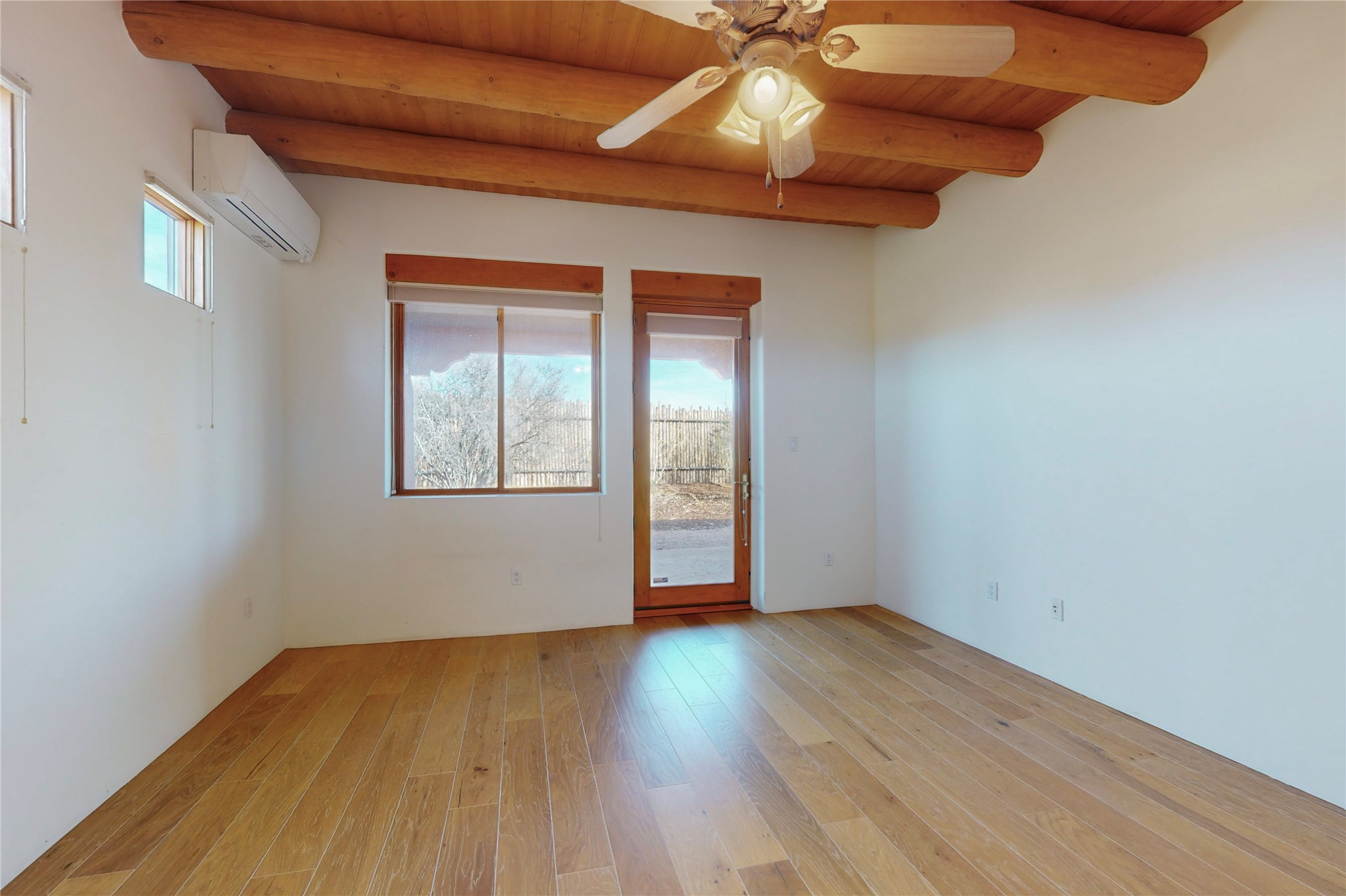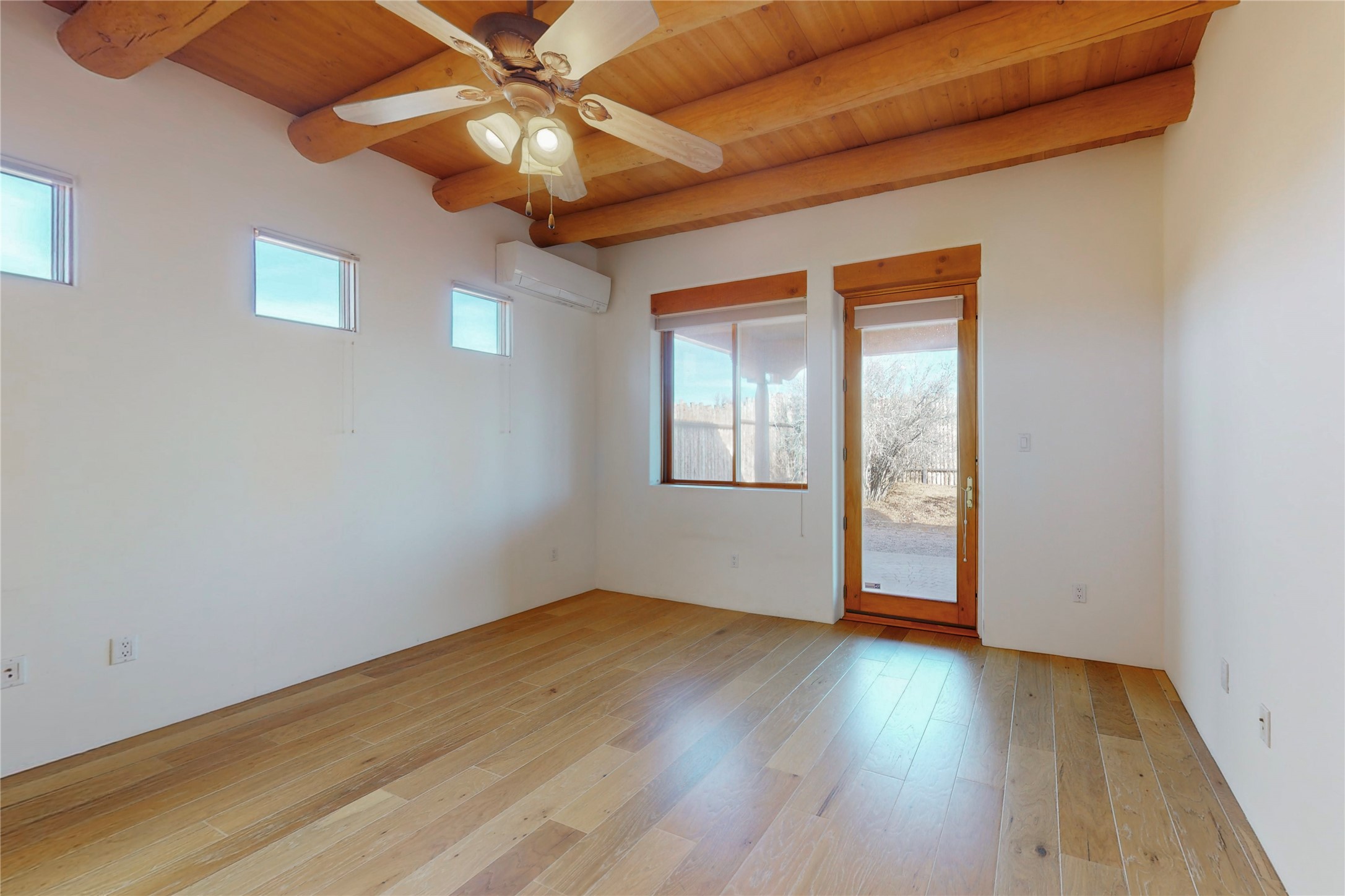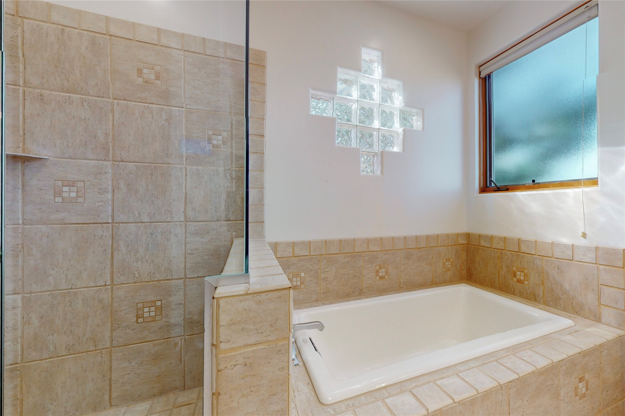 Enter through a private front courtyard with established landscaping and mature trees to this elegant single-level Eldorado home with a generous covered portal and classic Santa Fe details. Open concept living room/dining room with high ceilings, vigas, and plastered kiva fireplace. Cook's kitchen includes a large island, pantry, breakfast area, stainless appliances, granite countertops, and a built-in desk. An outdoor patio with coyote fencing for privacy and securing furry friends is just off the dining area, perfect for entertaining. Built on a 1.7-acre lot, the home includes a second living area off the kitchen with a kiva fireplace, which would make a great media or game room. An office/studio space off this bonus room is very private with endless potential (originally a third garage bay). The primary bathroom has double sinks, tall countertops, a separate shower and tub, as well as a large walk-in closet. Separate laundry room. Lots of storage. Heated garage. Just a 20-minute drive to Downtown Santa Fe. The Eldorado community offers hiking/biking trails, a grocery store, a seasonal pool, a library, a Senior Center, a dog park, restaurants, and many other amenities. Schedule a showing today.