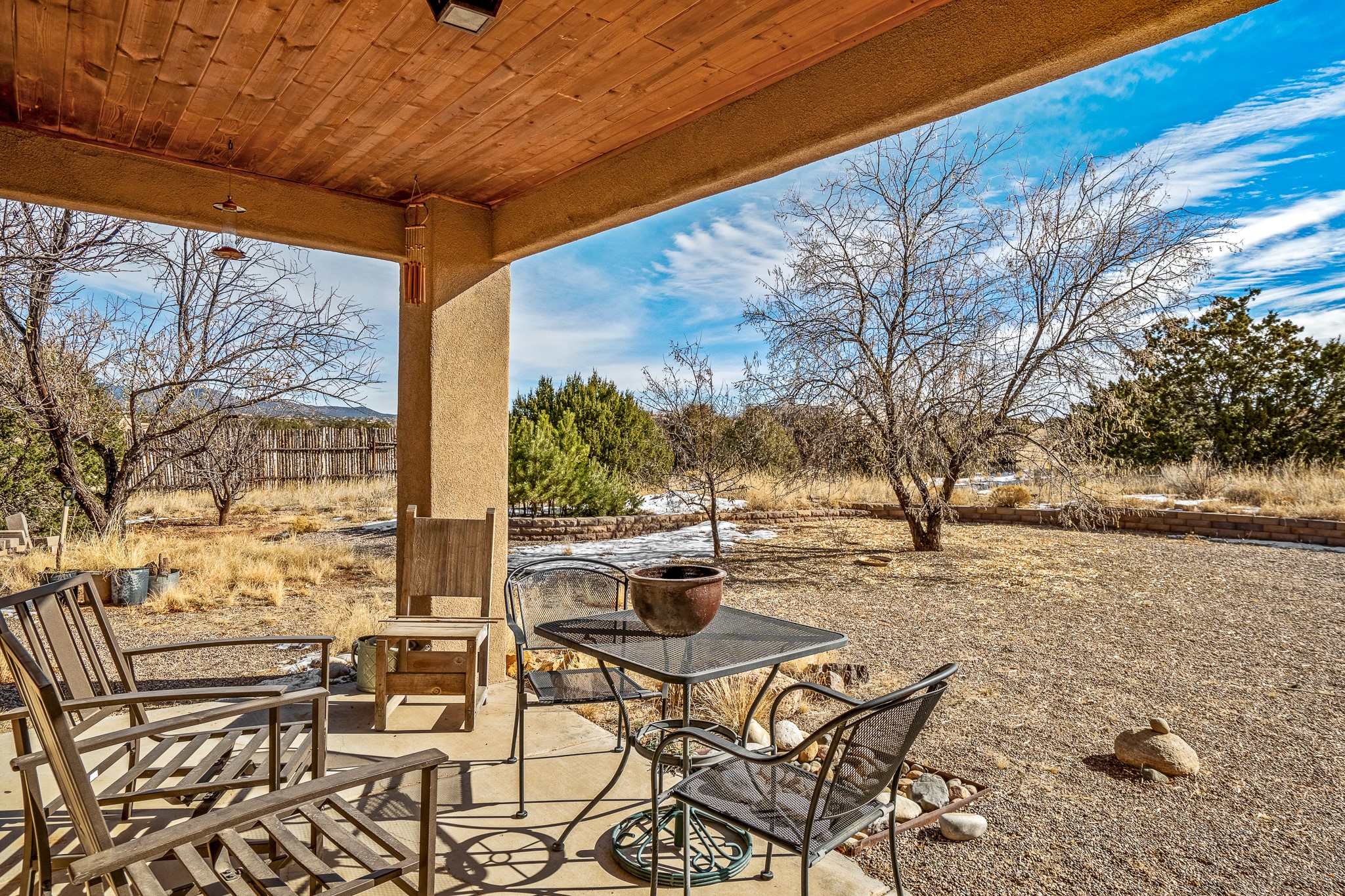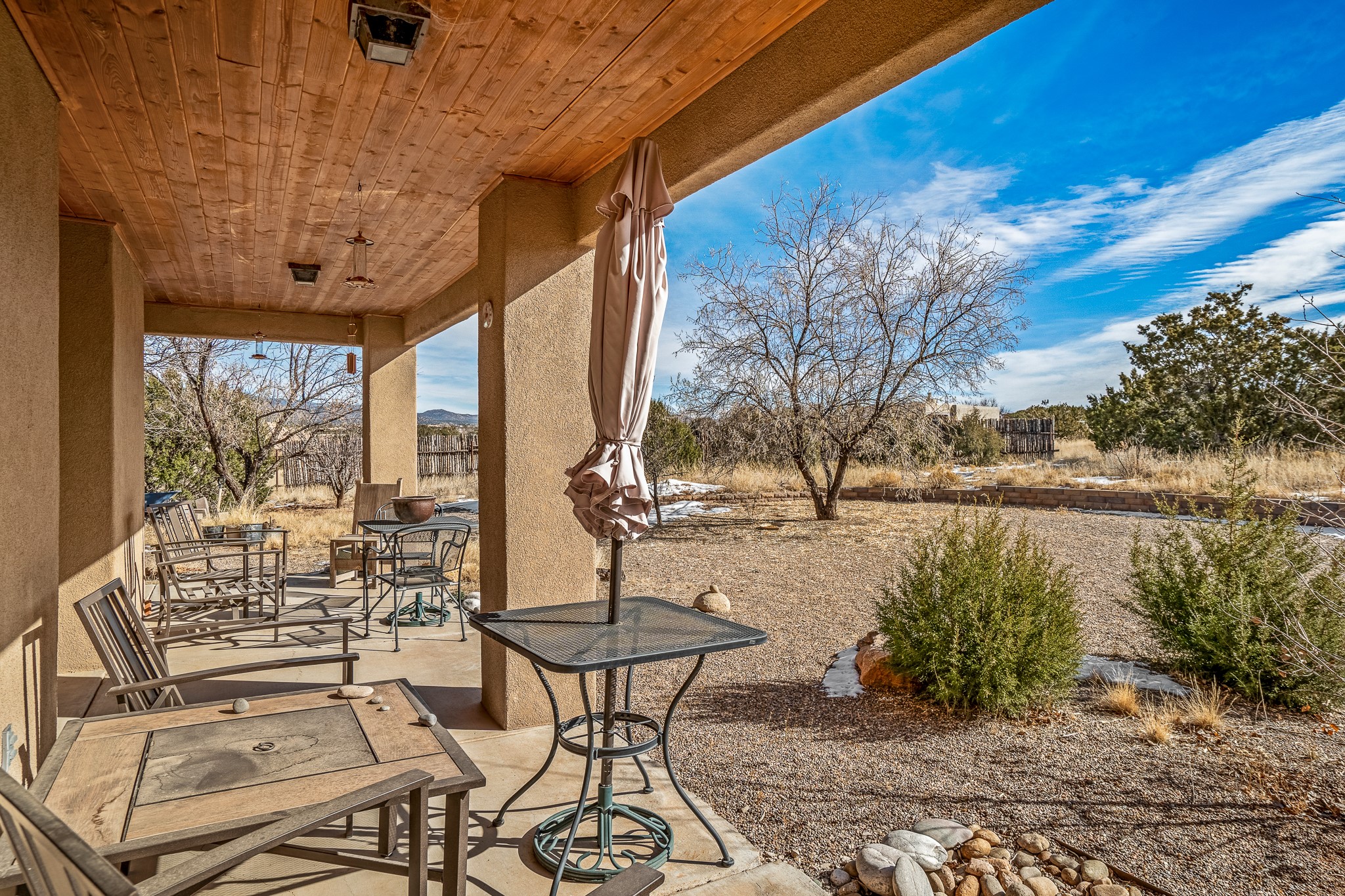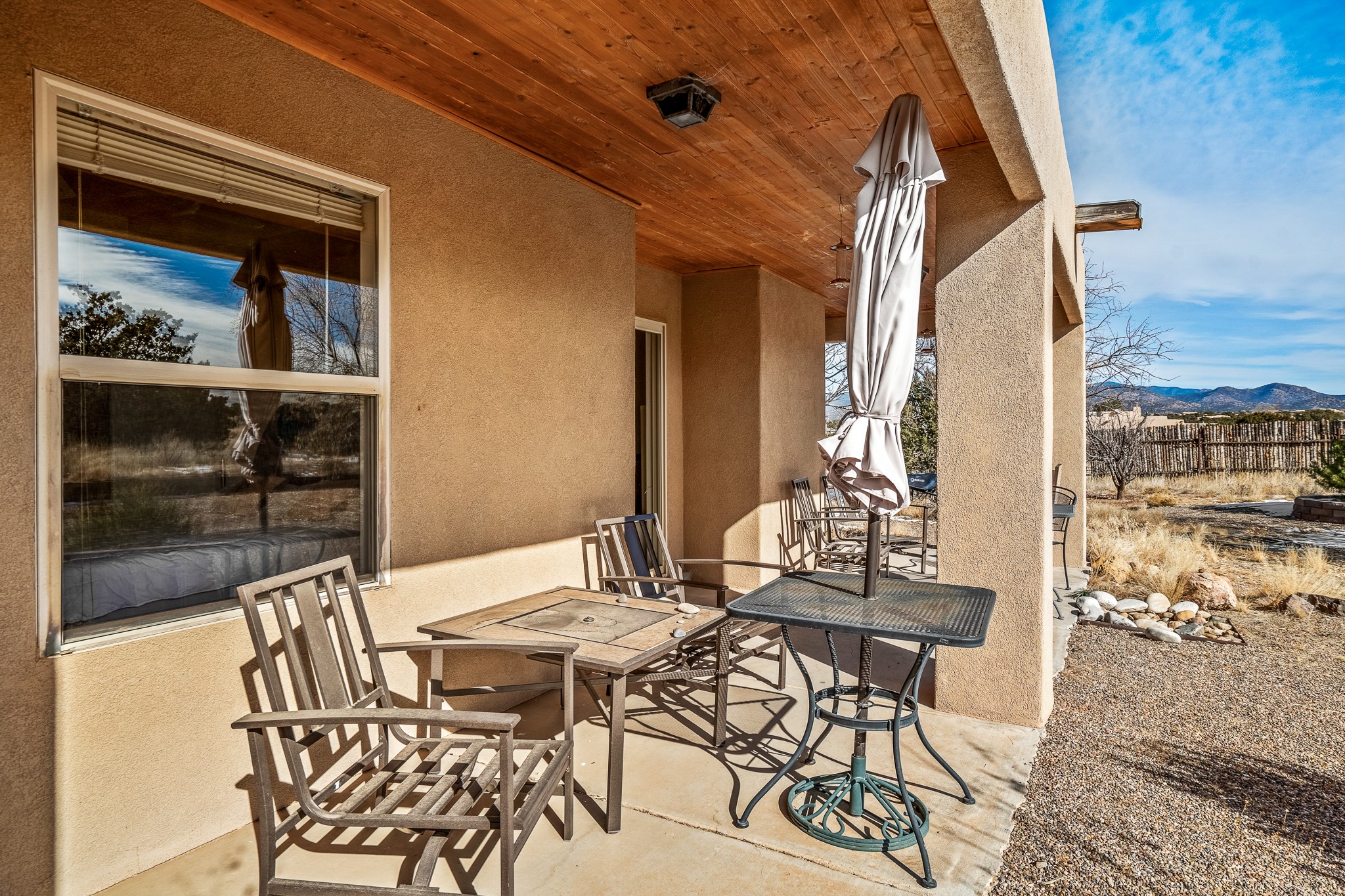 Lovely home on a view lot in desirable Eldorado. This 3 bedroom and 2 full bath home has been freshly painted and is ready for it's new owner. Features include: vigas in the living room, wood burning fire place with gas starter, open floor plan, stainless steel kitchen appliances, good sized pantry, nice separation of the bedrooms from the main living space, lots of natural light, wonderful back portal, designated laundry room, refrigerated whole house air-conditioning, HOA approved trailer or RV screen in place and a fantastic oversized two car garage. The Eldorado community offers many amenities which include tennis and pickle ball courts, hiking trails, a seasonal outdoor community pool and much more. Additionally Eldorado is home to a full purpose grocery store, hardware store, dining options, public library and a wonderful senior center.
