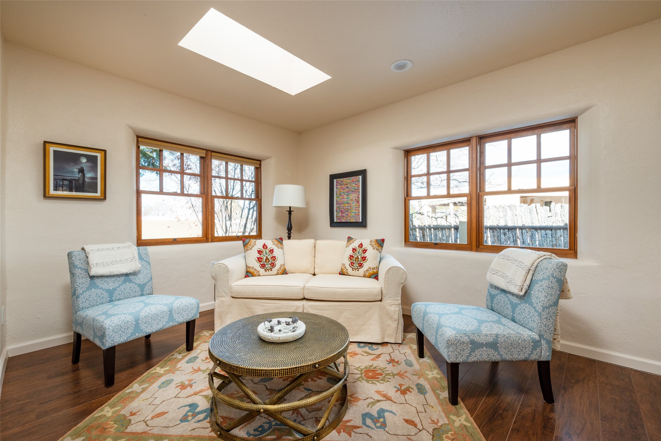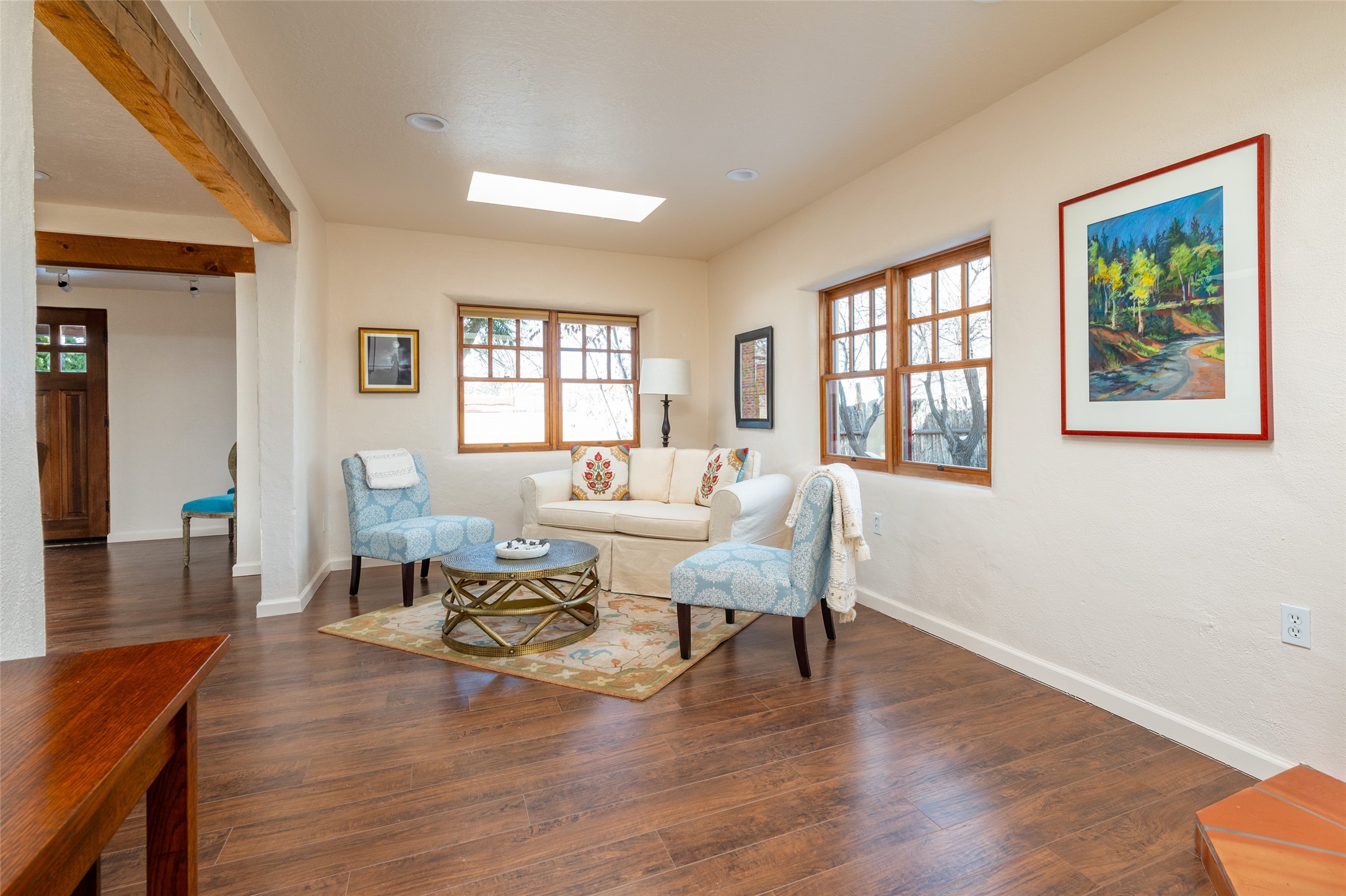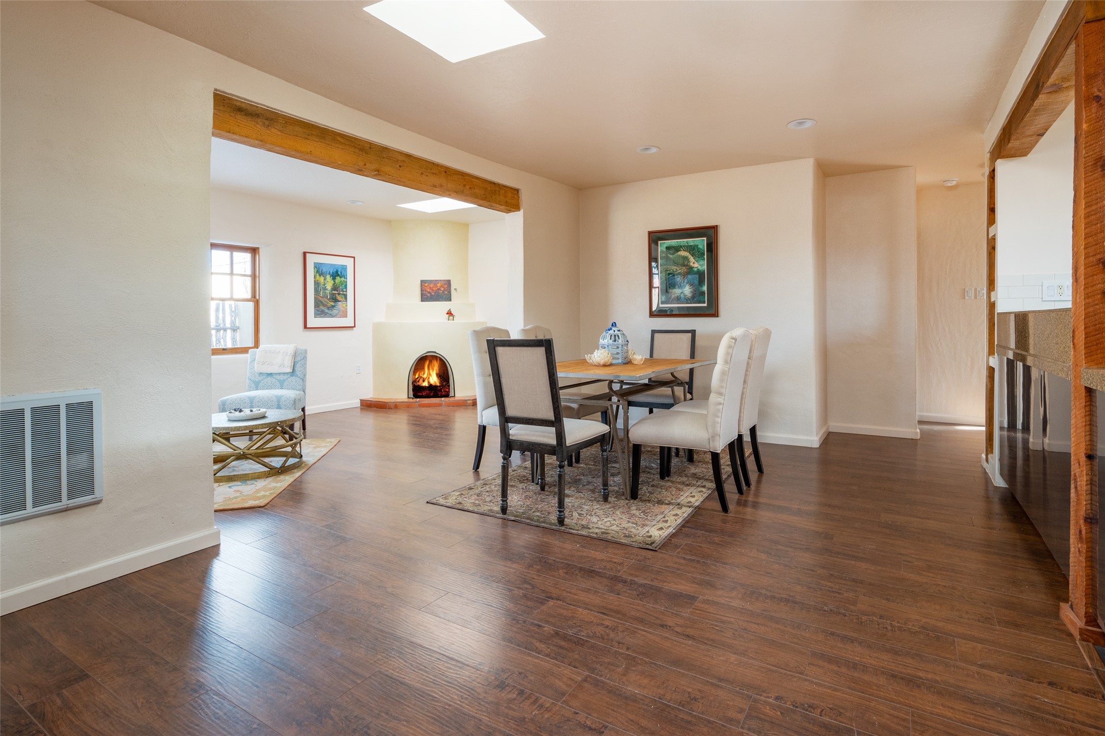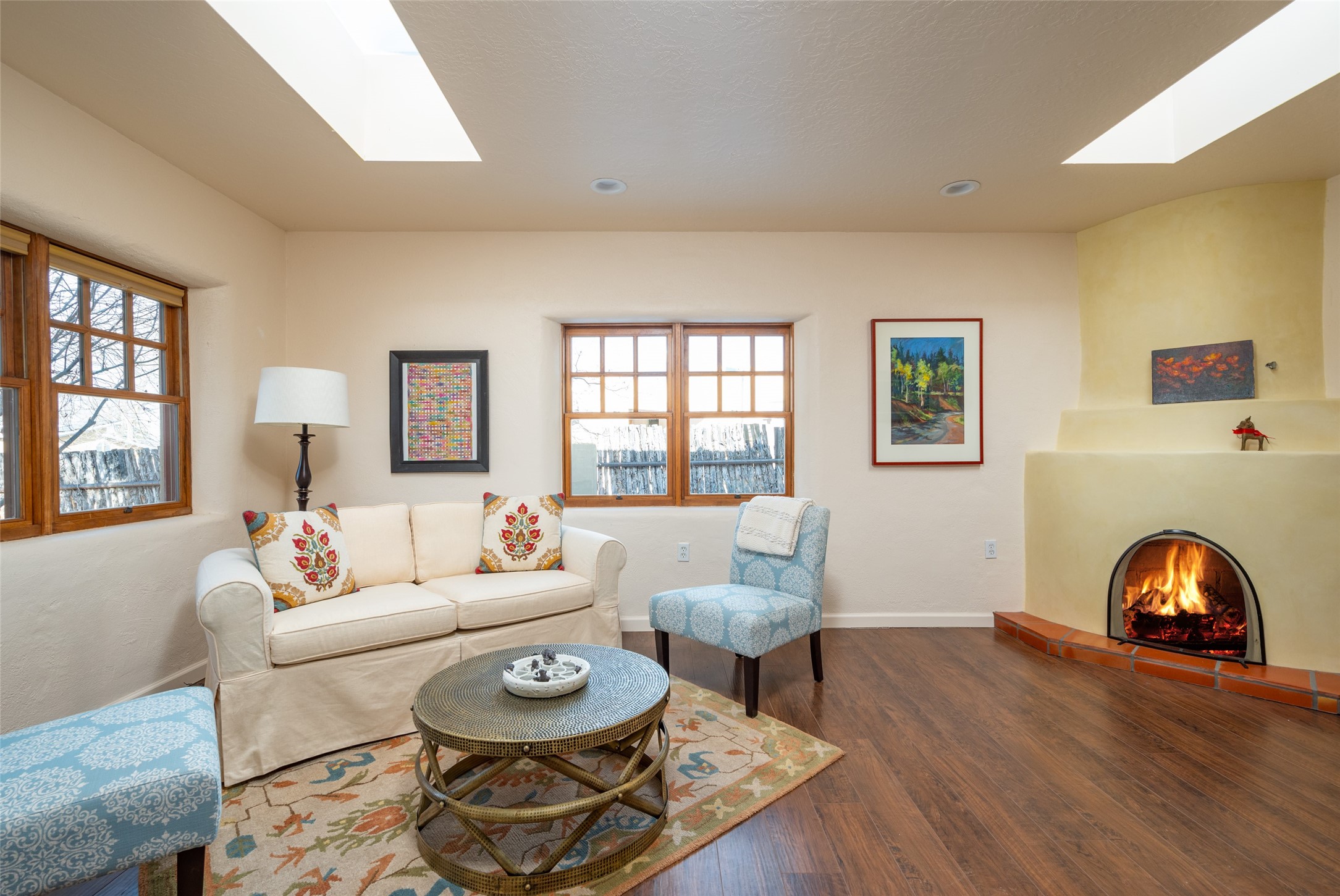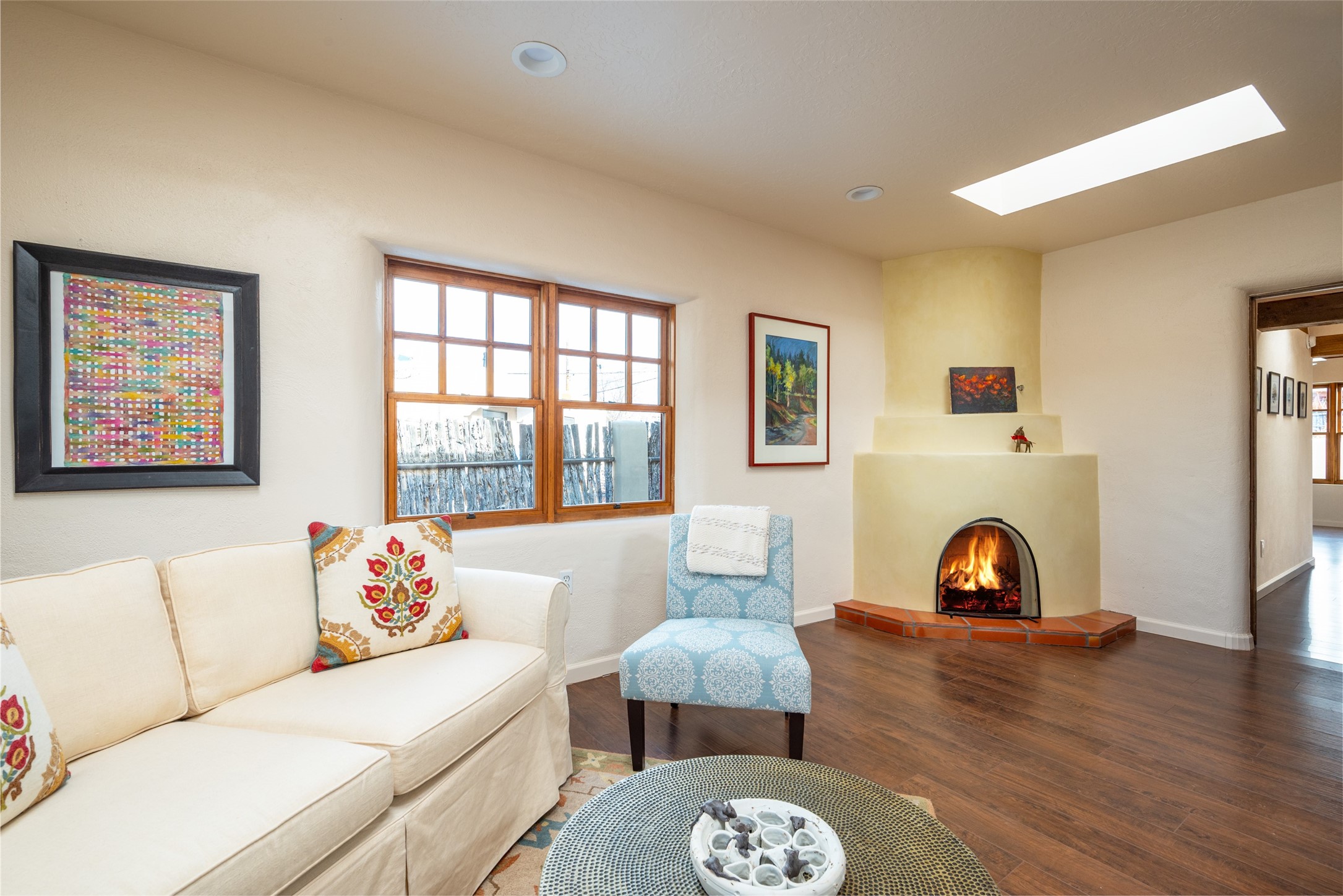 Lovely warm and welcoming home for some lucky Buyer(s). Open floor plan for comfort and ease, with good bedroom separation. The primary bedroom and one of the guest bedrooms have french doors to the backyard covered portal . Superb renovation with chef's kitchen , European style wall mounted electric radiant heaters, dark plank flooring, double paned windows throughout, skylights, and a sweet kiva fireplace to welcome Santa. Completely walled in front and backyards and a direct entry from the garage. Easy low maintenance yard for someone to bring their garden vision to. All this in a central location close to restaurants, shopping and entertainment.