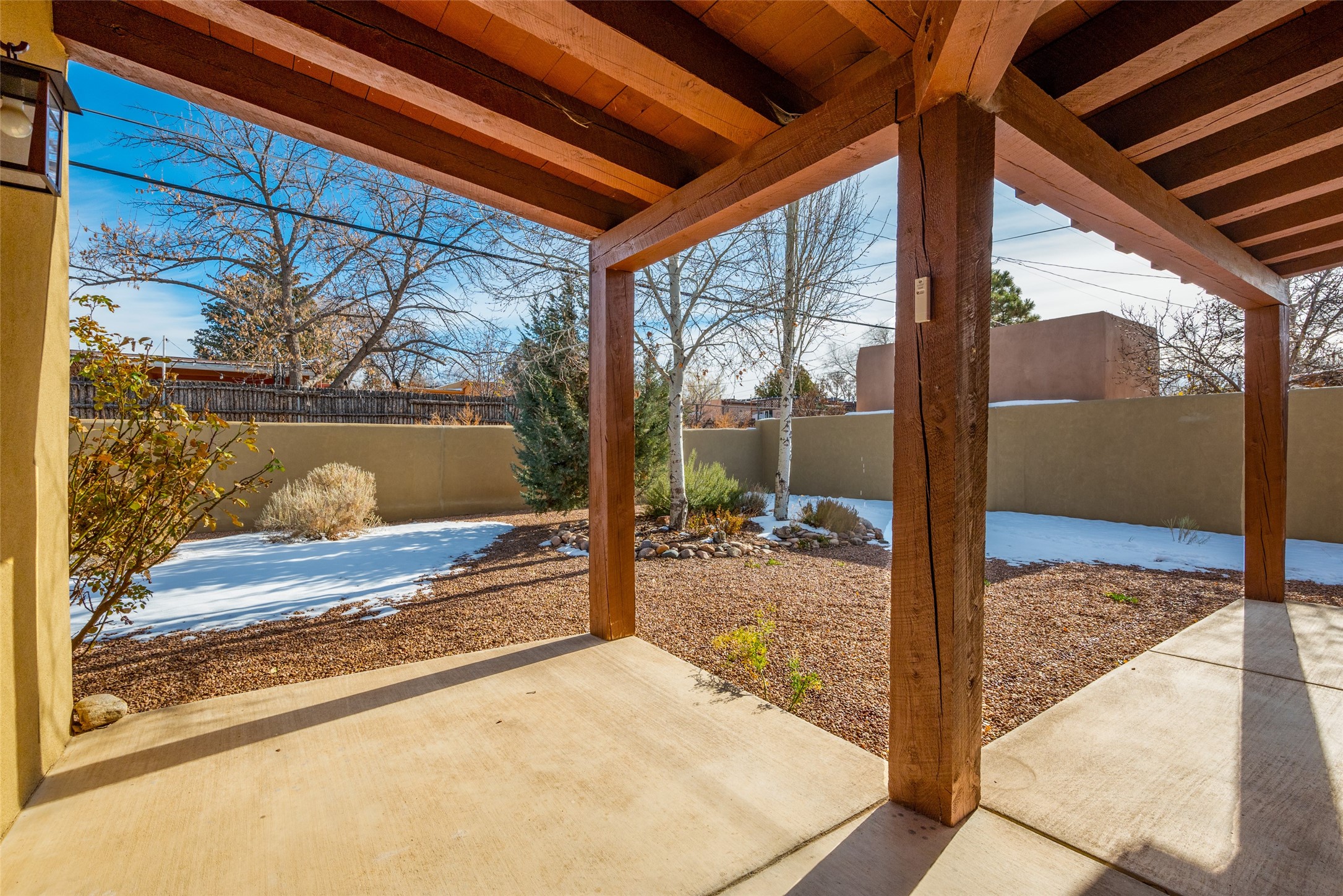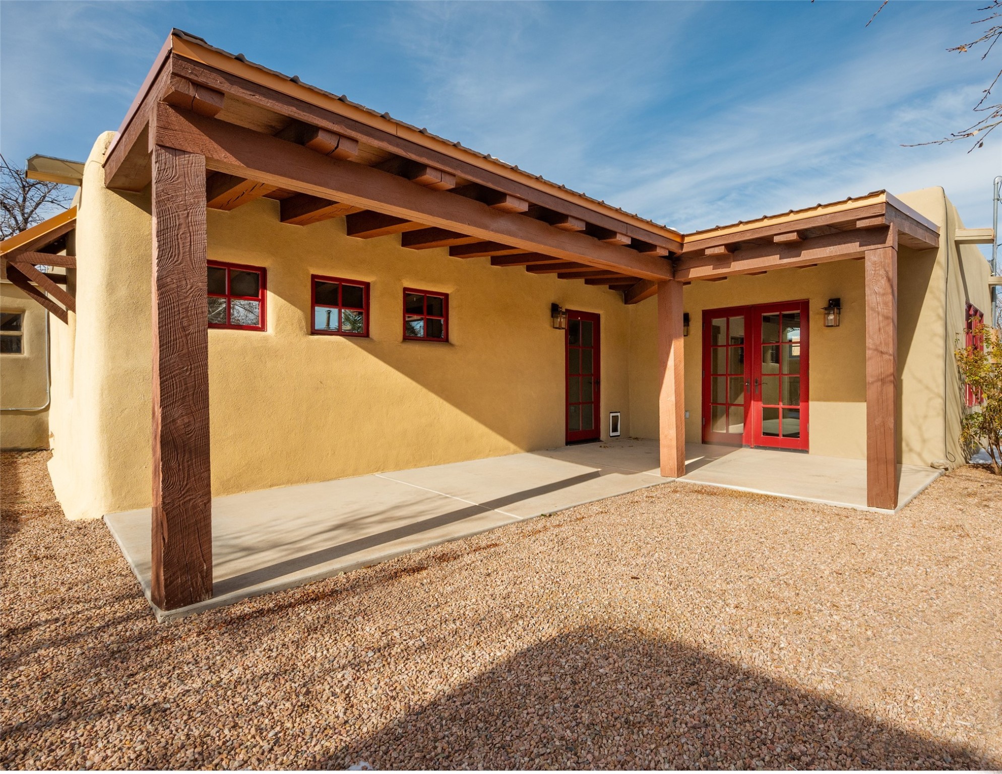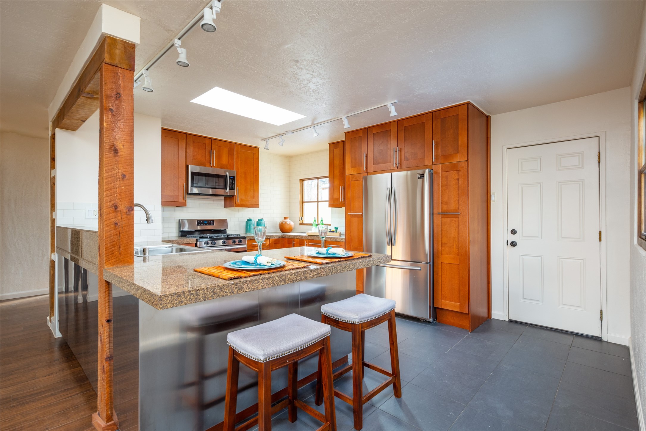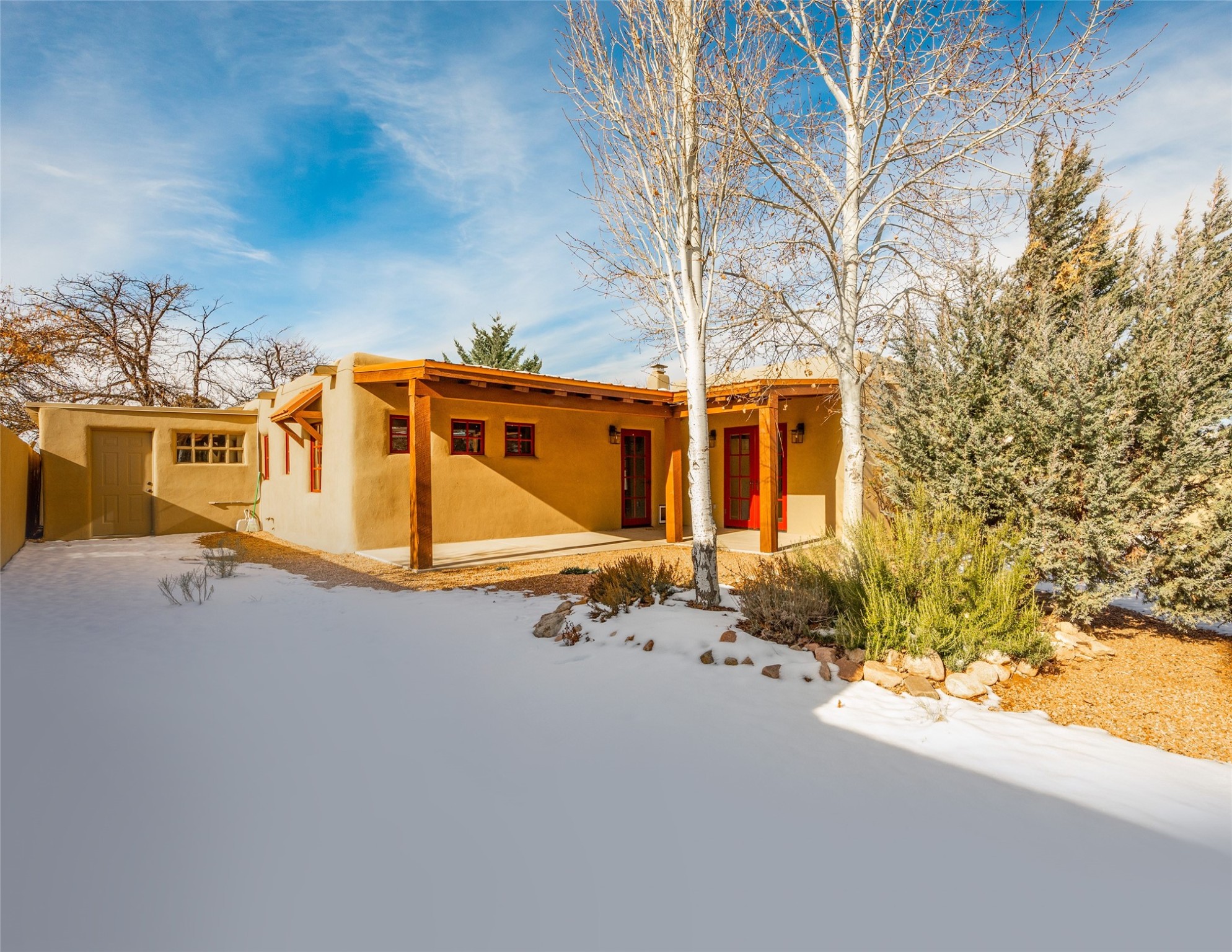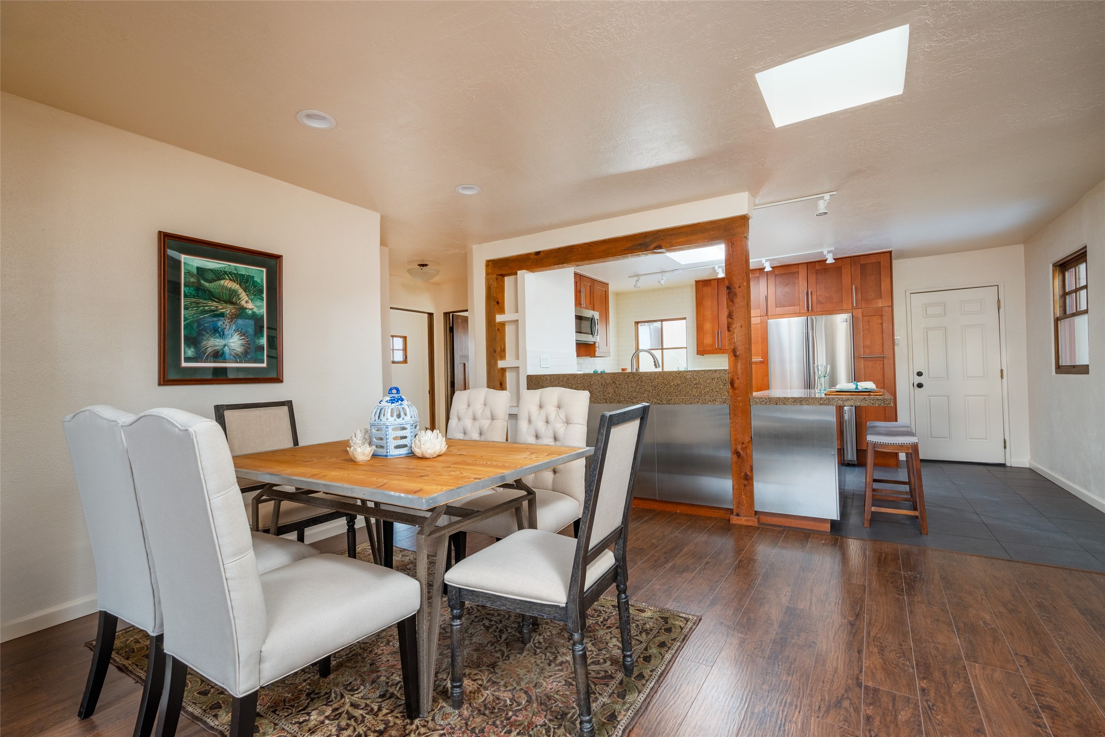 Lovely warm and welcoming home for some lucky Buyer(s). Open floor plan for comfort and ease, with good bedroom separation. The primary bedroom and one of the guest bedrooms have french doors to the backyard covered portal . Superb renovation with chef's kitchen , European style wall mounted electric radiant heaters, dark plank flooring, double paned windows throughout, skylights, and a sweet kiva fireplace to welcome Santa. Completely walled in front and backyards and a direct entry from the garage. Easy low maintenance yard for someone to bring their garden vision to. All this in a central location close to restaurants, shopping and entertainment.