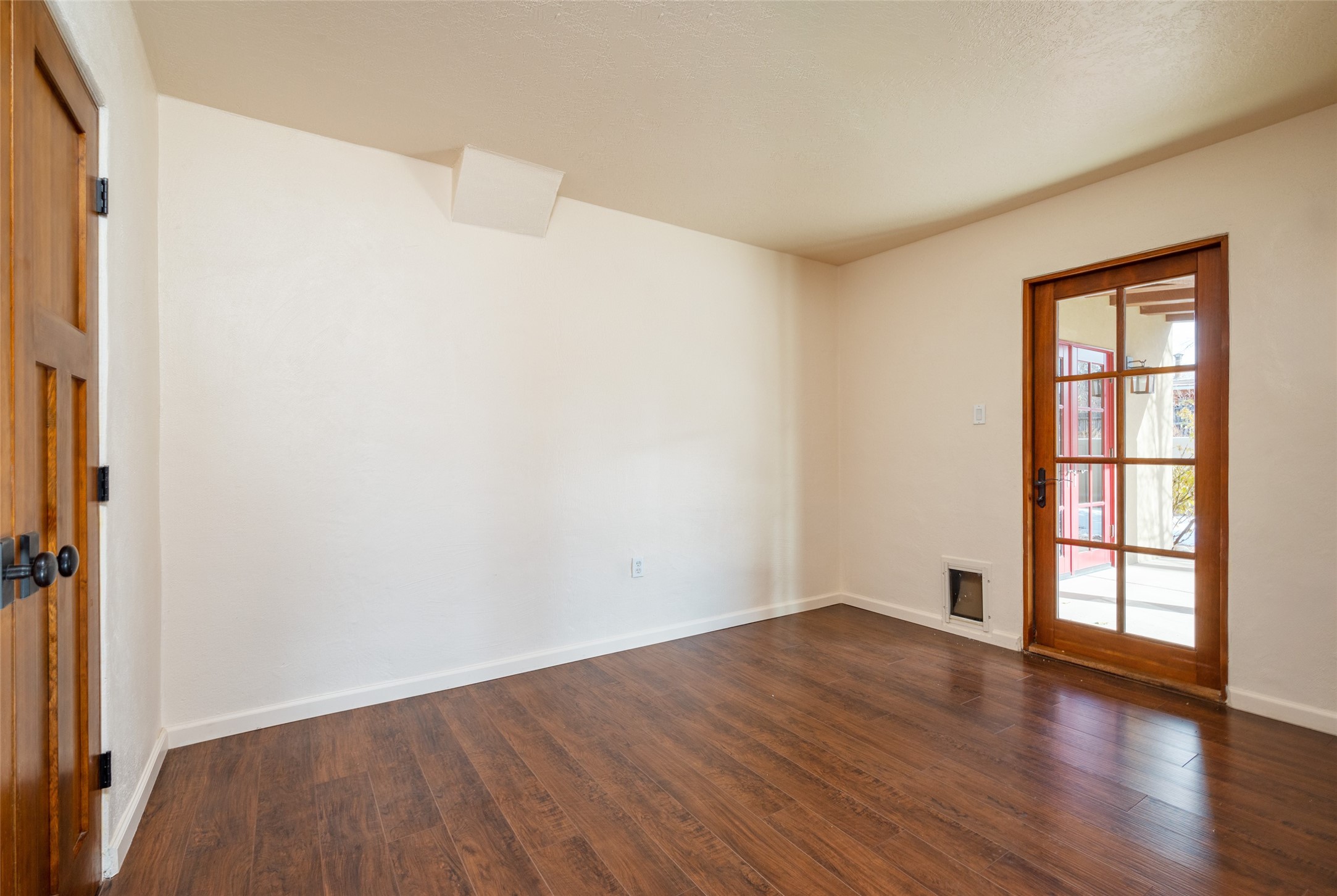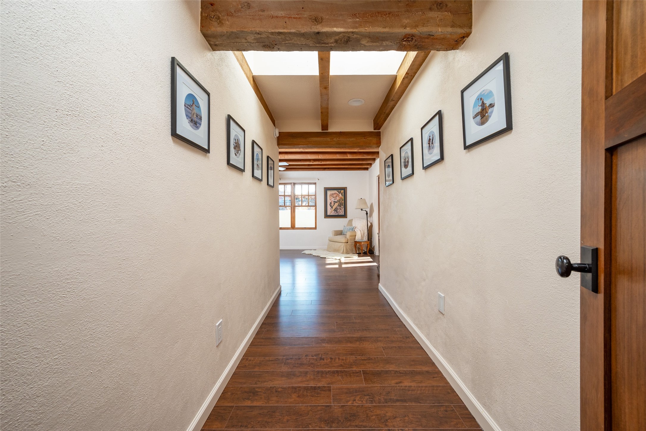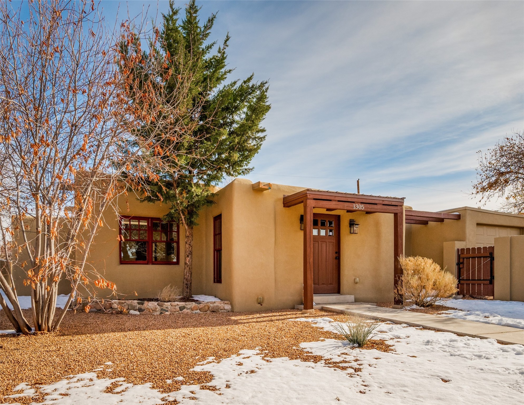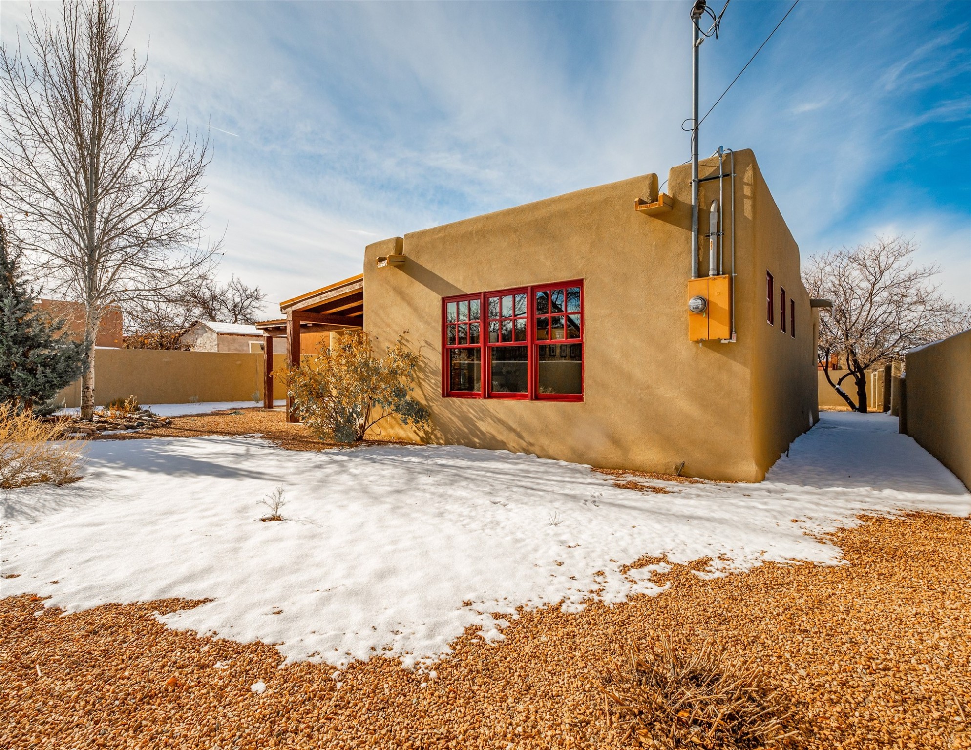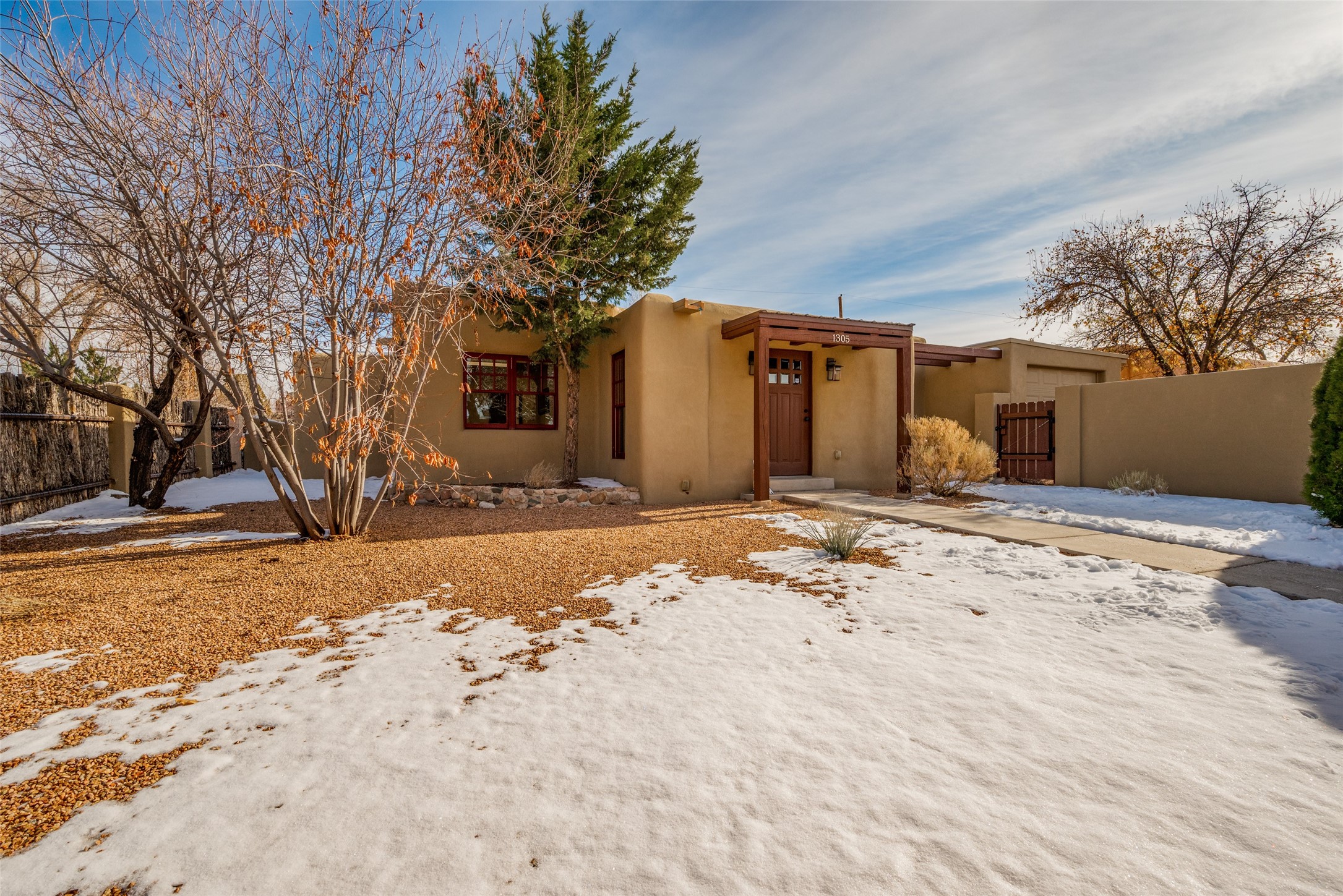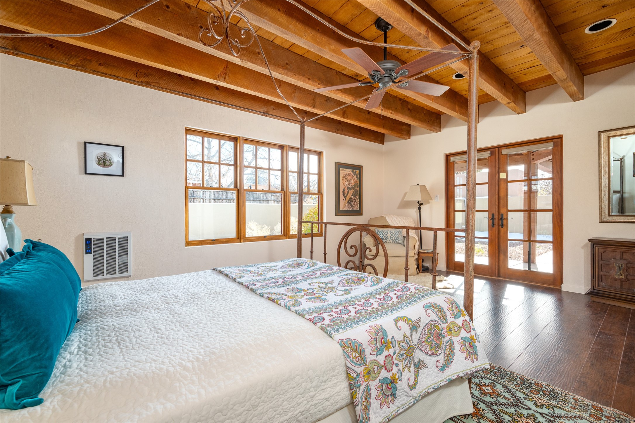 Lovely warm and welcoming home for some lucky Buyer(s). Open floor plan for comfort and ease, with good bedroom separation. The primary bedroom and one of the guest bedrooms have french doors to the backyard covered portal . Superb renovation with chef's kitchen , European style wall mounted electric radiant heaters, dark plank flooring, double paned windows throughout, skylights, and a sweet kiva fireplace to welcome Santa. Completely walled in front and backyards and a direct entry from the garage. Easy low maintenance yard for someone to bring their garden vision to. All this in a central location close to restaurants, shopping and entertainment.