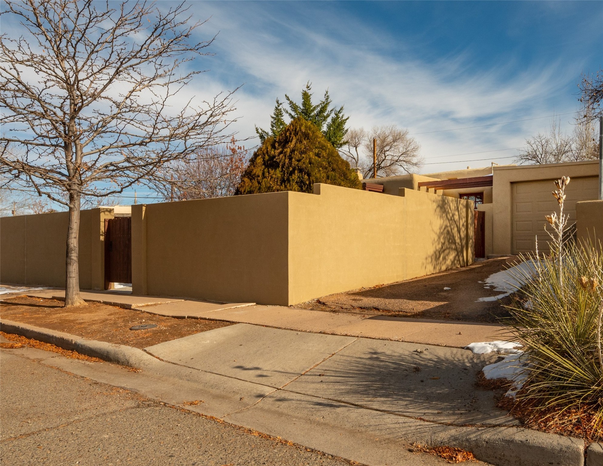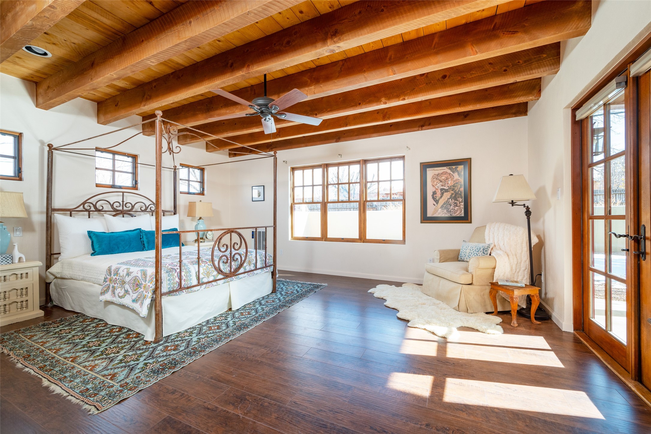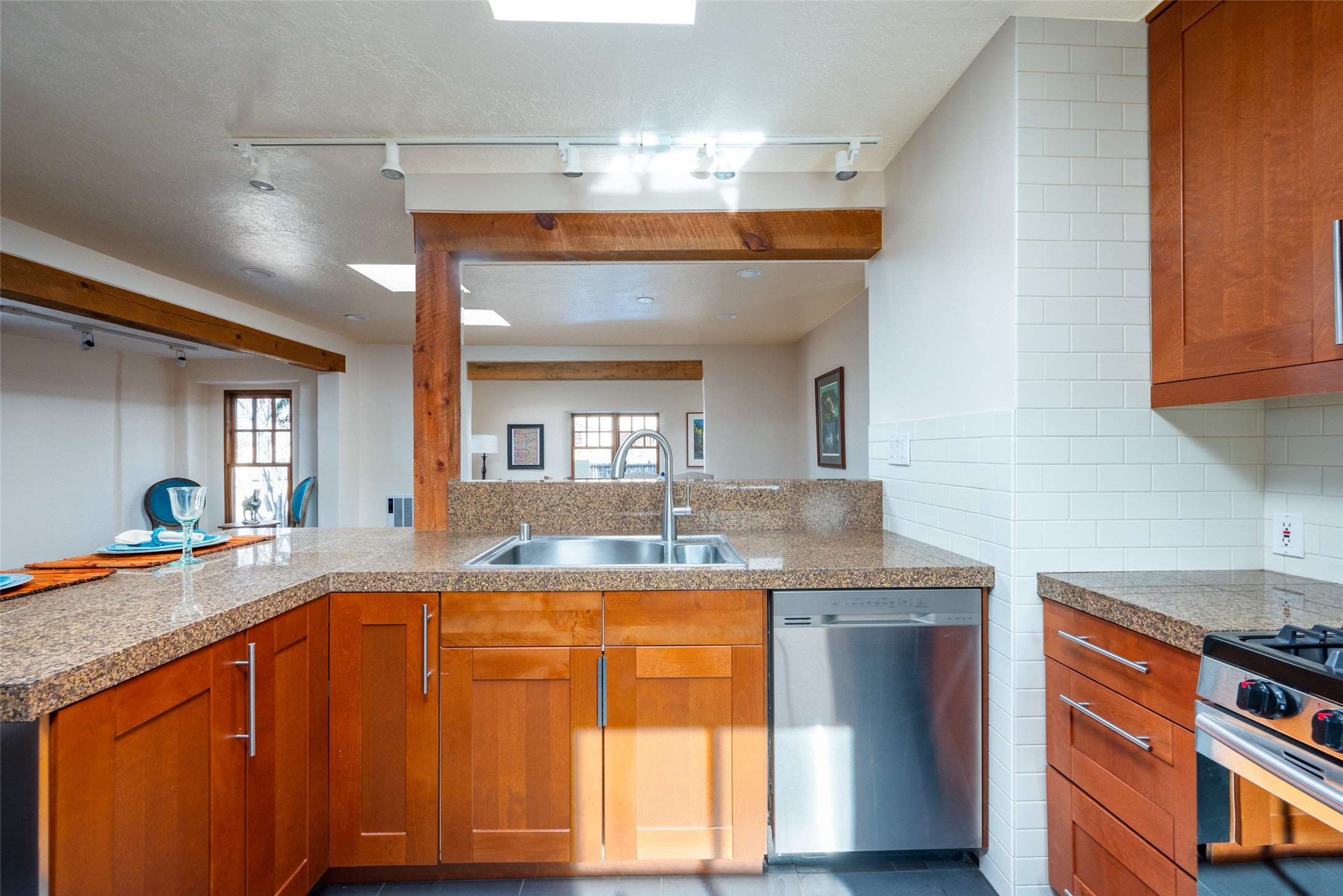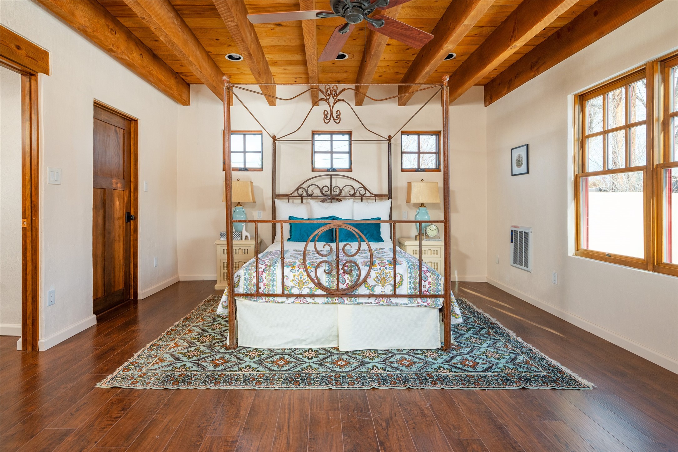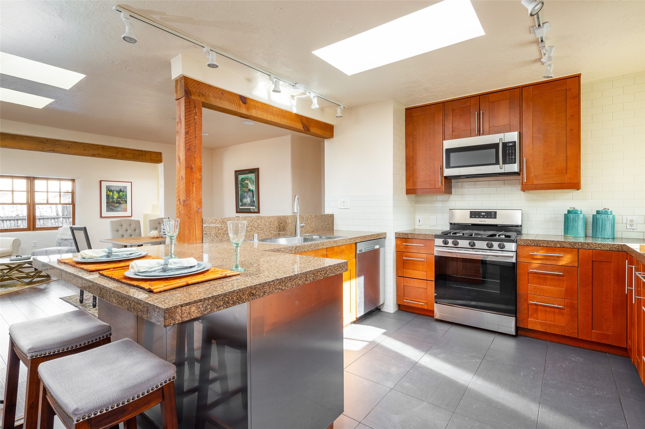 Lovely warm and welcoming home for some lucky Buyer(s). Open floor plan for comfort and ease, with good bedroom separation. The primary bedroom and one of the guest bedrooms have french doors to the backyard covered portal . Superb renovation with chef's kitchen , European style wall mounted electric radiant heaters, dark plank flooring, double paned windows throughout, skylights, and a sweet kiva fireplace to welcome Santa. Completely walled in front and backyards and a direct entry from the garage. Easy low maintenance yard for someone to bring their garden vision to. All this in a central location close to restaurants, shopping and entertainment.