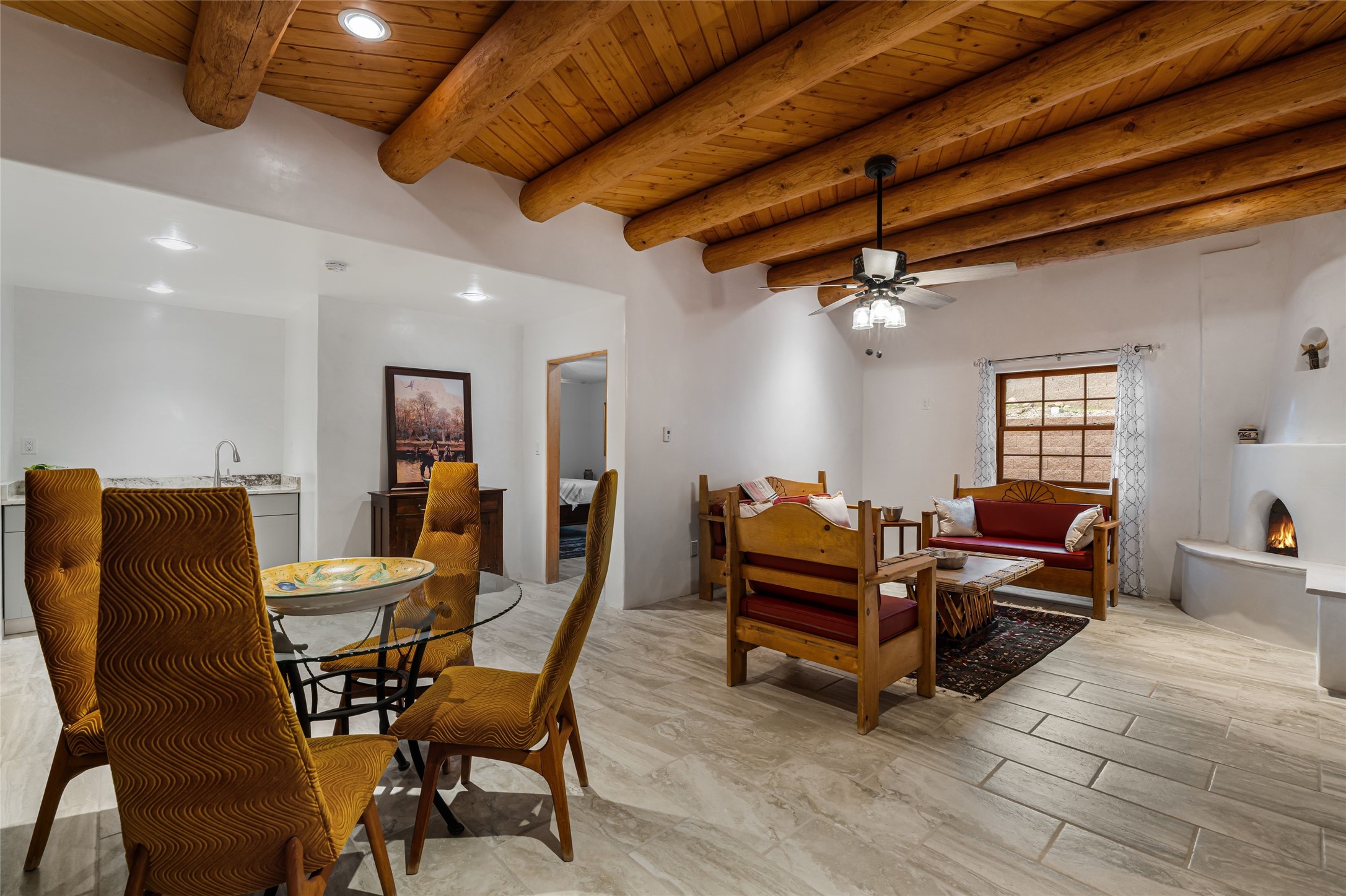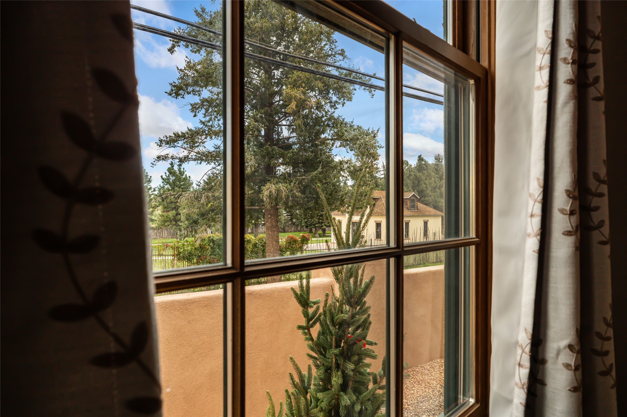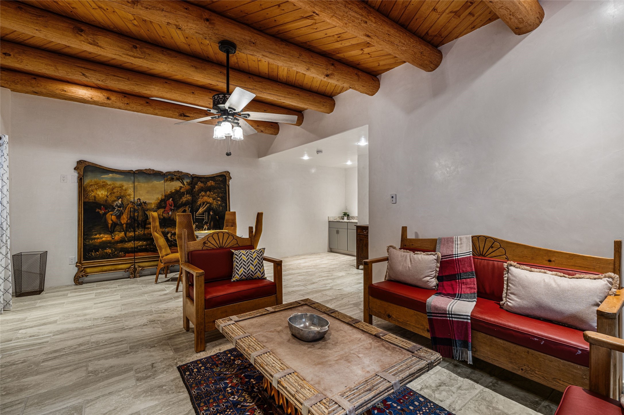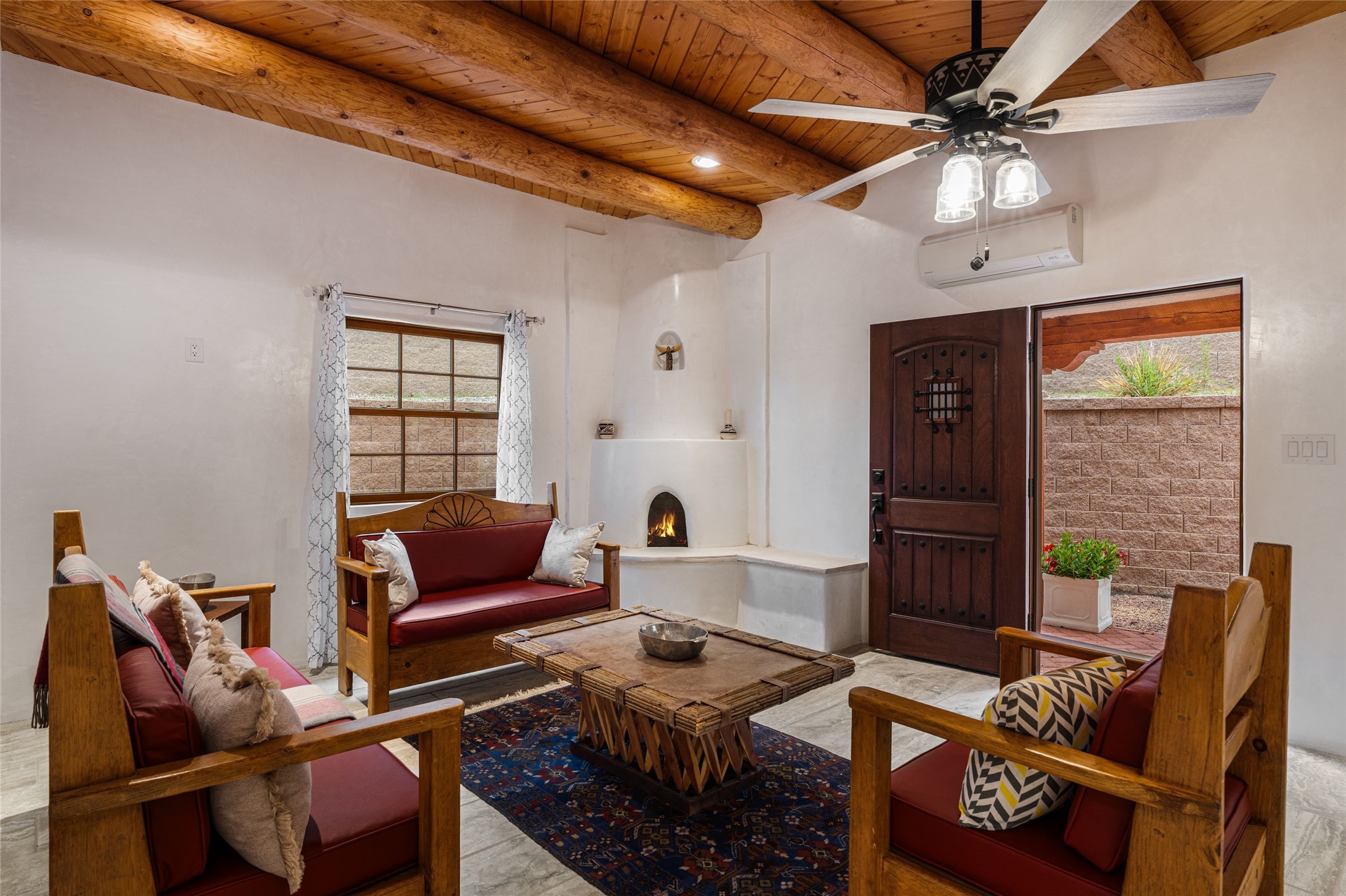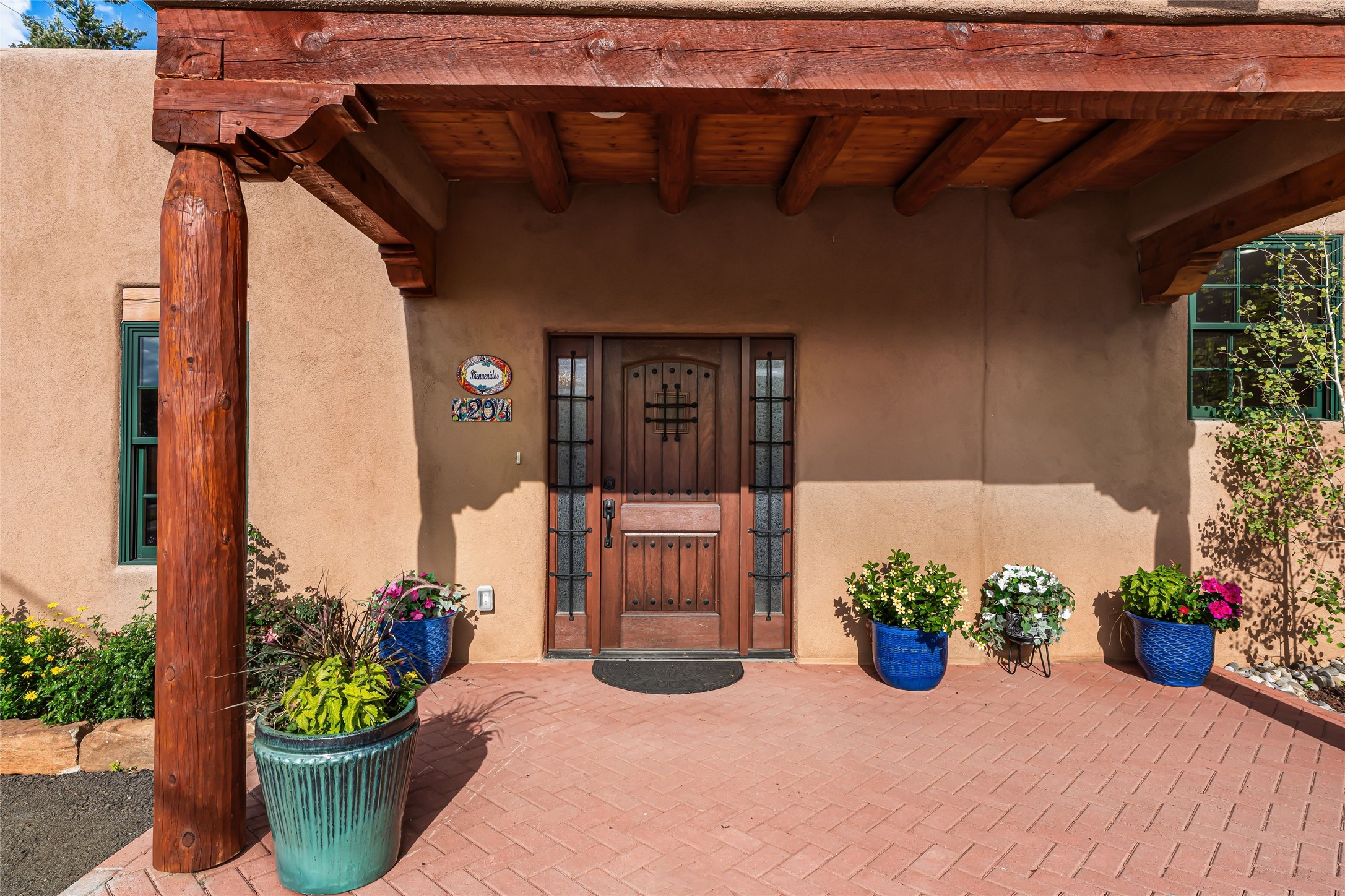 Elegant Eastside Living on Upper Canyon Road - Set in a premier Eastside location across from the tree-lined Santa Fe River Park, this beautifully designed and built 4-bedroom, 4.5-bathroom estate blends timeless Southwestern charm with modern luxury. Offering approximately 3,800 square feet on a 0.45-acre lot, the property includes a 3BD/3BA main residence and a 1BD/1BA guest suite, thoughtfully designed for comfort, privacy, and style. Inside, clean architectural lines meet regional authenticity with vigas, corbels, and nichos, complemented by diamond-finish plaster walls, wide porcelain tile, and rich wood flooring. The open-concept layout flows seamlessly through the home, anchored by a chef's kitchen with custom cabinetry, stainless steel appliances, a farmhouse sink, and an expansive marble center island. The living and dining spaces feature vaulted ceilings, art-worthy wall space, and abundant natural light. A serene primary suite offers a walk-in closet, artisan stained-glass windows, and a spa-like bath with soaking tub and glass-enclosed shower. Radiant heat and mini-split systems (with heat and a/c) throughout ensure year-round comfort. The landscaped grounds invite outdoor living with portals and patios ideal for entertaining or quiet reflection. A privacy wall encloses the property, and an oversized one-car garage offers additional storage. Located near the historic Cristo Rey Church--a landmark by architect John Gaw Meem--this property captures the essence of Santa Fe living: elegant, rooted in history, and surrounded by natural beauty.