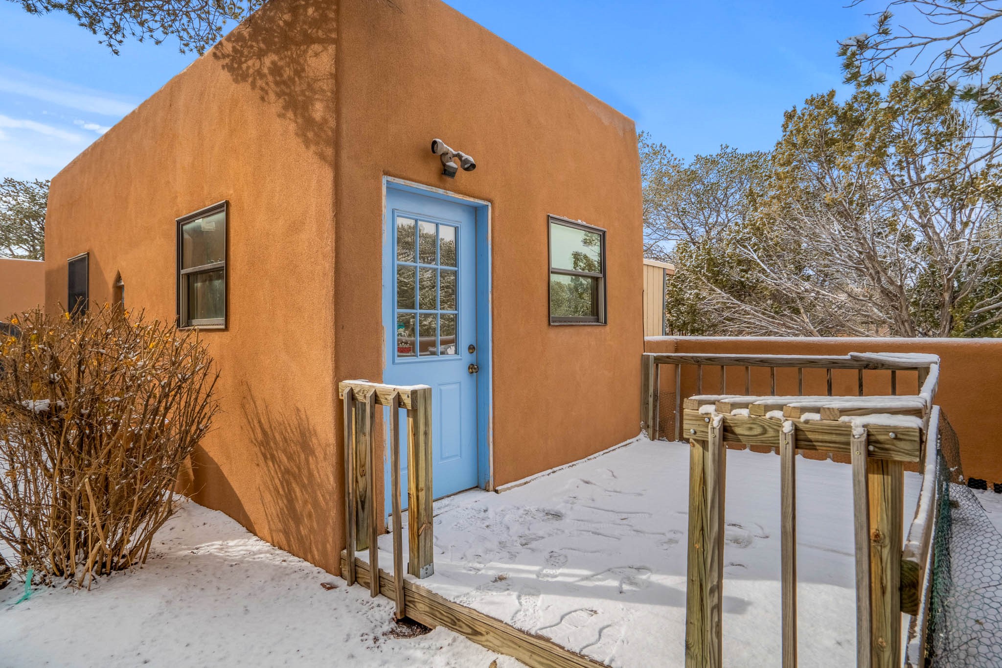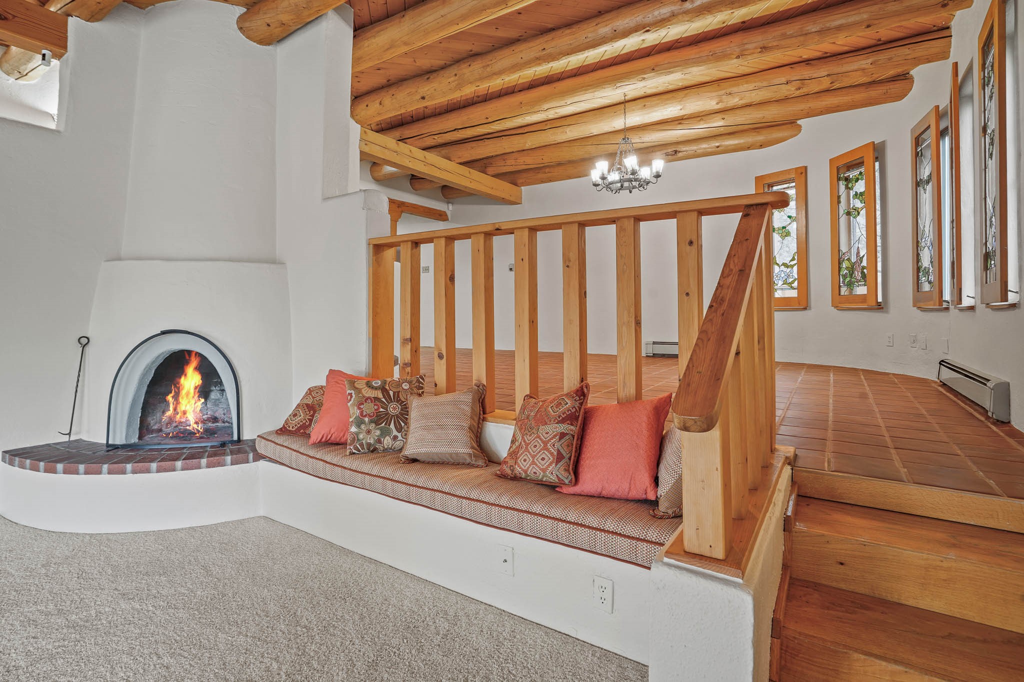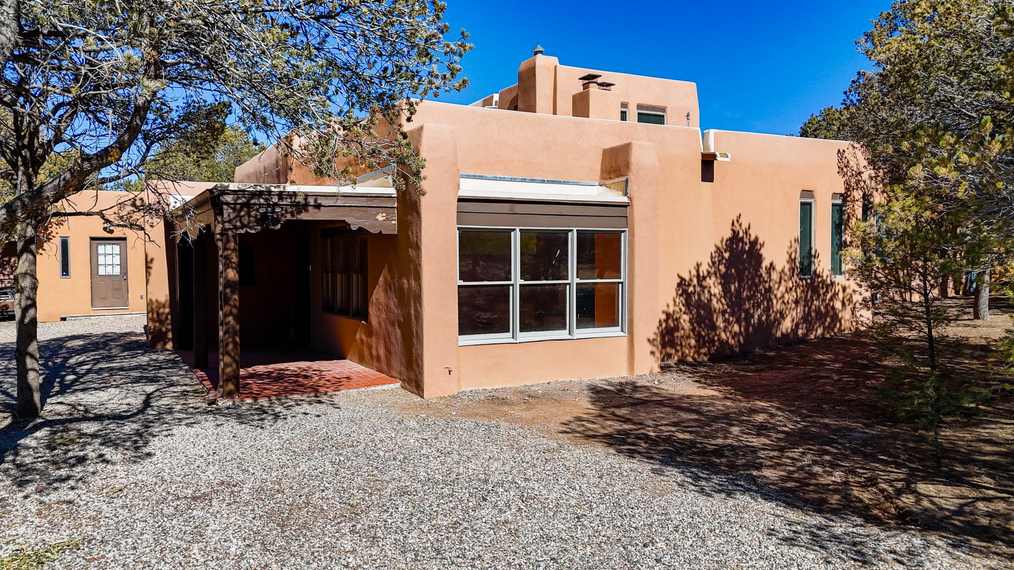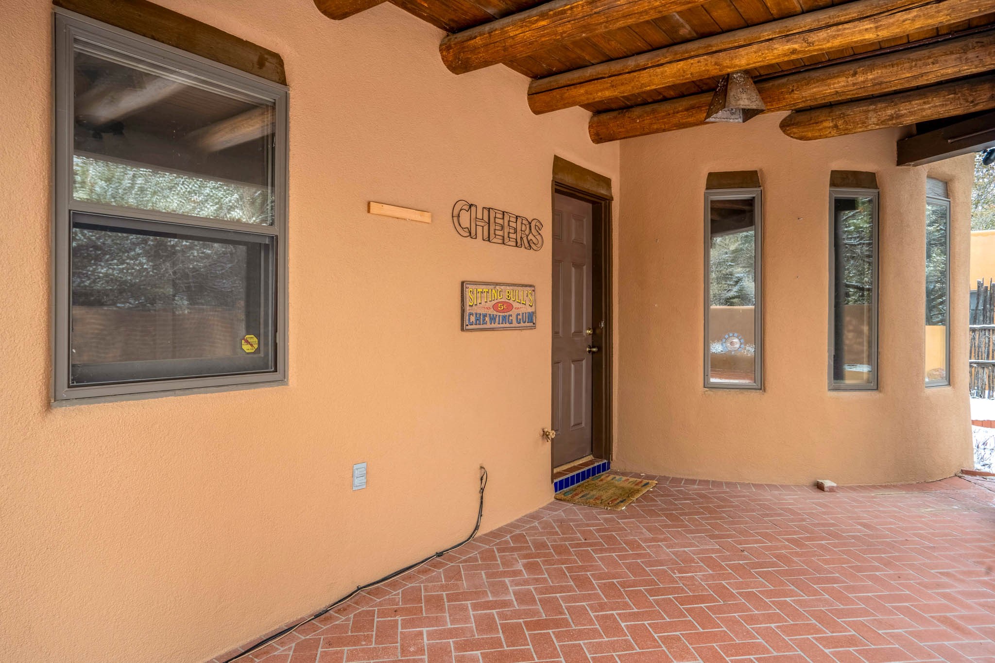Nestled in a serene eastside neighborhood, this charming home sits on a generous 0.5-acre parcel, offering the perfect blend of tranquility and convenience. Ideally located just minutes from downtown Santa Fe and steps away from the Sun Mountain hiking trails, this property is a haven for nature enthusiasts and city dwellers alike. Situated within the highly sought-after Wood Gormley school district, this 2,094-square-foot home features 3 bedrooms and 3 full bathrooms. Inside, you'll find a beautifully open kitchen with Saltillo tile flooring and warmed by radiant baseboard heating. The living room steals the show with its elevated ceiling, striking vigas, and a fireplace creating an inviting ambiance. Adding a touch of elegance, the dining room features custom stained-glass window shades that enhance the home's unique charm. Upstairs, the spacious primary bedroom includes access to a private rooftop deck, where you can unwind and take in Santa Fe's iconic sunsets. Outside, the secluded backyard is ideal for entertaining or simply enjoying the peace and quiet. For those with creative passions or remote work needs, the property includes a two-car attached garage and two detached art studios/offices, providing ample space for hobbies or a home office. Additionally, the entire roof was replaced with TPO in March of 2022.Don't miss the opportunity to make this one-of-a-kind property your own. Schedule your showing today!