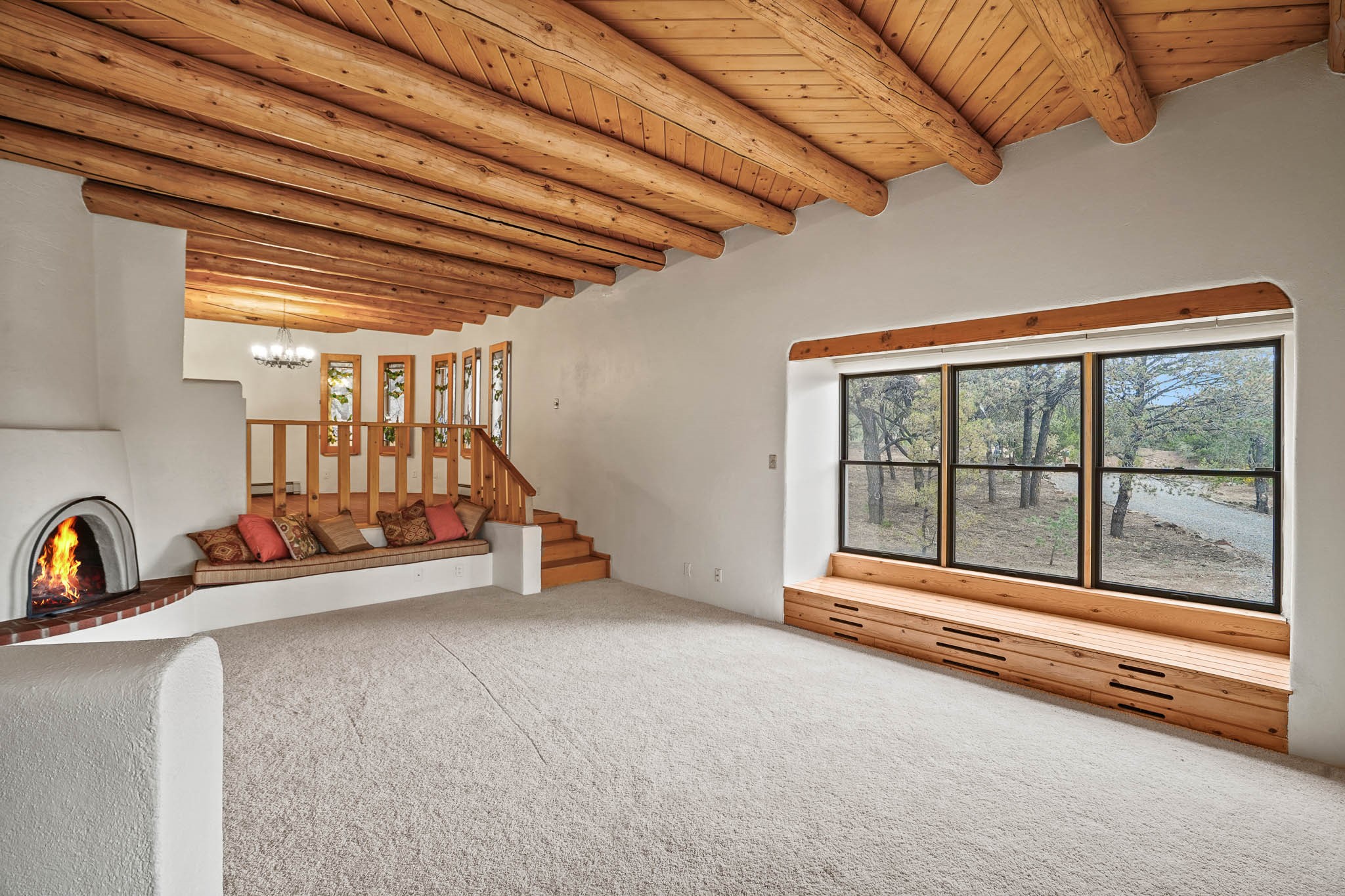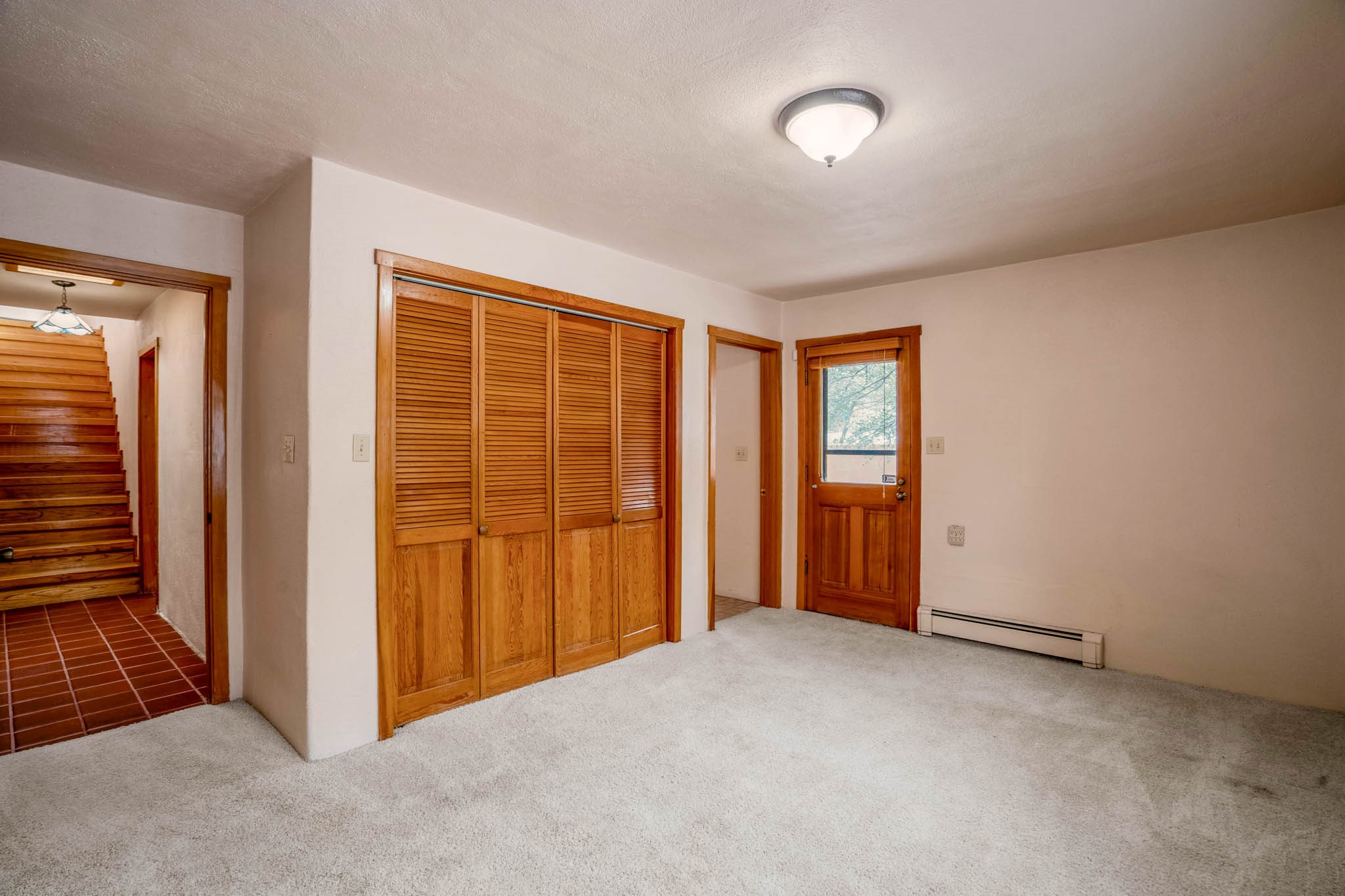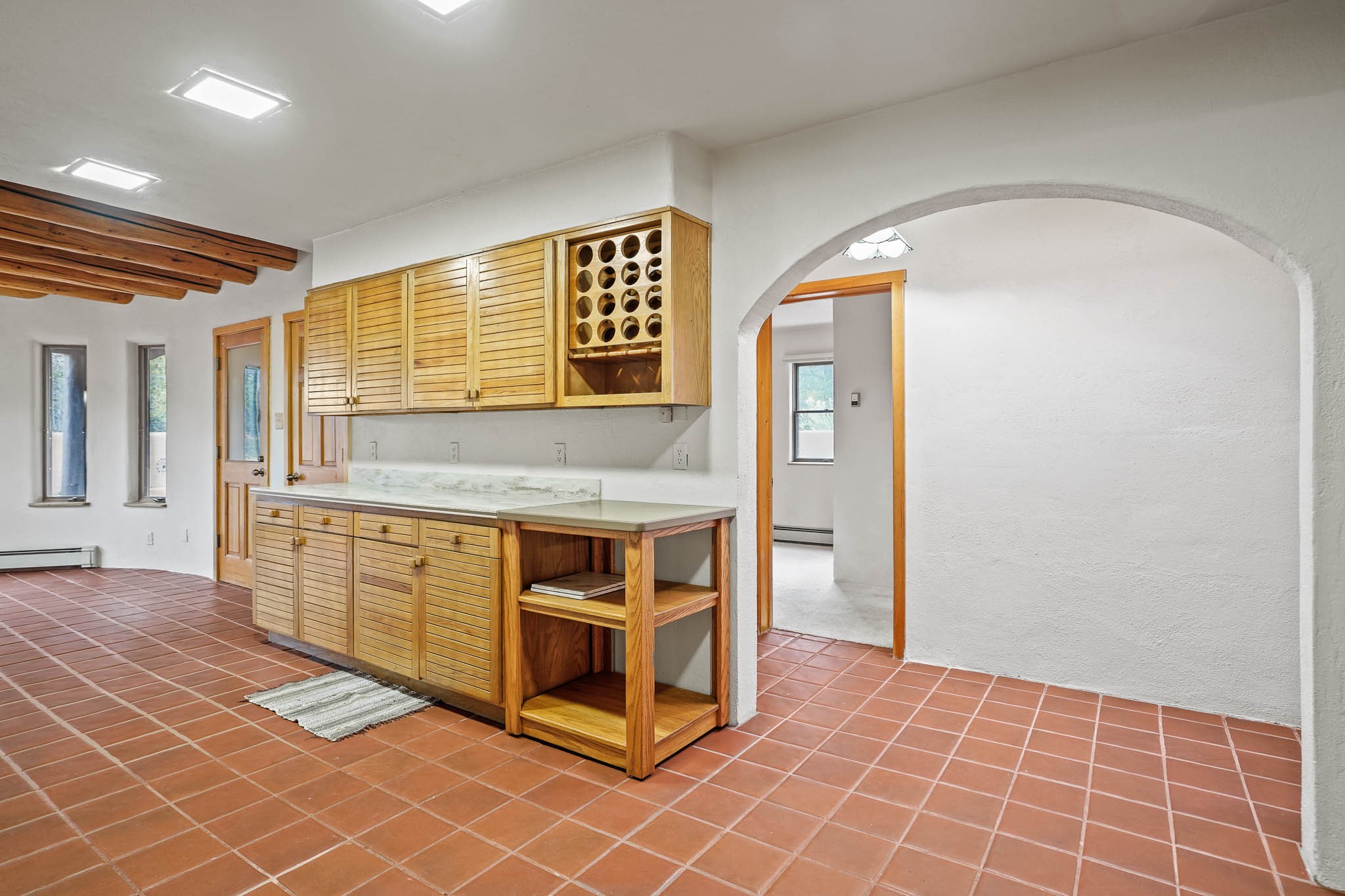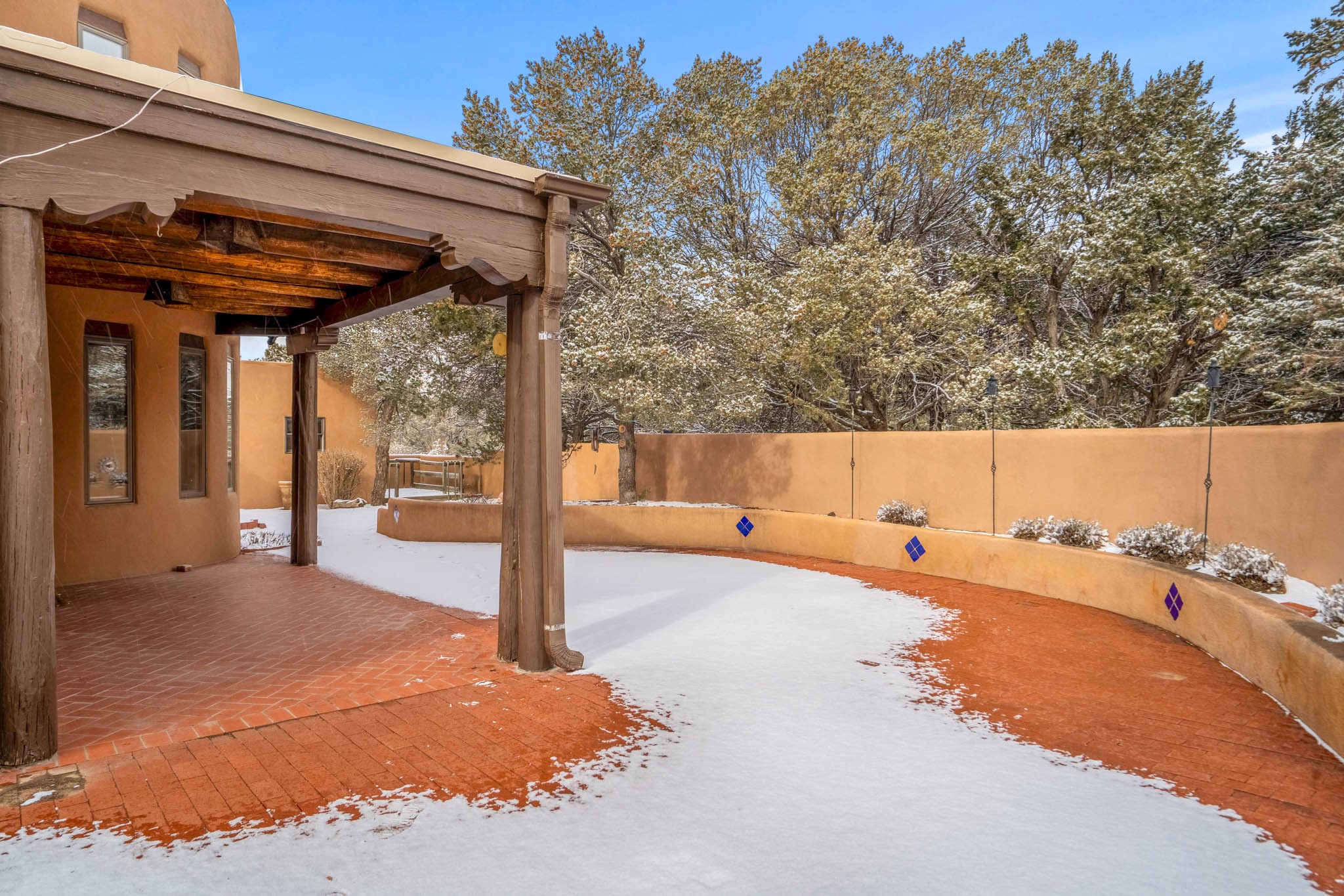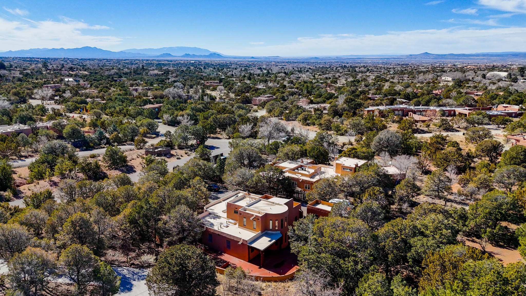 Nestled in a serene eastside neighborhood, this charming home sits on a generous 0.5-acre parcel, offering the perfect blend of tranquility and convenience. Ideally located just minutes from downtown Santa Fe and steps away from the Sun Mountain hiking trails, this property is a haven for nature enthusiasts and city dwellers alike. Situated within the highly sought-after Wood Gormley school district, this 2,094-square-foot home features 3 bedrooms and 3 full bathrooms. Inside, you'll find a beautifully open kitchen with Saltillo tile flooring and warmed by radiant baseboard heating. The living room steals the show with its elevated ceiling, striking vigas, and a fireplace creating an inviting ambiance. Adding a touch of elegance, the dining room features custom stained-glass window shades that enhance the home's unique charm. Upstairs, the spacious primary bedroom includes access to a private rooftop deck, where you can unwind and take in Santa Fe's iconic sunsets. Outside, the secluded backyard is ideal for entertaining or simply enjoying the peace and quiet. For those with creative passions or remote work needs, the property includes a two-car attached garage and two detached art studios/offices, providing ample space for hobbies or a home office. Additionally, the entire roof was replaced with TPO in March of 2022.Don't miss the opportunity to make this one-of-a-kind property your own. Schedule your showing today!