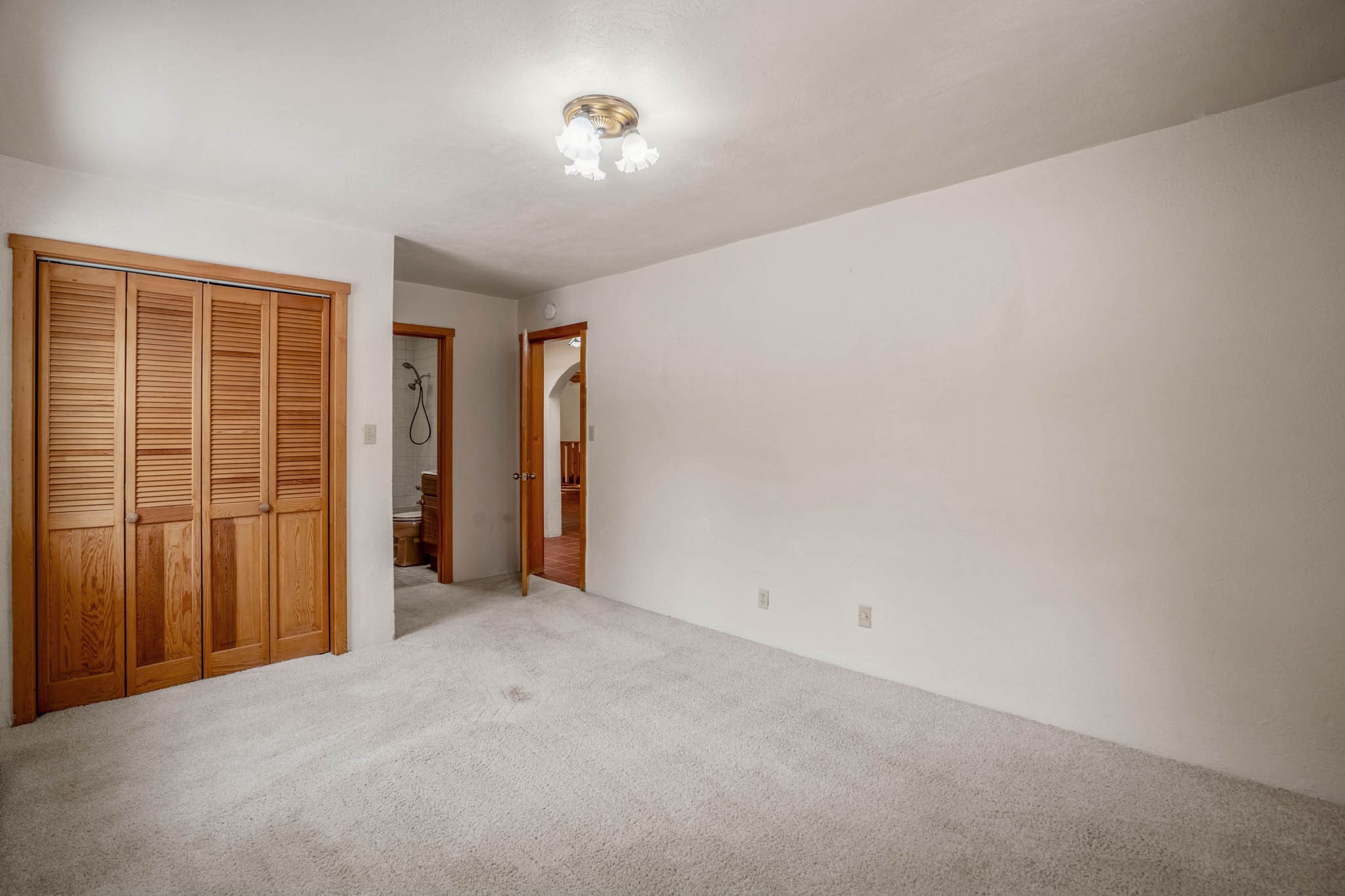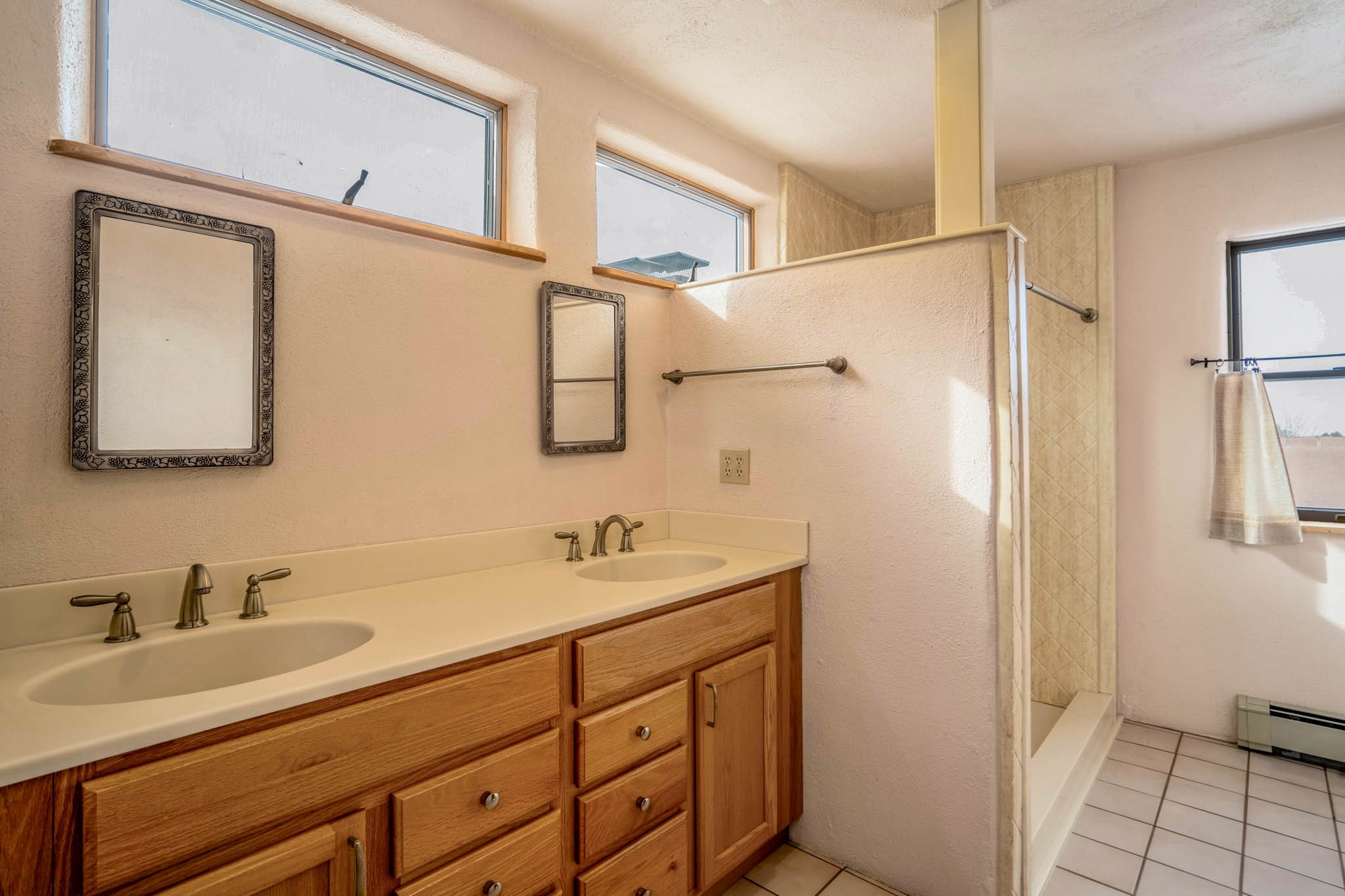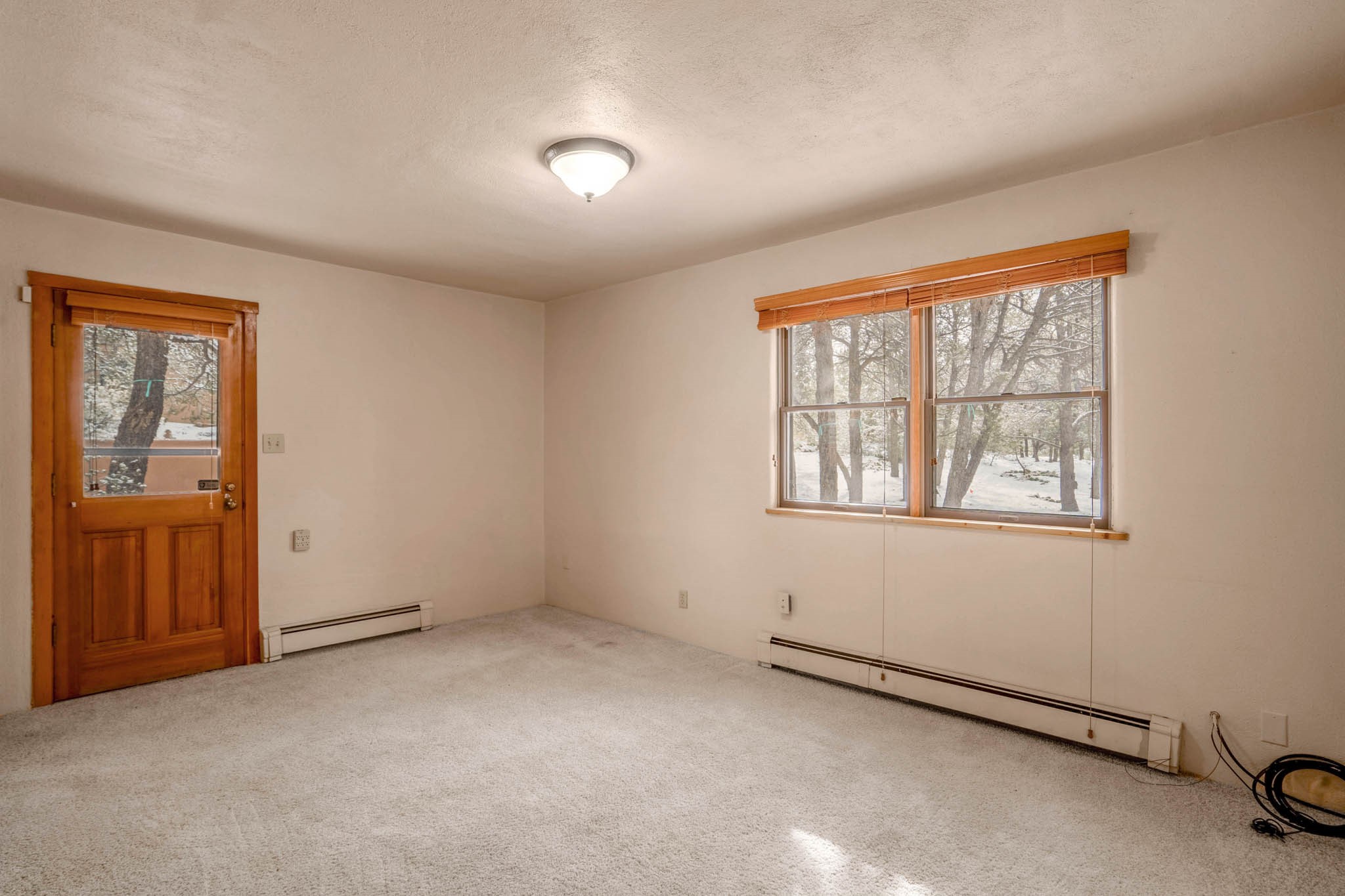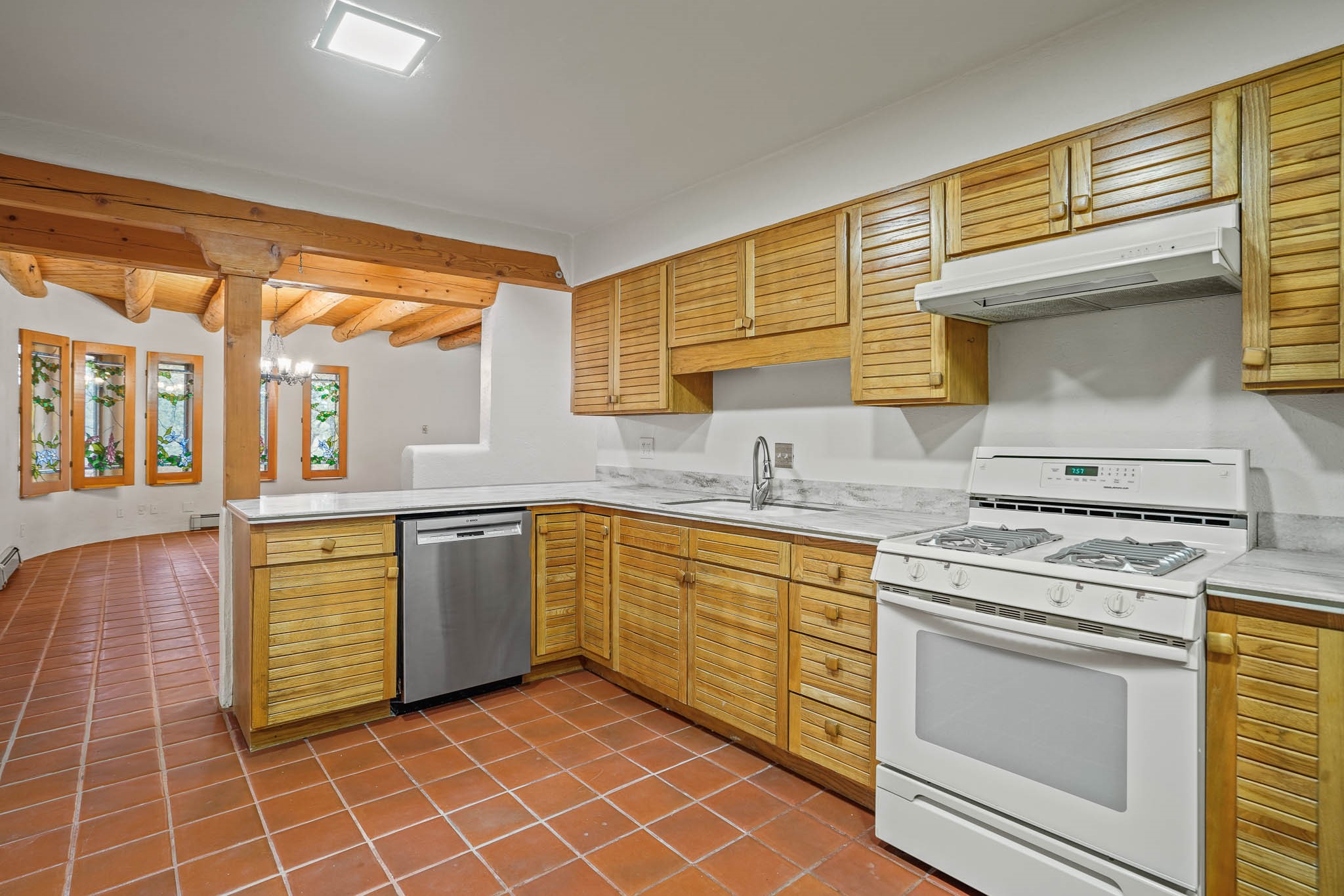 Nestled in a serene eastside neighborhood, this charming home sits on a generous 0.5-acre parcel, offering the perfect blend of tranquility and convenience. Ideally located just minutes from downtown Santa Fe and steps away from the Sun Mountain hiking trails, this property is a haven for nature enthusiasts and city dwellers alike. Situated within the highly sought-after Wood Gormley school district, this 2,094-square-foot home features 3 bedrooms and 3 full bathrooms. Inside, you'll find a beautifully open kitchen with Saltillo tile flooring and warmed by radiant baseboard heating. The living room steals the show with its elevated ceiling, striking vigas, and a fireplace creating an inviting ambiance. Adding a touch of elegance, the dining room features custom stained-glass window shades that enhance the home's unique charm. Upstairs, the spacious primary bedroom includes access to a private rooftop deck, where you can unwind and take in Santa Fe's iconic sunsets. Outside, the secluded backyard is ideal for entertaining or simply enjoying the peace and quiet. For those with creative passions or remote work needs, the property includes a two-car attached garage and two detached art studios/offices, providing ample space for hobbies or a home office. Additionally, the entire roof was replaced with TPO in March of 2022.Don't miss the opportunity to make this one-of-a-kind property your own. Schedule your showing today!