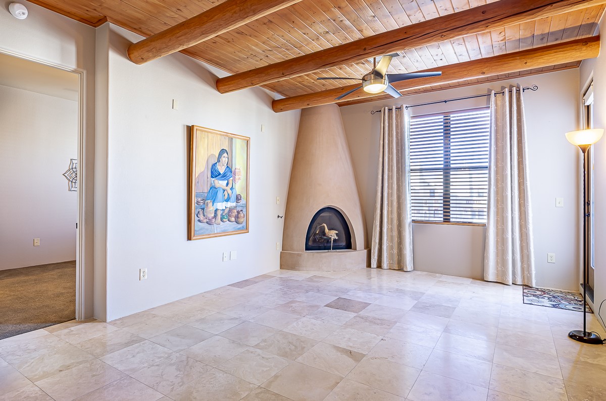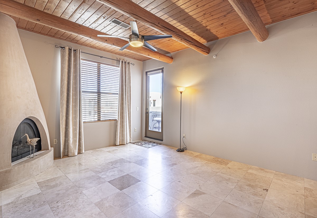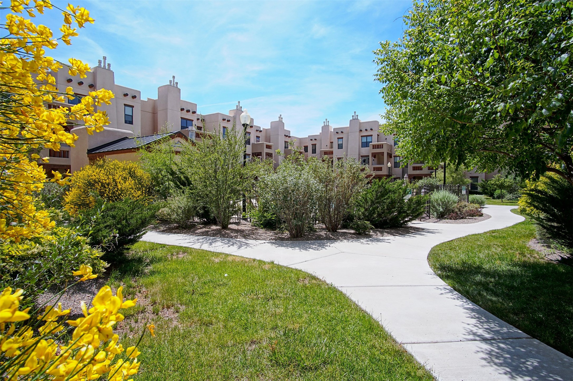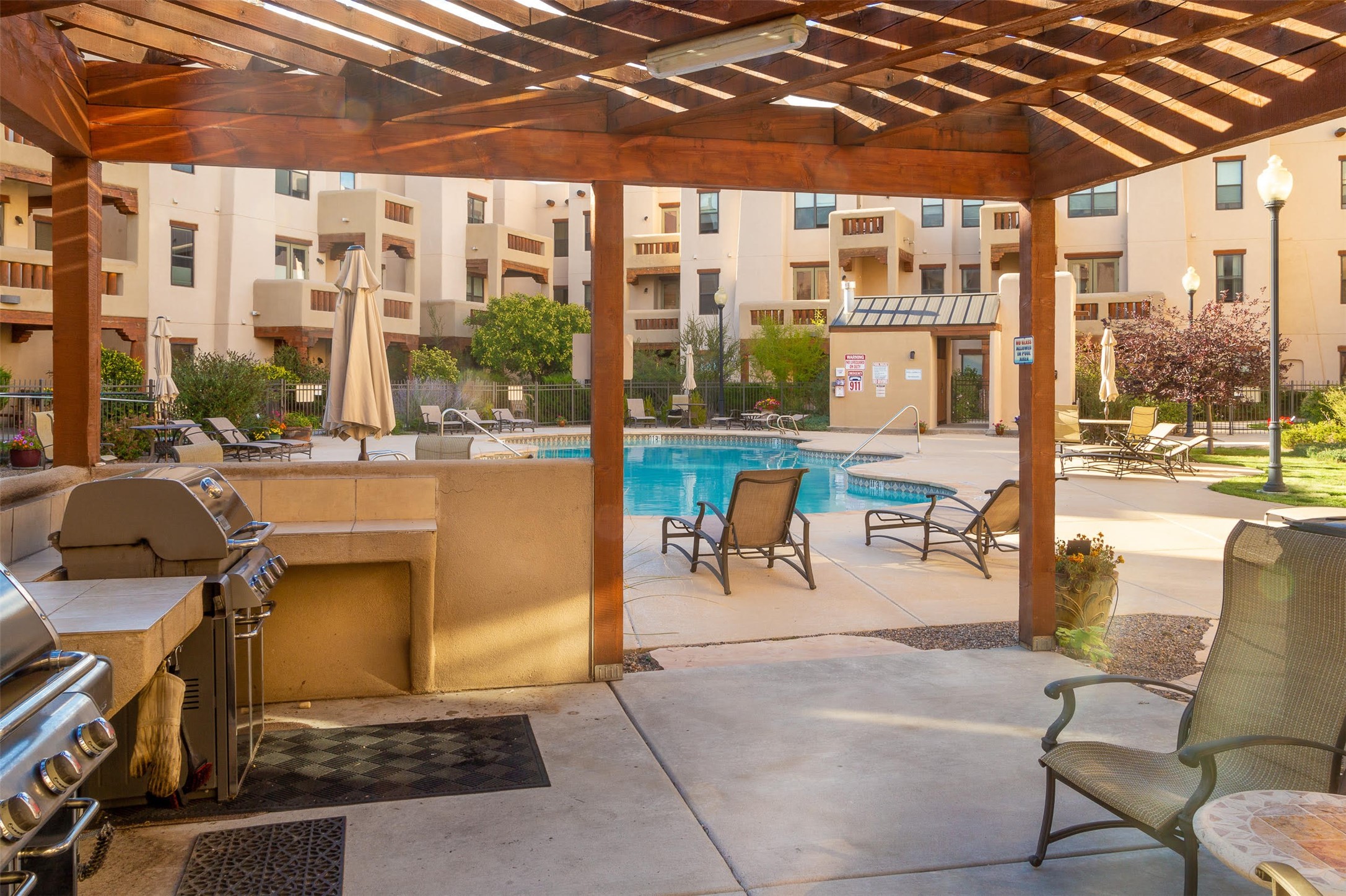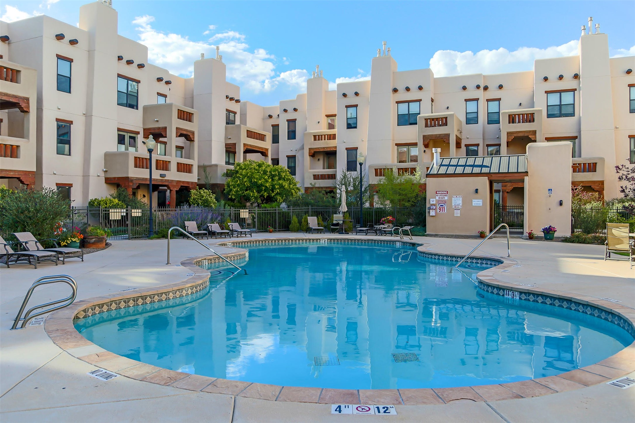 DRASTIC PRICE REDUCTION of 25K off original on this exceptional 2 BR/2 BA condo package with STORAGE UNIT and GARAGE. At 1275 sf, this is the LARGEST available, (the ONLY one currently on the market), and a RARE JEWEL, with a custom rehab by renowned designer-decorator Lisa Barker. Lisa's luxe finishes truly set this one apart: Luminous travertine baths and flooring, mosaic tile accents, and designer lighting all offer a beauy and refinement not found in other units. Other fabulous details: Coveted 3rd floor (with elevator) location, Patio with pool court view, 3 skylights, Granite countertops, Stainless steel appliances and W/D, 14K custom Murphy Bed, new bath faucets, paint, curtains and blinds, smoke/CO2 detectors and more. ***The package is complete with an adjacent STORAGE UNIT and an 1-car GARAGE (with storage loft)*** plus 2 additional parking spaces (non-reserved) in the gated lot. As for the Alameda, this landmark complex has set the standard for luxury condo living since 2008 with its Pueblo architecture, a magnificent pool court, fitness center, beautiful reception rooms, library, gated parking, elevators, full time onsite management, and 24 hr controlled access for your peace of mind. Located 12 mins from the plaza, and proximate to shopping, restaurants, culture, and major transportation, this location makes Santa Fe living a breeze. Don't wait, this is a CUT-ABOVE unit at a GIVEAWAY price!