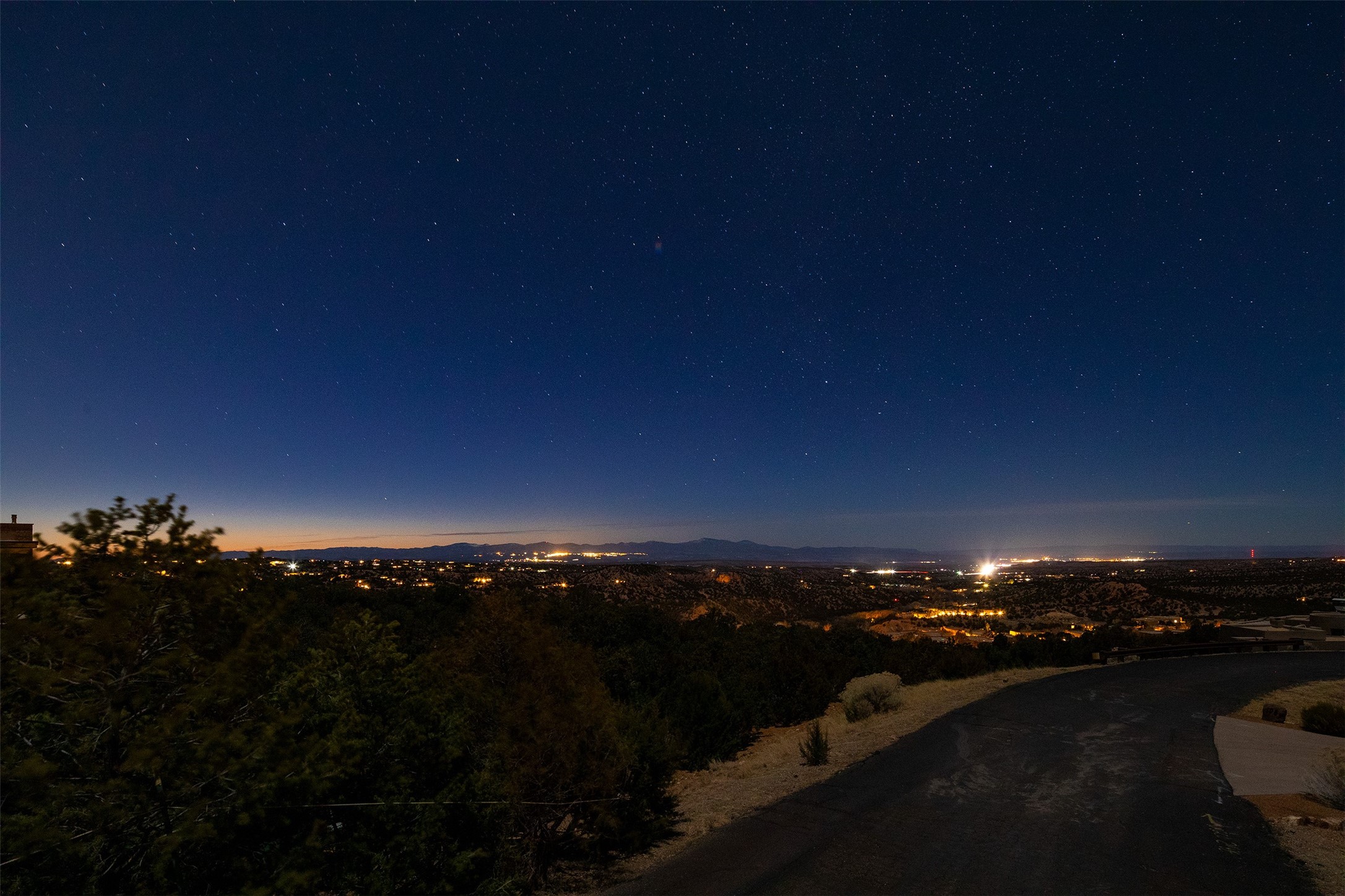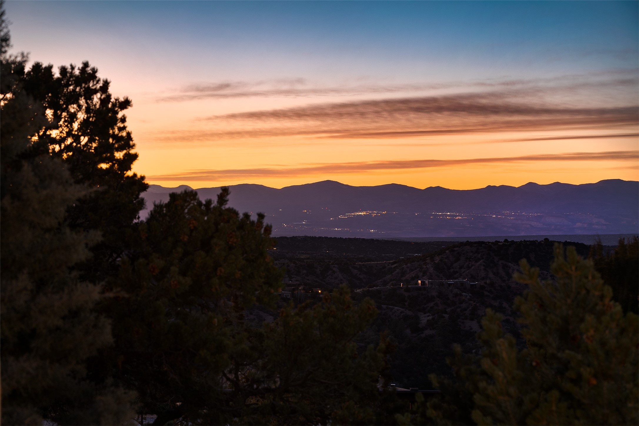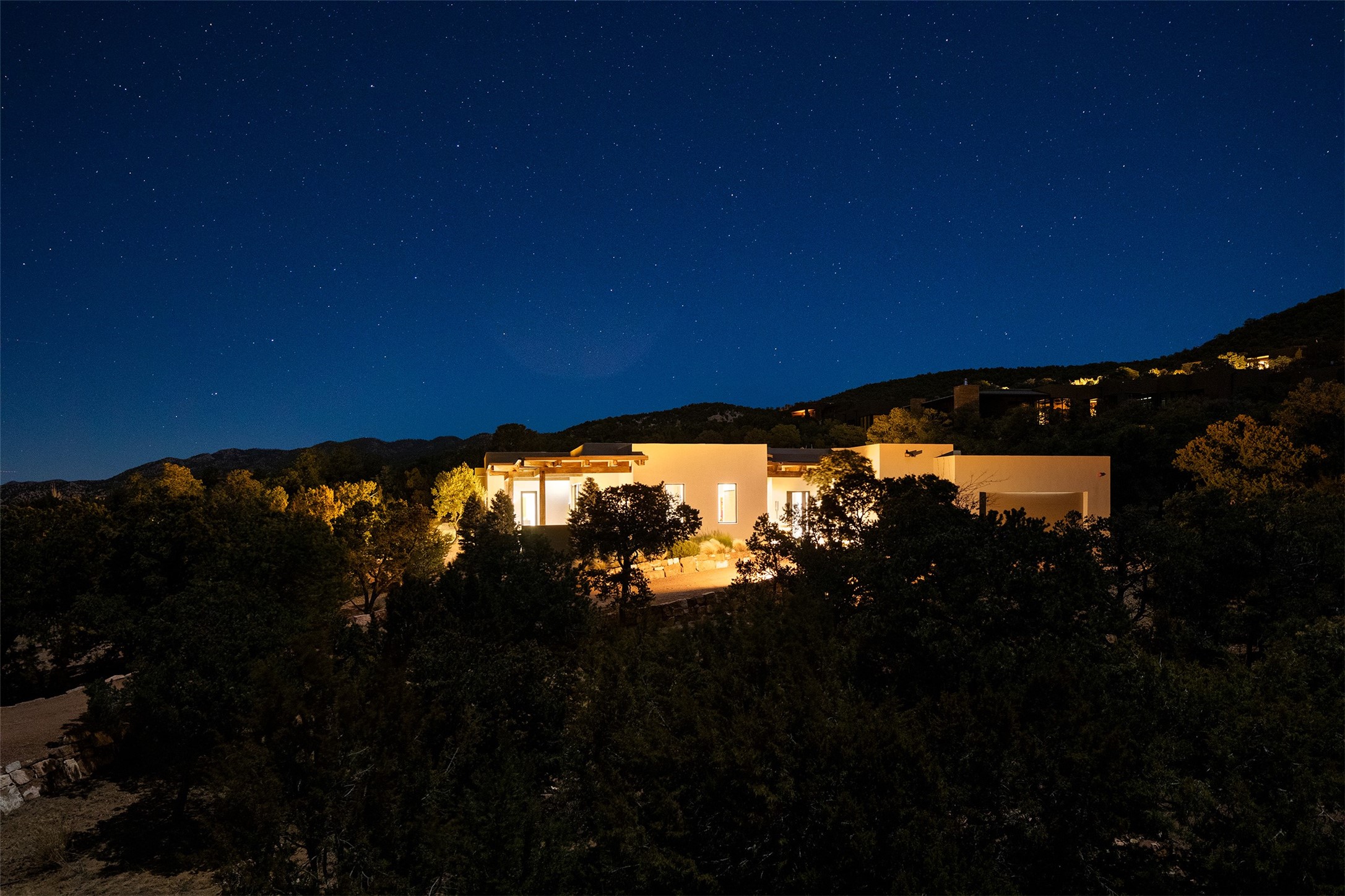 Newly completed and move-in ready! Sited high above it all, this stunning Bishops Lodge Hills residence by the awarding winning, Woods Design Builders excites and captivates with powerful architecture, luxury European finishes, and stunning, expansive mountain views. This exceptional 3 bedroom home with an office, exemplifies the unique blend of clean, modern design with a sense of tranquility. Thoughtfully designed with an open concept interior, this home offers the ultimate entertainment experience with a dramatic view portal located directly off the kitchen and main living area, in addition to an intimate interior courtyard. Design features include a light-filled living room with a spacious dining area, complete with surround view windows, portal access, and a modern fireplace, all of which opens directly into the well-appointed chef's island kitchen with luxury appliances and endless views. The private owner's suite delights with western views and luxurious spa-like bath with floating vanities, soaking tub and glassed in shower. A newly constructed office, located adjacent to the owner's suite, offers views and direct access from the main living areas. Separate from the primary suite is a spacious guest bedroom with an ensuite bath, and third guest bedroom ensuite which is newly expanded to include a bath, located off the living room, which can be enjoyed as an ideal media room or secondary living area. Luxury features include hardwood flooring, sleek custom cabinetry, soft white plaster walls, natural light, and designer finishes throughout. Bishops Lodge Hills is a luxury, gated community with a community pool and home of the Auberge Resort.