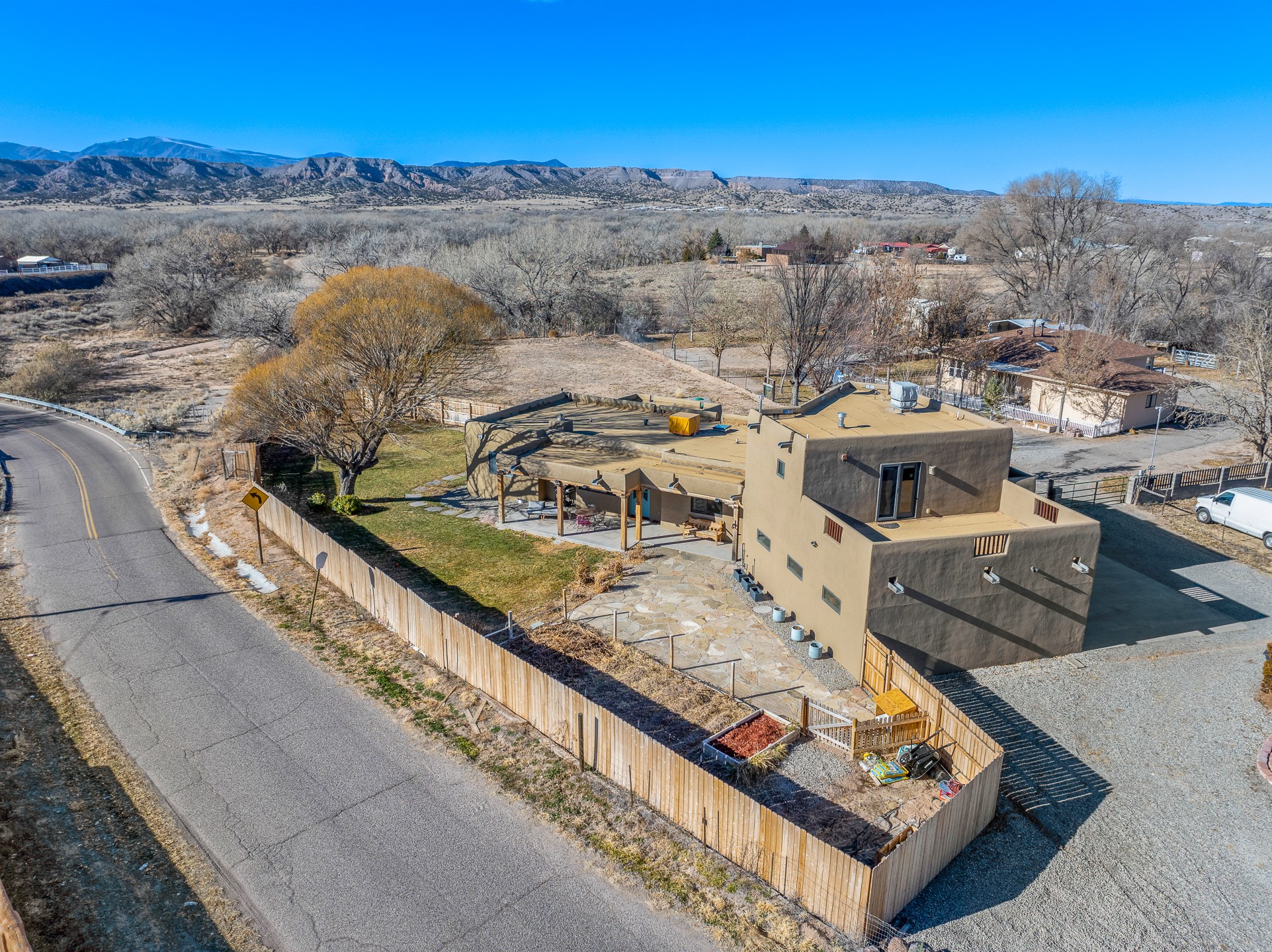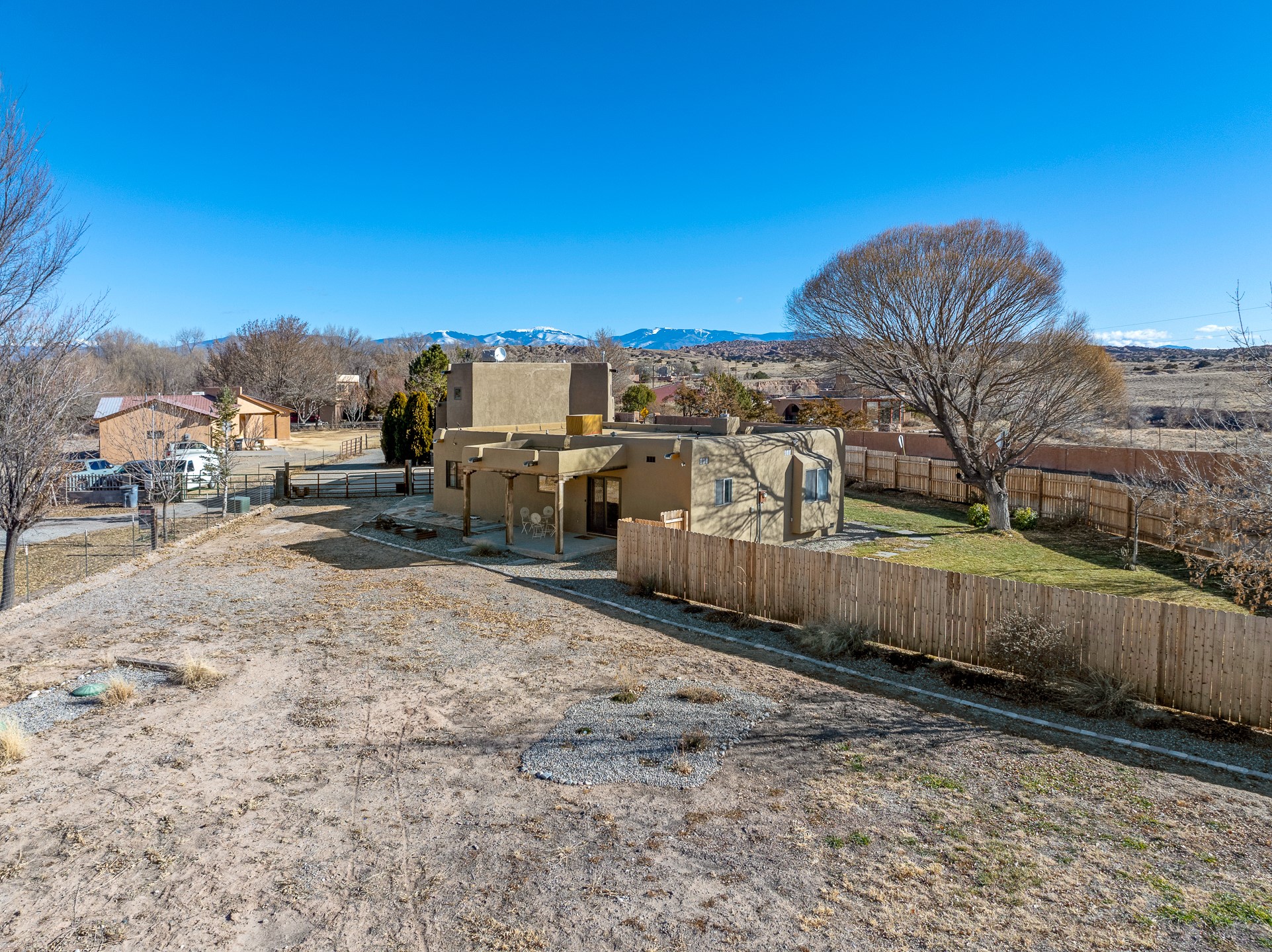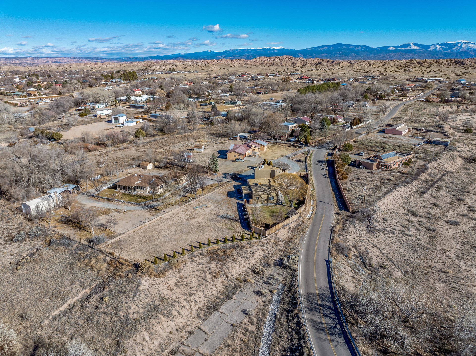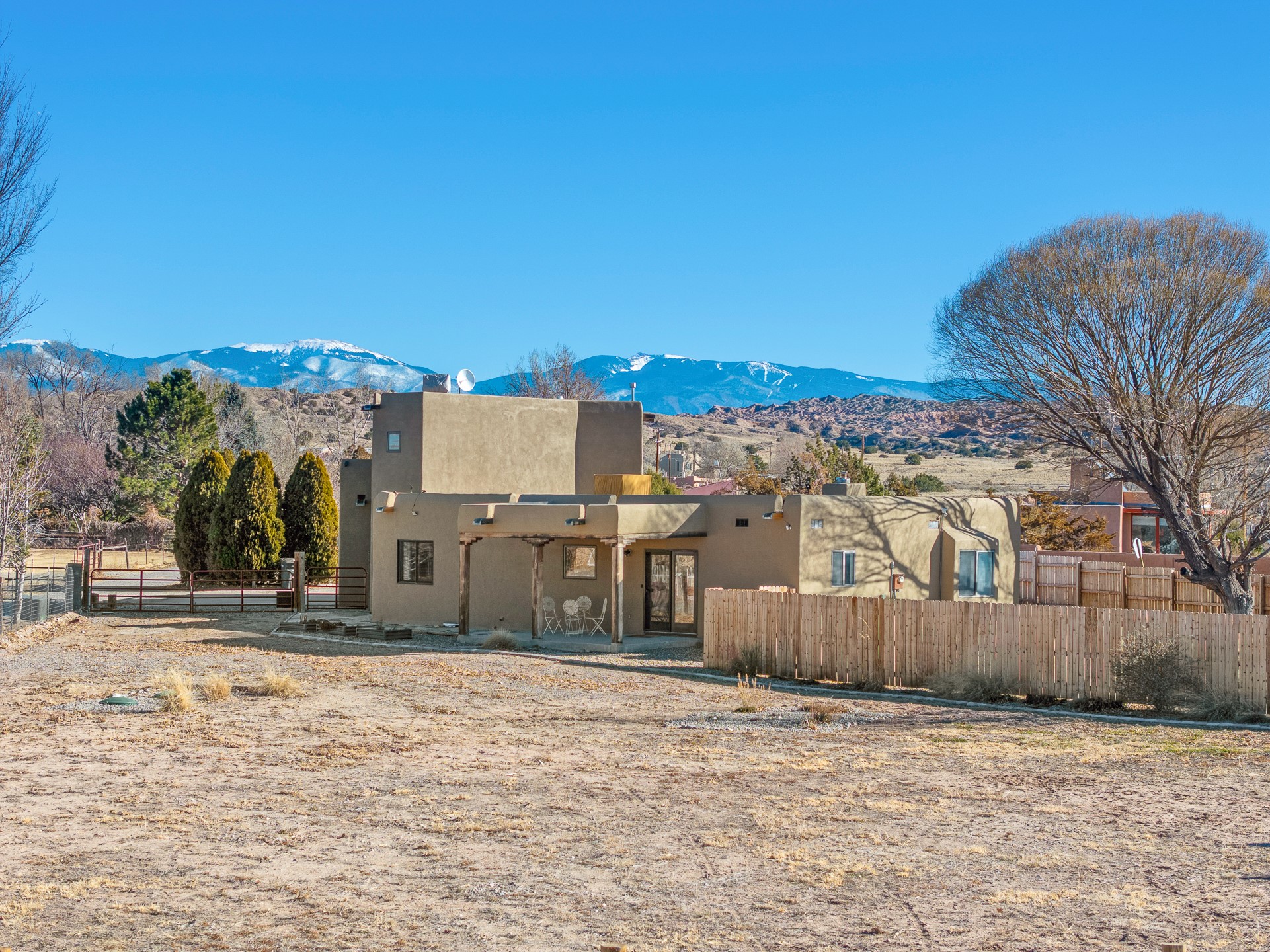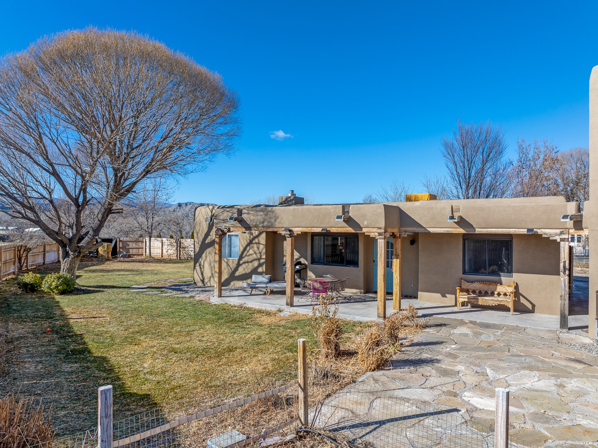 Views, Land, Single-Level Main House, Guest House, Large Garage and Shop, Fenced Yard, Water Rights, and more! This beautiful and well-maintained La Mesilla property sits near the base of Black Mesa and features great views of the Jemez Mountains and the Sangre de Cristos! Sited on 0.75 acres, the property includes a 3 bedroom / 2 bathroom single-level main house, and an attached guest house with a two-car garage and additional shop space. The gated yard greets you as you arrive at the property, and a short walk through the breezeway leads to the manicured back yard. The covered patio is a great spot for morning coffee or enjoying a stunning sunset over Black Mesa. Upon entering the main house, the living room will welcome you into the hub of the home. The kitchen is straight ahead, and it features beautiful wood cabinets, Saltillo tiles, and barstool seating on the peninsula leading into the dining room. A sliding glass door opens to the fenced yard on the north side of the property for easy outdoor access. The primary suite is located at the north side of the house and includes an updated, full bathroom. Two guest bedrooms and an additional updated, full bathroom are at the south end of the house. On the other side of the breezeway, you'll find the guest house, with a two-bay garage and additional shop space on the first level. Upstairs, you'll find a studio suite with a kitchen, fireplace, and full bathroom. Enjoy sunrises and sunsets from the roof deck! In addition to the domestic water well (1.0 acre-feet per annum), the property includes additional irrigation water rights (1.05 acre-feet per annum). This property is a must-see, so schedule your showing today before this one is gone!