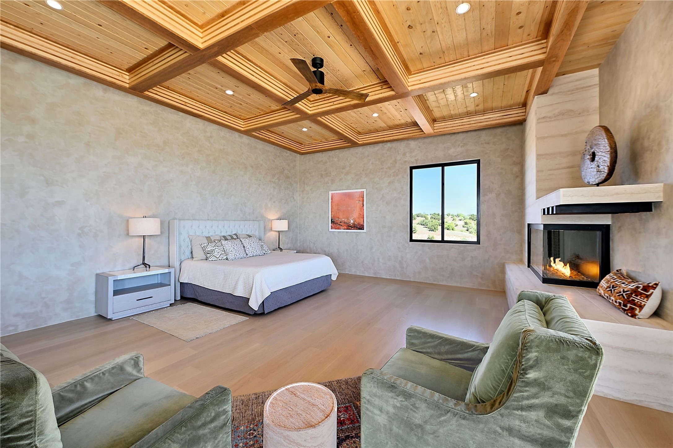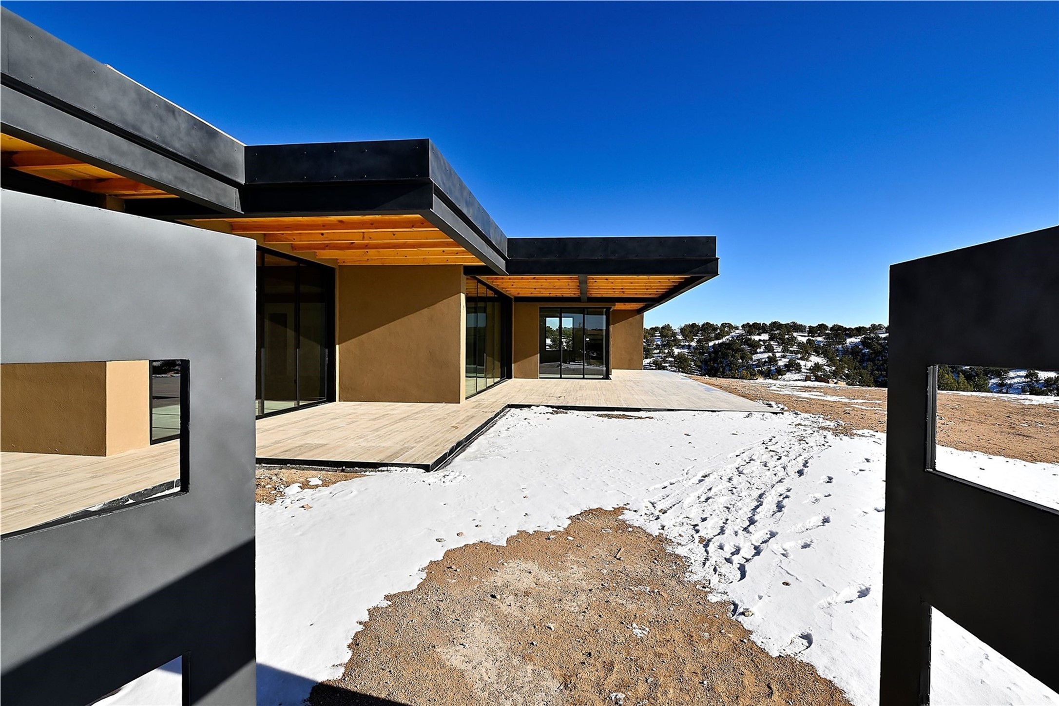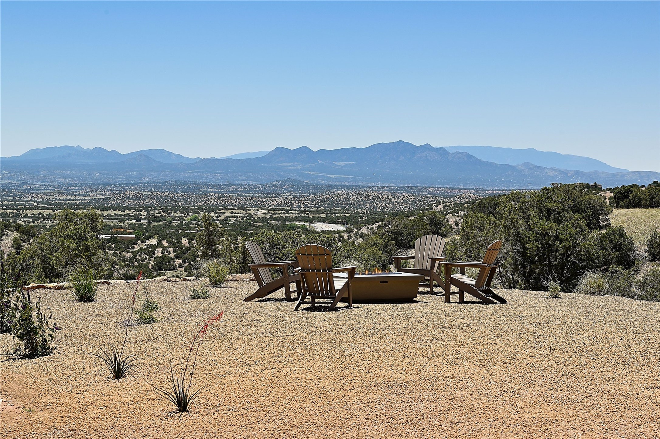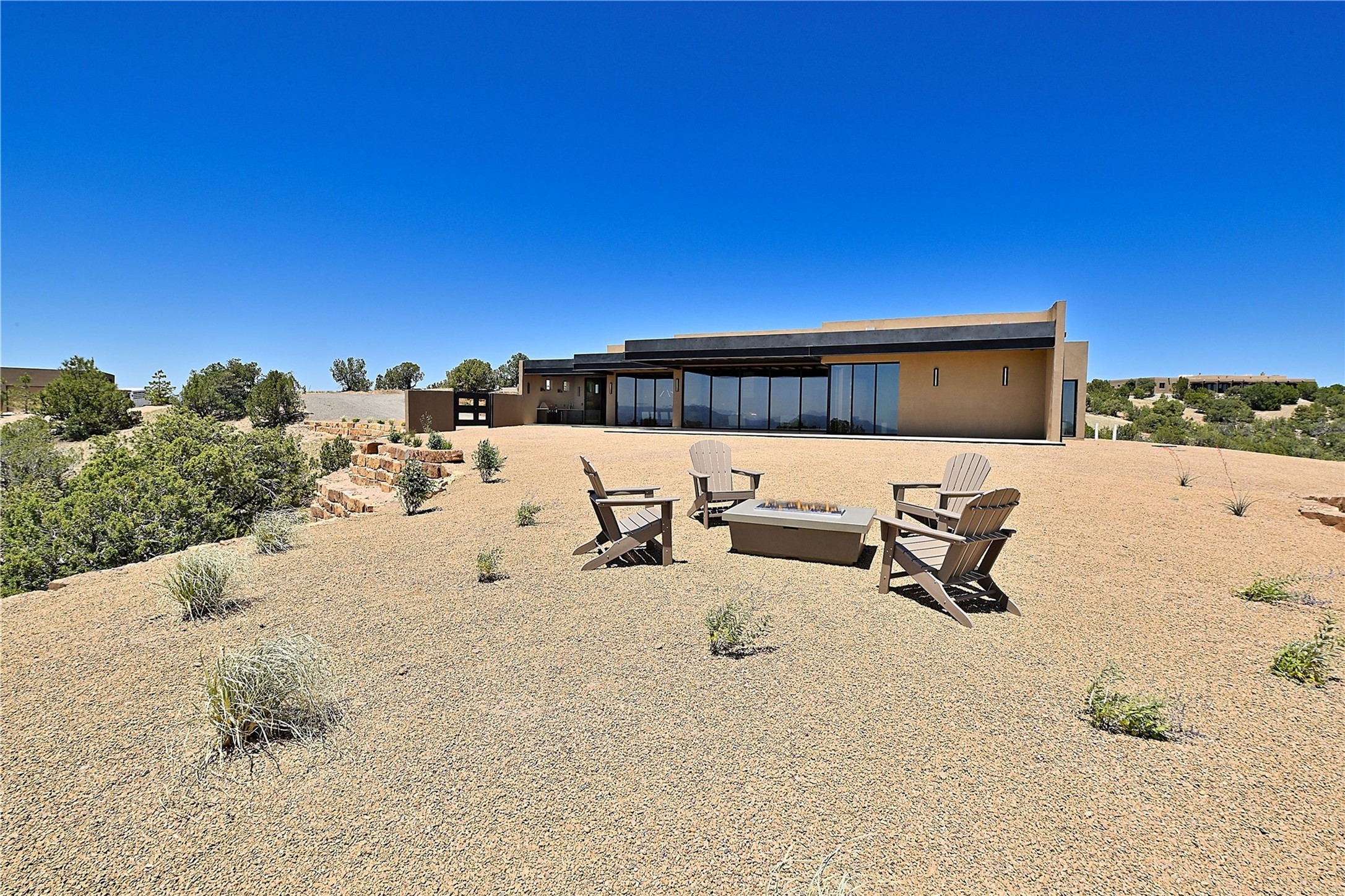 ** 2025 Grand Hacienda Winner!17 Vista Bella will be the #1 Property on the Haciendas 2025 Parade of Homes Tour 8/8-8/10 and 8/15-8/17. Breathtaking views and stellar night skies- this new build is move in ready! Boasting (approx.) 4,400 sq. ft. & nestled on 12.68 acres, this home offers unparalleled views of the Galisteo Basin and mountains. Designed by Mark Schwebel of Big Art Builders, 2024 Parade of Homes for Natural Materials winner, this masterpiece blends cantilevered steel beams, glass, natural wood, and stone to harmonize with its high-desert surroundings. A contemporary design brings the outdoors in, with expansive windows, a stunning outdoor kitchen, and spaces perfect for entertaining. Each element has been meticulously crafted to highlight the surrounding beauty while creating a warm, luxurious environment. The kitchen's stunning centerpiece is crafted from white oak slabs, complemented by Italian stone floors and walls. Counters are custom-milled Brazilian stone, with BlueStar appliances and True refrigeration. Each bathroom is a work of art, clad in exotic stones sourced from Mexico, Turkey, and Italy. Vanities are crafted from exotic hardwoods like West African Padauk and Black Limba, paired with countertops of Persian travertine, Brazilian Taj Mahal, and Namibian granite. The powder room features Italian stone and a unique concrete sink. Refined details include: 7" French white oak floors, Lake Tahoe white fir ceilings, and two showpiece gas fireplaces: a modern shepherd's design in the primary suite and a black granite-clad peninsula in the living room. Take advantage of the unrivaled comfort this home offers with High-efficiency Carrier forced air heating and cooling, radiant heating throughout, and superior insulation with closed-cell spray foam (R60 ceilings, R30 walls). This home is a celebration of luxury, nature, and artistry, a truly one-of-a-kind property that must be experienced.