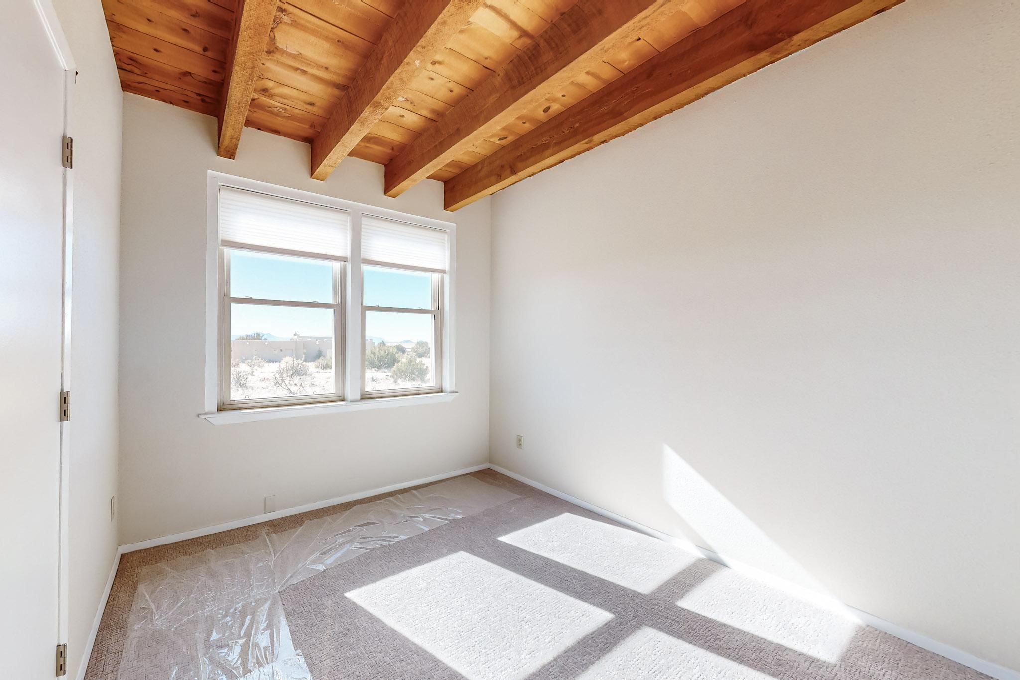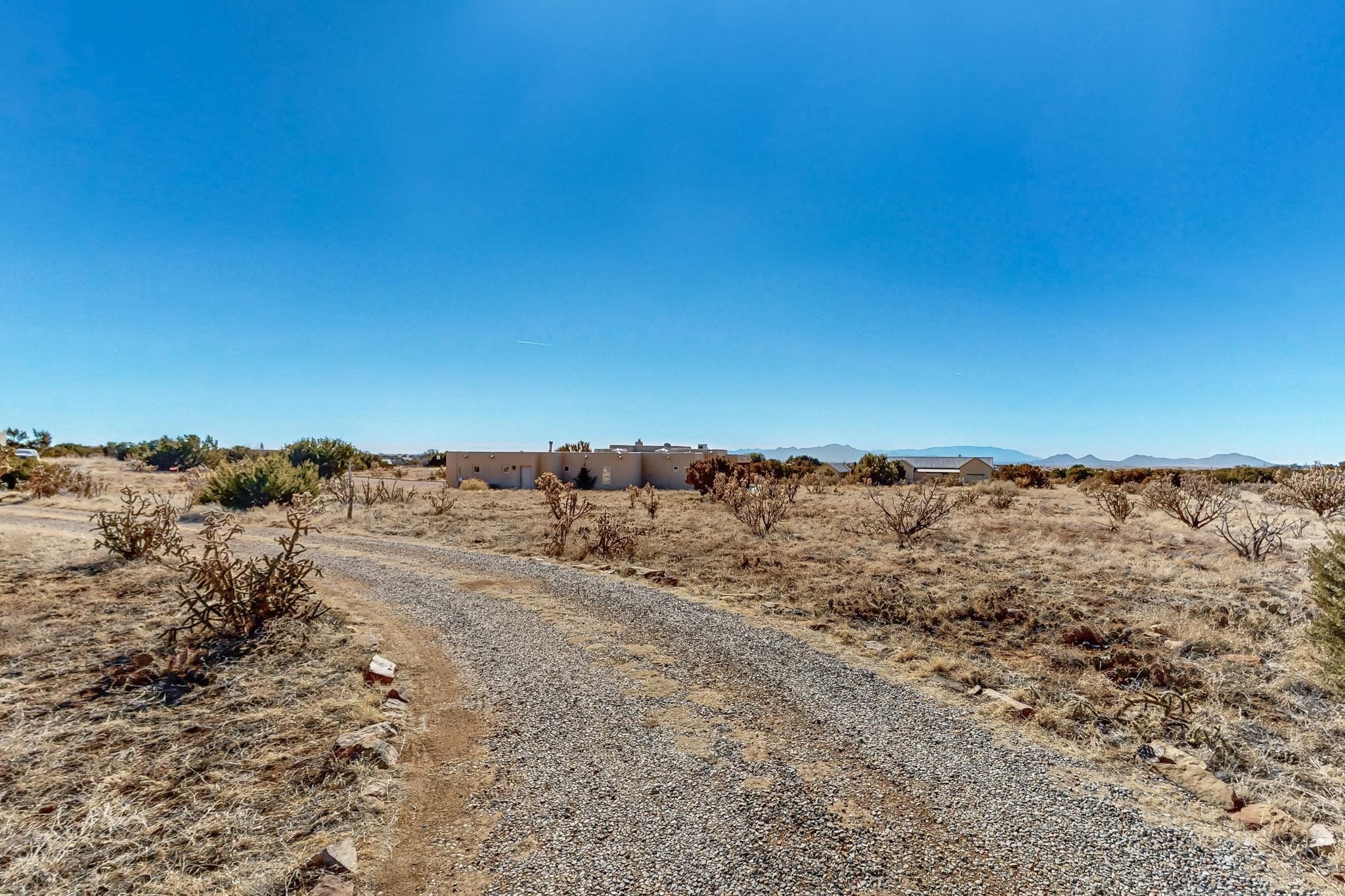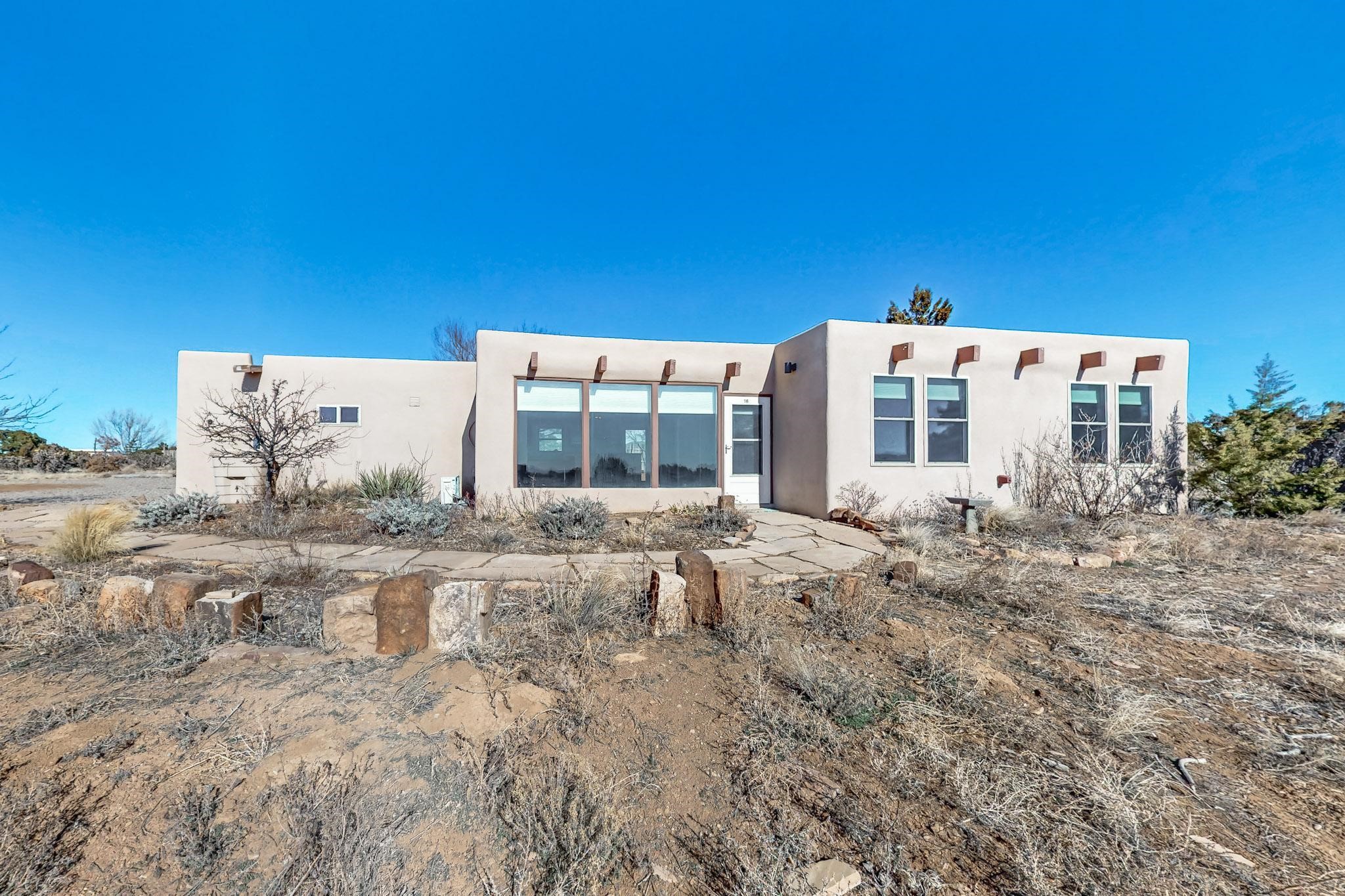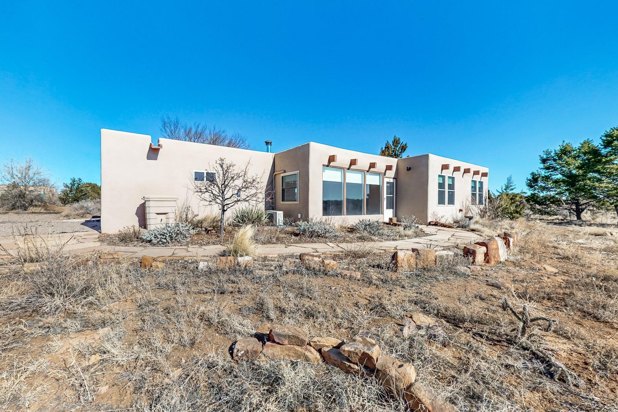 Priced to Sell! Lovely popular passive solar open plan design, move in ready. Totally refreshed sparkling interior including new carpets and paint.The main and guest baths were both remodeled in 2023, the kitchen updated with maple cabinetry, quartz and butcher block countertops, new appliances including natural gas cooktop with electric oven, and under cabinet lighting. Besides the wood stove, a minisplit was added about 5 years ago, and gas wall heaters in each bedroom. All windows except the living room were replaced in 2021. The home was restuccoed in 2021 and the garage door replaced the year before. A polyurethane membrane roof covering and insulation was installed approximately 10 years ago. There is a 3 share well and a well share agreement approximately $80.00 per year. Fruit trees including a productive apricot and apple in lovely fully fenced private backyard. Sunset views and a quiet 1.3 acre surround yet quick paved access to Eldorado amenities, local shopping and services plus only minutes into Santa Fe.