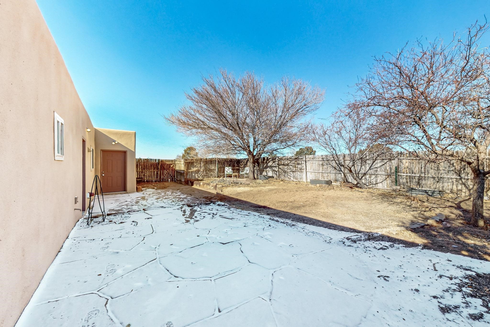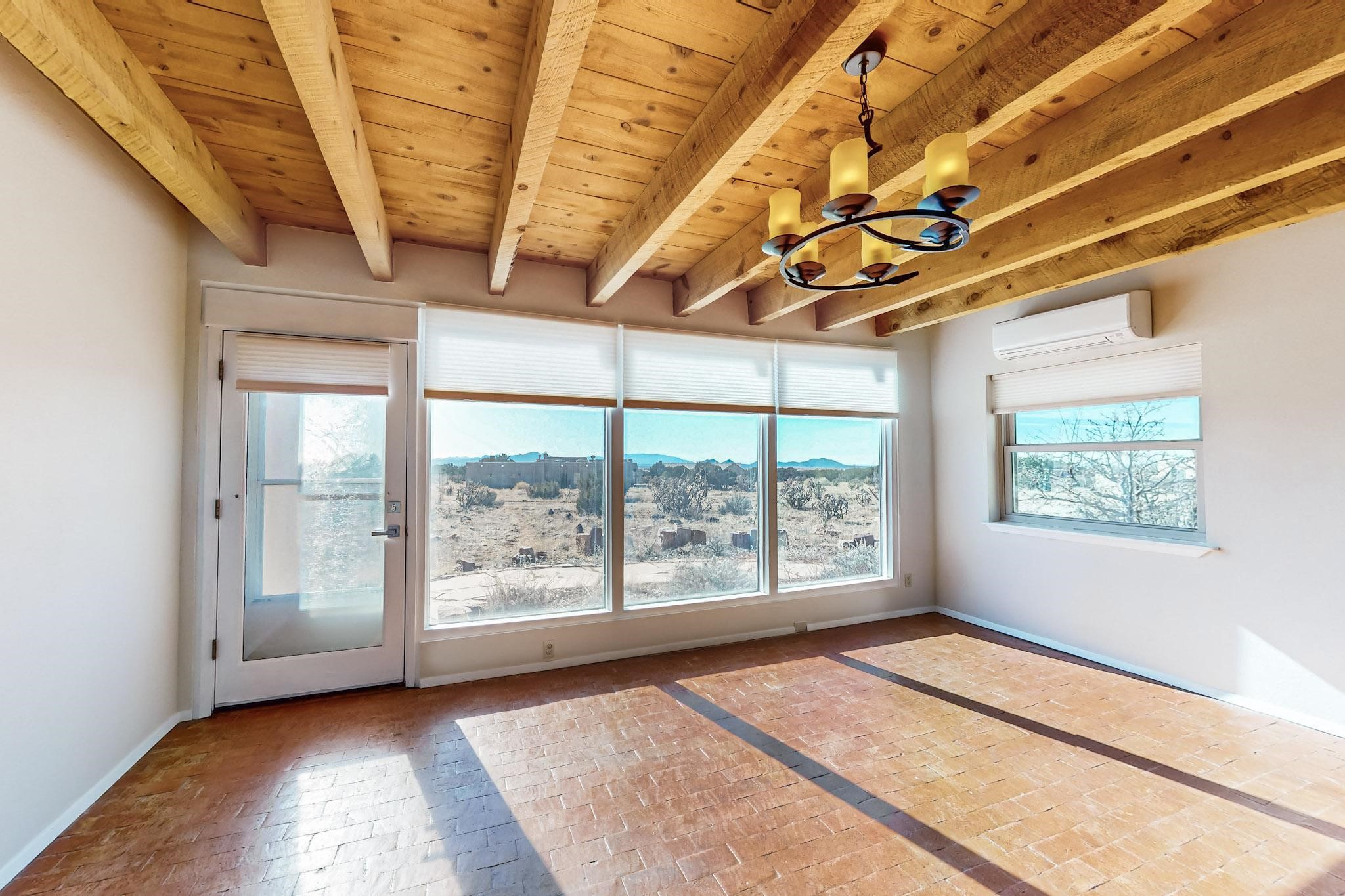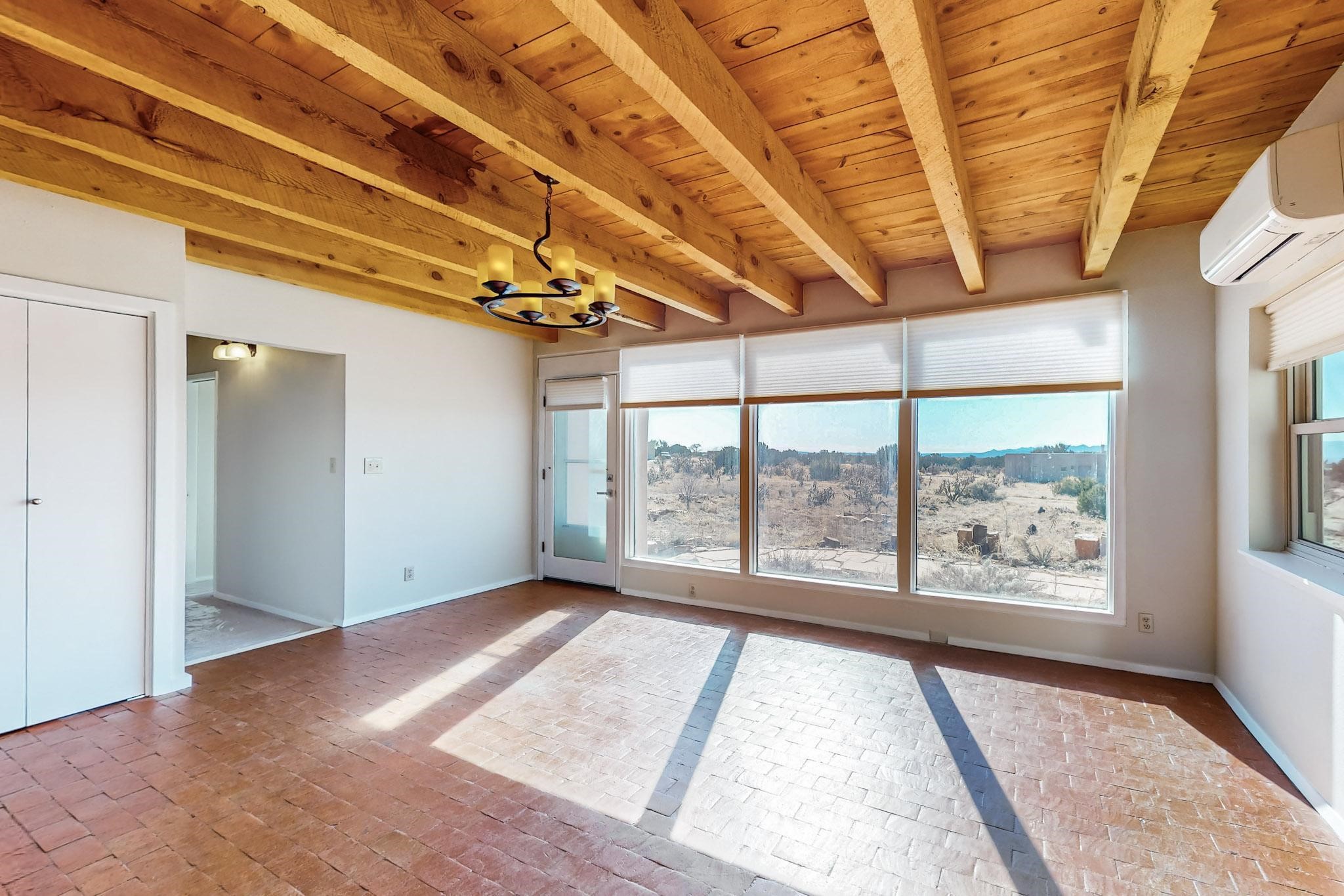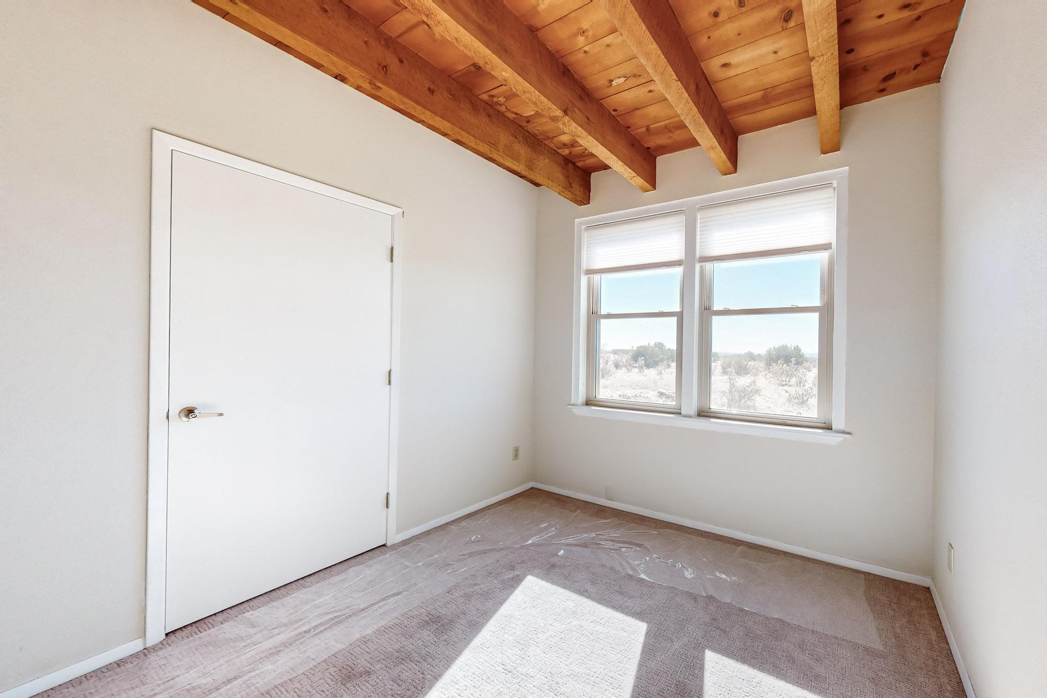 Priced to Sell! Lovely popular passive solar open plan design, move in ready. Totally refreshed sparkling interior including new carpets and paint.The main and guest baths were both remodeled in 2023, the kitchen updated with maple cabinetry, quartz and butcher block countertops, new appliances including natural gas cooktop with electric oven, and under cabinet lighting. Besides the wood stove, a minisplit was added about 5 years ago, and gas wall heaters in each bedroom. All windows except the living room were replaced in 2021. The home was restuccoed in 2021 and the garage door replaced the year before. A polyurethane membrane roof covering and insulation was installed approximately 10 years ago. There is a 3 share well and a well share agreement approximately $80.00 per year. Fruit trees including a productive apricot and apple in lovely fully fenced private backyard. Sunset views and a quiet 1.3 acre surround yet quick paved access to Eldorado amenities, local shopping and services plus only minutes into Santa Fe.