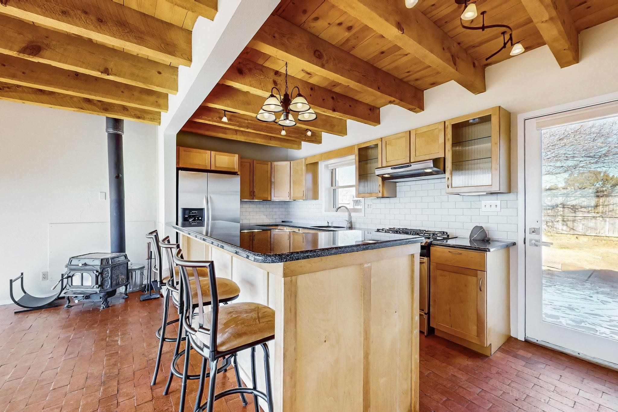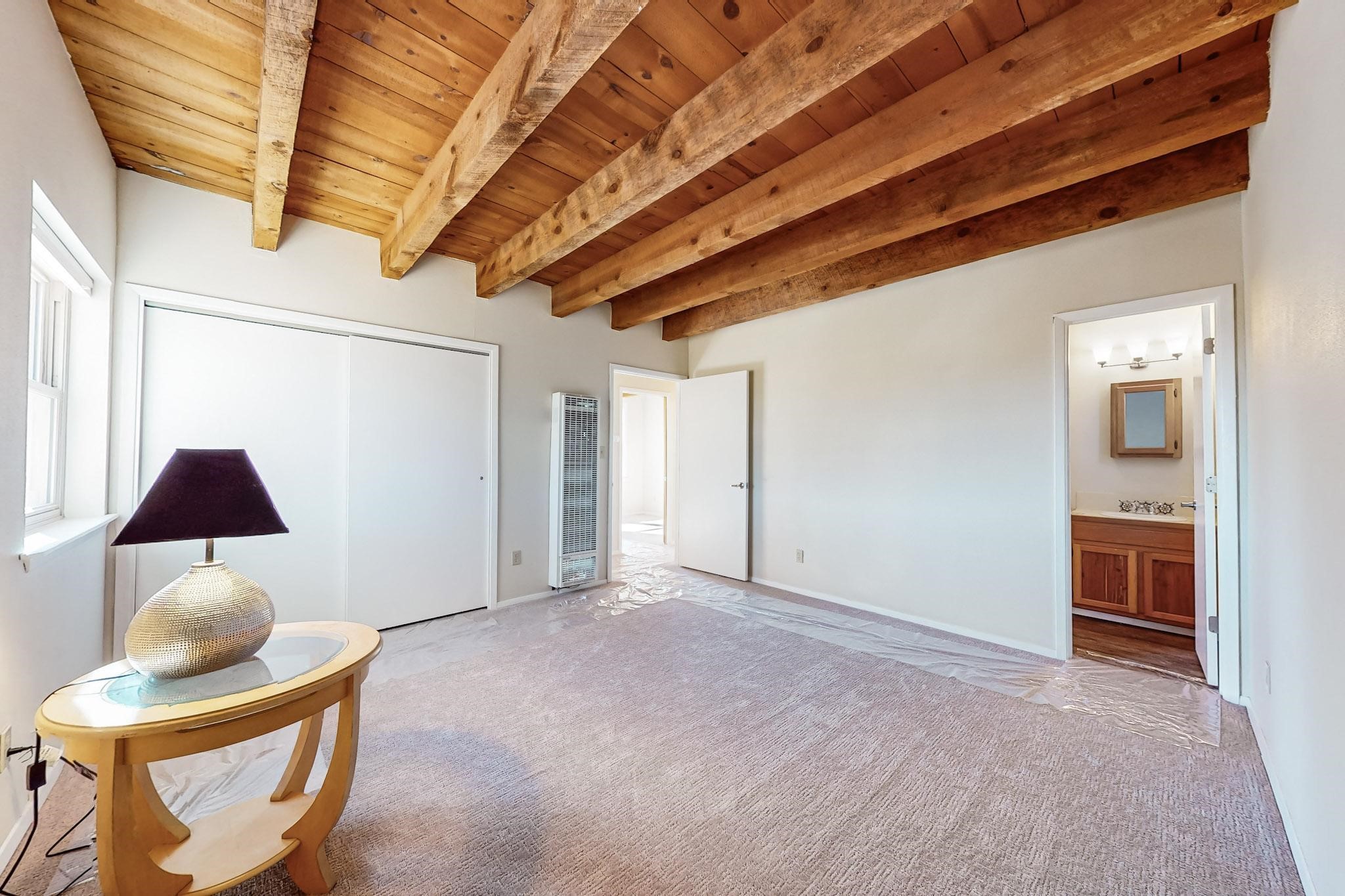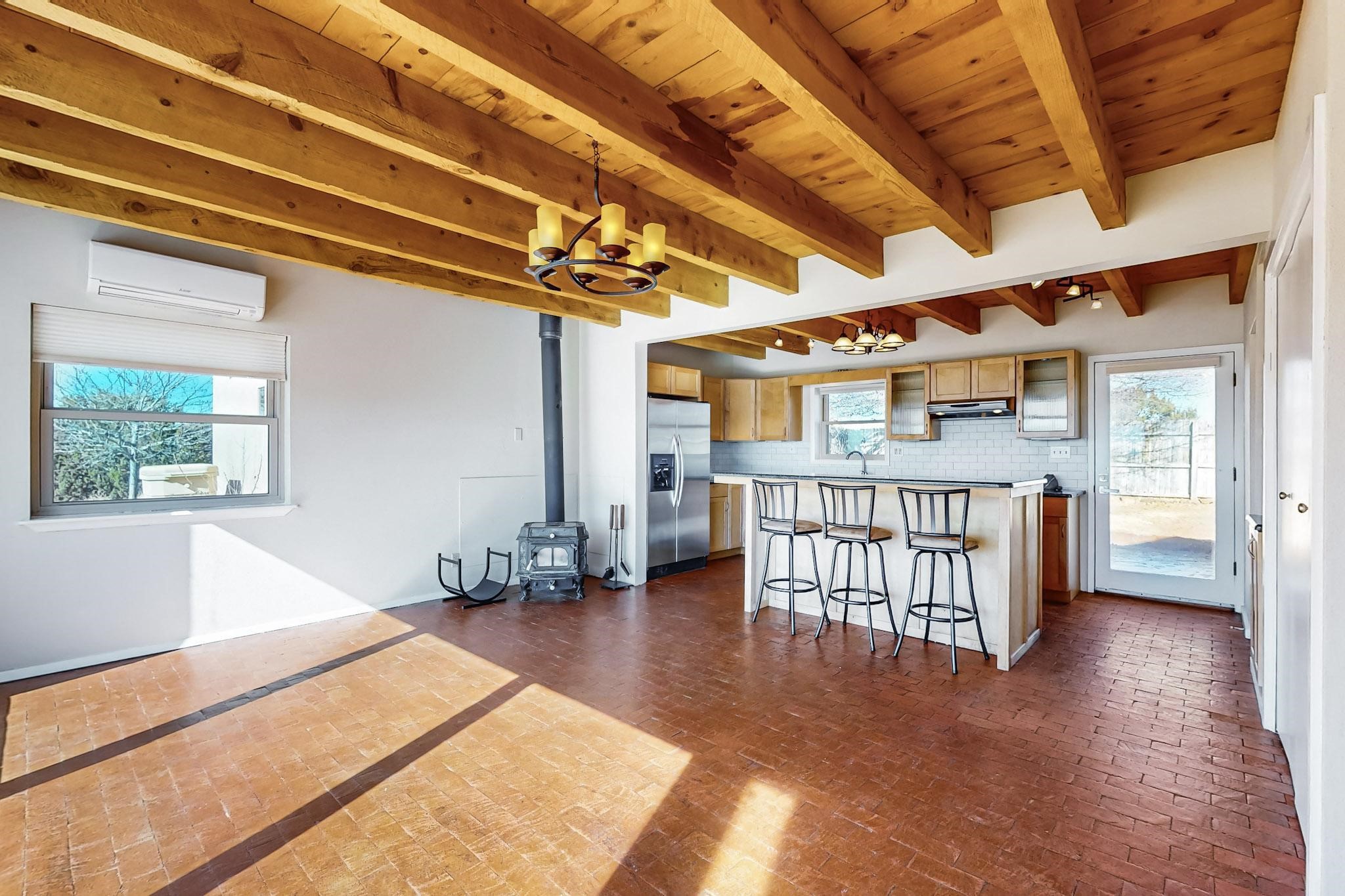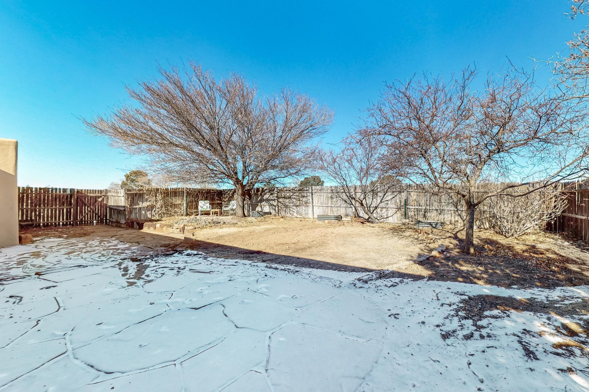 Priced to Sell! Lovely popular passive solar open plan design, move in ready. Totally refreshed sparkling interior including new carpets and paint.The main and guest baths were both remodeled in 2023, the kitchen updated with maple cabinetry, quartz and butcher block countertops, new appliances including natural gas cooktop with electric oven, and under cabinet lighting. Besides the wood stove, a minisplit was added about 5 years ago, and gas wall heaters in each bedroom. All windows except the living room were replaced in 2021. The home was restuccoed in 2021 and the garage door replaced the year before. A polyurethane membrane roof covering and insulation was installed approximately 10 years ago. There is a 3 share well and a well share agreement approximately $80.00 per year. Fruit trees including a productive apricot and apple in lovely fully fenced private backyard. Sunset views and a quiet 1.3 acre surround yet quick paved access to Eldorado amenities, local shopping and services plus only minutes into Santa Fe.