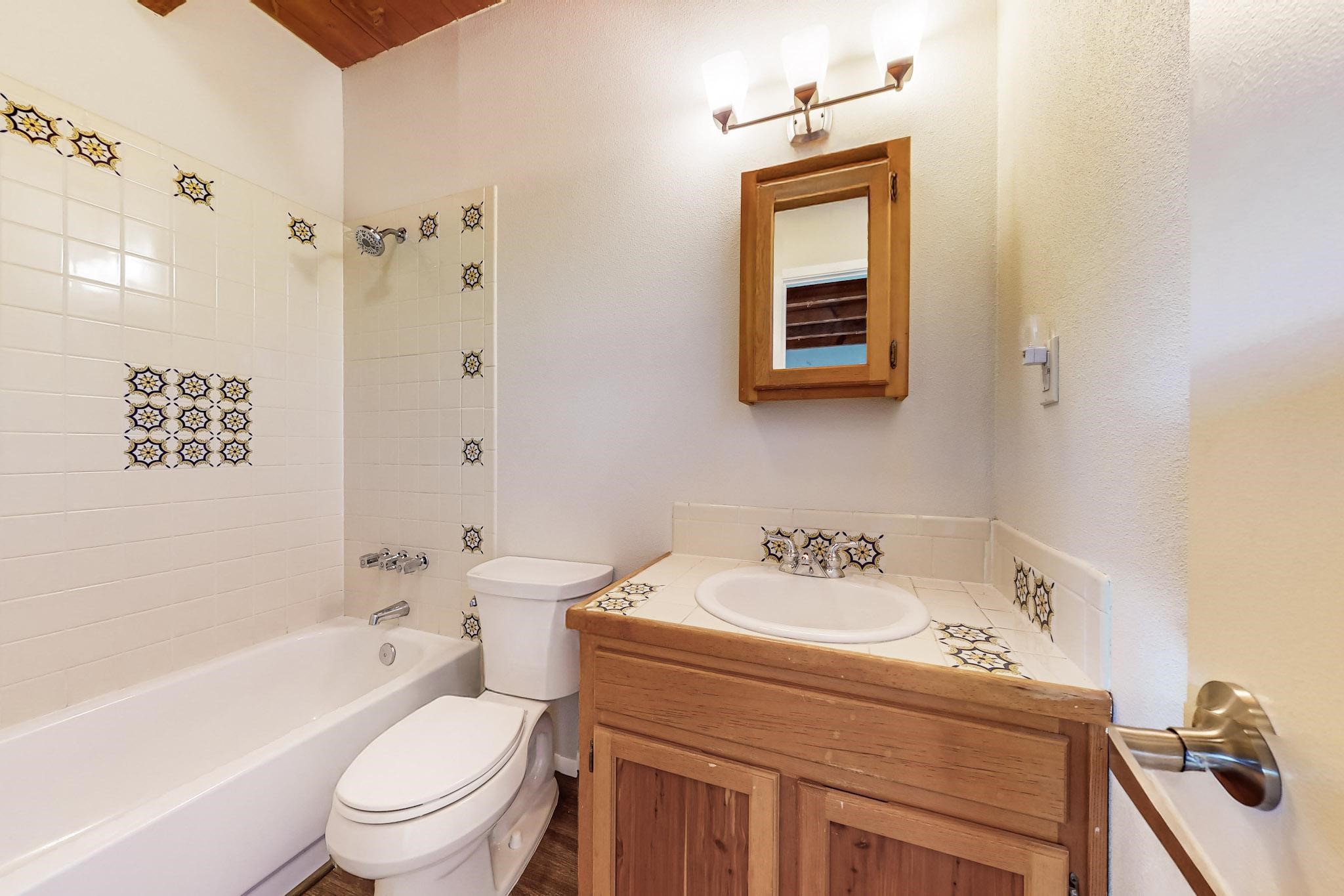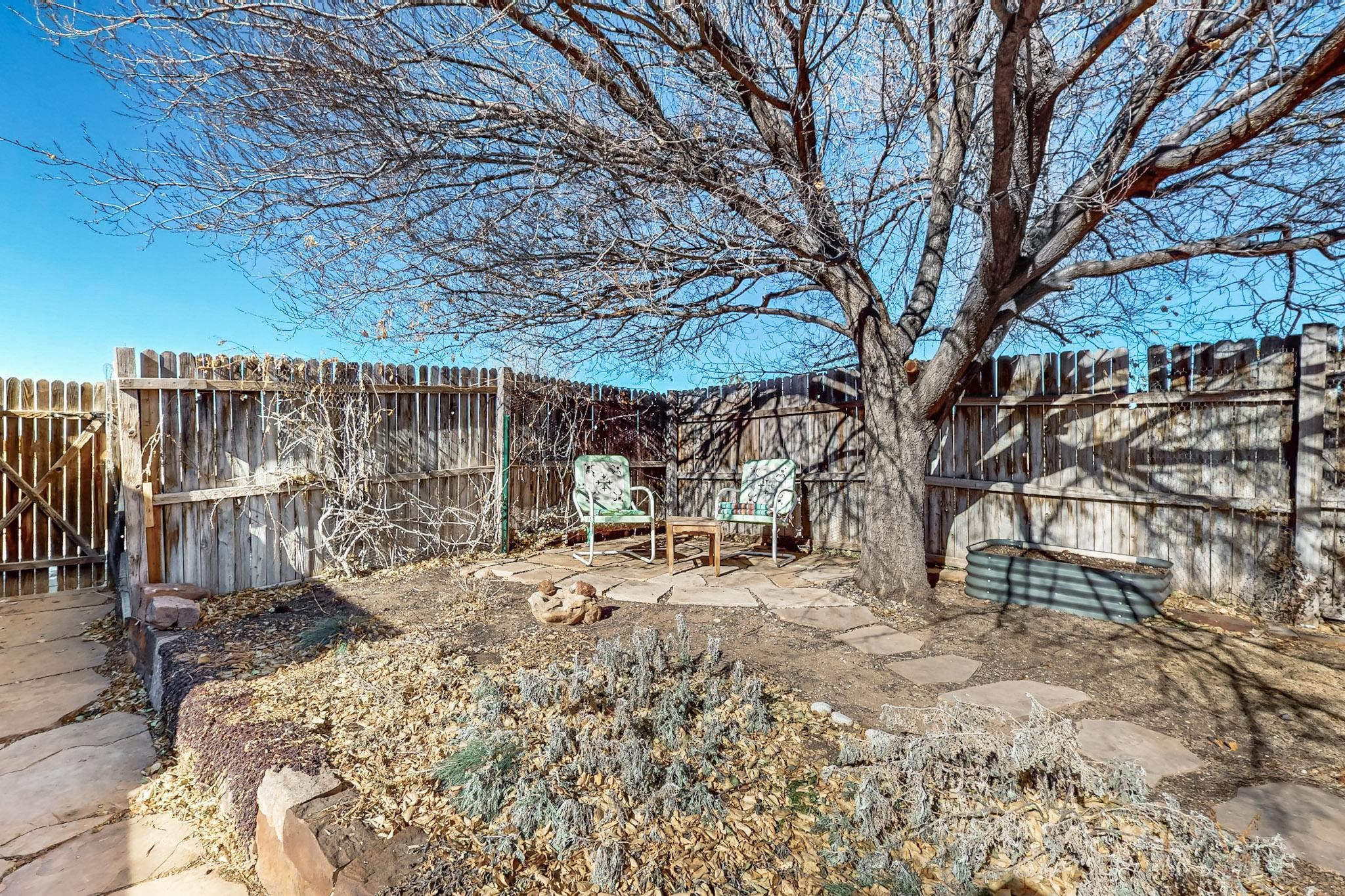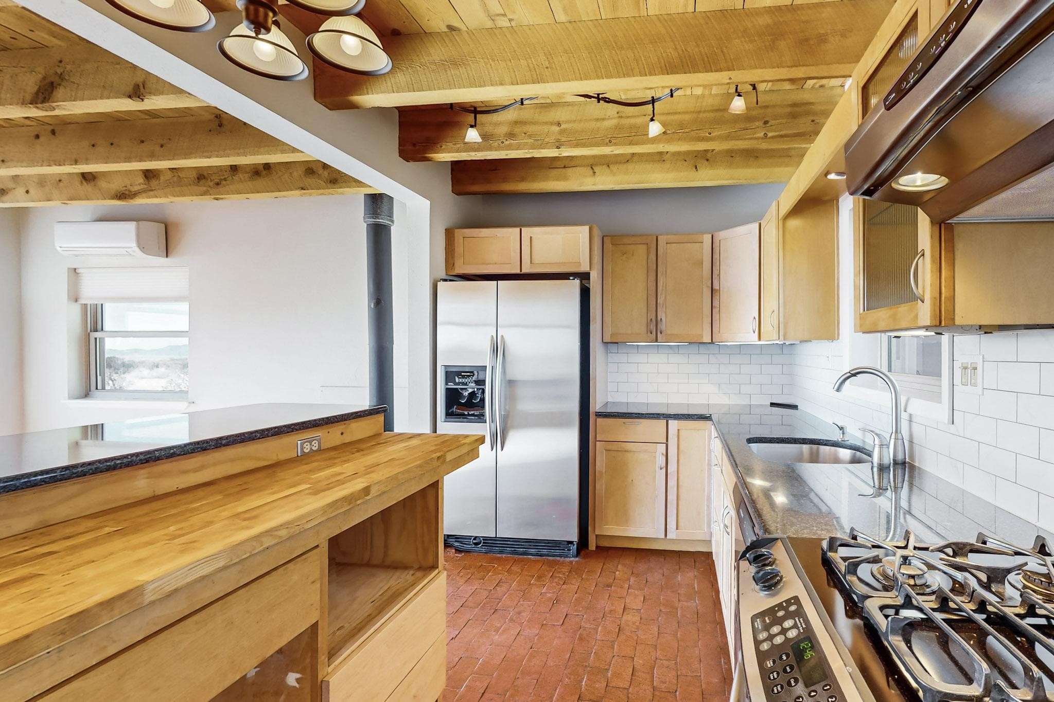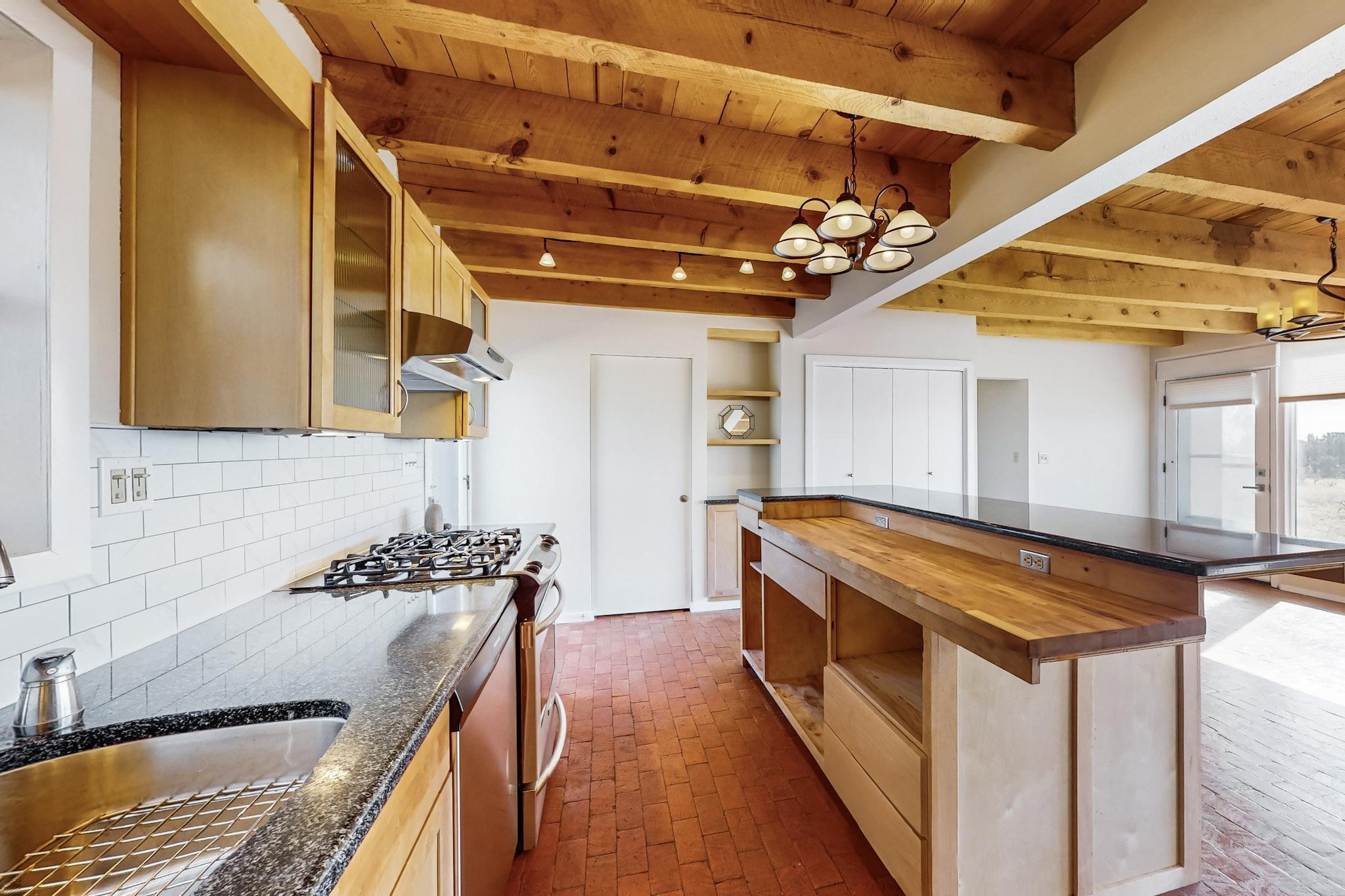 Priced to Sell! Lovely popular passive solar open plan design, move in ready. Totally refreshed sparkling interior including new carpets and paint.The main and guest baths were both remodeled in 2023, the kitchen updated with maple cabinetry, quartz and butcher block countertops, new appliances including natural gas cooktop with electric oven, and under cabinet lighting. Besides the wood stove, a minisplit was added about 5 years ago, and gas wall heaters in each bedroom. All windows except the living room were replaced in 2021. The home was restuccoed in 2021 and the garage door replaced the year before. A polyurethane membrane roof covering and insulation was installed approximately 10 years ago. There is a 3 share well and a well share agreement approximately $80.00 per year. Fruit trees including a productive apricot and apple in lovely fully fenced private backyard. Sunset views and a quiet 1.3 acre surround yet quick paved access to Eldorado amenities, local shopping and services plus only minutes into Santa Fe.