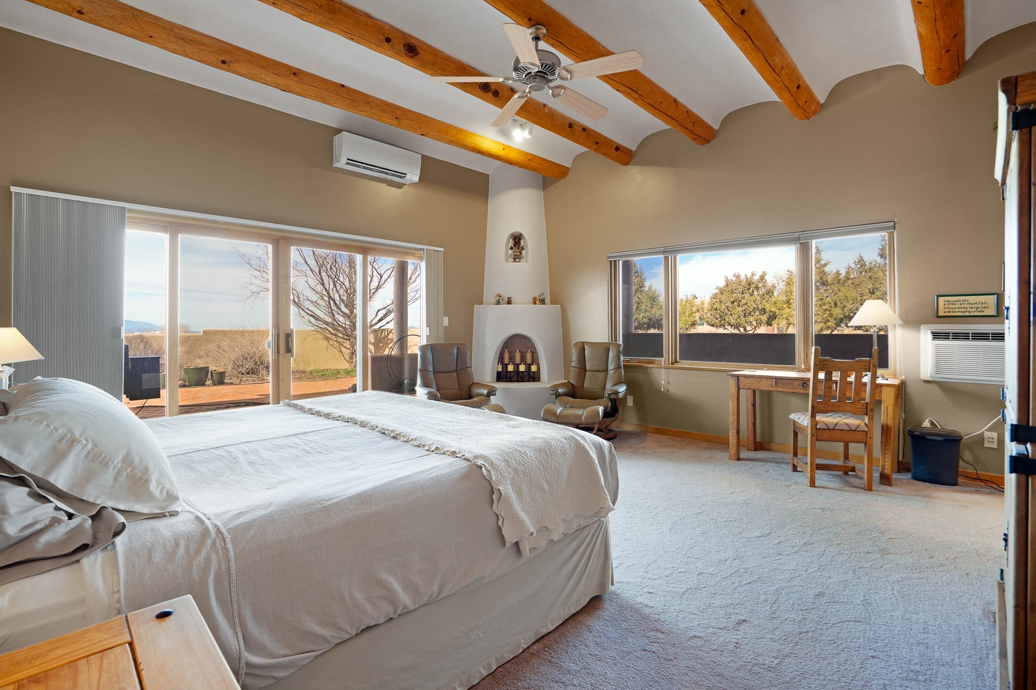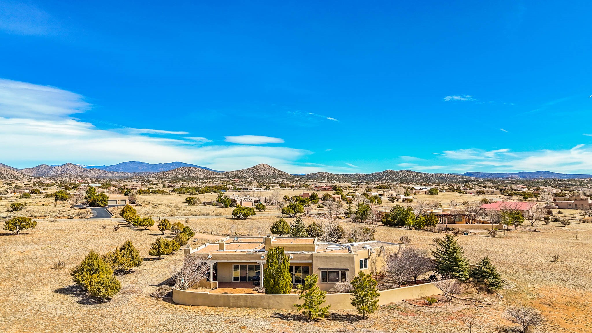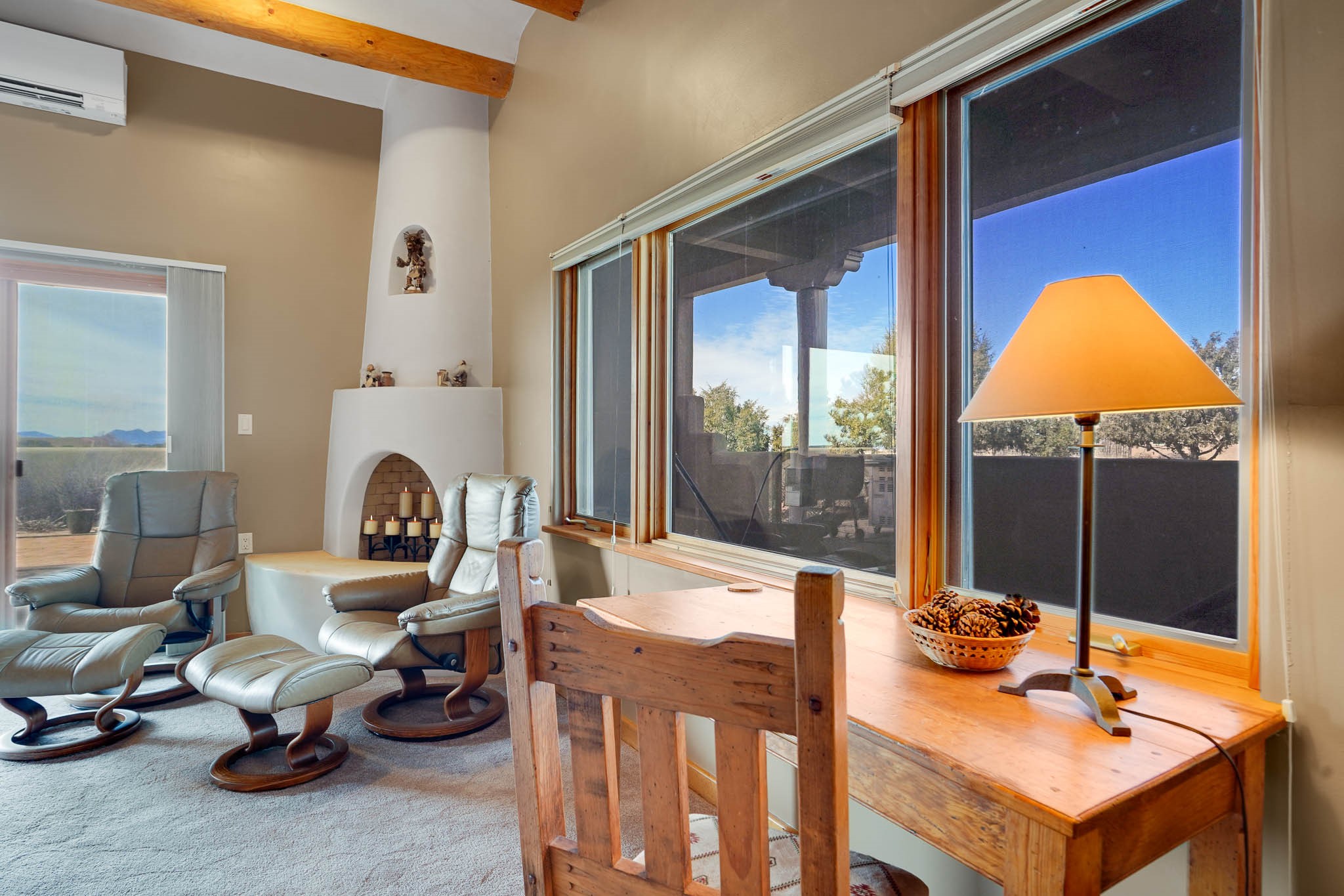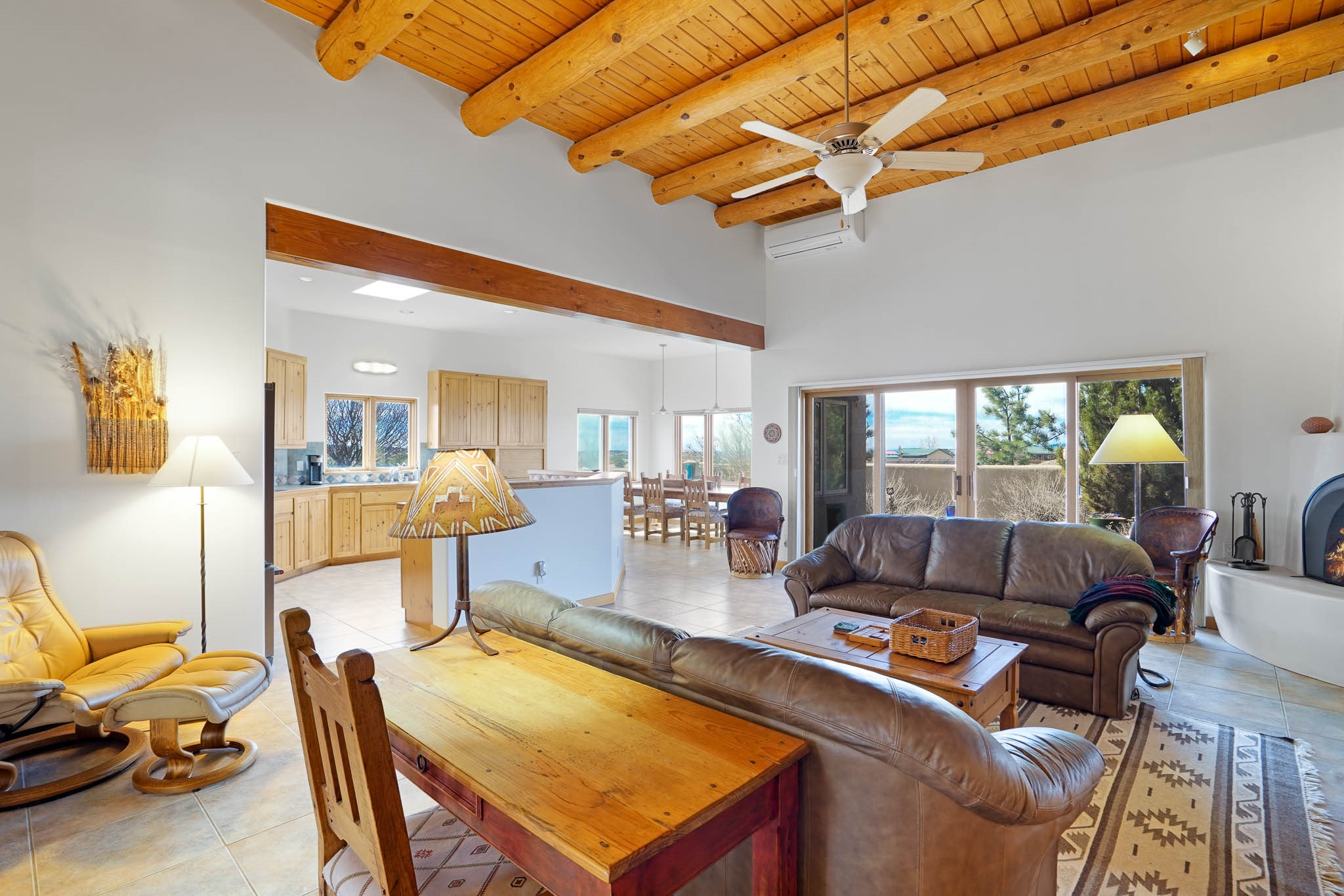 Now priced BELOW APPRAISAL VALUE! Located in the exclusive La Paz neighborhood, 122 La Paz Loop offers stunning sunset views on a 3-acre lot. This 3-bedroom, 2-bathroom home features classic Santa Fe style with beautiful kiva fireplaces in both the living room and primary suite. The open floor plan provides a seamless flow for living and entertaining, while the peaceful outdoor space offers privacy and room to relax. Just a short drive to downtown Santa Fe, you'll enjoy both tranquility and easy access to the city's amenities. Schedule your showing today!