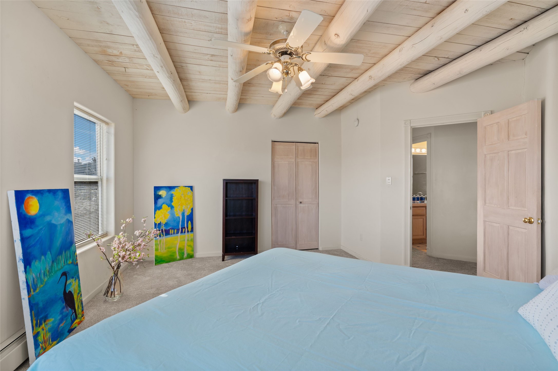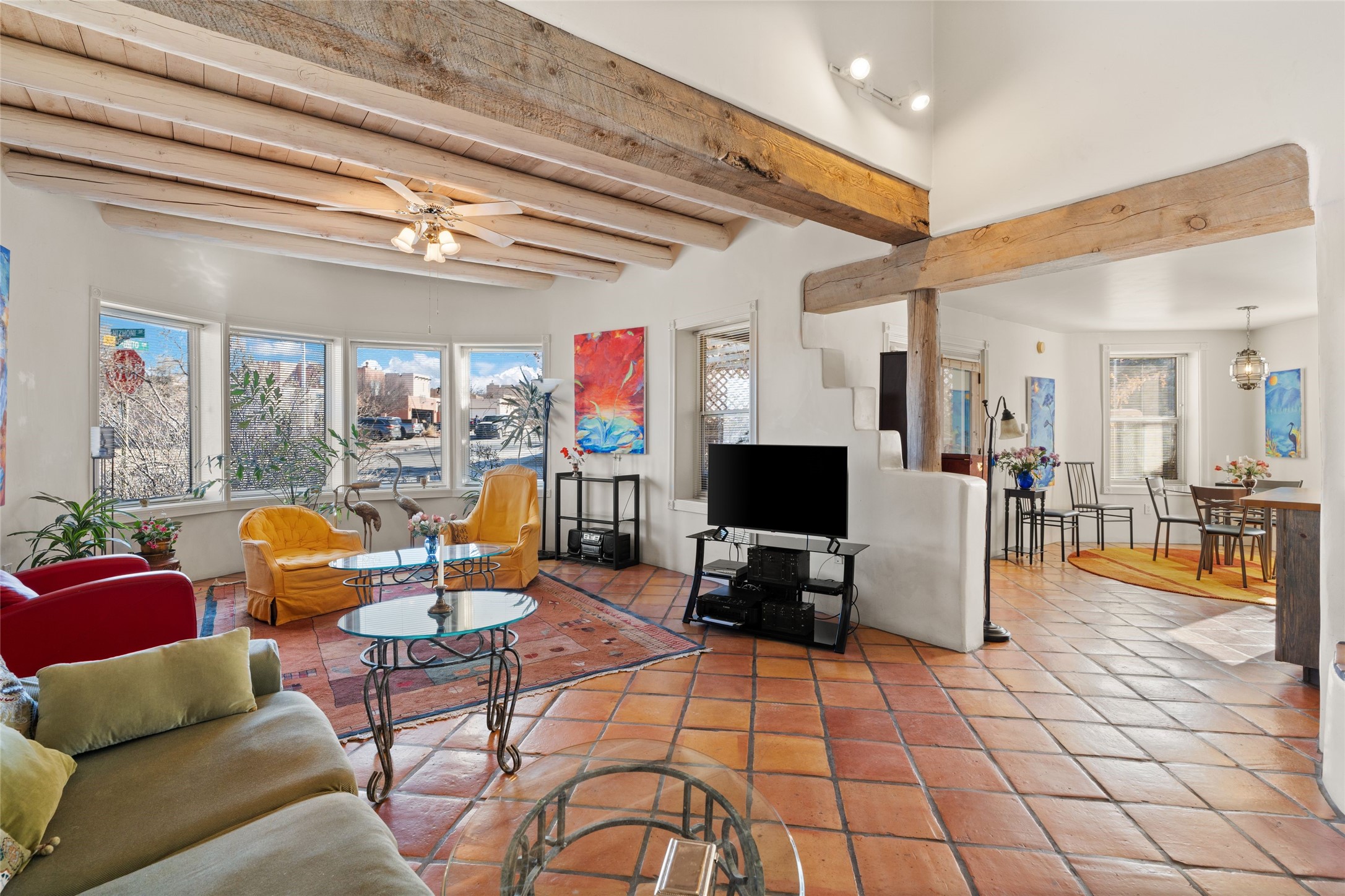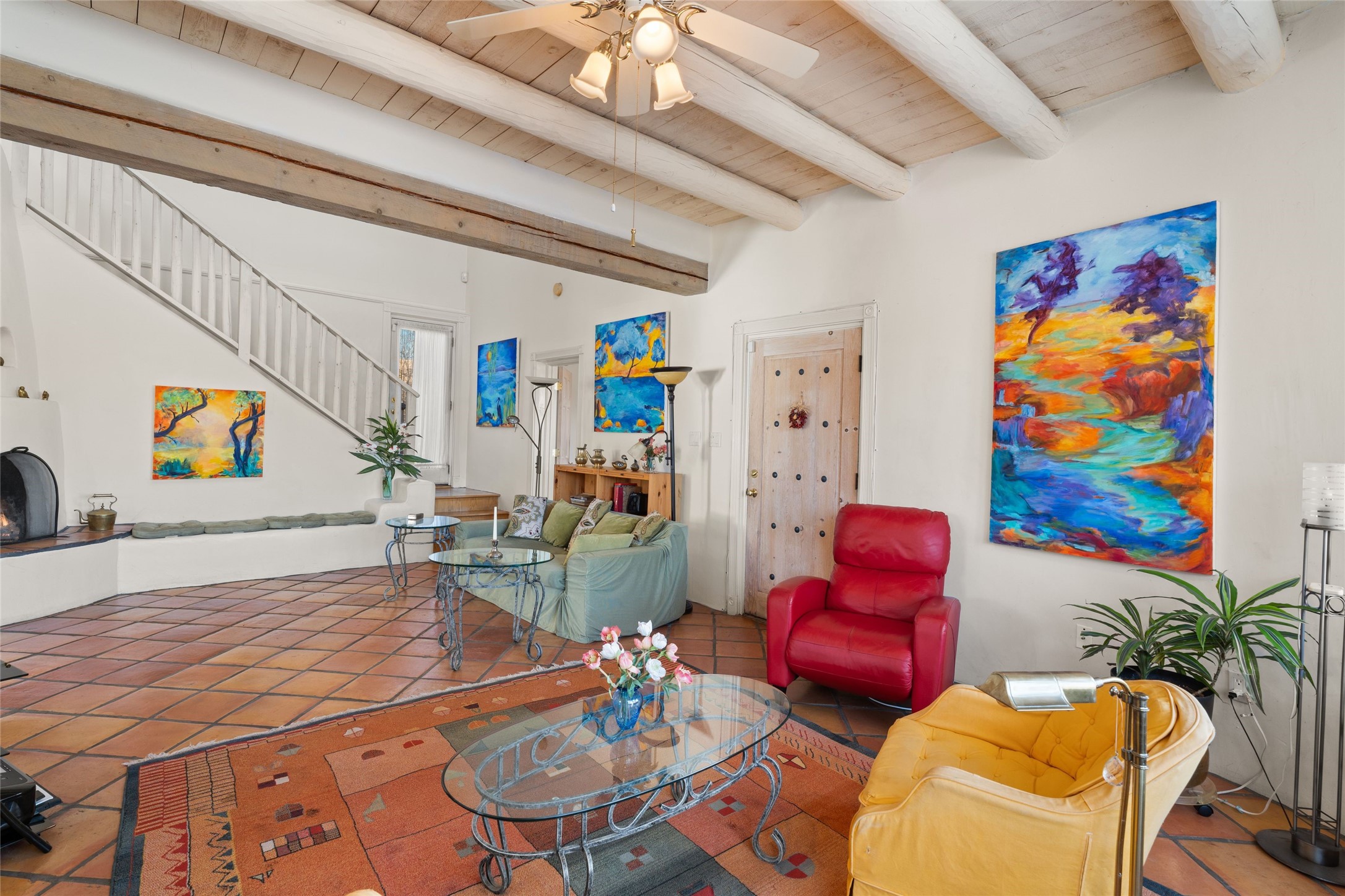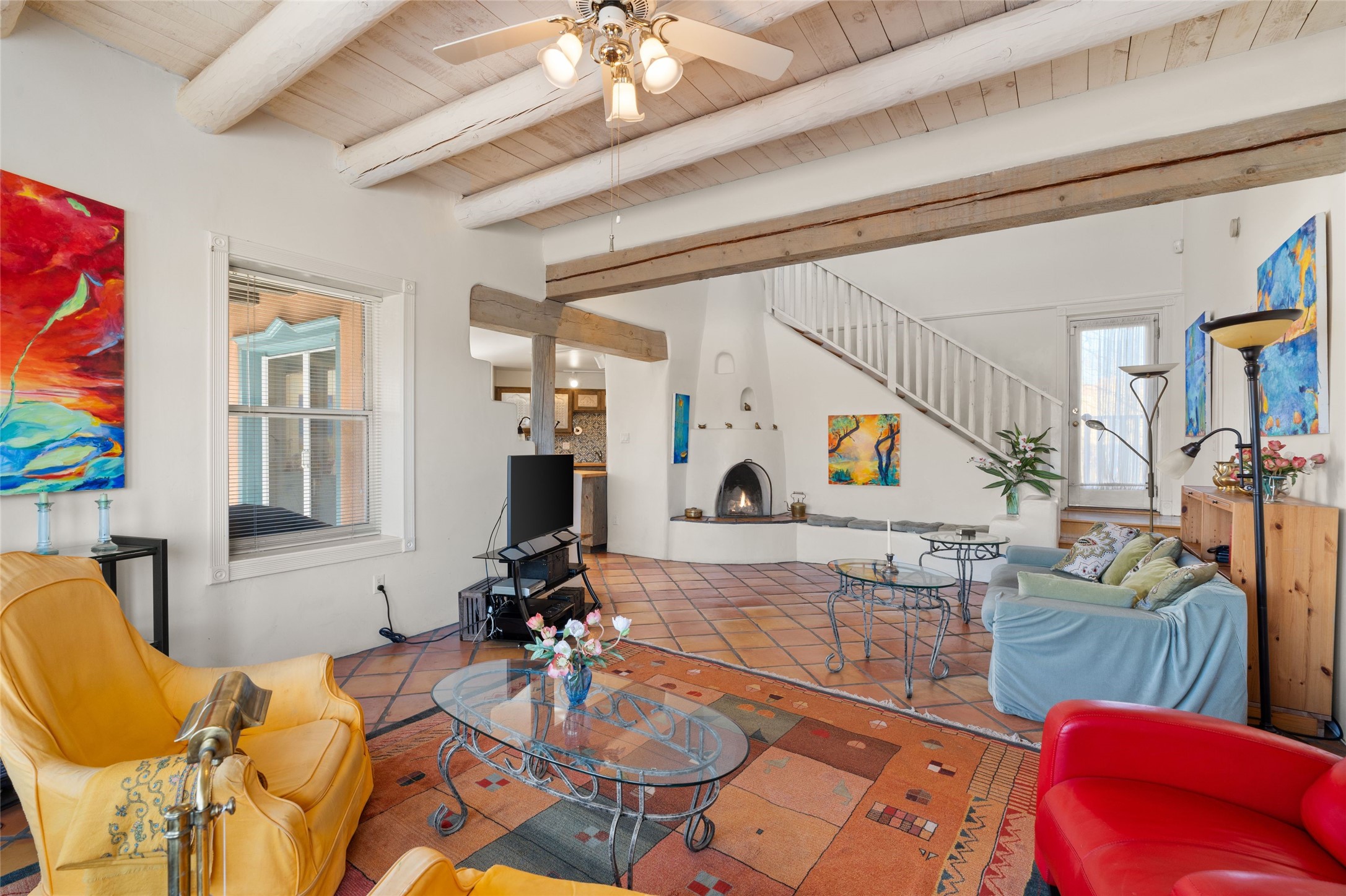 This meticulously maintained reflection of adobe and frame construction built by the revered 'Adobe Master' Hap Crawford in the quiet Pueblos Del Sol subdivision is centrally located close to shopping and expansive walking trails. This 1,810 +/- sq.ft., two-story home not only has has great separation of space, but an easy and livable floor plan with an oversized2-car garage for additional storage. The open-concept living room, dining room and kitchen have several large windows which bathe the space in warm light. A private pergola with trumpet vine and wisteria is accessible from the dining area for al fresco dining and entertaining. The large corner lot has a fenced back yard with additional privacy. The primary suite is located downstairs separated from two other bedrooms and a full bathroom upstairs with Sangre De Cristo mountain views. Lovely architectural details include a kiva, wood-burning fireplace and vigas in the living area, expressive tinwork on the kitchen cabinets, and detailed framework around the windows and doors. Tile, wood, and carpeted floors in the bedrooms make this warm and beautiful home an exceptional gem in the city of Santa Fe.