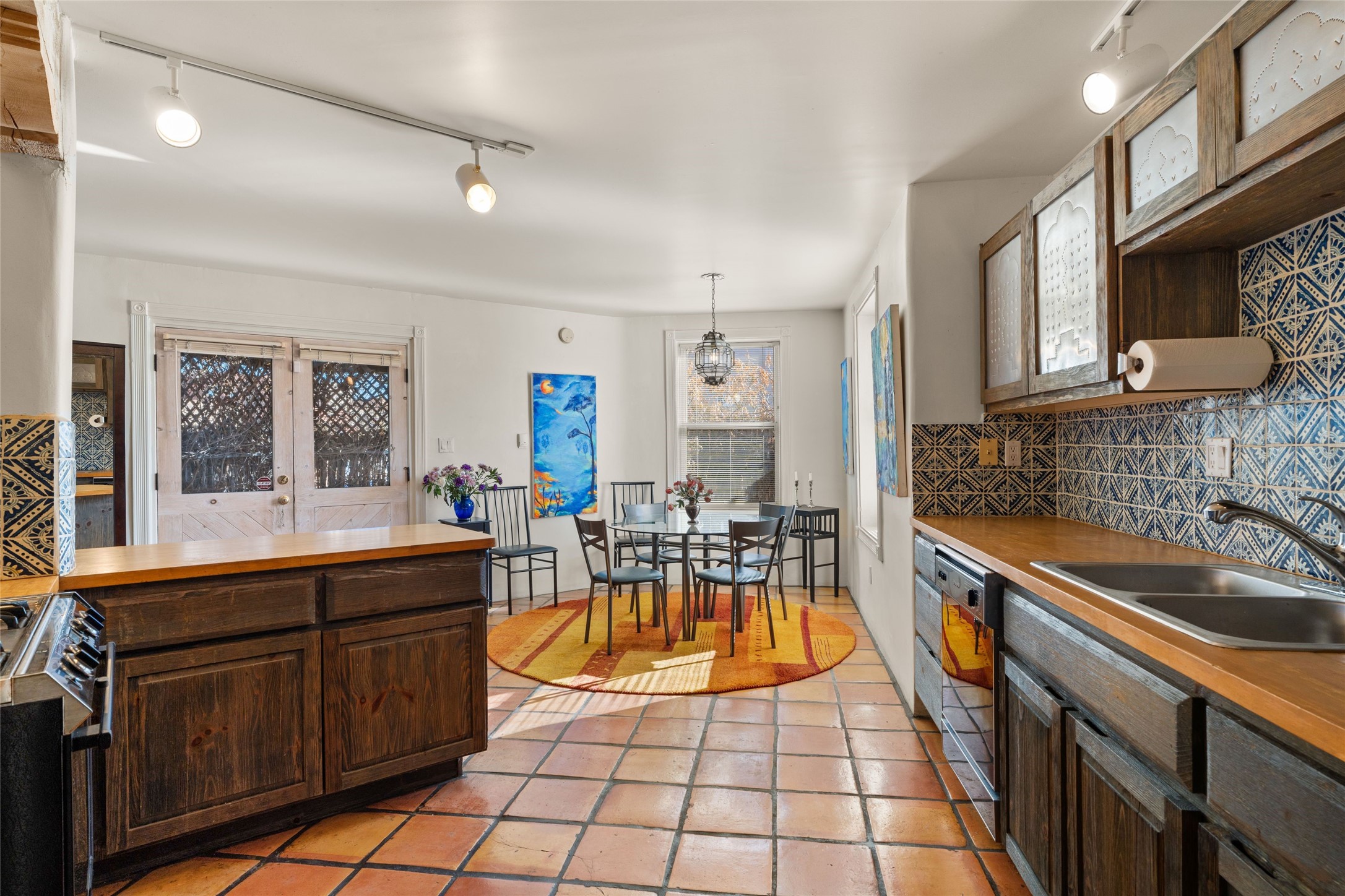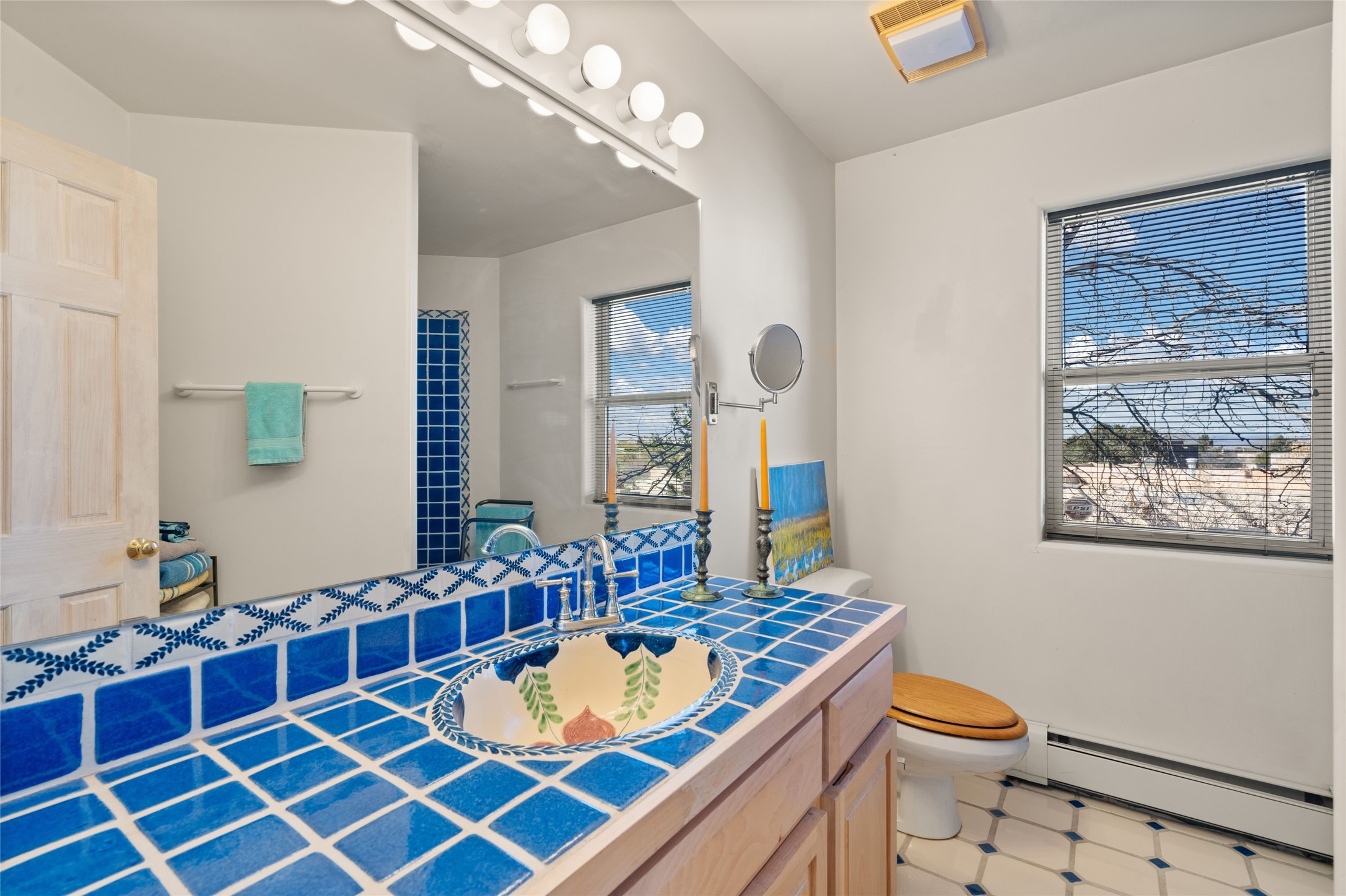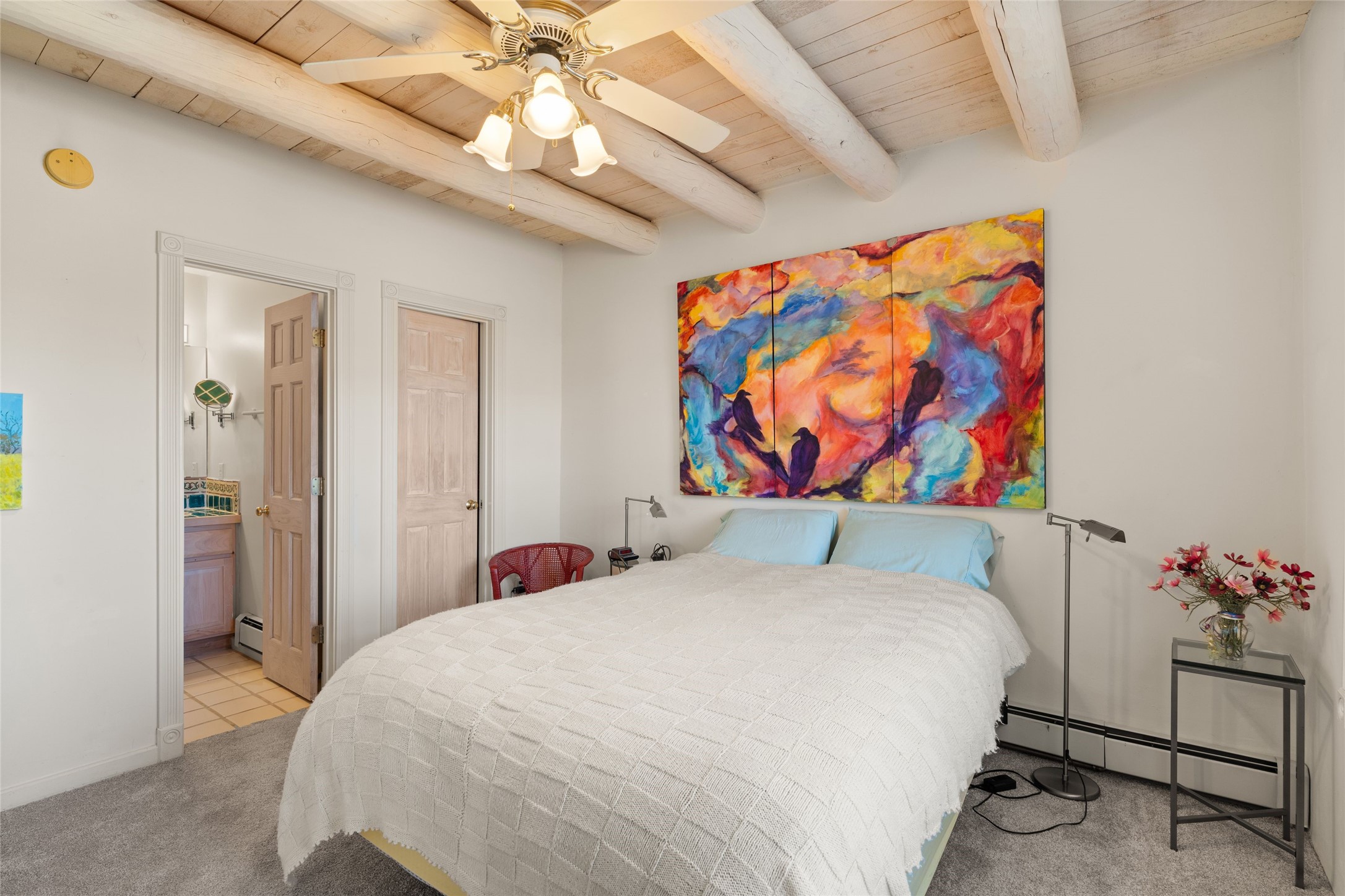 This meticulously maintained reflection of adobe and frame construction built by the revered 'Adobe Master' Hap Crawford in the quiet Pueblos Del Sol subdivision is centrally located close to shopping and expansive walking trails. This 1,810 +/- sq.ft., two-story home not only has has great separation of space, but an easy and livable floor plan with an oversized2-car garage for additional storage. The open-concept living room, dining room and kitchen have several large windows which bathe the space in warm light. A private pergola with trumpet vine and wisteria is accessible from the dining area for al fresco dining and entertaining. The large corner lot has a fenced back yard with additional privacy. The primary suite is located downstairs separated from two other bedrooms and a full bathroom upstairs with Sangre De Cristo mountain views. Lovely architectural details include a kiva, wood-burning fireplace and vigas in the living area, expressive tinwork on the kitchen cabinets, and detailed framework around the windows and doors. Tile, wood, and carpeted floors in the bedrooms make this warm and beautiful home an exceptional gem in the city of Santa Fe.