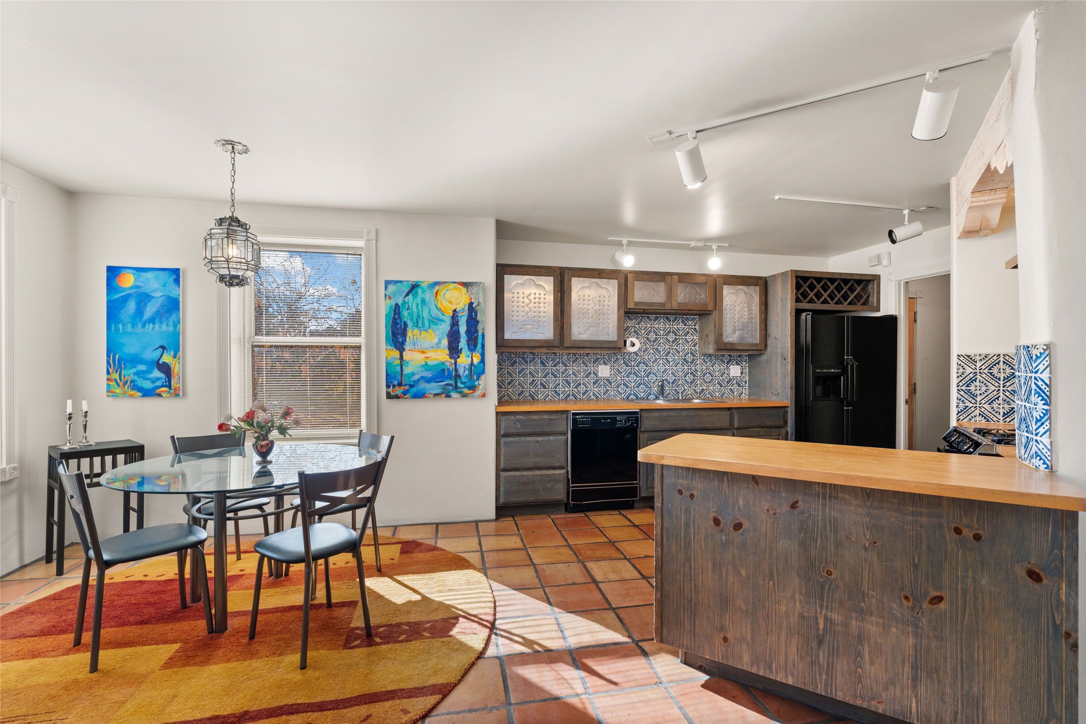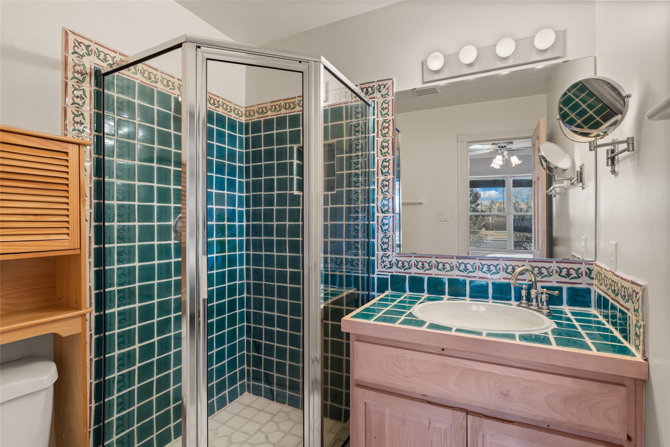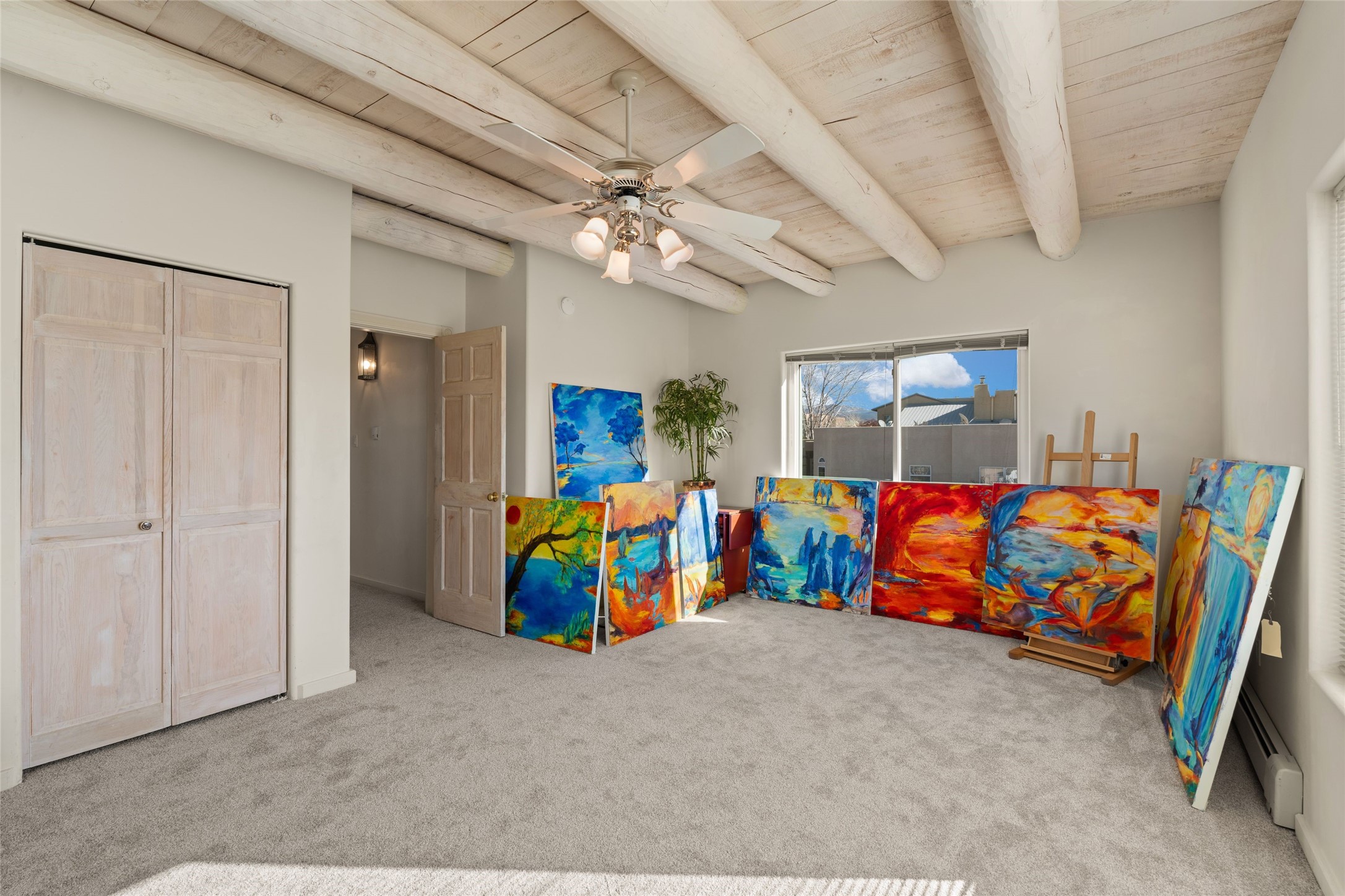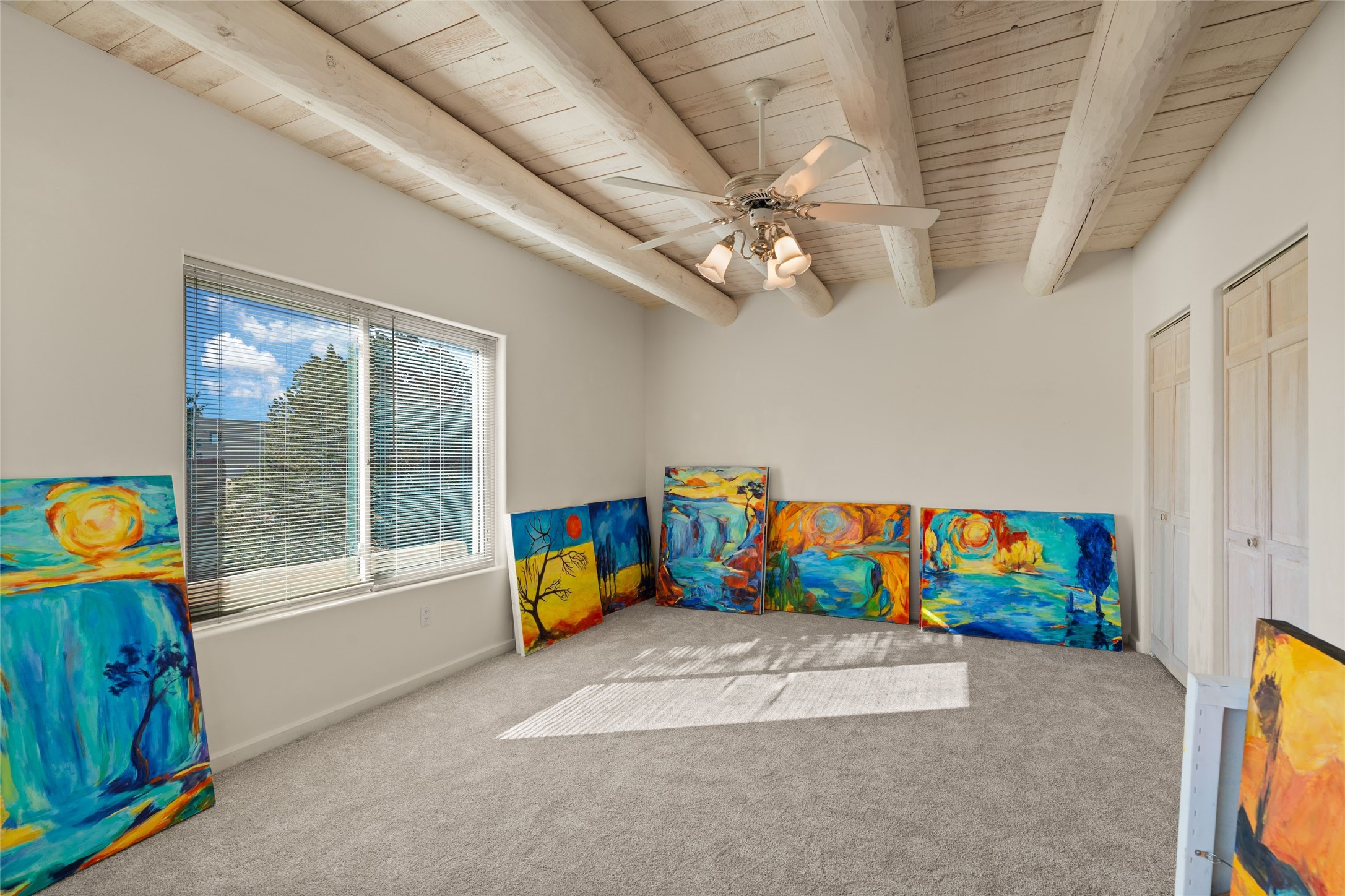 This meticulously maintained reflection of adobe and frame construction built by the revered 'Adobe Master' Hap Crawford in the quiet Pueblos Del Sol subdivision is centrally located close to shopping and expansive walking trails. This 1,810 +/- sq.ft., two-story home not only has has great separation of space, but an easy and livable floor plan with an oversized2-car garage for additional storage. The open-concept living room, dining room and kitchen have several large windows which bathe the space in warm light. A private pergola with trumpet vine and wisteria is accessible from the dining area for al fresco dining and entertaining. The large corner lot has a fenced back yard with additional privacy. The primary suite is located downstairs separated from two other bedrooms and a full bathroom upstairs with Sangre De Cristo mountain views. Lovely architectural details include a kiva, wood-burning fireplace and vigas in the living area, expressive tinwork on the kitchen cabinets, and detailed framework around the windows and doors. Tile, wood, and carpeted floors in the bedrooms make this warm and beautiful home an exceptional gem in the city of Santa Fe.