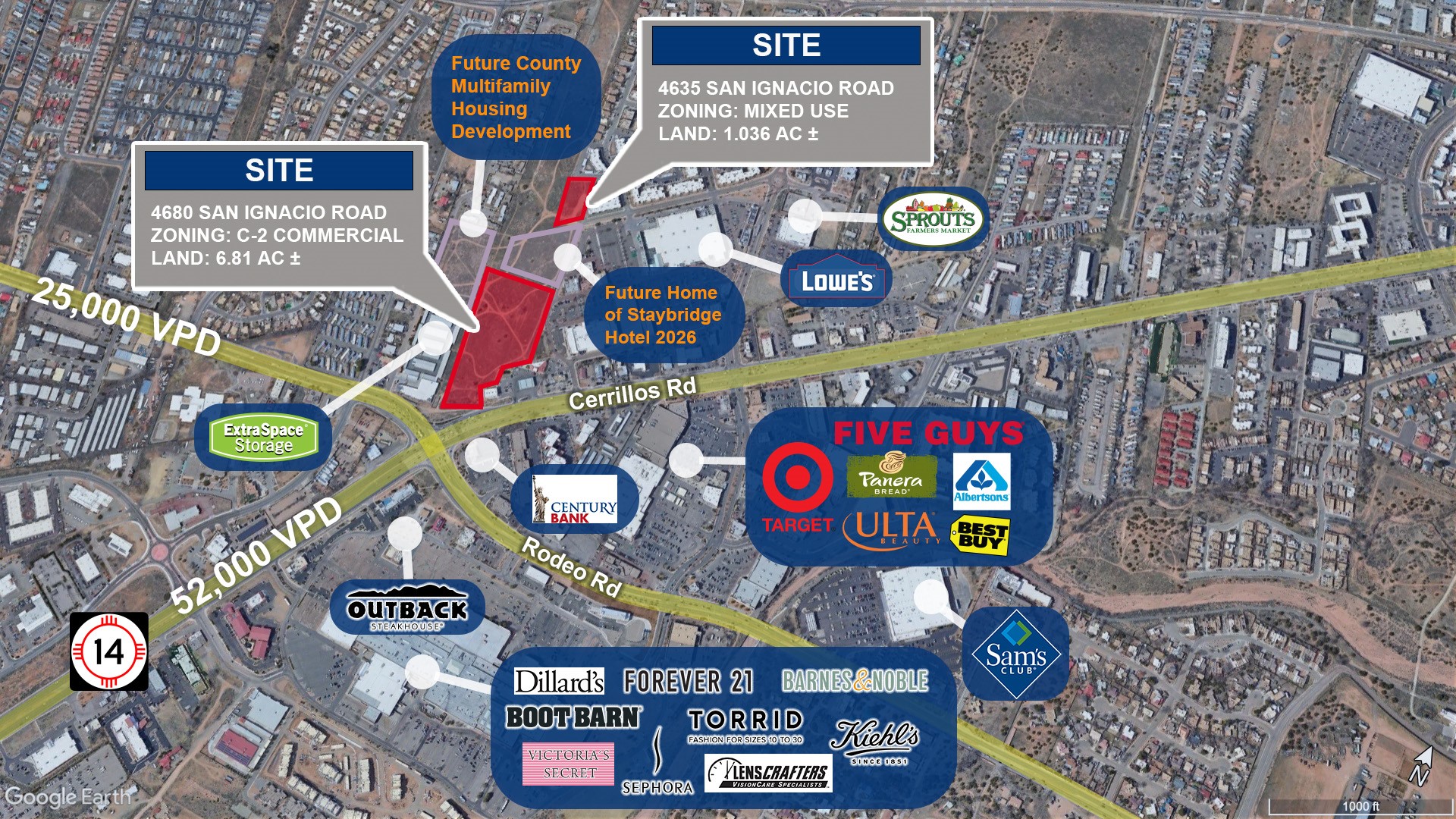 Two prime infill sites ripe for commercial development next to San Isidro Plaza. 4860 San Ignacio Rd Lot A-2: 6.811 acres ($4,125,000). 4635 San Ignacio Rd Lot B: 1.036 acres ($625,000). $4,750,000 ($13.90/sf) for both lots (7.847 ac). Located across the street from regional shopping center Santa Fe Place. Nearby businesses include Lowe's, Sprouts, Best Buy, Albertsons, Target, Starbucks, Panera Bread, Ulta, Barnes & Noble, World Market, Dillards and more. 4680 San Ignacio Rd has C-2 commercial zoning which allows for retail, restaurants, multifamily, hospitality, office, religious, educational and more. 4635 San Ignacio Rd has Mixed Use zoning, which allows for residential, retail, restaurants, office, personal services, studios, wellness, educational, community facilities, and live/work units with the condition that MU zoned land can be developed for residential use with up to 50% commercial space. Access available via San Ignacio Road. Close to the busy intersection of Cerrillos Rd (52,000 VPD) and Airport Road (25,000 VPD). City water and sewer in place near the lot line. Public utilities available. Located in an Opportunity Zone. If developed for multifamily housing, this property might qualify for the next round of $30,000,000 of financing from the NMFA Opportunity Enterprise Housing Development Fund - applications are open on a revolving basis - more info at https://www.nmfinance.com/opportunity-enterprise-housing-development-revolving-fund/