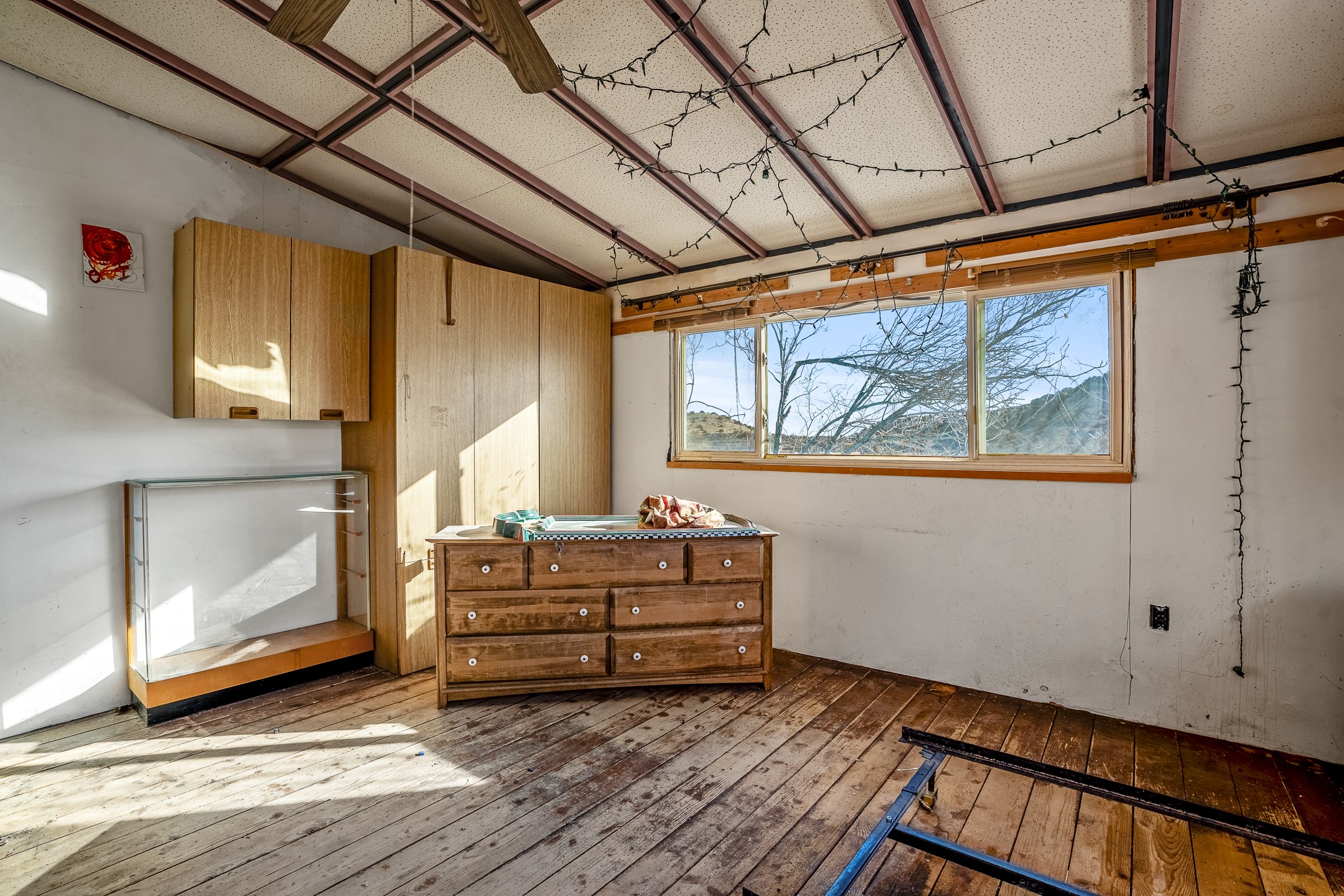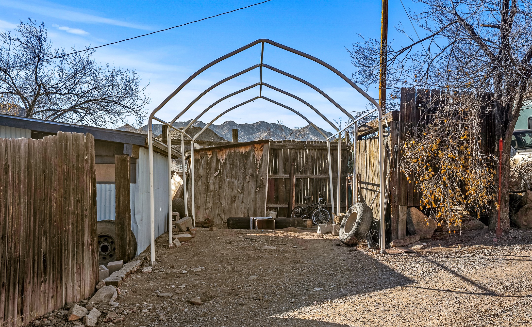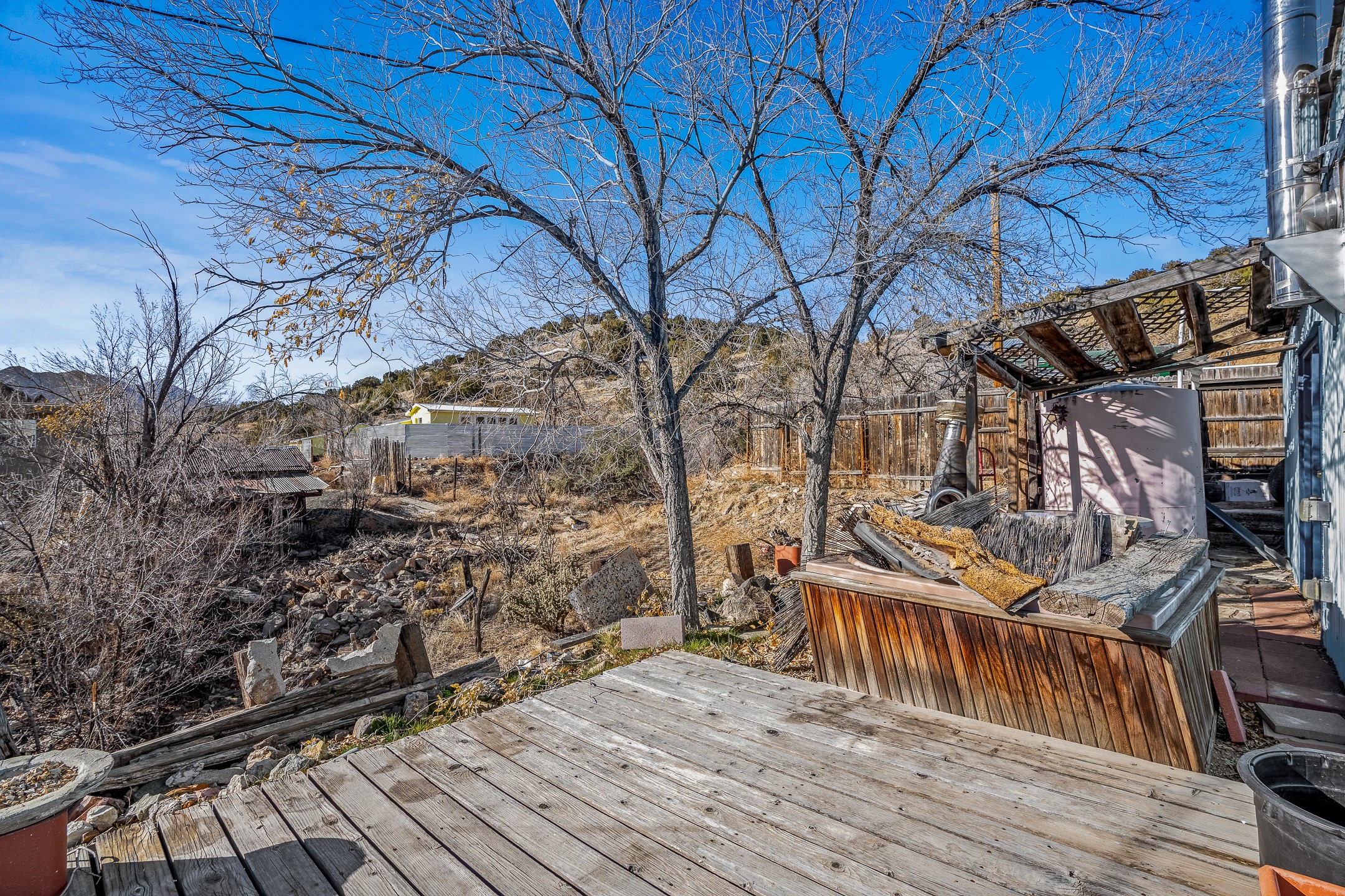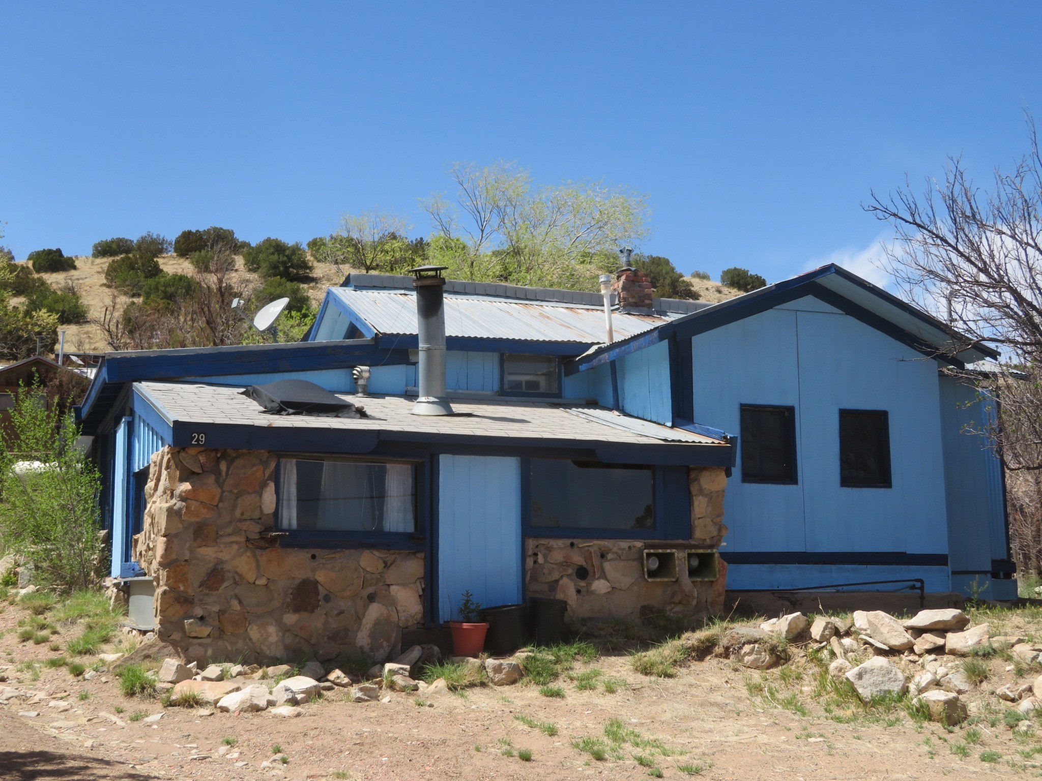 Fix 'em up!--project opportunity in Madrid on nice view lot. Recent price improvement, too. Two homes, two addresses---2 Grasshopper and 29 Backroad, both one of a kind, Madrid-style structures, of stone, wood, and metal siding, both with striking views of hillsides, mountains and town. The much-loved home and semi- industrial metal building --the "warehouse/apartment" will make great projects! You can live in one while you fix up or rent the other as the past owner did, or use as your workshop, home business, storage, garage, etc. On a treed, spacious lot with landscaped terraces and a rocky little arroyo, there's room to park and relax in the yard. Elements of Madrid's old mining days abound: beams from the old Madrid mine building and "found objects" incorporated into the facade. The County Assessor estimates the stone/wood house at 1112 sq ft and the warehouse/apartment at approx. 784 sq ft. Conventional electric, Madrid water membership. Nearby to everything Madrid including the tavern, dispensary, restaurants and galleries, trails, ballpark, and more.