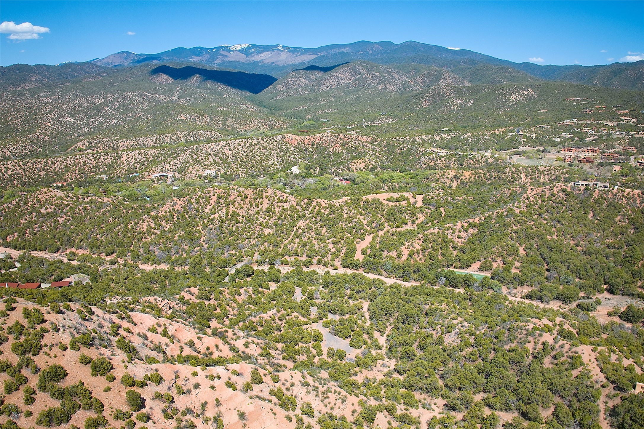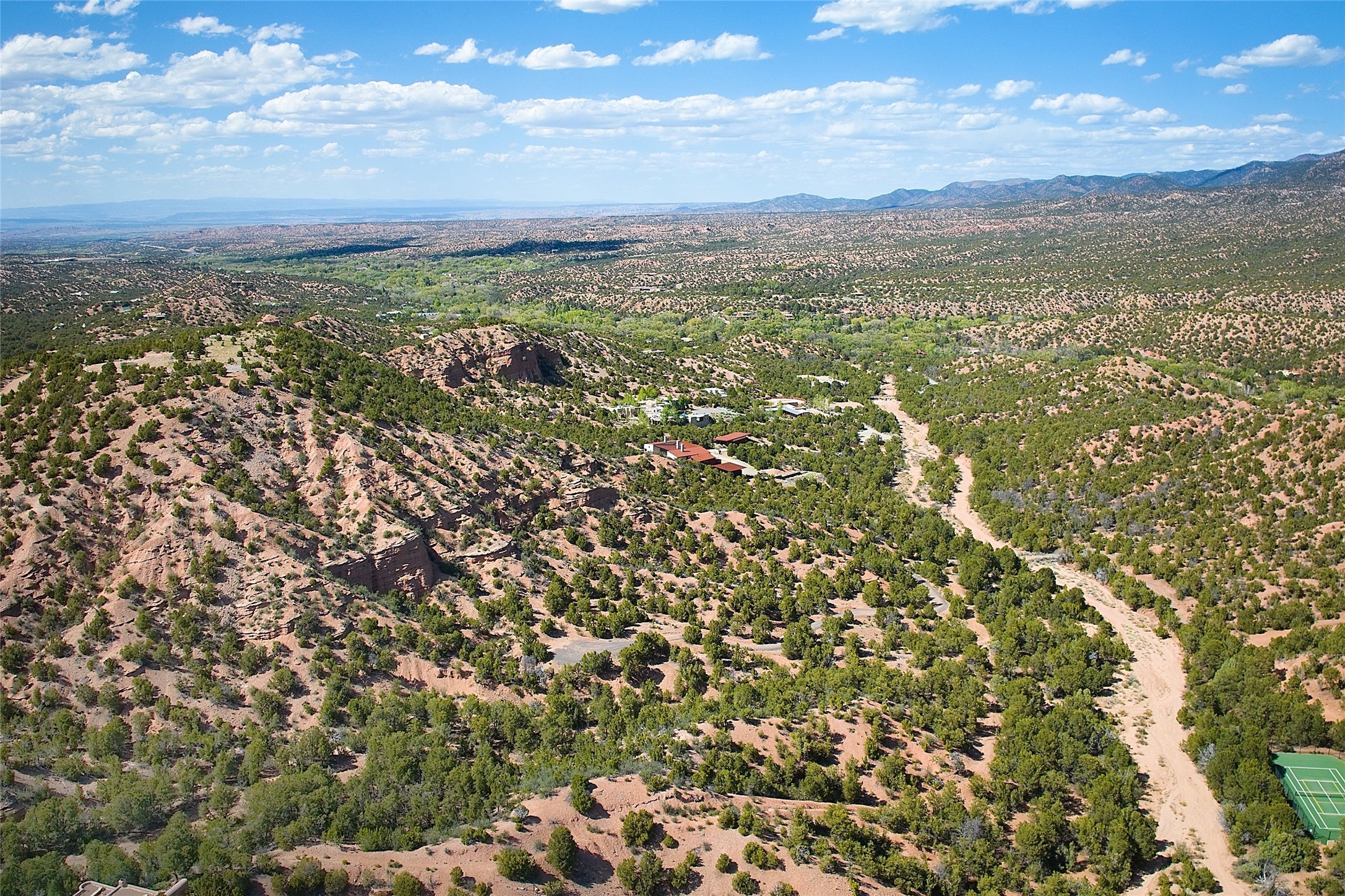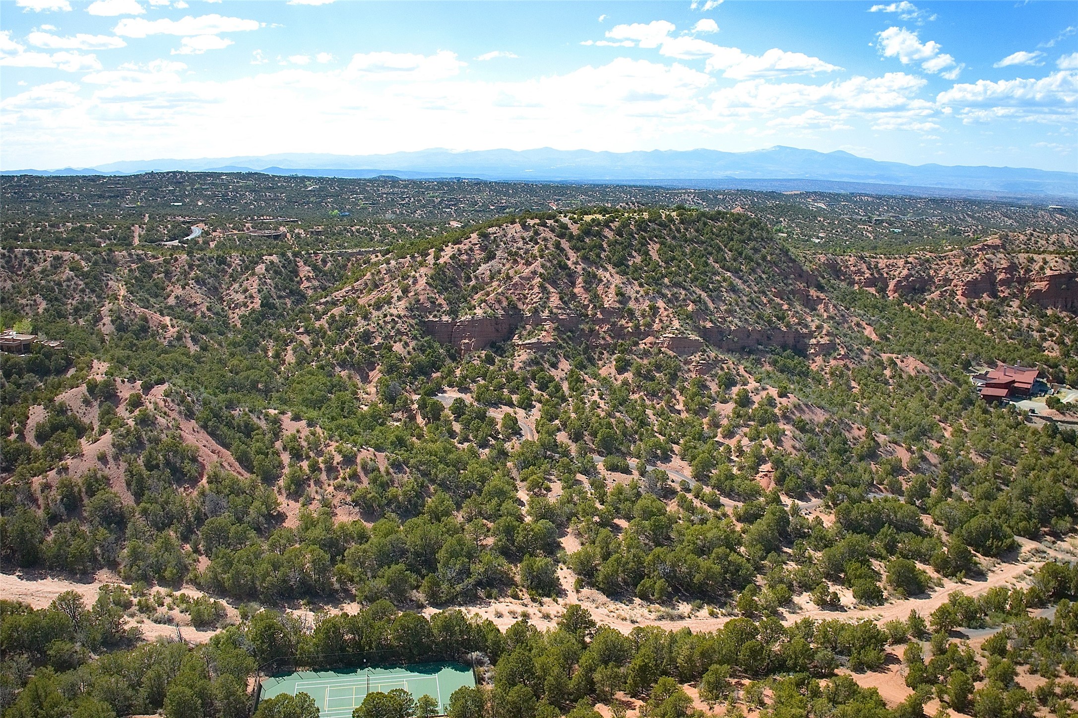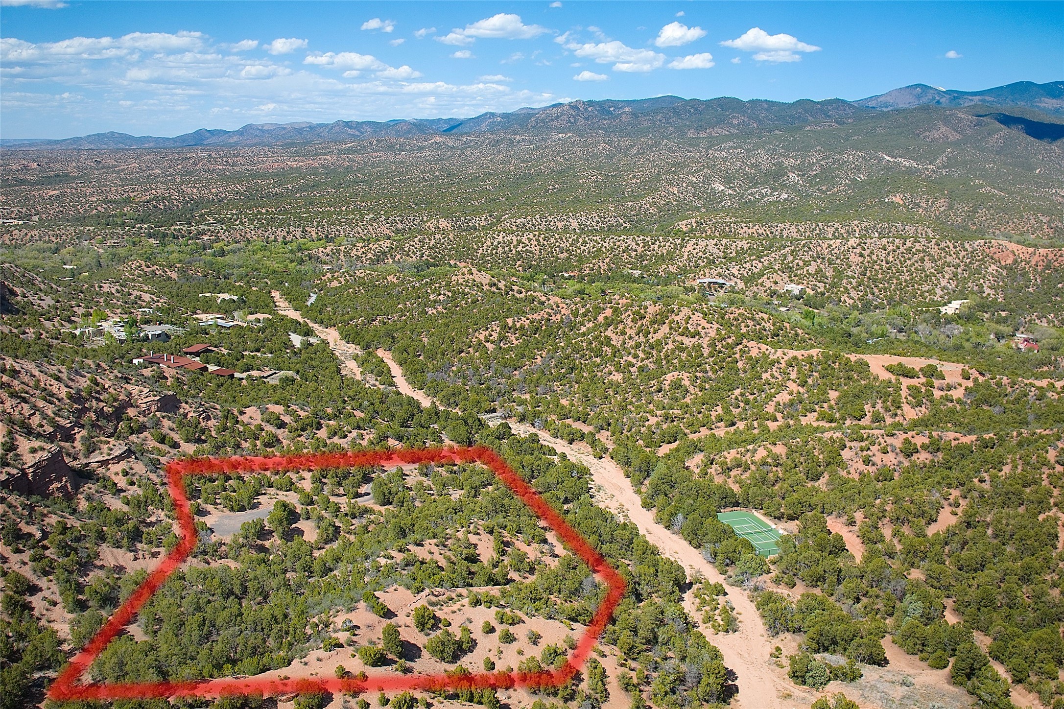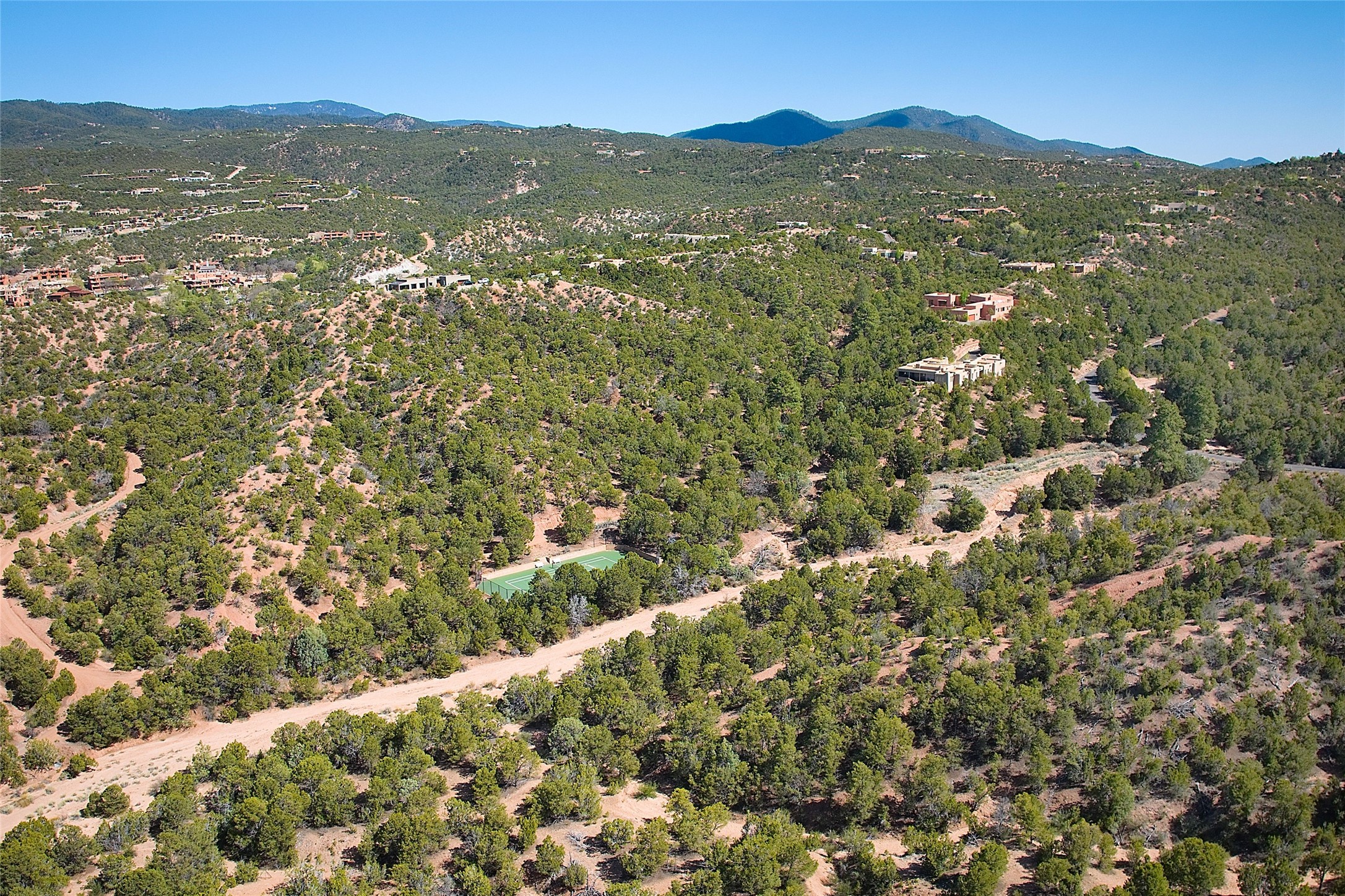 Rare opportunity to own 23.01-acres of residential land offering spectacular panoramic views of the Sangre de Cristo Mountains and the tranquil Tesuque Valley. This unique parcel consists of two separately deeded contiguous lots. Accessed through the prestigious gated Circle Drive Compound, this property ensures a sense of privacy and exclusivity while remaining connected to a vibrant community. With several designated building envelopes, you have the creative freedom to design a residence that perfectly complements the stunning surroundings. One of the deeded lots features a finished tennis court, a luxurious amenity that enhances your outdoor lifestyle while allowing for community access. Imagine enjoying sunny afternoons on the court or hosting gatherings with friends and family, all set against the backdrop of breathtaking natural beauty. Full plans for 4,738 sq. ft. 3 bedroom, 4 bath main house (with an approved permit for pool) and 1608 sq. ft. 2 bedroom, 2 bath casita from Craig Hoopes Architects could be included with sale. Underground utilities, and one shared well permitted for multiple domestic households. Zoning is Residential Fringe; District Density: RES-F; 1 dwelling per 5 acres. This prime location combines the best of both worlds: the serenity of rural living and the convenience of nearby amenities. Experience the rich culture and outdoor adventures that New Mexico has to offer, all while enjoying the comfort of your own private retreat.