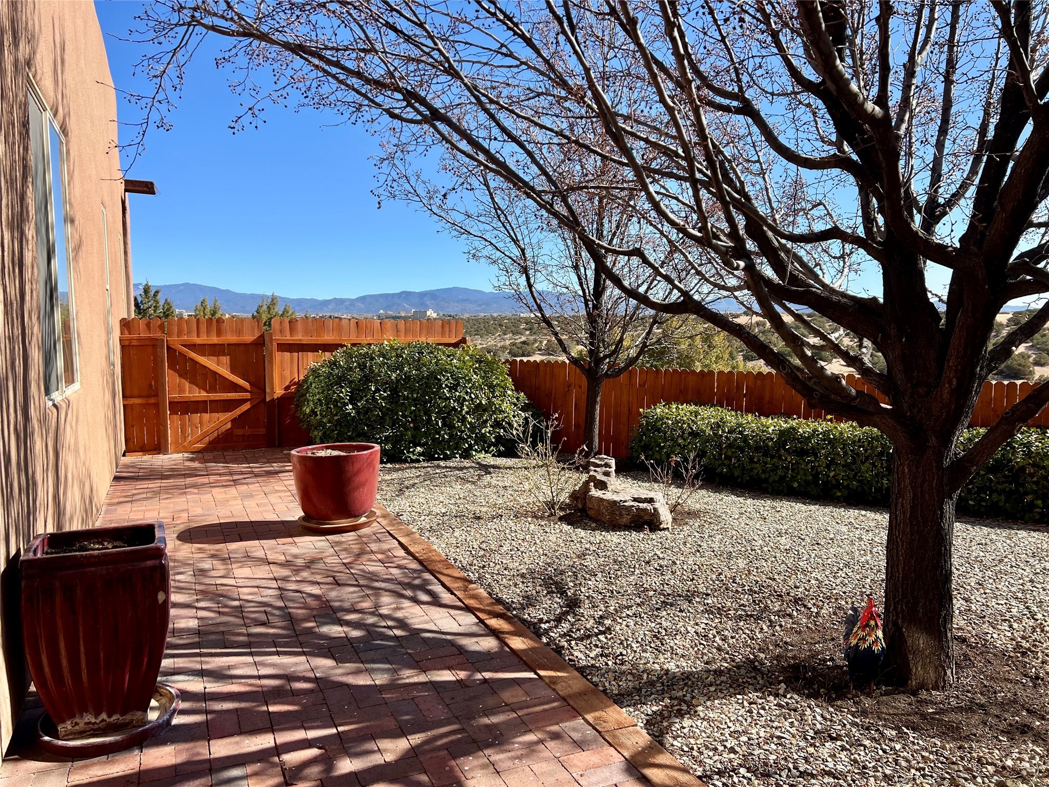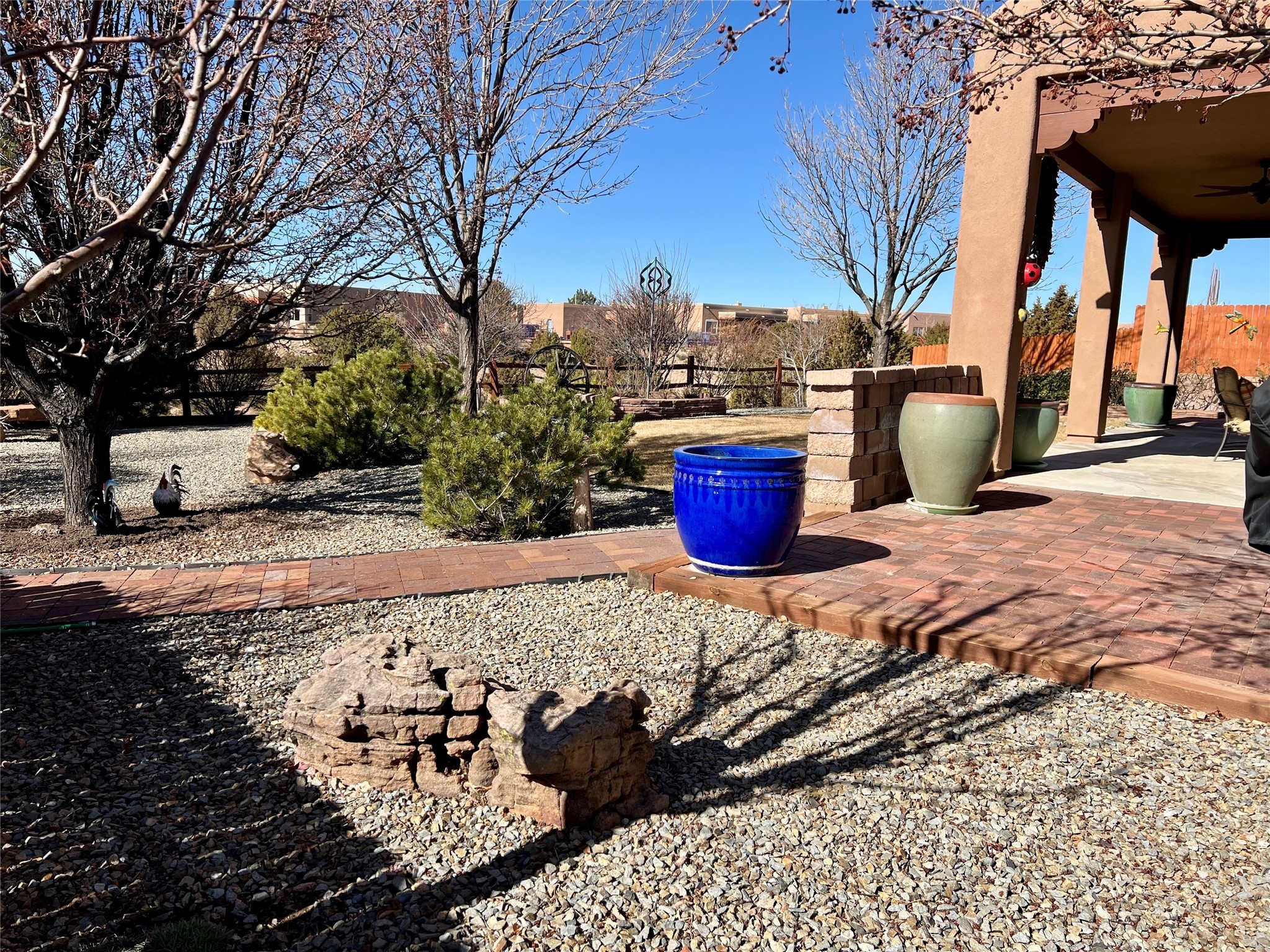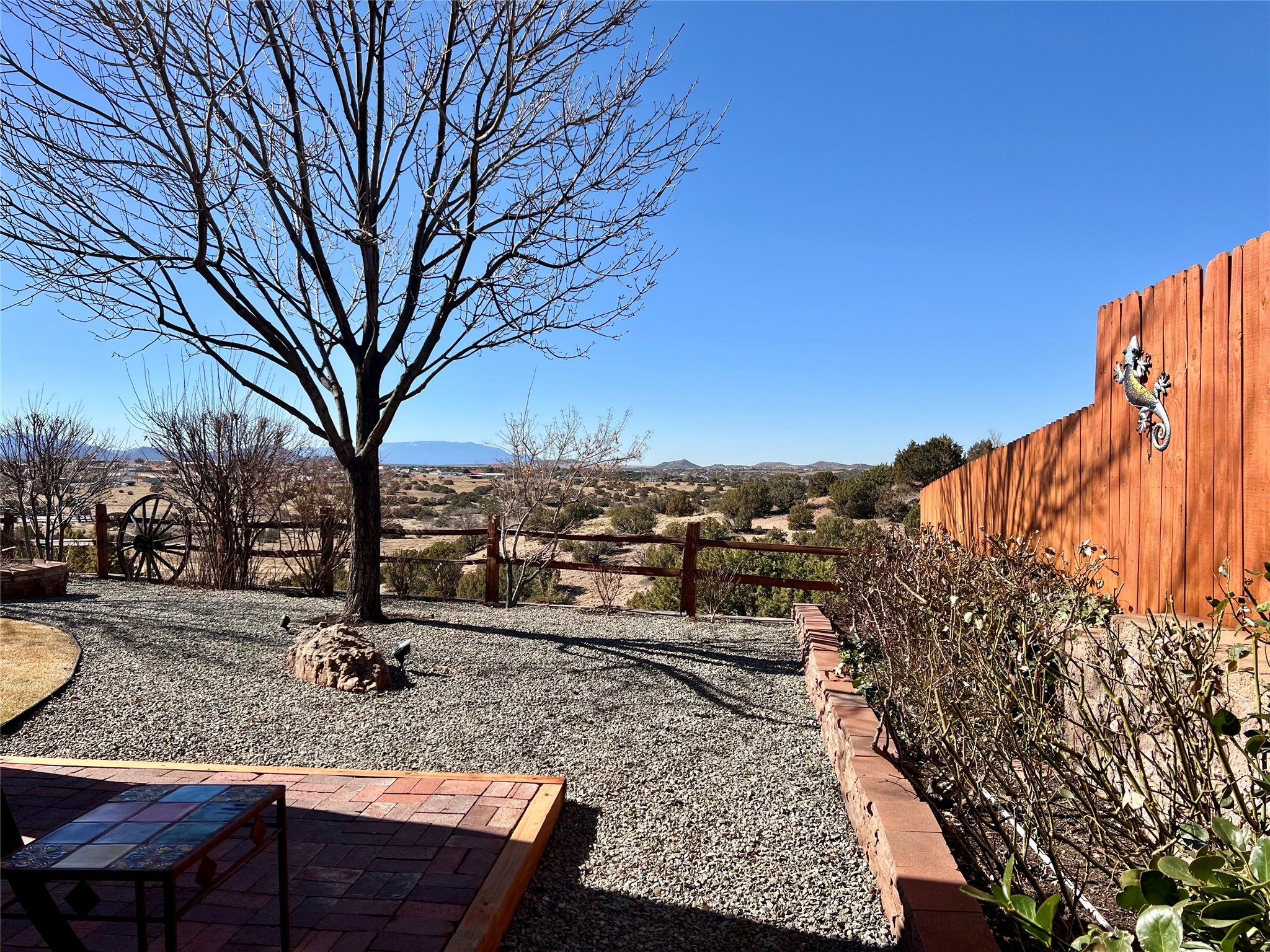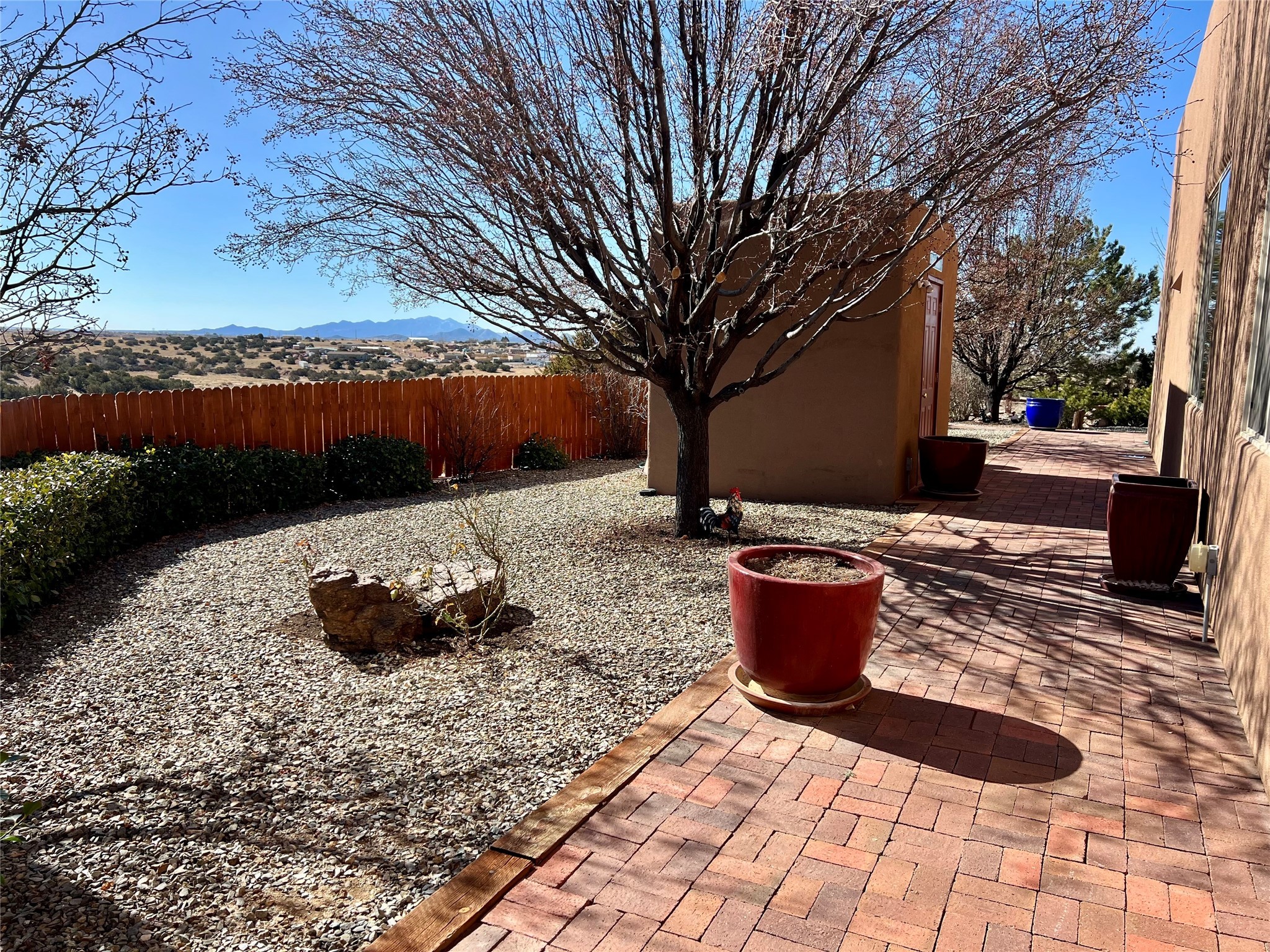 Nestled in a quiet cul-de-sac with no neighbors on the west or south sides, this charming and meticulously maintained home offers the perfect blend of privacy, comfort, and modern updates. Featuring three spacious bedrooms, two bathrooms, a dedicated office, and a generous two-car garage, this home's well-designed layout provides both functionality and warmth.The inviting living space is highlighted by beautiful vigas and soaring 10-foot ceilings, adding a touch of Southwestern elegance. Beautiful skylights throughout the home, a cozy fireplace completes the space, creating a warm and inviting atmosphere ideal for relaxation.Step outside to a beautifully landscaped backyard--a true gardener's dream! Thoughtfully designed with lush greenery and open space, this serene retreat offers breathtaking views and endless possibilities for outdoor enjoyment. The covered patio, complete with a ceiling fan, provides a cool and comfortable space to relax or entertain. Whether you're tending to your garden, unwinding in the shade, or hosting guests, this private oasis is the perfect place to soak in the natural beauty that surrounds you. A storage shed provides additional space for tools and outdoor essentials, ensuring everything has its place.Recent updates include fresh stucco on the west and south sides (completed in August/September 2024), a brand-new outdoor gate and fence enclosing the property, and new paint and plush carpeting (2023), all enhancing the home's fresh and welcoming feel. Additional upgrades include a Trane HVAC system on the north side of the garage, as well as a newer water heater and furnace, both replaced approximately three to four years ago.