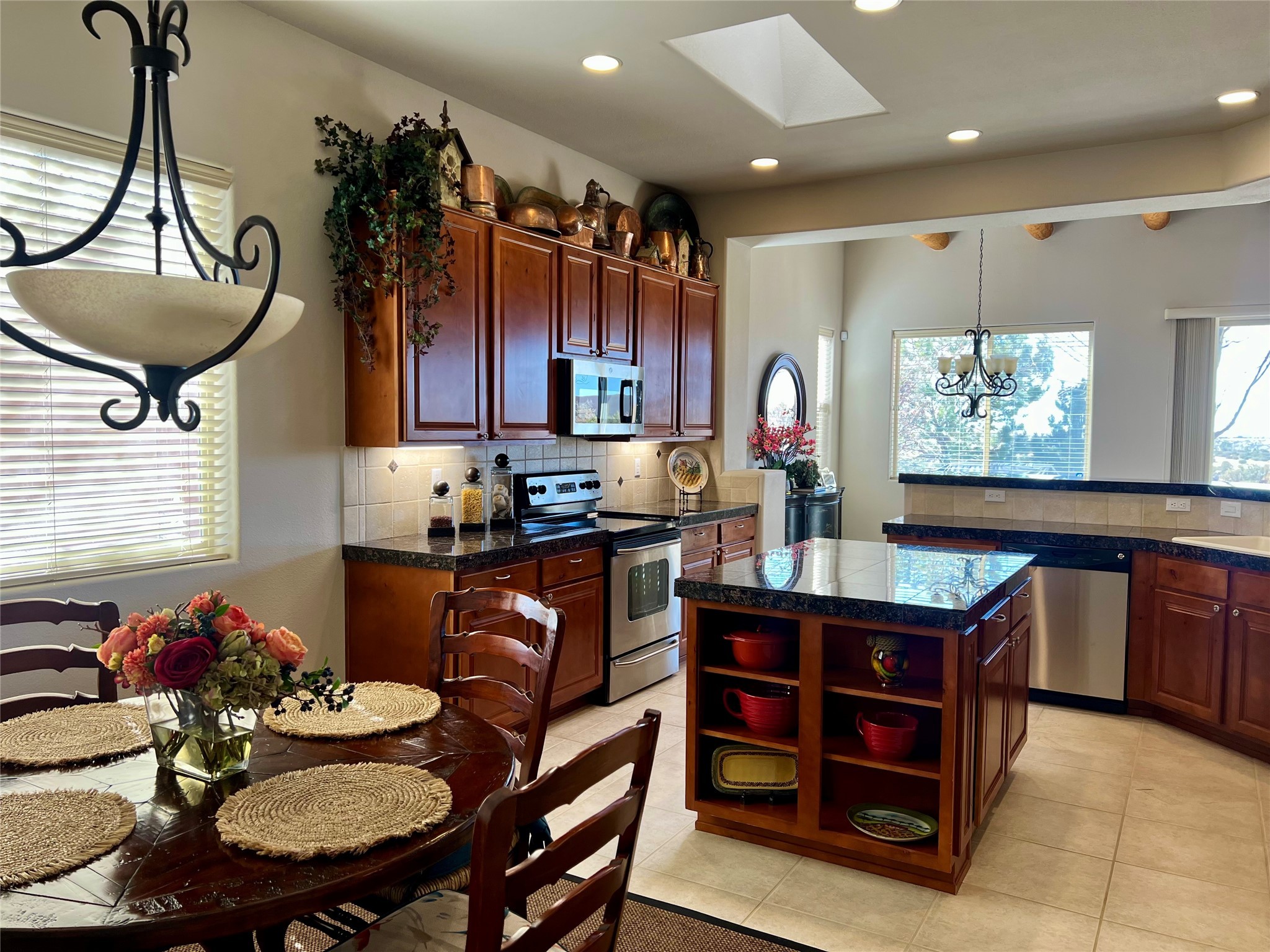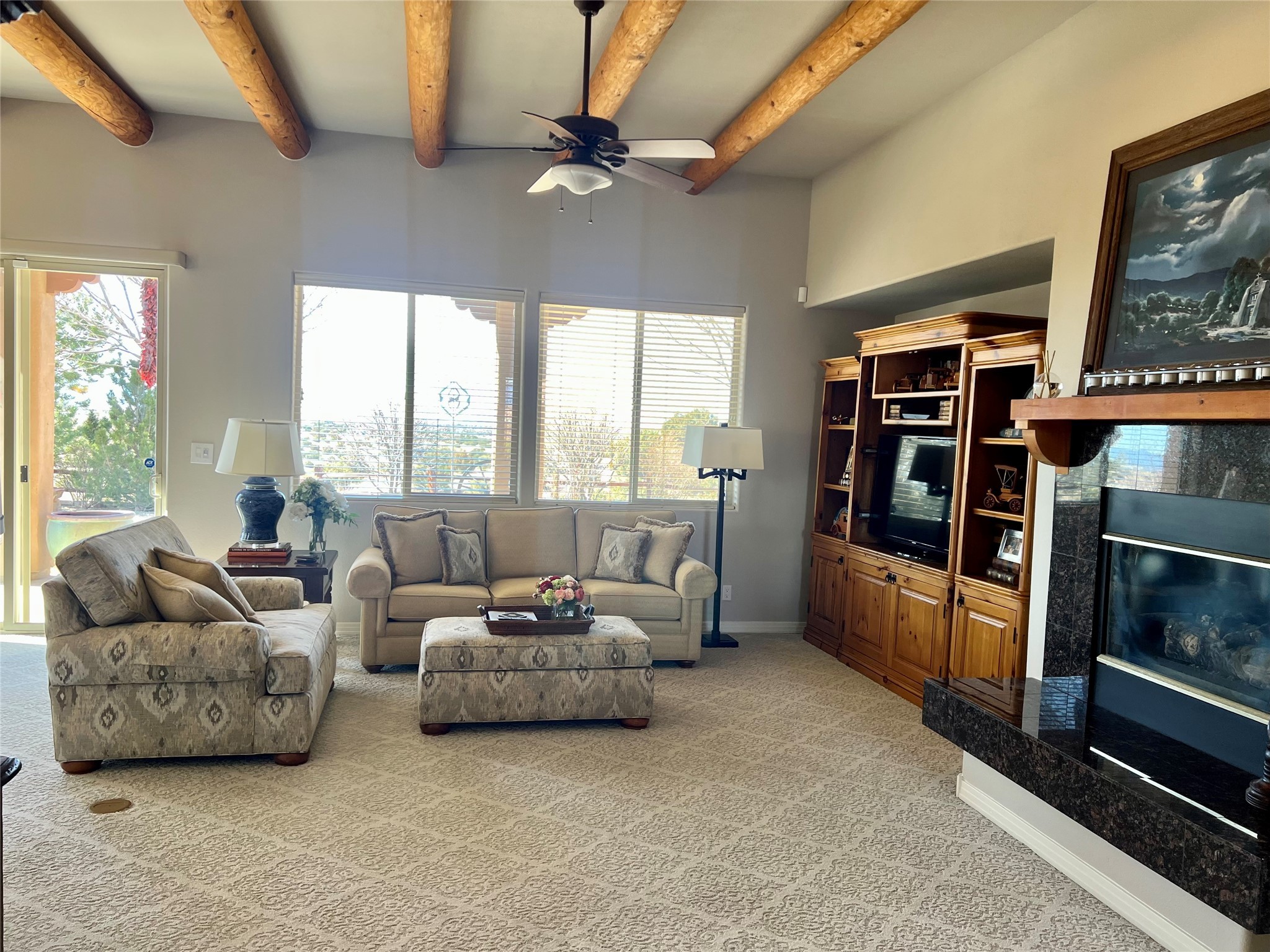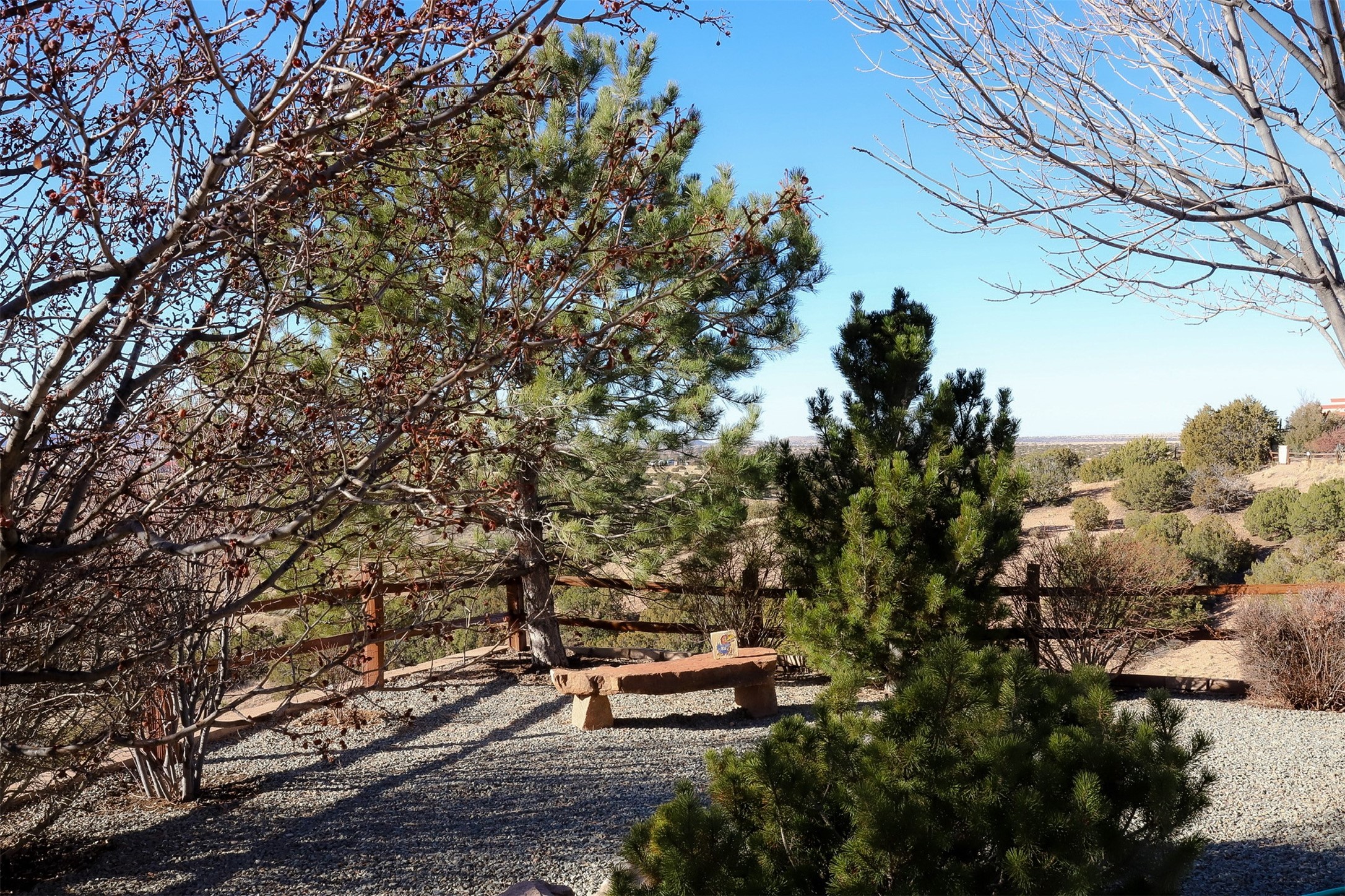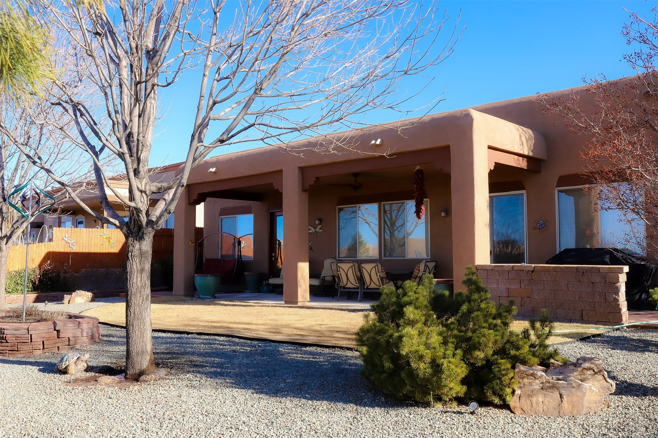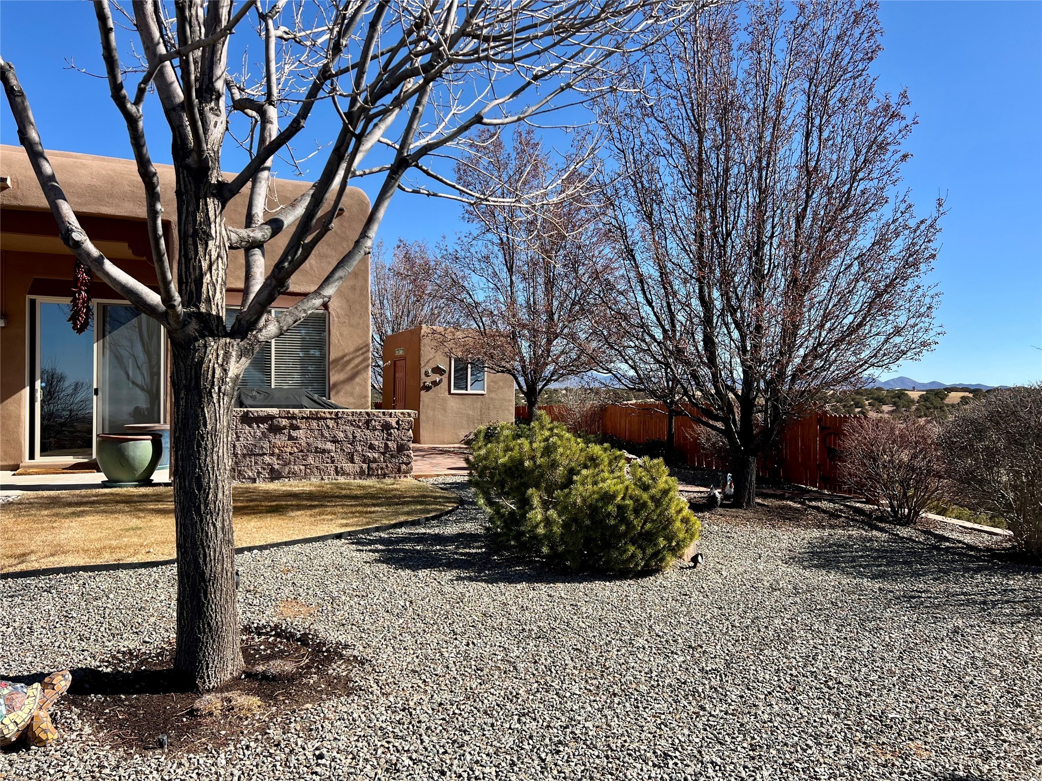 Nestled in a quiet cul-de-sac with no neighbors on the west or south sides, this charming and meticulously maintained home offers the perfect blend of privacy, comfort, and modern updates. Featuring three spacious bedrooms, two bathrooms, a dedicated office, and a generous two-car garage, this home's well-designed layout provides both functionality and warmth.The inviting living space is highlighted by beautiful vigas and soaring 10-foot ceilings, adding a touch of Southwestern elegance. Beautiful skylights throughout the home, a cozy fireplace completes the space, creating a warm and inviting atmosphere ideal for relaxation.Step outside to a beautifully landscaped backyard--a true gardener's dream! Thoughtfully designed with lush greenery and open space, this serene retreat offers breathtaking views and endless possibilities for outdoor enjoyment. The covered patio, complete with a ceiling fan, provides a cool and comfortable space to relax or entertain. Whether you're tending to your garden, unwinding in the shade, or hosting guests, this private oasis is the perfect place to soak in the natural beauty that surrounds you. A storage shed provides additional space for tools and outdoor essentials, ensuring everything has its place.Recent updates include fresh stucco on the west and south sides (completed in August/September 2024), a brand-new outdoor gate and fence enclosing the property, and new paint and plush carpeting (2023), all enhancing the home's fresh and welcoming feel. Additional upgrades include a Trane HVAC system on the north side of the garage, as well as a newer water heater and furnace, both replaced approximately three to four years ago.