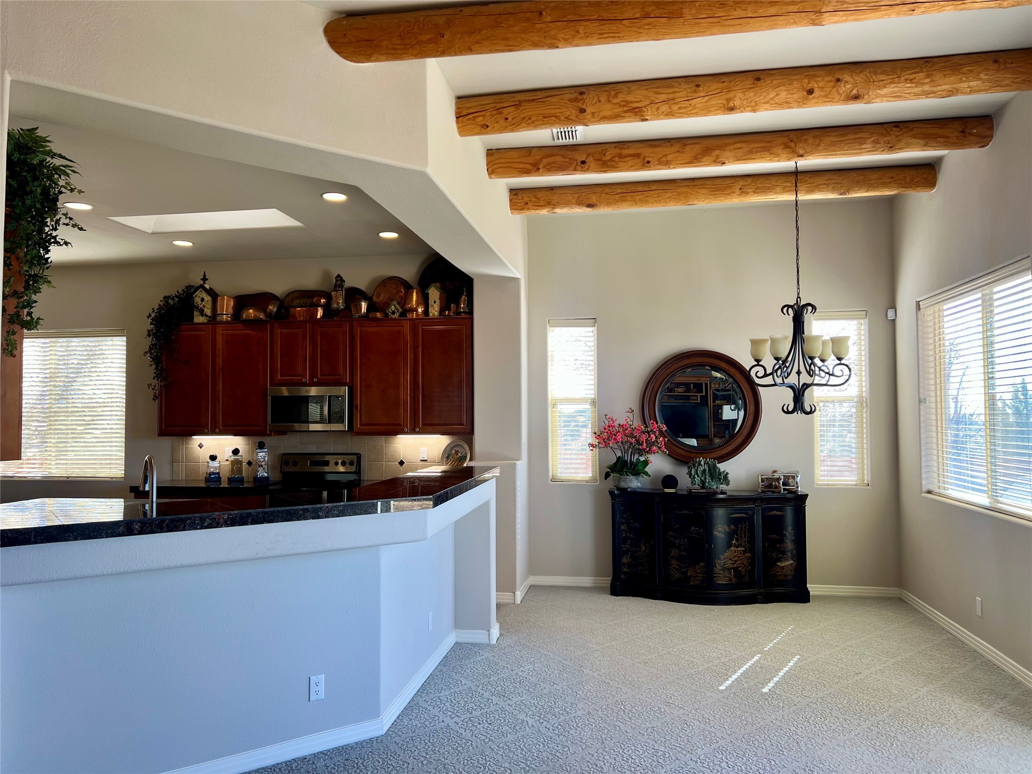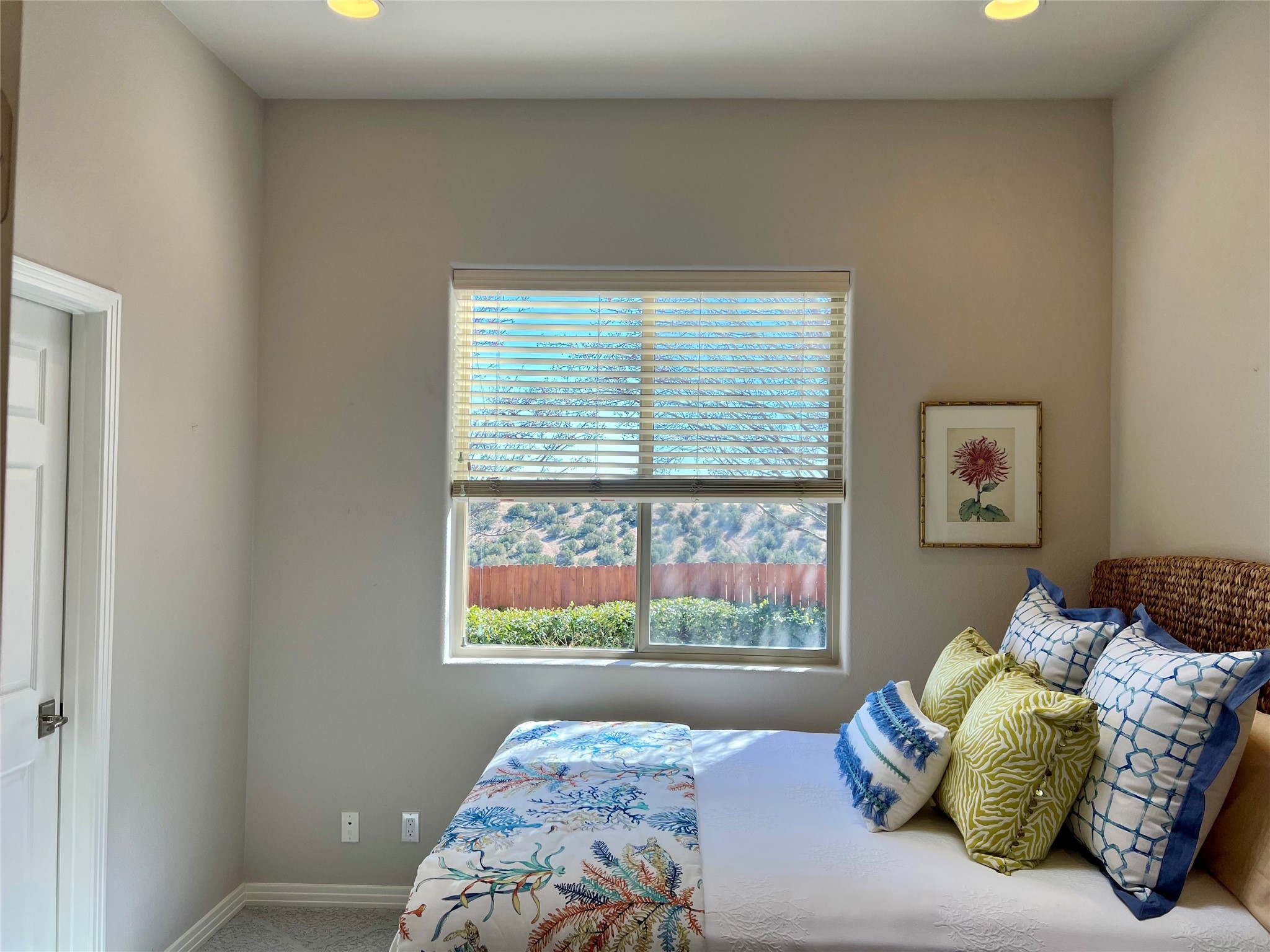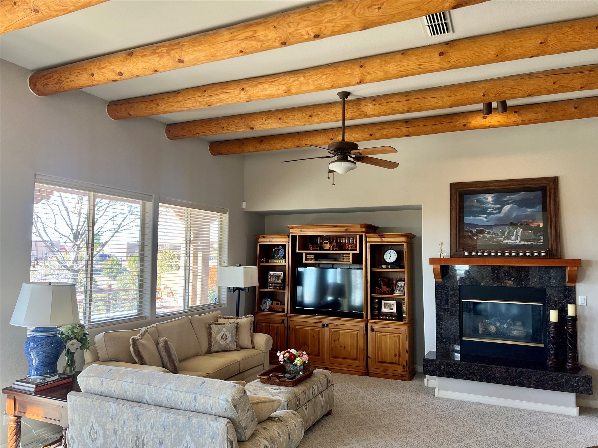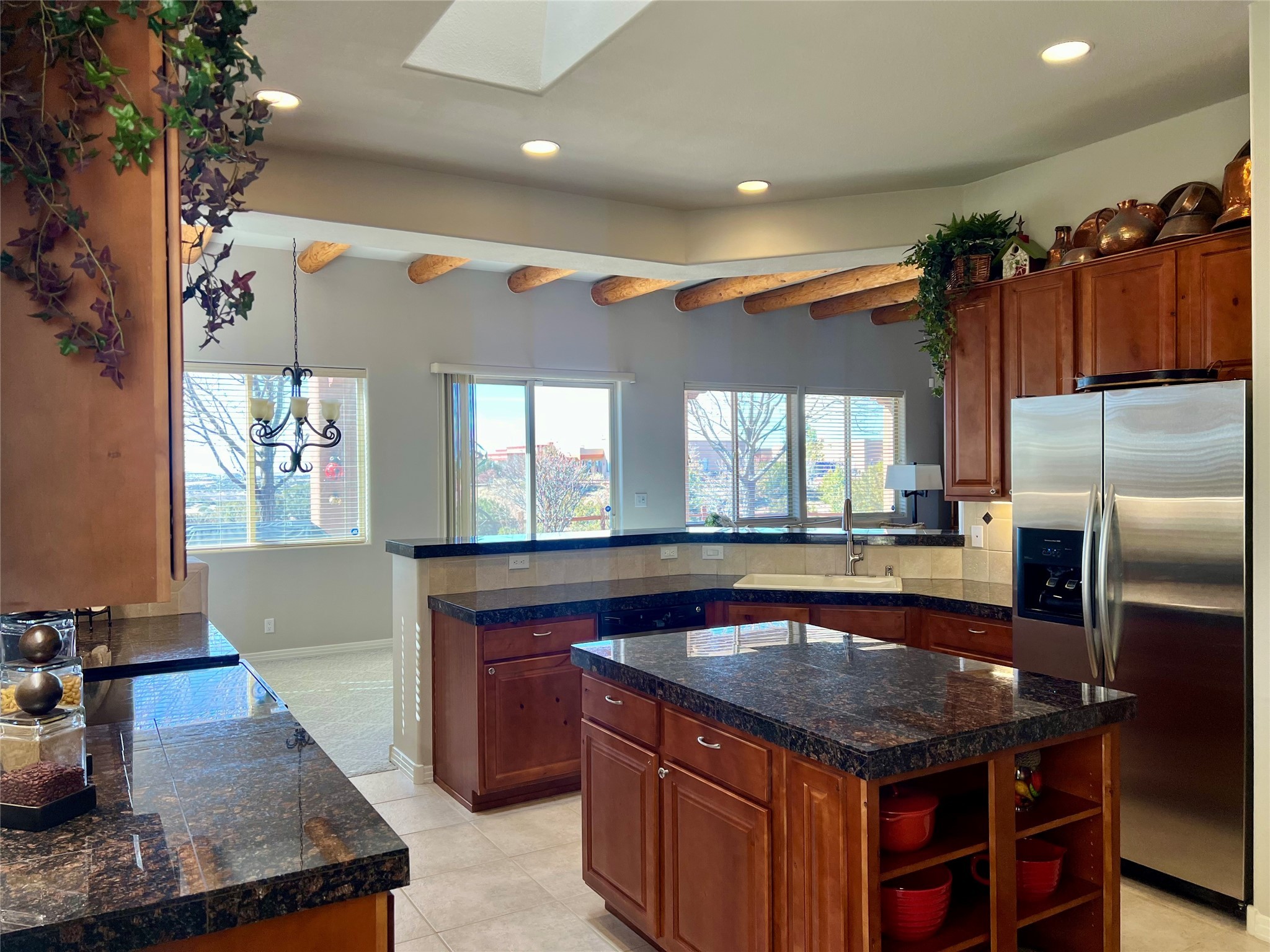 Nestled in a quiet cul-de-sac with no neighbors on the west or south sides, this charming and meticulously maintained home offers the perfect blend of privacy, comfort, and modern updates. Featuring three spacious bedrooms, two bathrooms, a dedicated office, and a generous two-car garage, this home's well-designed layout provides both functionality and warmth.The inviting living space is highlighted by beautiful vigas and soaring 10-foot ceilings, adding a touch of Southwestern elegance. Beautiful skylights throughout the home, a cozy fireplace completes the space, creating a warm and inviting atmosphere ideal for relaxation.Step outside to a beautifully landscaped backyard--a true gardener's dream! Thoughtfully designed with lush greenery and open space, this serene retreat offers breathtaking views and endless possibilities for outdoor enjoyment. The covered patio, complete with a ceiling fan, provides a cool and comfortable space to relax or entertain. Whether you're tending to your garden, unwinding in the shade, or hosting guests, this private oasis is the perfect place to soak in the natural beauty that surrounds you. A storage shed provides additional space for tools and outdoor essentials, ensuring everything has its place.Recent updates include fresh stucco on the west and south sides (completed in August/September 2024), a brand-new outdoor gate and fence enclosing the property, and new paint and plush carpeting (2023), all enhancing the home's fresh and welcoming feel. Additional upgrades include a Trane HVAC system on the north side of the garage, as well as a newer water heater and furnace, both replaced approximately three to four years ago.