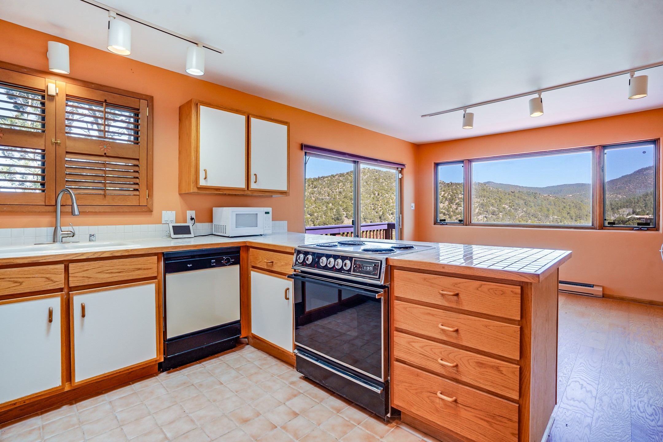 CASA SUNNA LUNA. Nestled just minutes off of the historic Old Santa Fe Trail and only 15 minutes from the heart of downtown Santa Fe, this adobe estate captures the essence of classic Southwestern elegance and modern comfort. Set on 5-acres, the property offers total privacy and breathtaking panoramic vistas of the Jemez Mountains and Santa Fe city lights.The main residence features a grand living and entertaining space adorned with multiple cozy kiva fireplaces, high viga accented ceilings, brick floors, iron work, colorful floral wall motifs, and traditional craftsmanship. Many recent practical improvements to the roof, exterior, and systems have also been made.Four spacious bedrooms make this a comfortable retreat for full-time living or hosting of guests. Not to be missed is the spacious, upstairs artist's retreat with panoramic views - the perfect place to paint, work, write, and create! The primary suite is private and appointed with a large ensuite bathroom, access to the enclosed in-ground spa, patio access, and sweeping sightlines across the high desert landscape. The grounds are equally serene with water features and fountains, multiple garden beds, and private patio enclaves. A long western-facing, covered portal, spanning the length of the main living room is the perfect outdoor extension to the main home's grand indoor living. A detached 1BD-1BA guest house, with its own garage, offers privacy and comfort for visitors, family or invites the potential for rental generating income. Whether you're soaking in the golden hour light from one of the many outdoor living spaces or relaxing by one of the property's four fireplaces, this one-of-a-kind property offers an unparalleled canvas equipped with undeniable tranquility, vistas and convenience to Santa Fe's exquisite destinations.