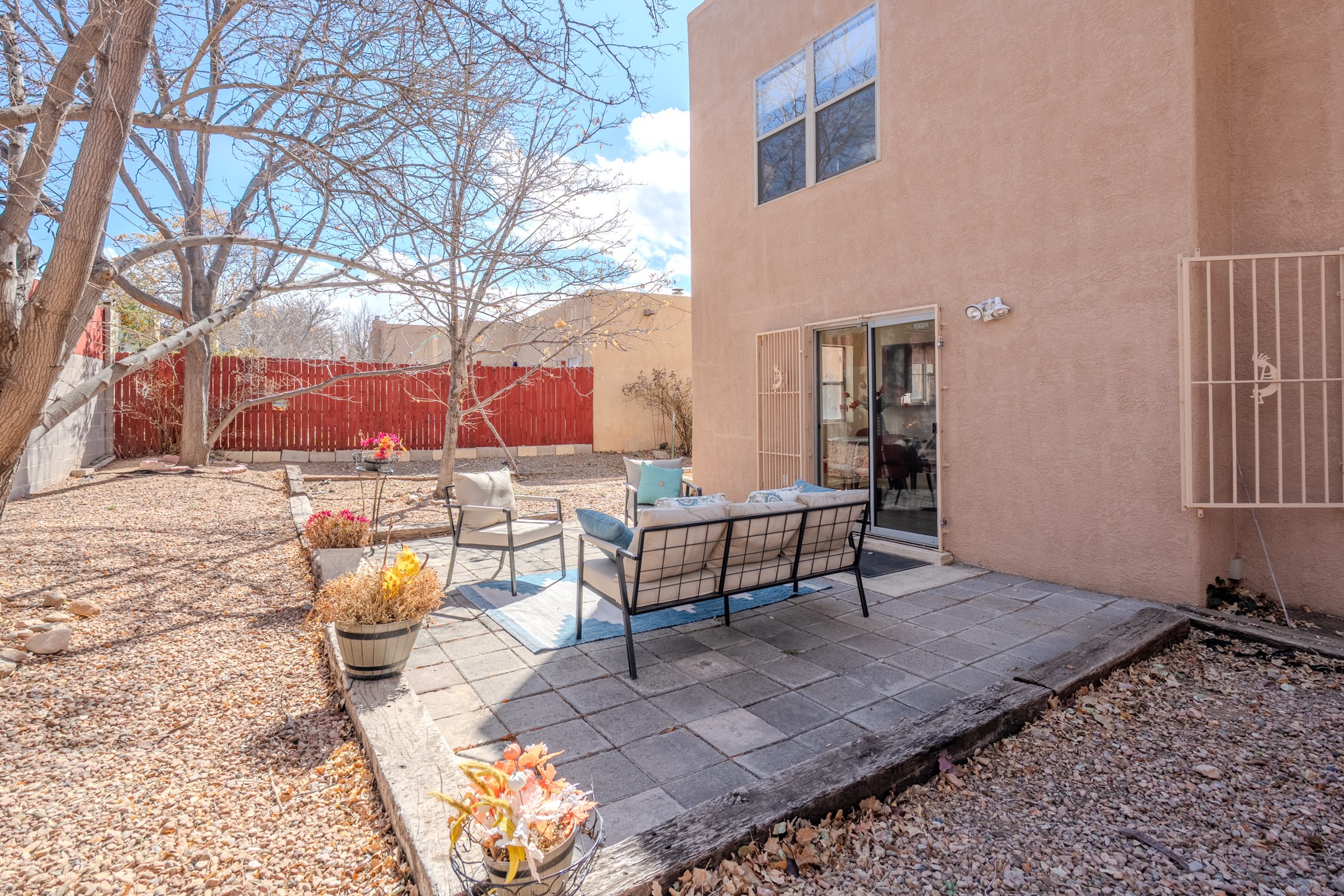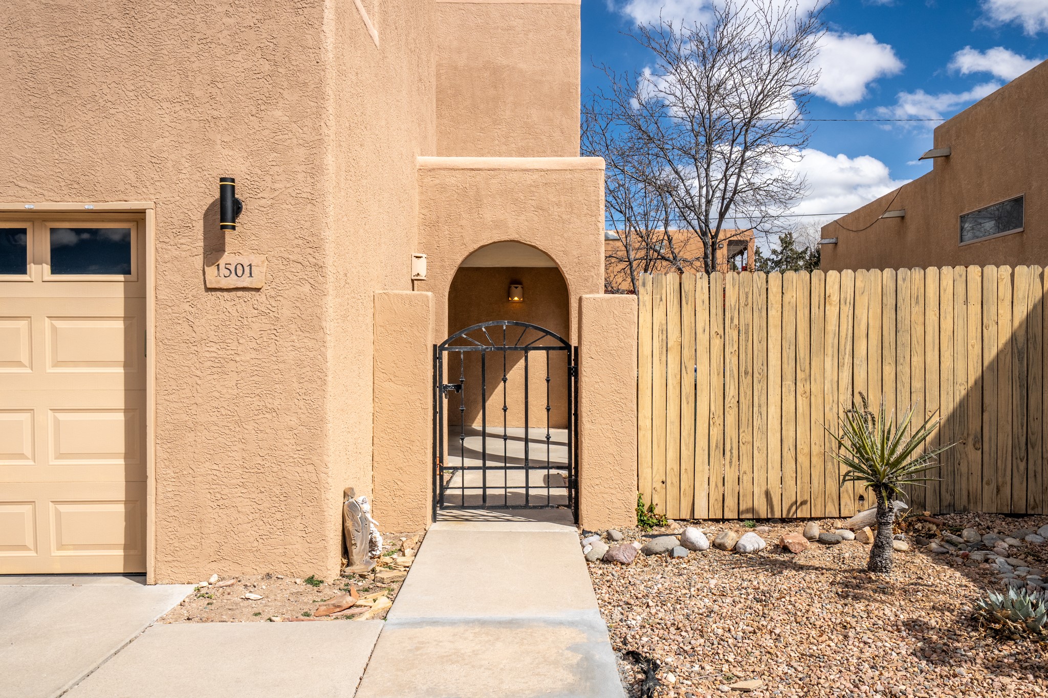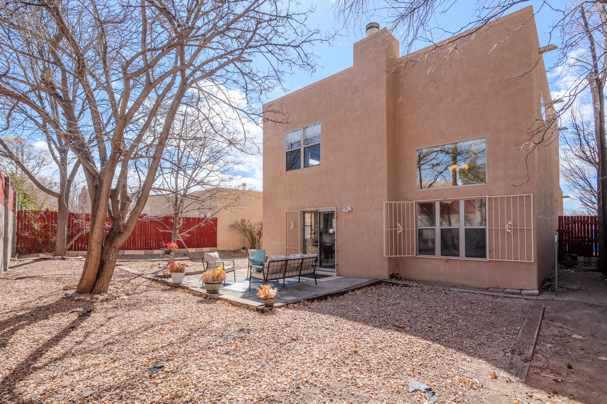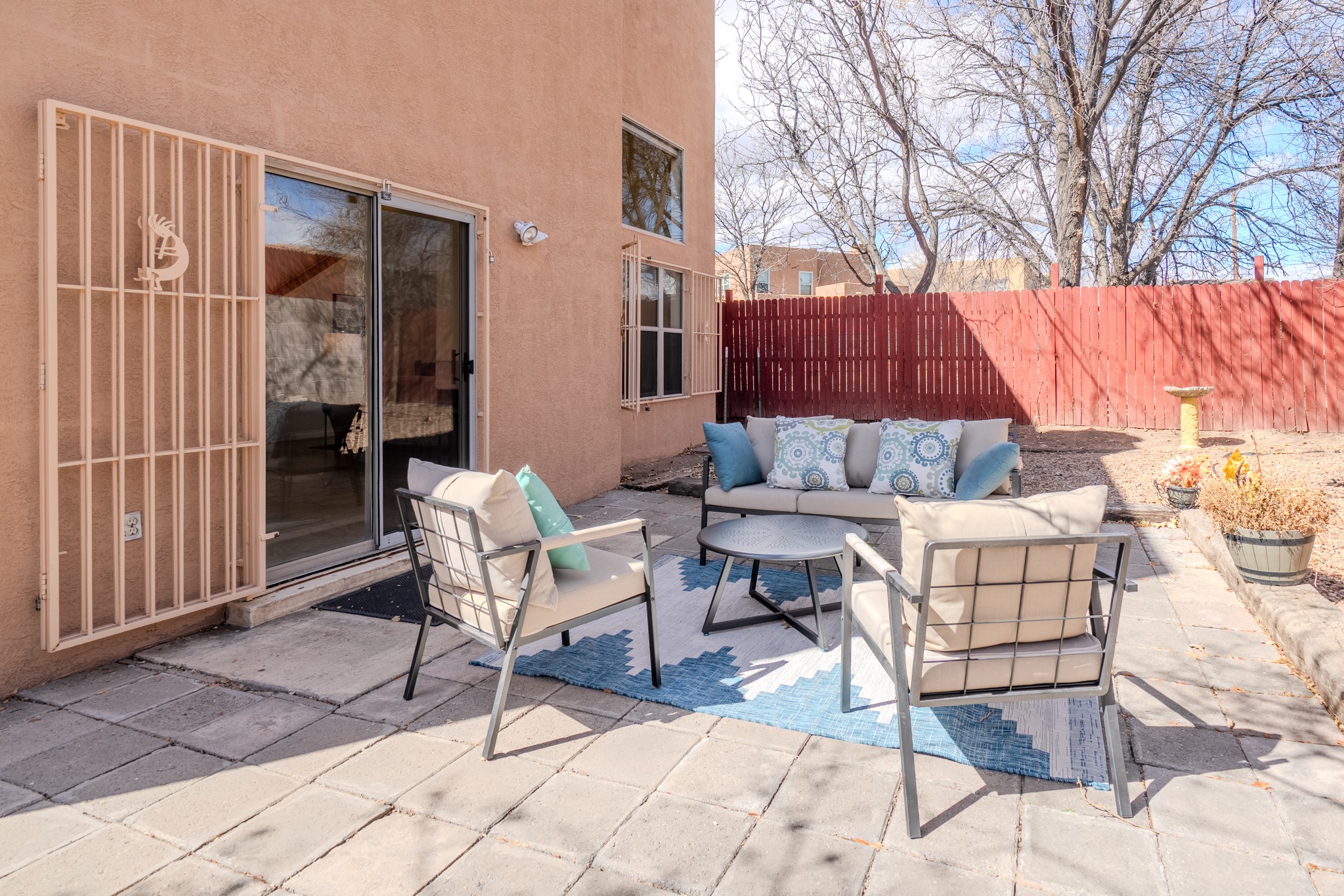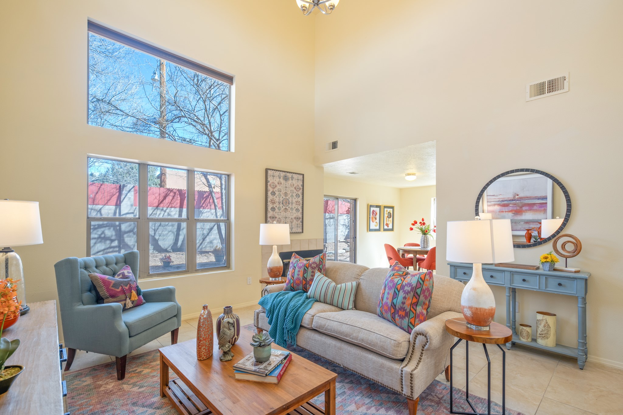 Priced $41,000 below appraisal and pre-inspected, this beautifully updated, light, and bright 3-bedroom, 2.5-bathroom home is situated on a quiet cul-de-sac providing a peaceful and very private ambiance in the heart of central Santa Fe. The two-story design boasts an open and airy layout, accentuated by soaring ceilings in the living room, clearstory picture windows that flood the space with natural light, and a charming wood-burning fireplace. Central refrigerated air conditioning and skylights throughout ensure year-round comfort and a welcoming atmosphere.The modernized kitchen shines with elegant granite countertops and stainless steel appliances complementing the home's contemporary feel. The updated bathrooms feature tasteful finishes that add a touch of luxury. The master suite is a serene retreat, complete with an ensuite bathroom and a generously sized walk-in closet, providing ample storage and privacy.Outdoor living is a delight with a fully enclosed, gated courtyard and an expansive yard shaded by lovely mature trees, offering both privacy and beautiful green screening during the warmer months. The patio area is ideal for outdoor entertaining or simply relaxing in the tranquil surroundings. Adding to the sense of seclusion, an unbuildable lot next door enhances the privacy and provides additional space.Practicality meets convenience with an attached 2-car garage and no HOA fees. Centrally located, this home is just minutes from shopping, parks, restaurants, fitness centers, and schools, making it an ideal spot for easy, everyday living. This stunning Santa Fe home offers a rare combination of modern updates, spacious design, and an unbeatable location.