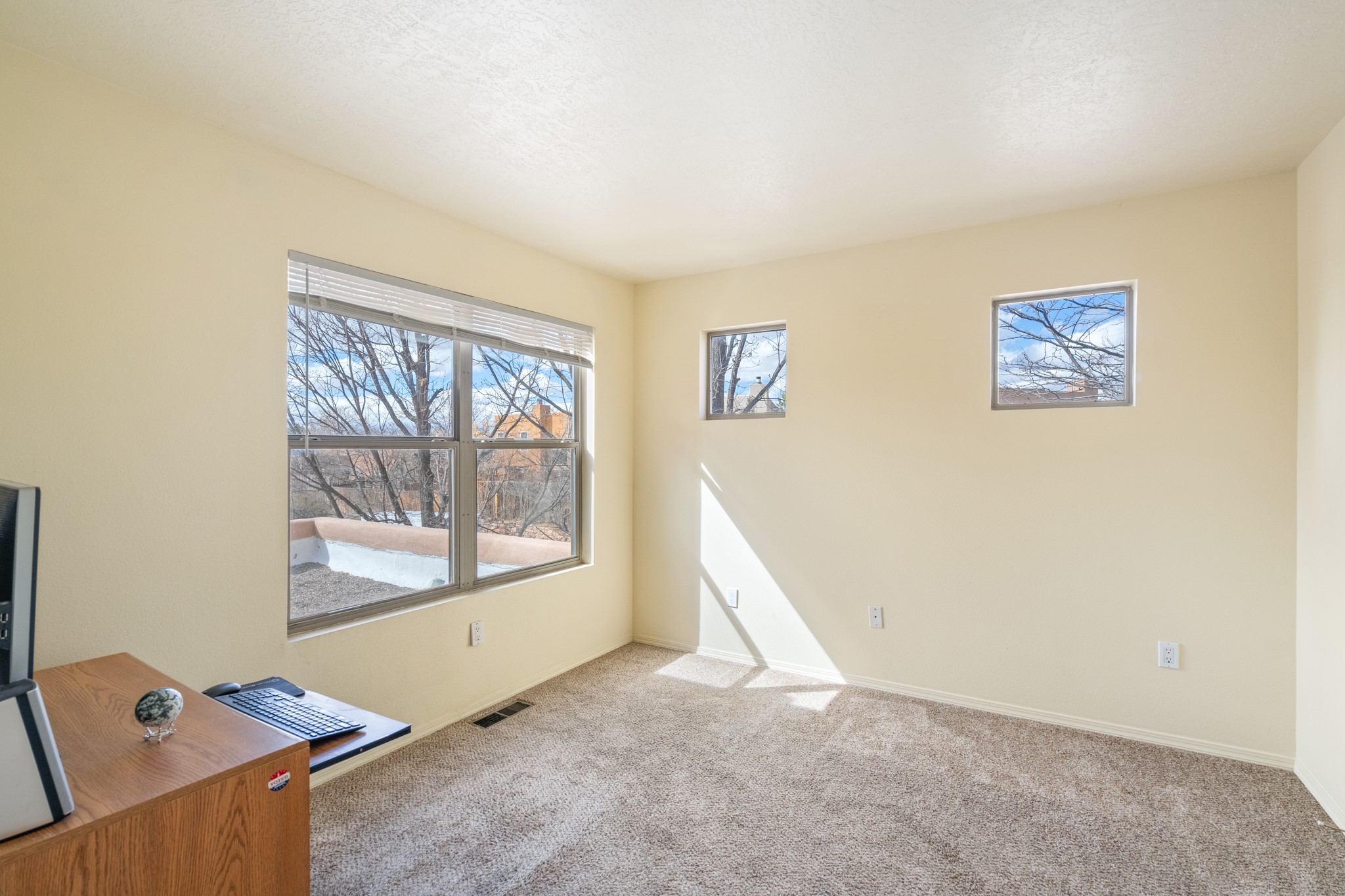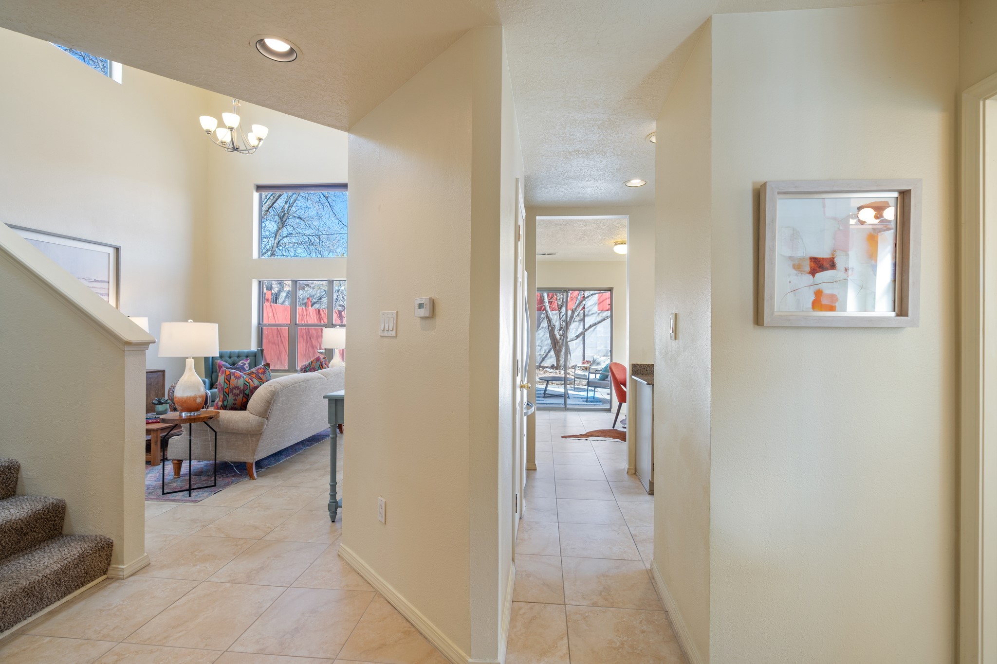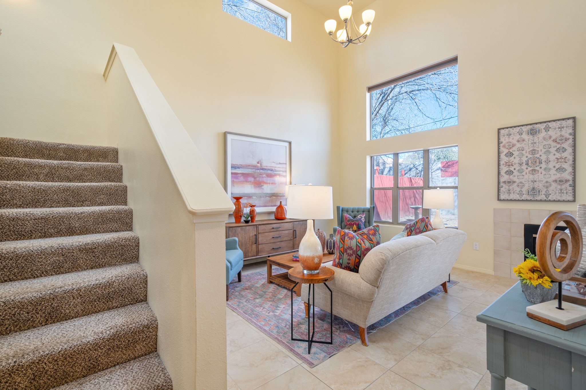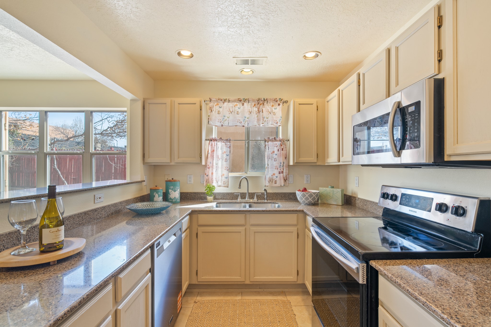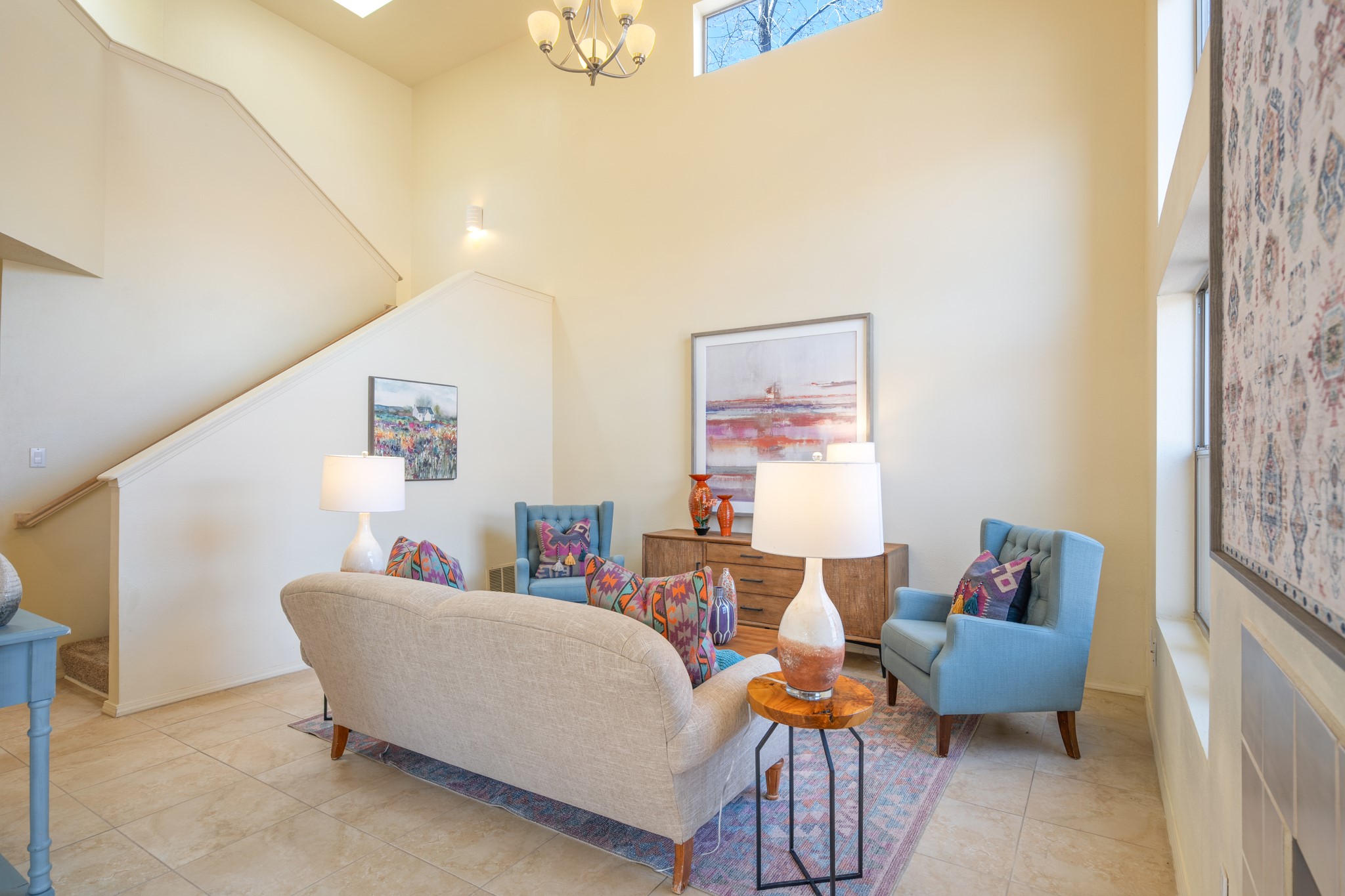 Priced $41,000 below appraisal and pre-inspected, this beautifully updated, light, and bright 3-bedroom, 2.5-bathroom home is situated on a quiet cul-de-sac providing a peaceful and very private ambiance in the heart of central Santa Fe. The two-story design boasts an open and airy layout, accentuated by soaring ceilings in the living room, clearstory picture windows that flood the space with natural light, and a charming wood-burning fireplace. Central refrigerated air conditioning and skylights throughout ensure year-round comfort and a welcoming atmosphere.The modernized kitchen shines with elegant granite countertops and stainless steel appliances complementing the home's contemporary feel. The updated bathrooms feature tasteful finishes that add a touch of luxury. The master suite is a serene retreat, complete with an ensuite bathroom and a generously sized walk-in closet, providing ample storage and privacy.Outdoor living is a delight with a fully enclosed, gated courtyard and an expansive yard shaded by lovely mature trees, offering both privacy and beautiful green screening during the warmer months. The patio area is ideal for outdoor entertaining or simply relaxing in the tranquil surroundings. Adding to the sense of seclusion, an unbuildable lot next door enhances the privacy and provides additional space.Practicality meets convenience with an attached 2-car garage and no HOA fees. Centrally located, this home is just minutes from shopping, parks, restaurants, fitness centers, and schools, making it an ideal spot for easy, everyday living. This stunning Santa Fe home offers a rare combination of modern updates, spacious design, and an unbeatable location.