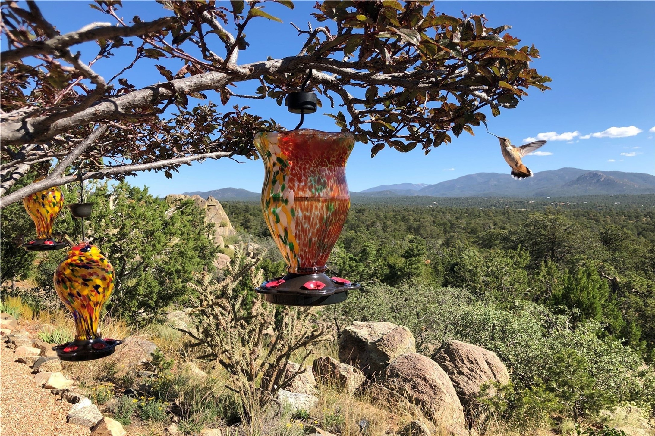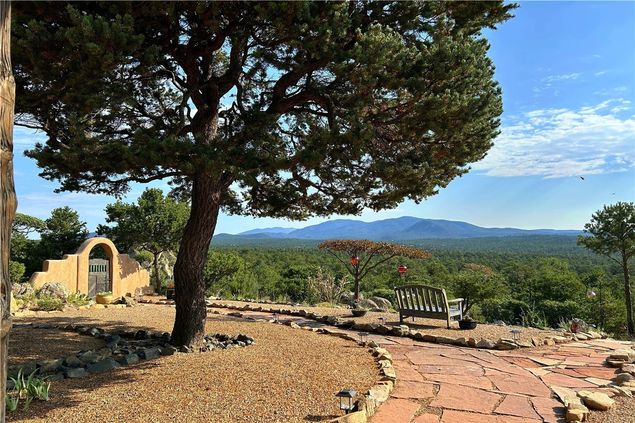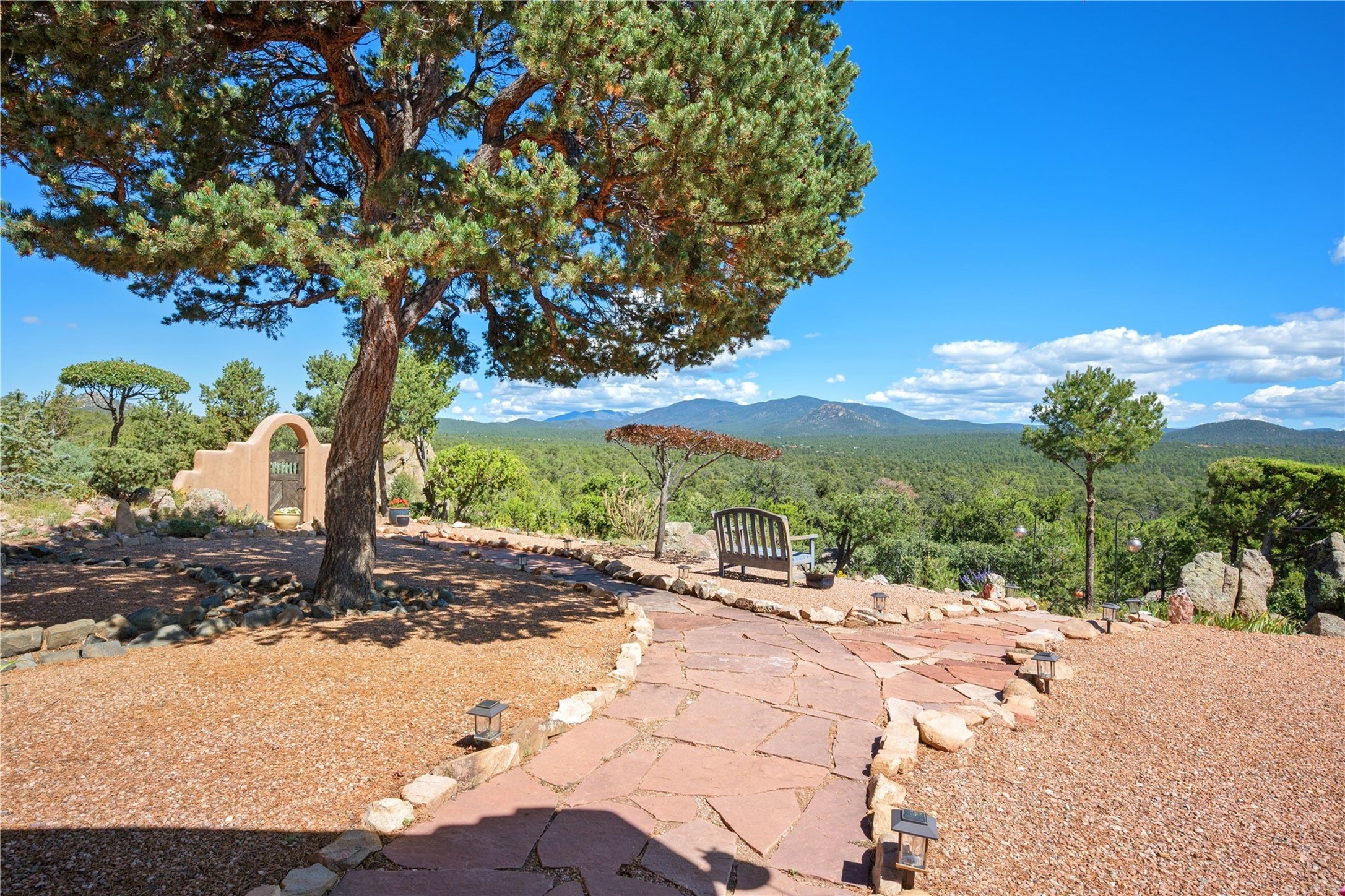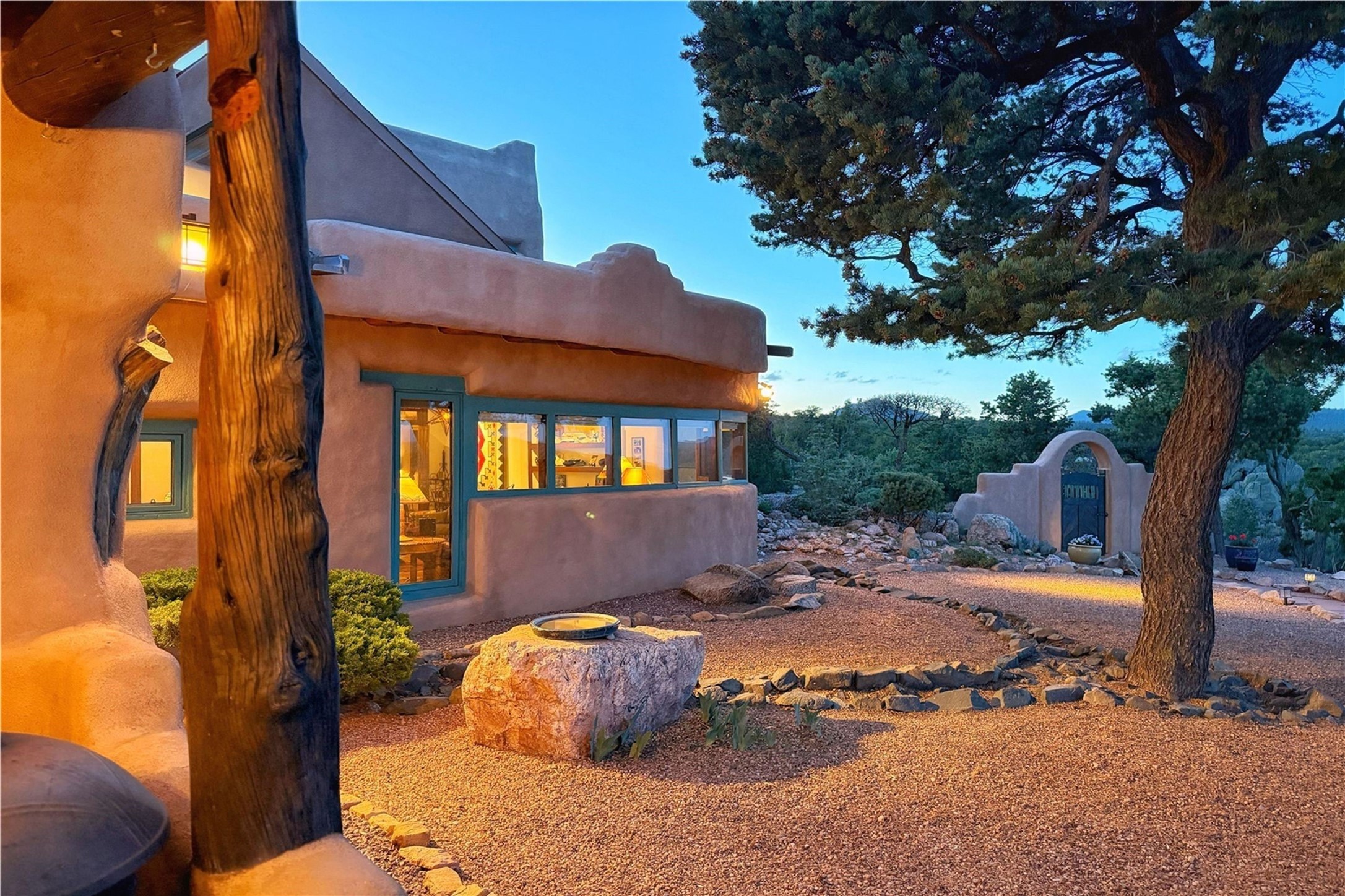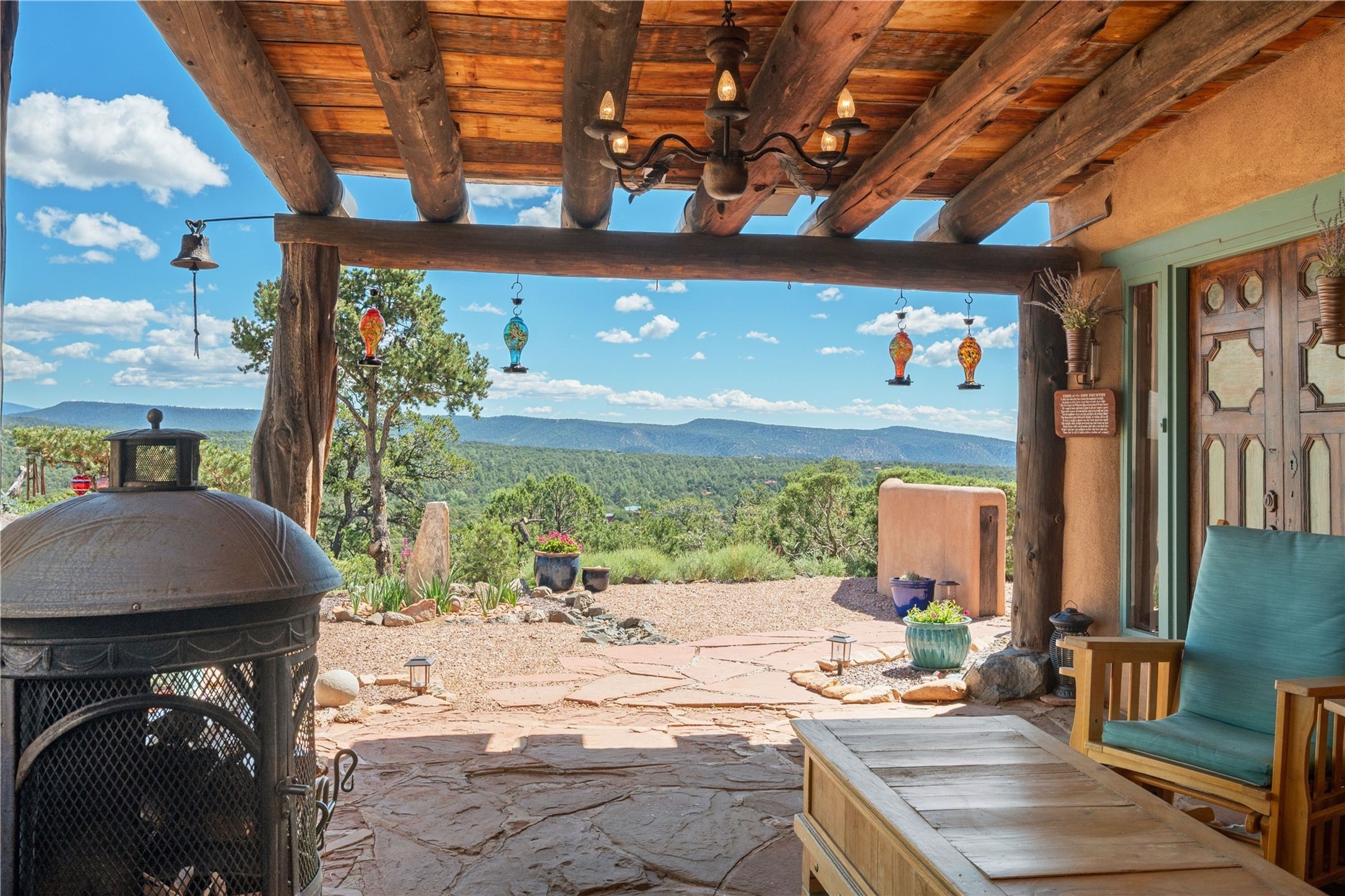 Discover a rare one-of-a-kind Hacienda w/ Studio on 6+ acres boasting dramatic rock outcroppings, sweeping views of Apache Ridge, Rowe Mesa and the Sangre de Cristos in a private pristine setting, just 20 minutes from the Santa Fe Plaza. Perched on a hillside to capture the breathtaking surroundings, this custom-built adobe Pueblo-style gem offers incredible craftsmanship, rounded architecture and unparalleled custom artisan touches. Soaring ceilings w/massive wood vigas throughout, exquisite Saltillo tile, cherry, hardwood and brick floors, rounded art walls curved arches, heavy antique carved doors, a walnut staircase, built-in bancos, recessed nichos, multiple portals and skylights abound. The current owners have thoughtfully renovated the house to add a sense of grand luxury. An added 2-car garage w/custom cabinetry includes an attached studio w/private entry. Follow the path to a small hobbit house-like hideaway to enjoy the exhilarating mountain air and views. Another path leads to a 2-3 stall barn/workshop.The floorplan moves effortlessly between indoor and outdoor living to showcase the arresting views and superb landscaping. The primary suite boasts a private deck, adjoiningsitting room w/curved window walls, custom closets, one cedar lined, a spa-like bath w/giant jetted soaking tub and private courtyard. The kitchen highlights rich cherryvcabinetry, wood-burning stove and opens to a spacious dining room w/patio. Rounded architecture flows seamlessly into the living room w/panoramic bays of passive-solar windows, bancos, a large Kiva wood-burning fireplace, and main portal access.Other spaces include an office, spacious media/family room, two additional bedrooms, one w/private entry and patio, a mudroom, plus a versatile flex room, ideal for an overflowbedroom. This home is truly an architectural wonder to experience. With its incredible craftsmanship, artisan details and never-ending vistas, 8 Hampton Road marries luxury w/privacy and historic charm.