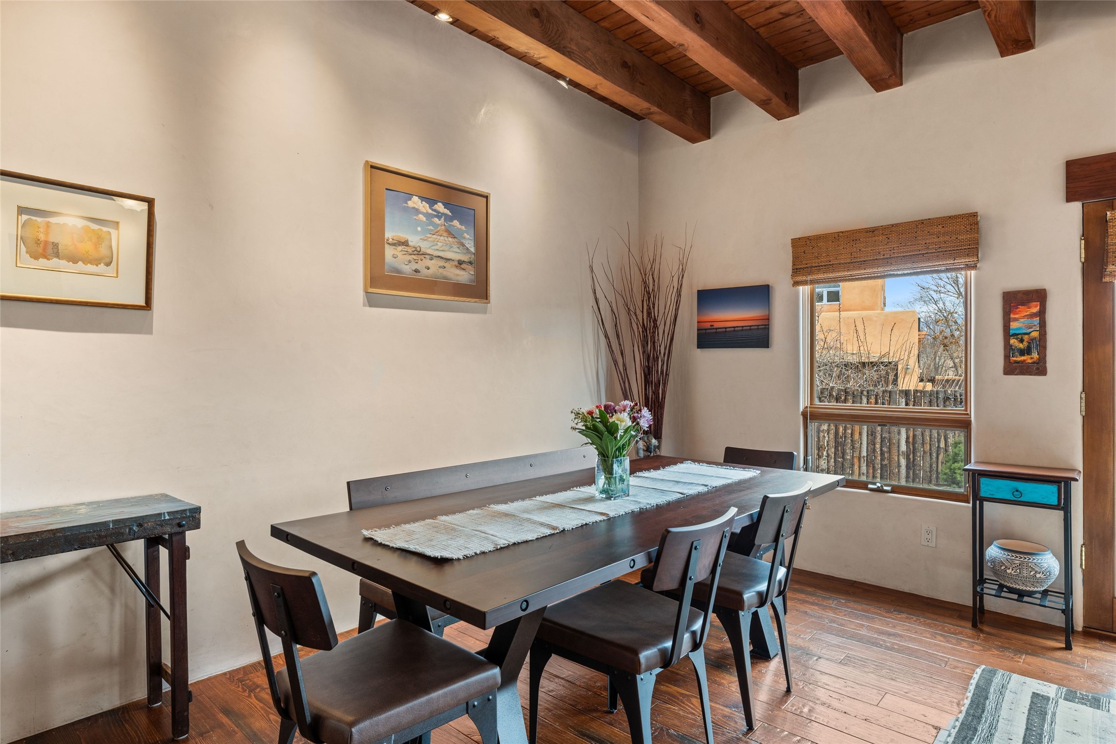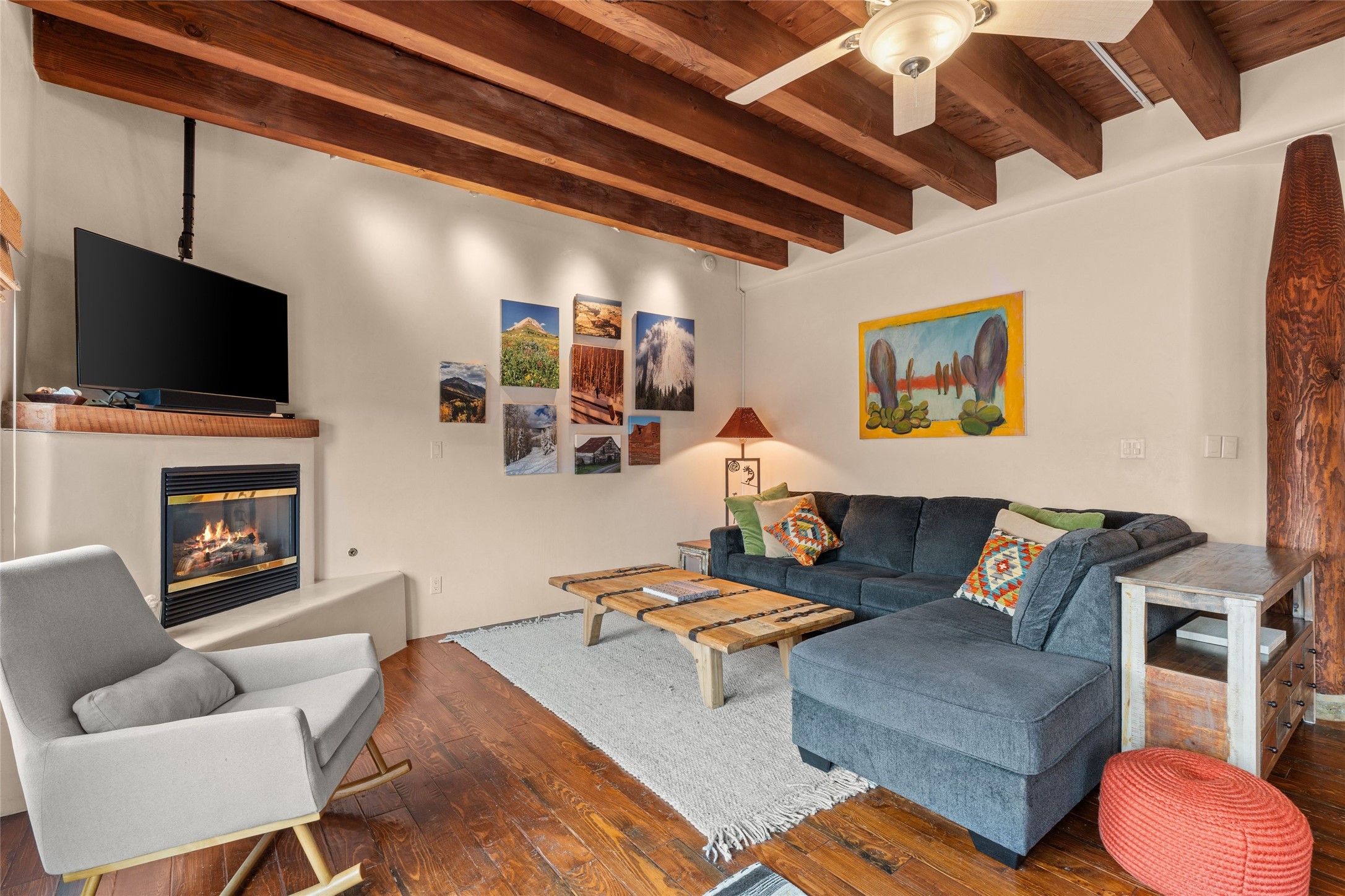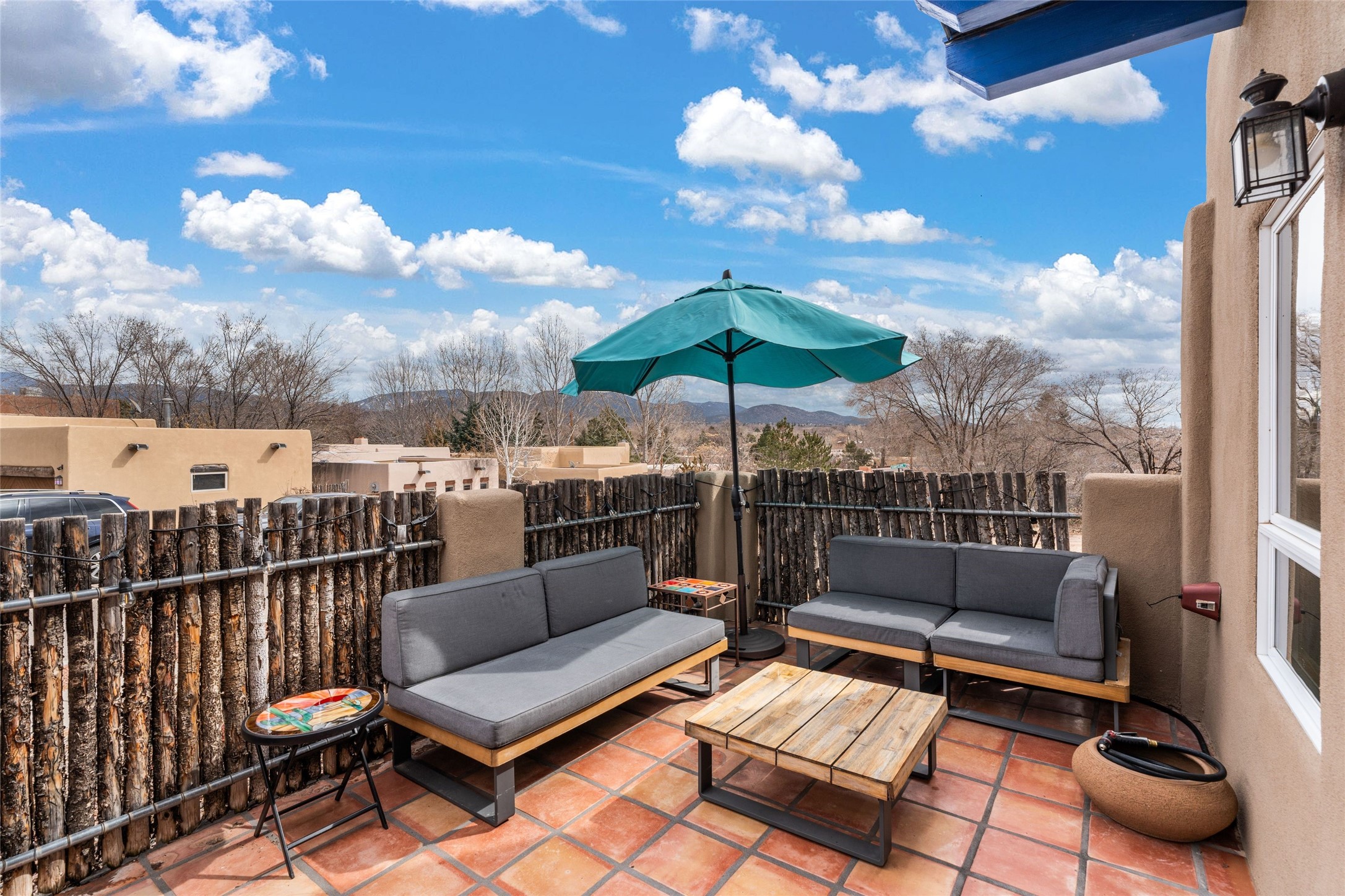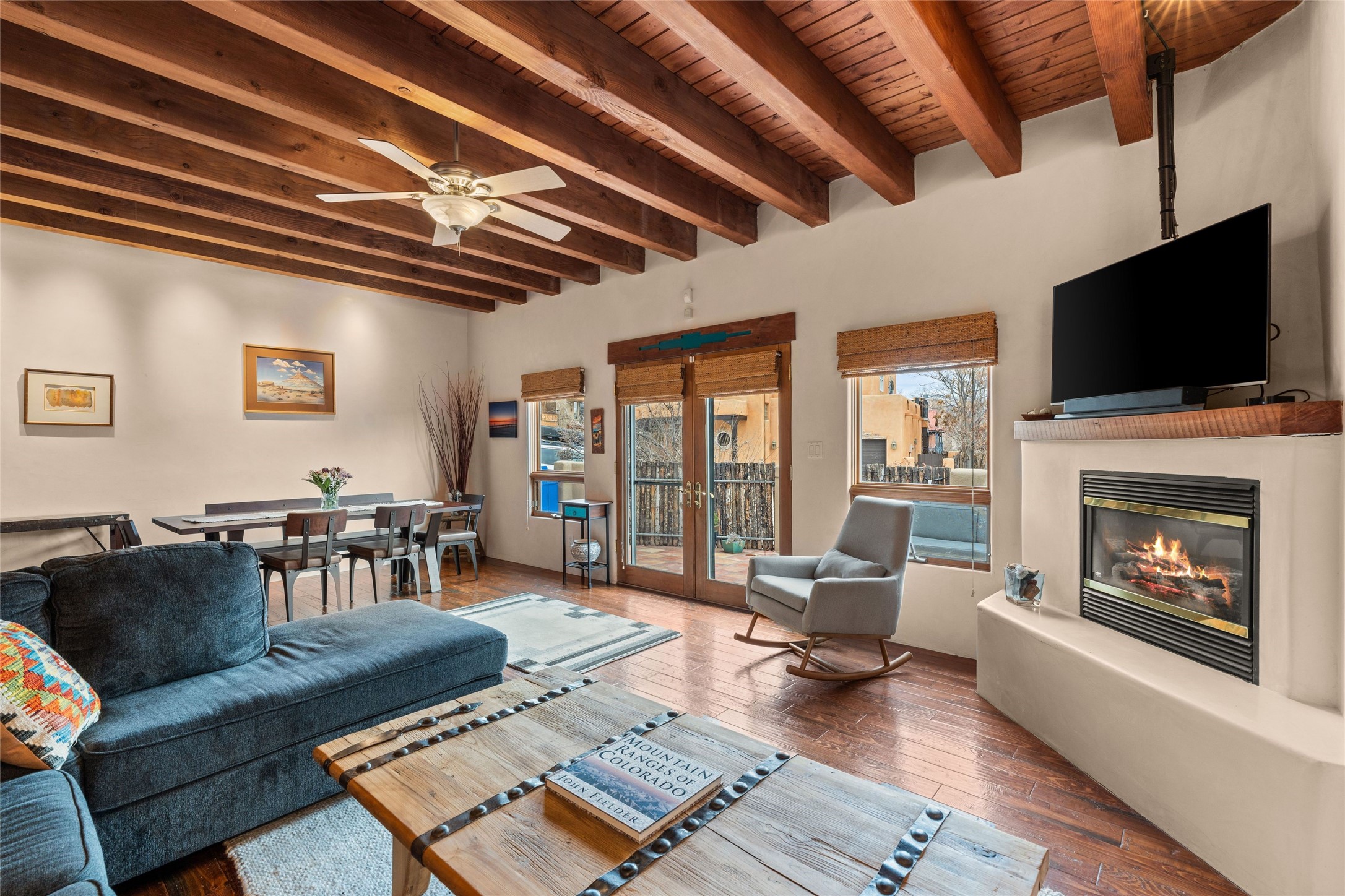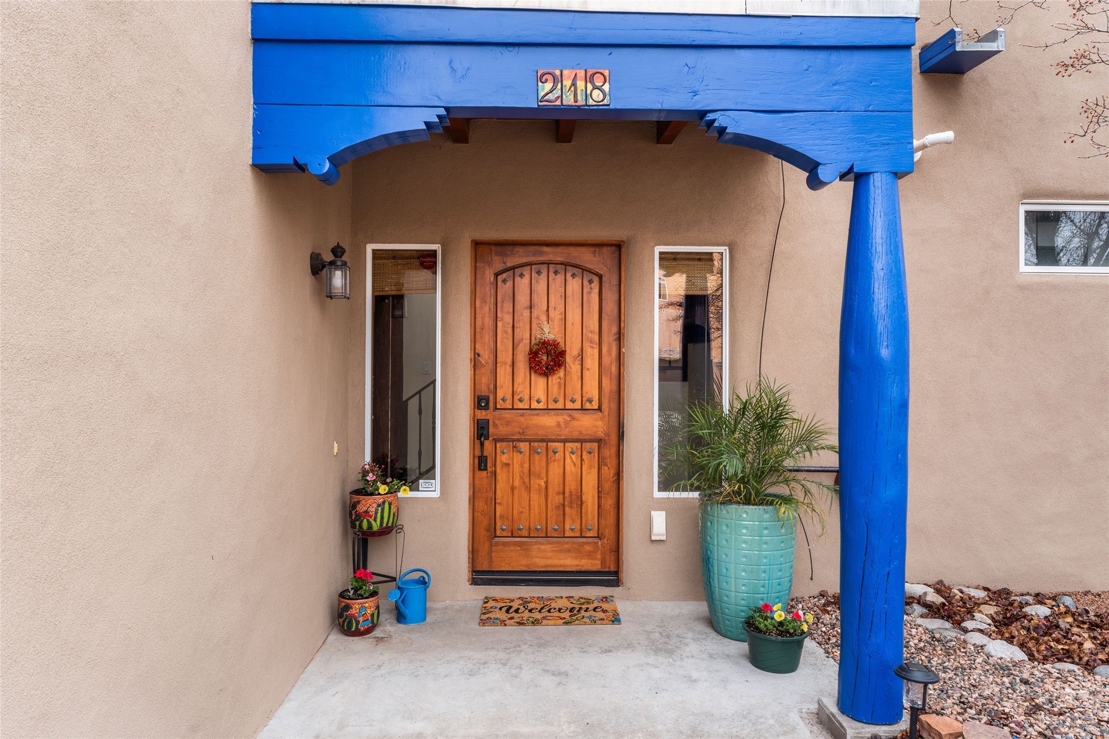 Move-in ready, located in a prime in-town neighborhood, as sited with mountain views: 218 Calle Roble is a gem and an incredible value. This 2,423 square foot, 4-bedroom, 3-bathroom home in the Casa Solana neighborhood is warm, inviting, and in excellent condition. With two levels, the first floor welcomes one into an open-concept kitchen and living area with high-beamed ceilings, wood floors, and a cozy gas fireplace. Off the open entertaining space is a flexible bedroom or office space and a three-quarter bath. Upstairs, hosts a generous primary bedroom with large windows framing the Sangre de Cristo Mountains. One can see the lights of the snow groomers at Ski Santa Fe as they settle down for the night. Two additional guest bedrooms and a shared bath complete the upper level. The outdoor spaces are low maintenance and incredibly functional comprising an elevated balcony, a cozy dining courtyard off the living room, and a fenced in dog run or garden area in the back. The location is unbeatable: just minutes from Santa Fe Plaza; walking distance to the restaurants, cafe, grocery store, yoga center, and brewery at the Solana Center; nearby to the Frank Ortiz dog park and the La Tierra trail system; not to mention access to the Casa Solana community pool. This is true urban living with a Santa Fe flair. With a six year old roof still under warranty (with Santa Fe Stucco and Roofing) and a combi-boiler and stucco that are only three years old, this home asks nothing of the new owner except to move in and enjoy.