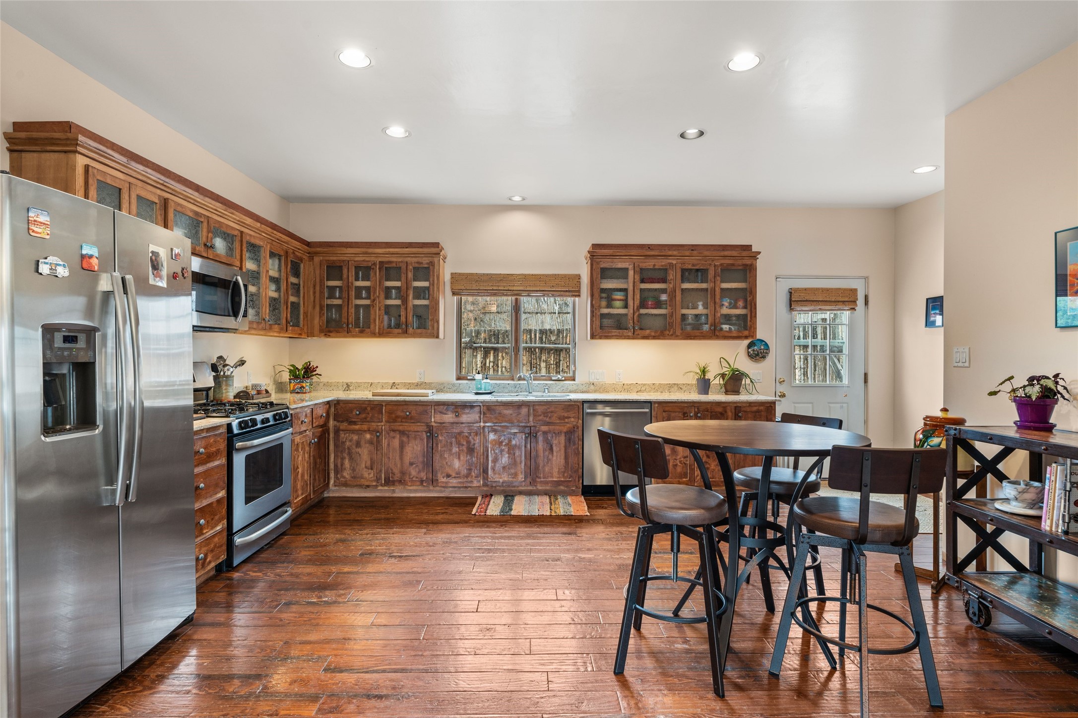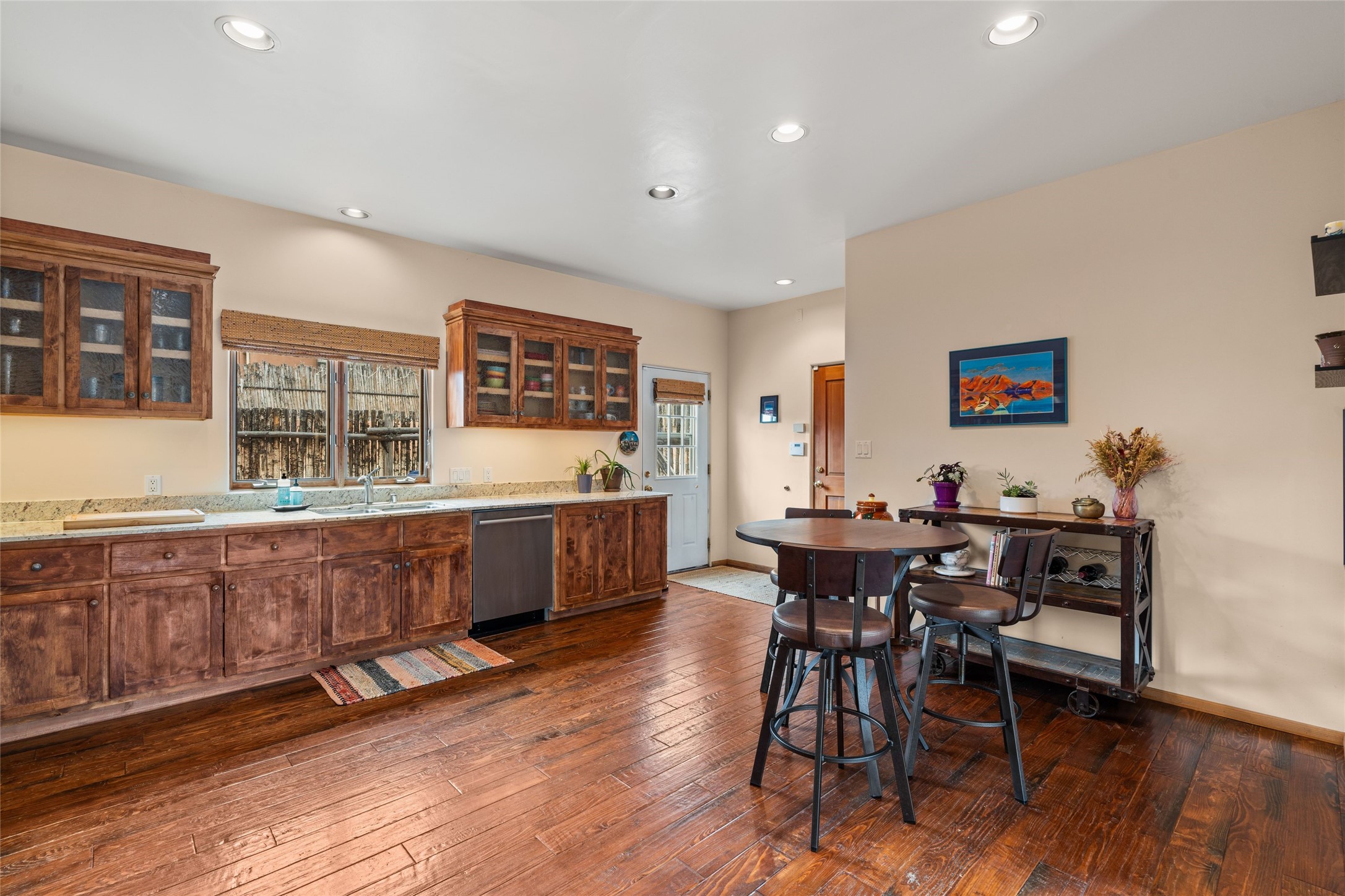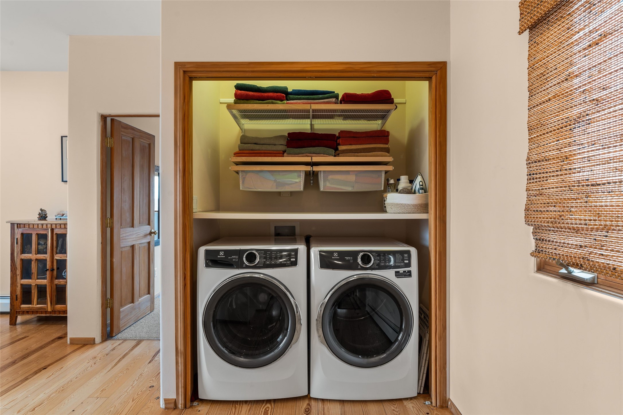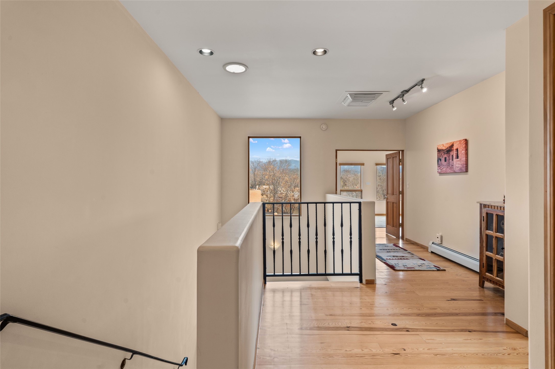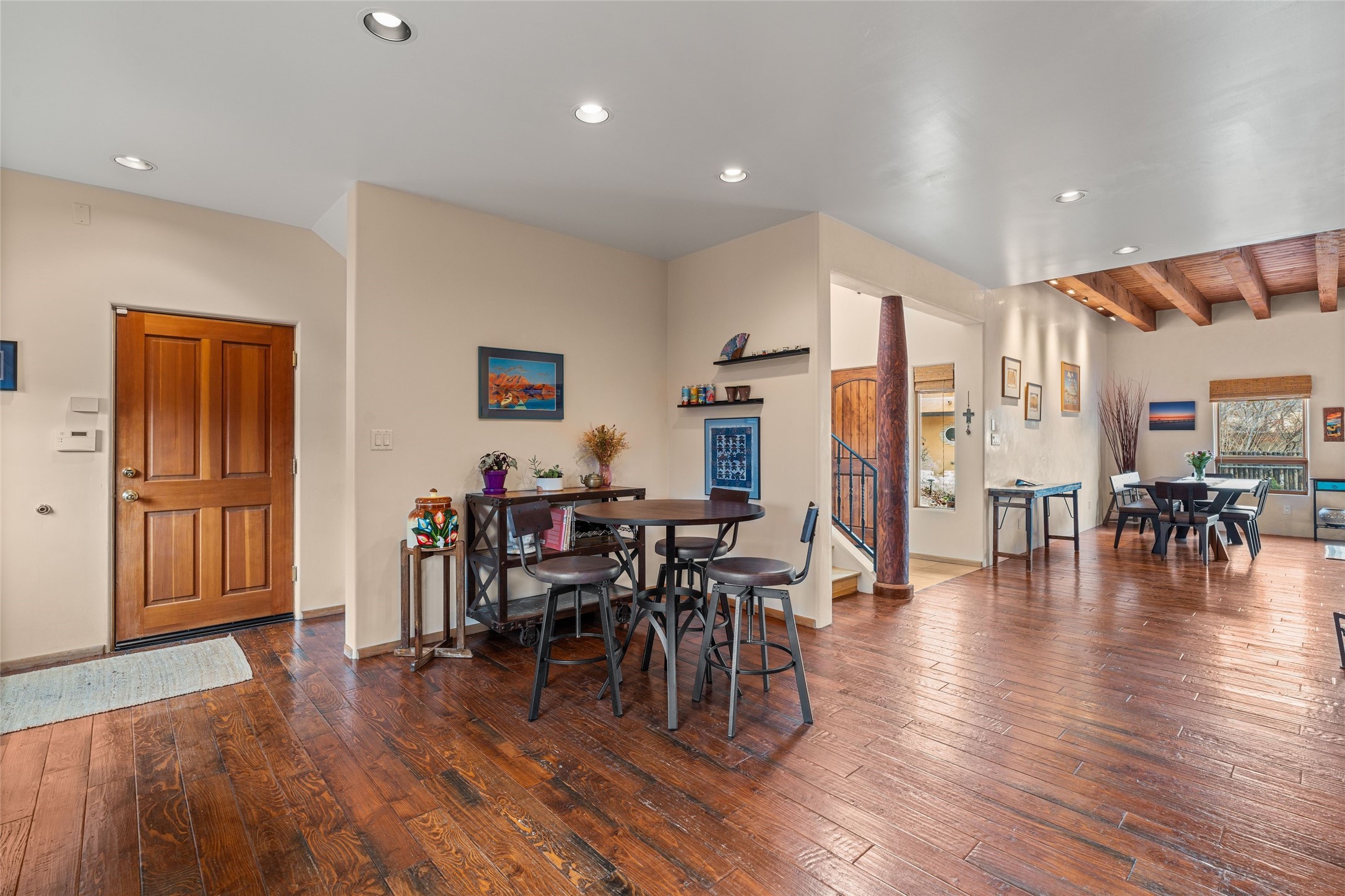 Move-in ready, located in a prime in-town neighborhood, as sited with mountain views: 218 Calle Roble is a gem and an incredible value. This 2,423 square foot, 4-bedroom, 3-bathroom home in the Casa Solana neighborhood is warm, inviting, and in excellent condition. With two levels, the first floor welcomes one into an open-concept kitchen and living area with high-beamed ceilings, wood floors, and a cozy gas fireplace. Off the open entertaining space is a flexible bedroom or office space and a three-quarter bath. Upstairs, hosts a generous primary bedroom with large windows framing the Sangre de Cristo Mountains. One can see the lights of the snow groomers at Ski Santa Fe as they settle down for the night. Two additional guest bedrooms and a shared bath complete the upper level. The outdoor spaces are low maintenance and incredibly functional comprising an elevated balcony, a cozy dining courtyard off the living room, and a fenced in dog run or garden area in the back. The location is unbeatable: just minutes from Santa Fe Plaza; walking distance to the restaurants, cafe, grocery store, yoga center, and brewery at the Solana Center; nearby to the Frank Ortiz dog park and the La Tierra trail system; not to mention access to the Casa Solana community pool. This is true urban living with a Santa Fe flair. With a six year old roof still under warranty (with Santa Fe Stucco and Roofing) and a combi-boiler and stucco that are only three years old, this home asks nothing of the new owner except to move in and enjoy.
