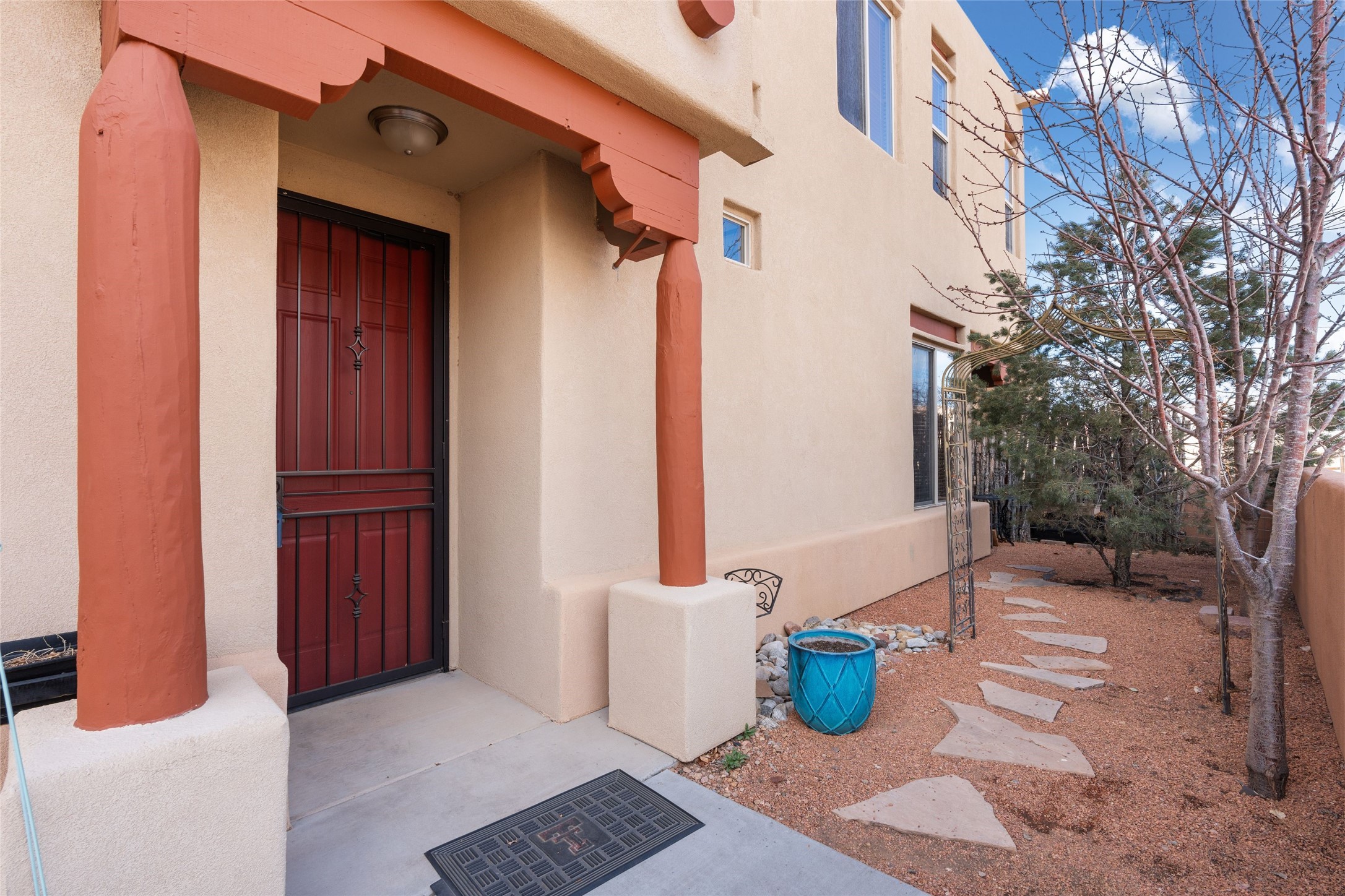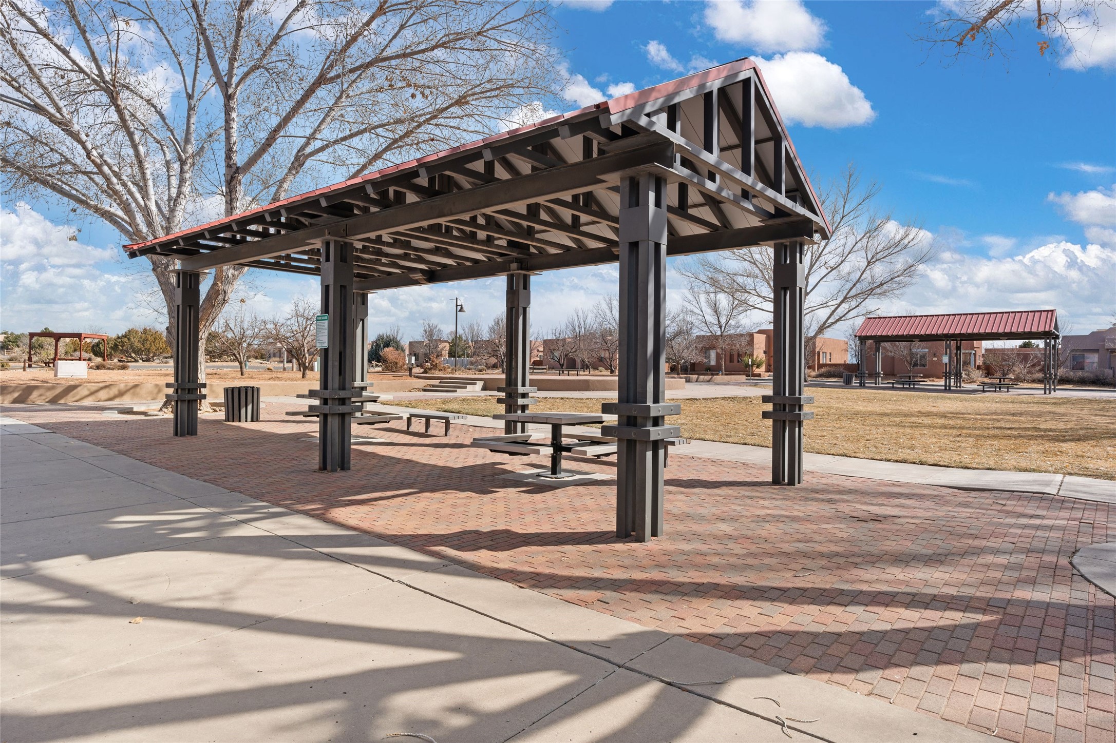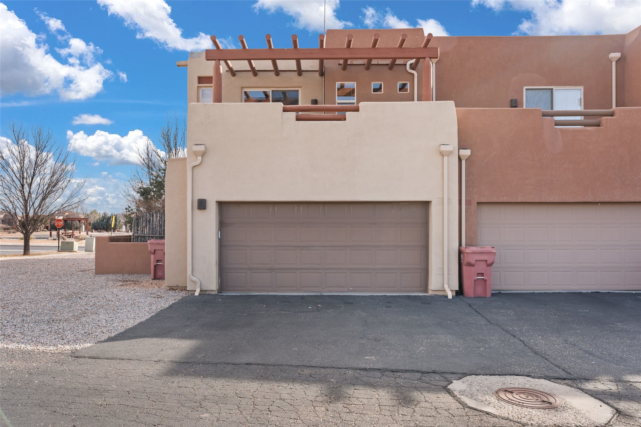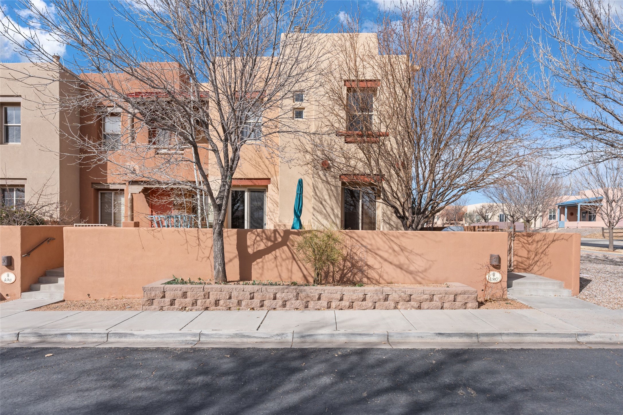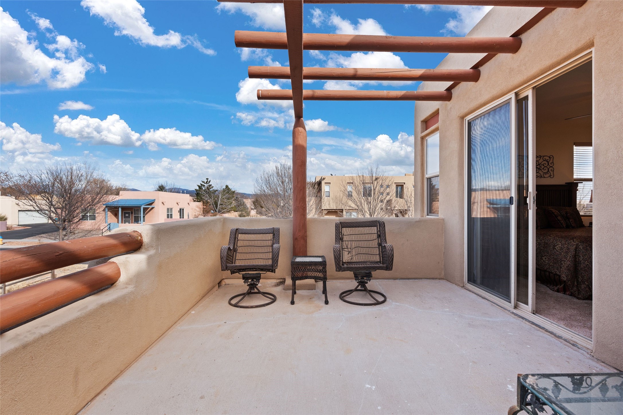 Premier townhome with great light and amazing views from upper deck. Three-bedroom home with three full baths. Prime location on the corner across from the park and close to walking trails. Open living and dining area with vaulted ceiling and vigas and corner kiva fireplace. Large doors out to the front allow enjoyment of the courtyard and outdoor space. Well-designed kitchen and bar space, good storage throughout the home. The primary bedroom upstairs with ensuite and large walk-in closet is separated from the second upstairs bedroom by a large landing area and office or sitting room space. Features a second story viewing deck is spacious and sunny and is the perfect place to view the wonderful Santa Fe sky. There is one bedroom downstairs with a full bath. Rear entry two-car garage and plenty of guest parking.