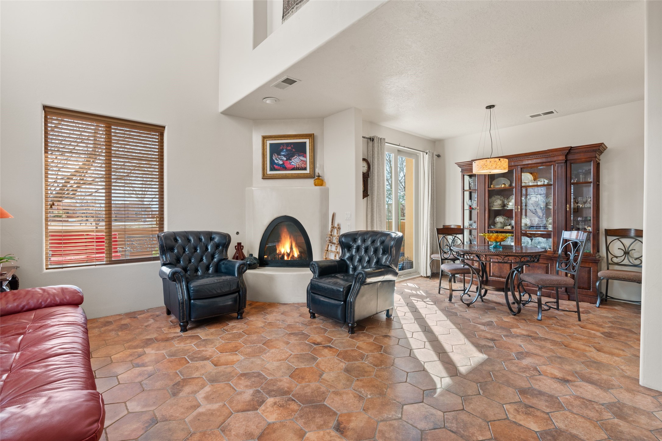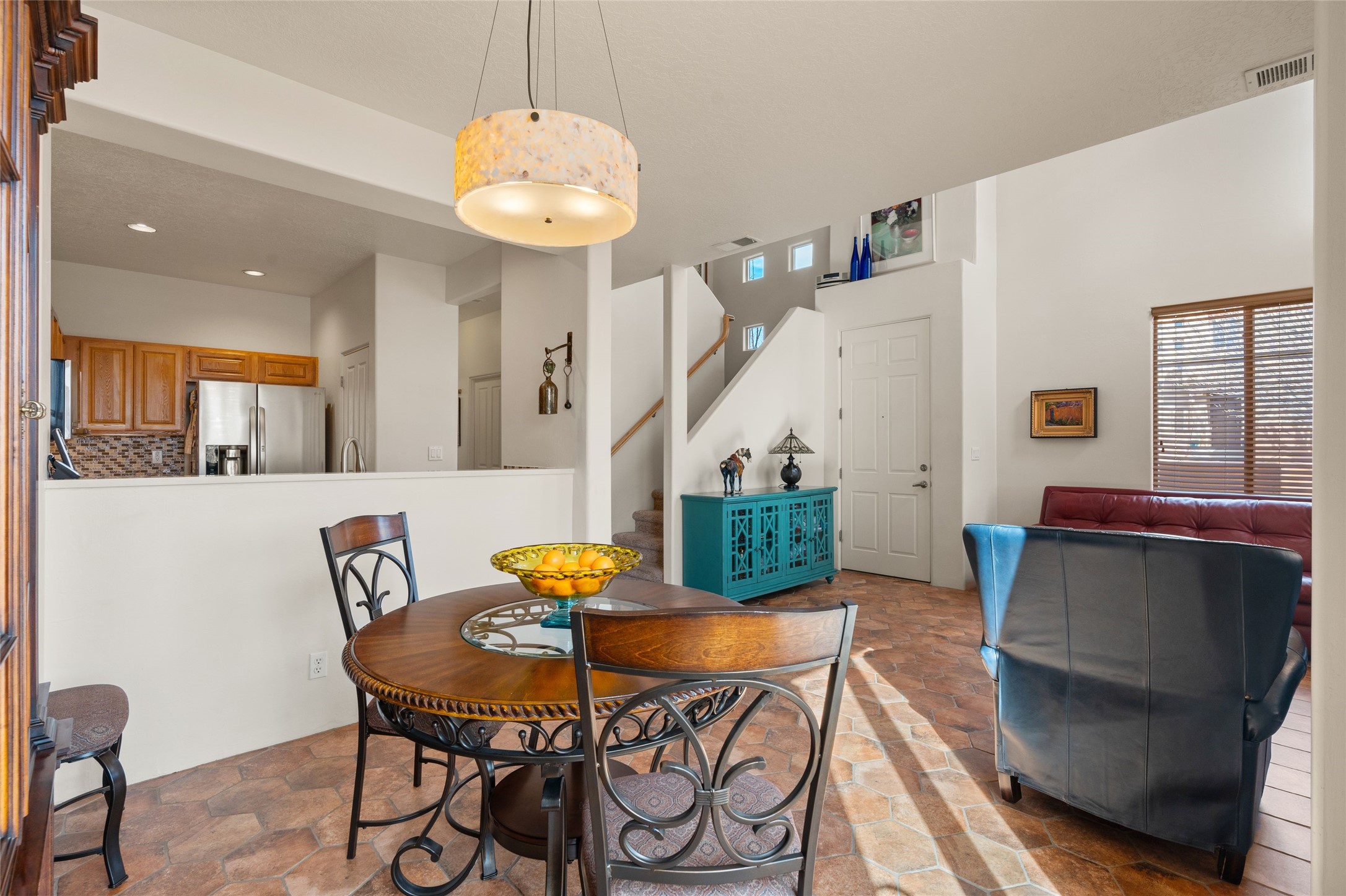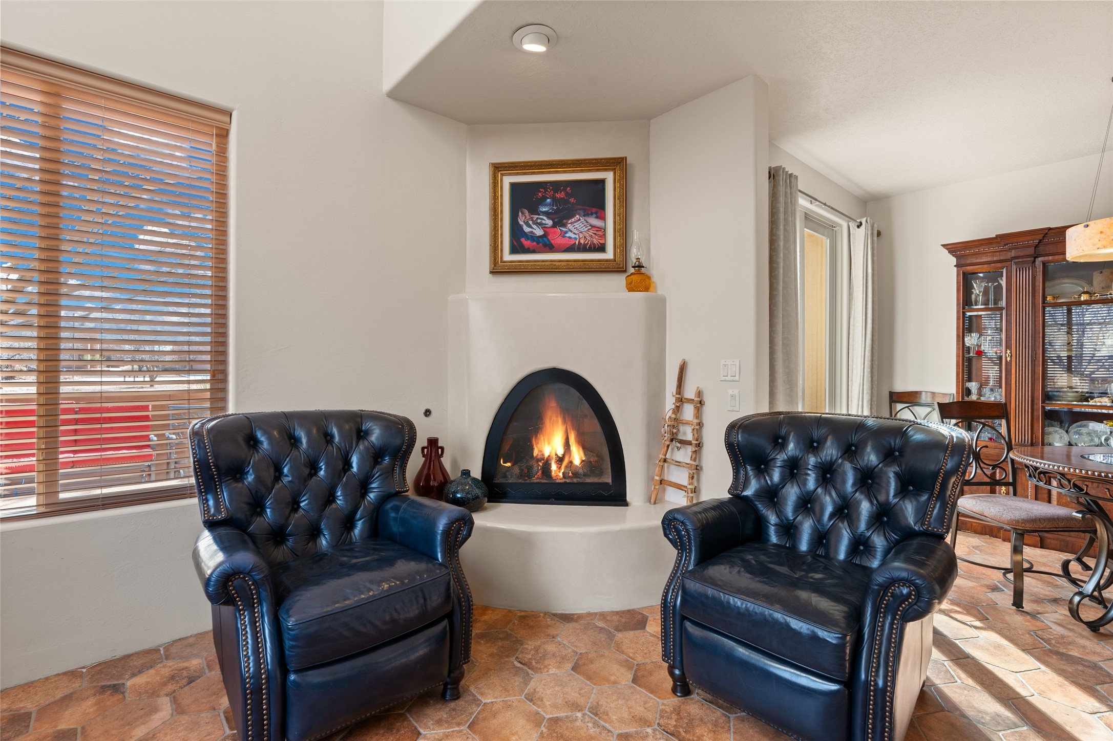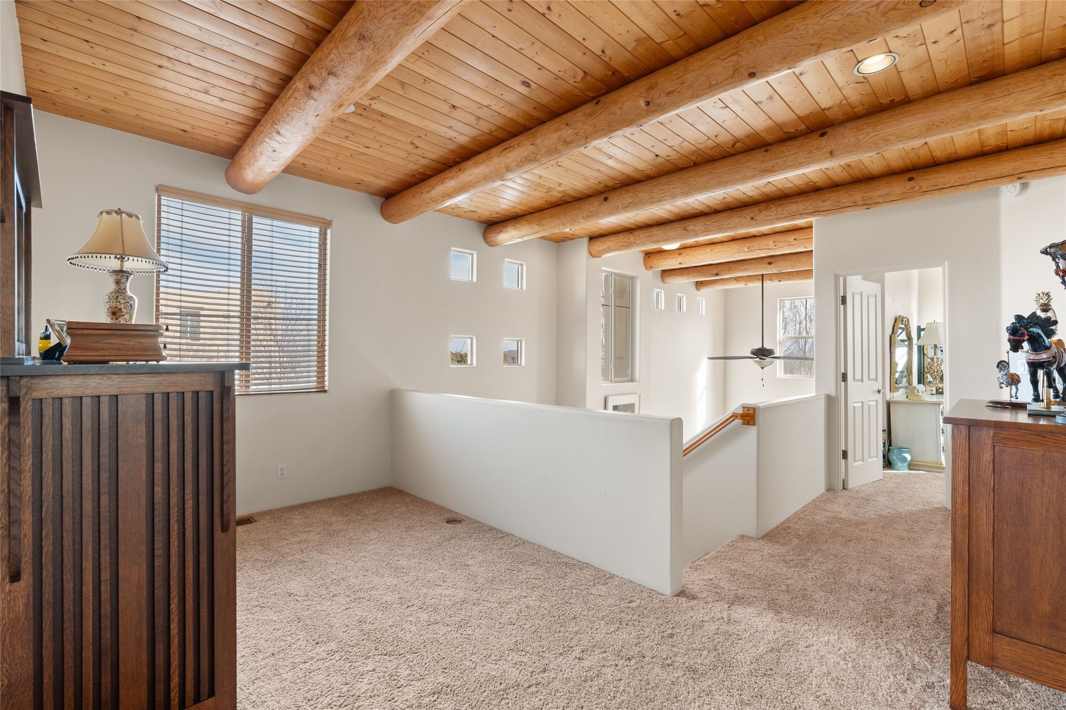 Premier townhome with great light and amazing views from upper deck. Three-bedroom home with three full baths. Prime location on the corner across from the park and close to walking trails. Open living and dining area with vaulted ceiling and vigas and corner kiva fireplace. Large doors out to the front allow enjoyment of the courtyard and outdoor space. Well-designed kitchen and bar space, good storage throughout the home. The primary bedroom upstairs with ensuite and large walk-in closet is separated from the second upstairs bedroom by a large landing area and office or sitting room space. Features a second story viewing deck is spacious and sunny and is the perfect place to view the wonderful Santa Fe sky. There is one bedroom downstairs with a full bath. Rear entry two-car garage and plenty of guest parking.