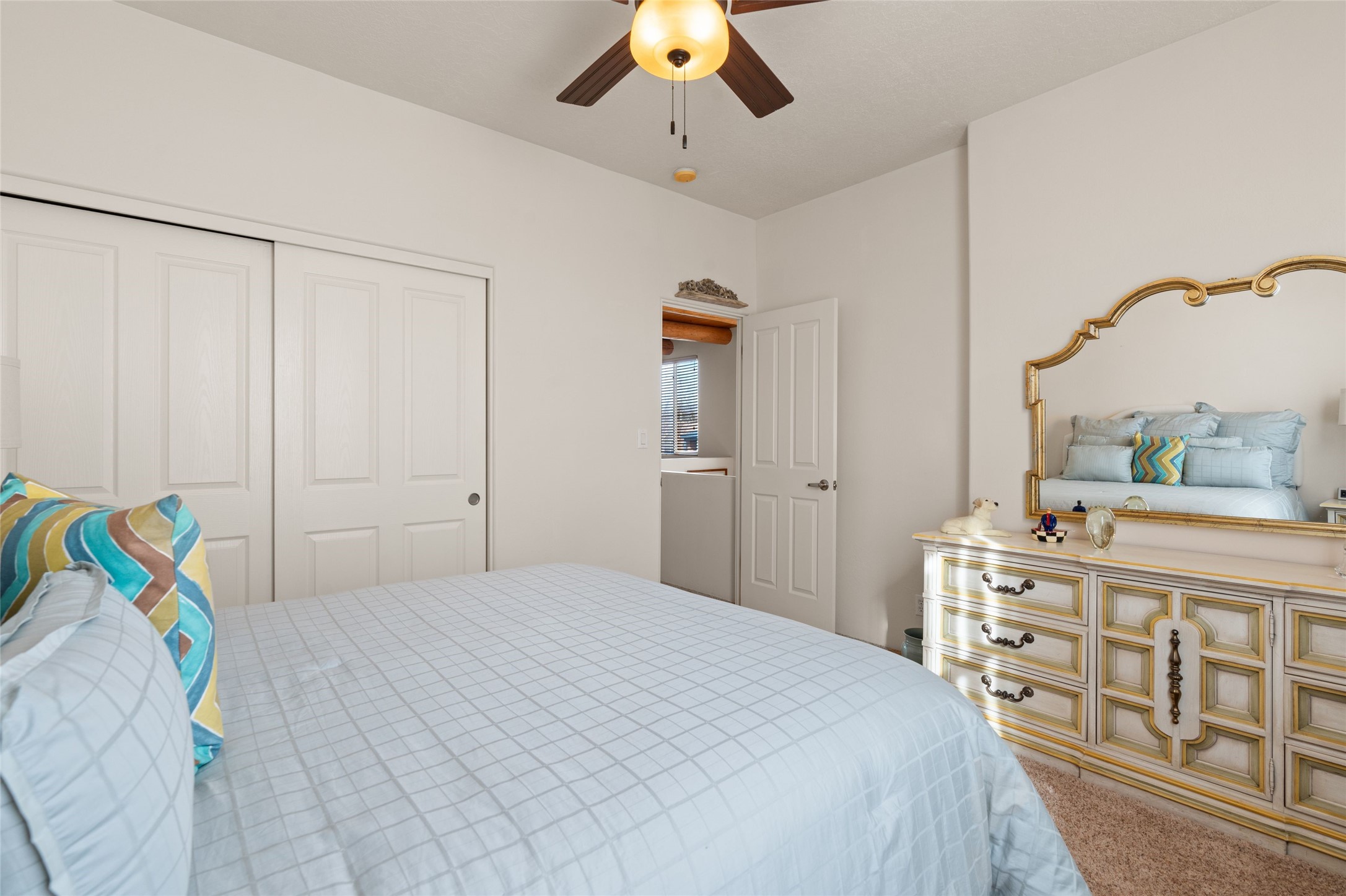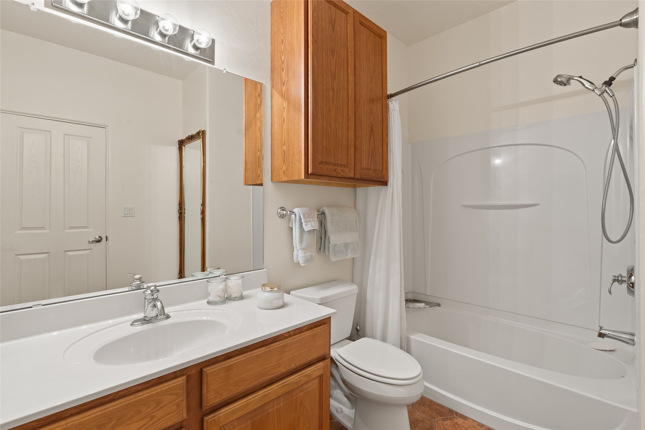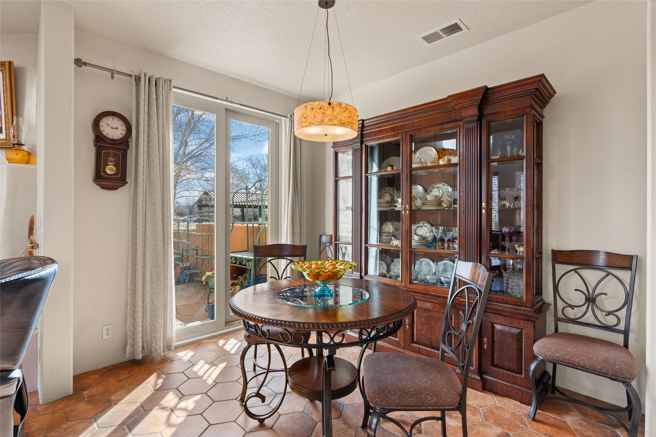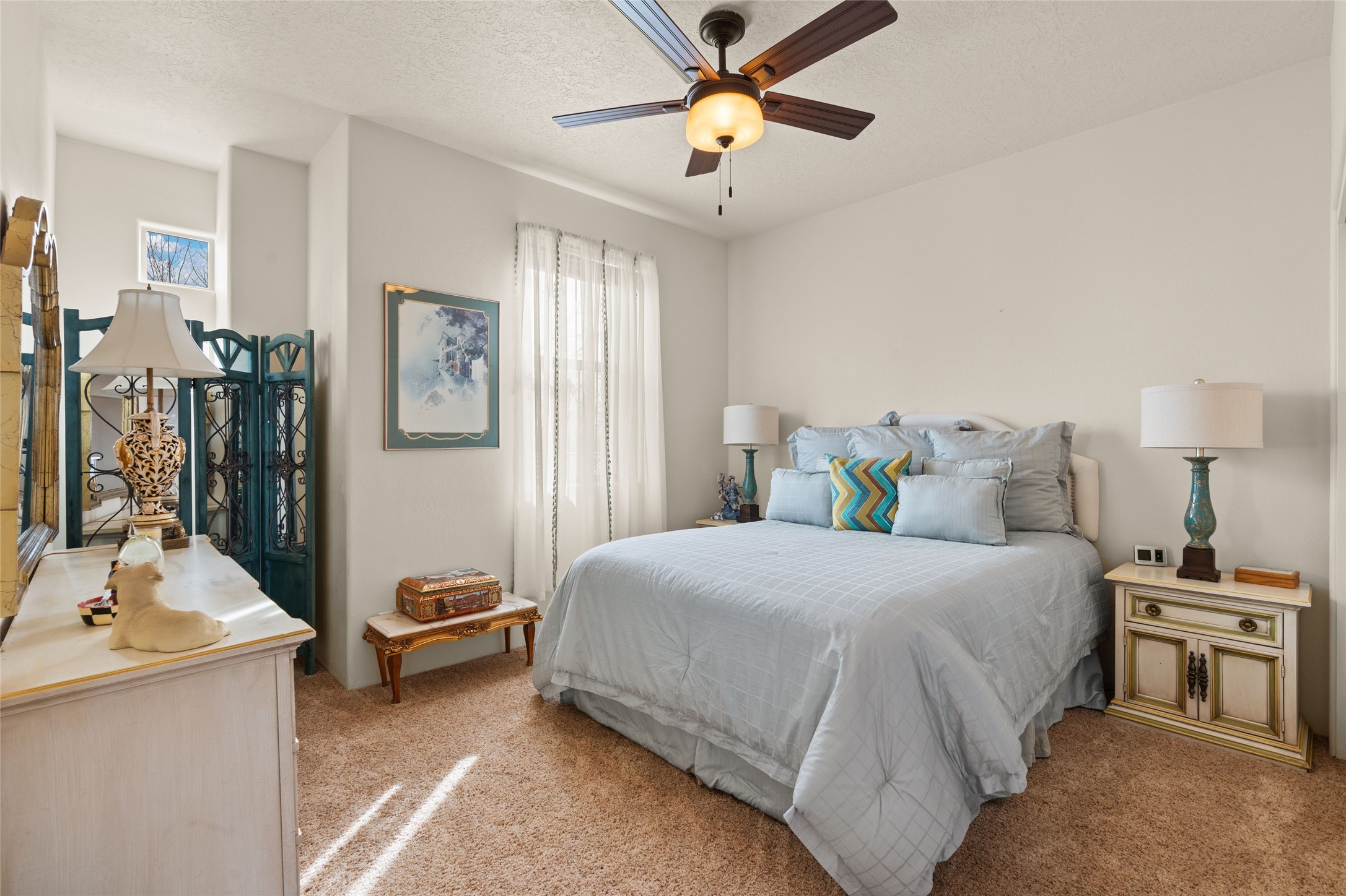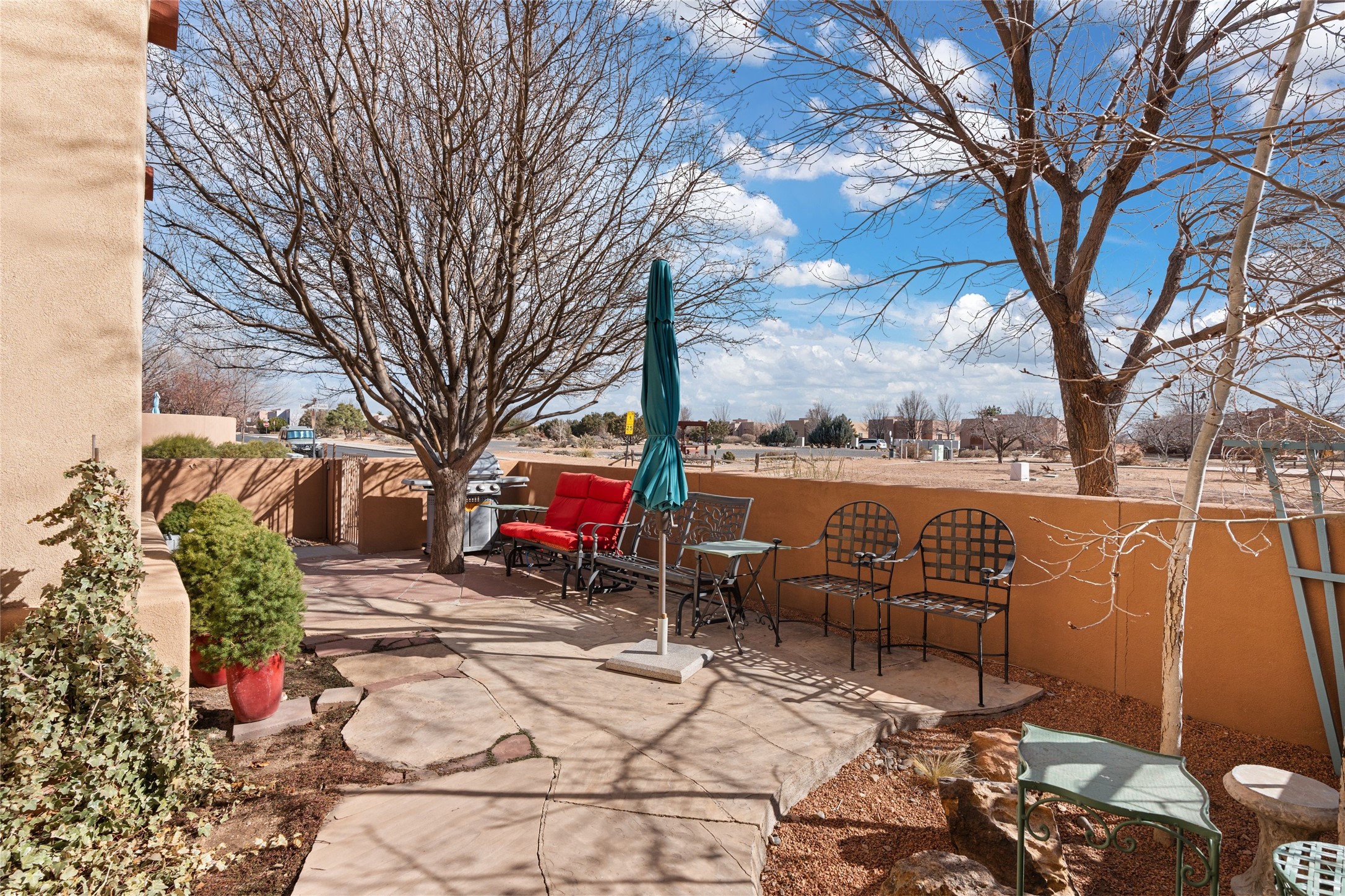 Premier townhome with great light and amazing views from upper deck. Three-bedroom home with three full baths. Prime location on the corner across from the park and close to walking trails. Open living and dining area with vaulted ceiling and vigas and corner kiva fireplace. Large doors out to the front allow enjoyment of the courtyard and outdoor space. Well-designed kitchen and bar space, good storage throughout the home. The primary bedroom upstairs with ensuite and large walk-in closet is separated from the second upstairs bedroom by a large landing area and office or sitting room space. Features a second story viewing deck is spacious and sunny and is the perfect place to view the wonderful Santa Fe sky. There is one bedroom downstairs with a full bath. Rear entry two-car garage and plenty of guest parking.