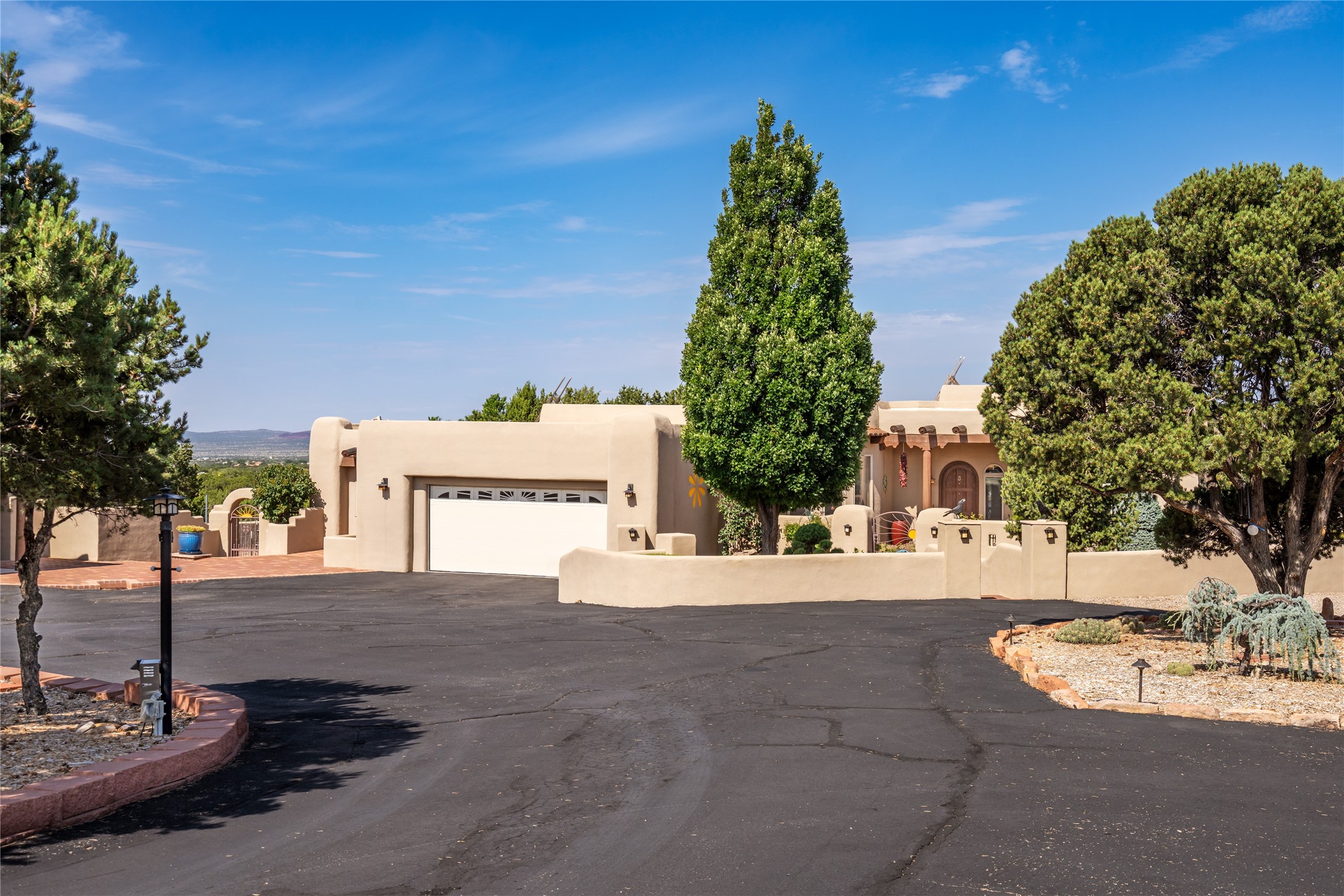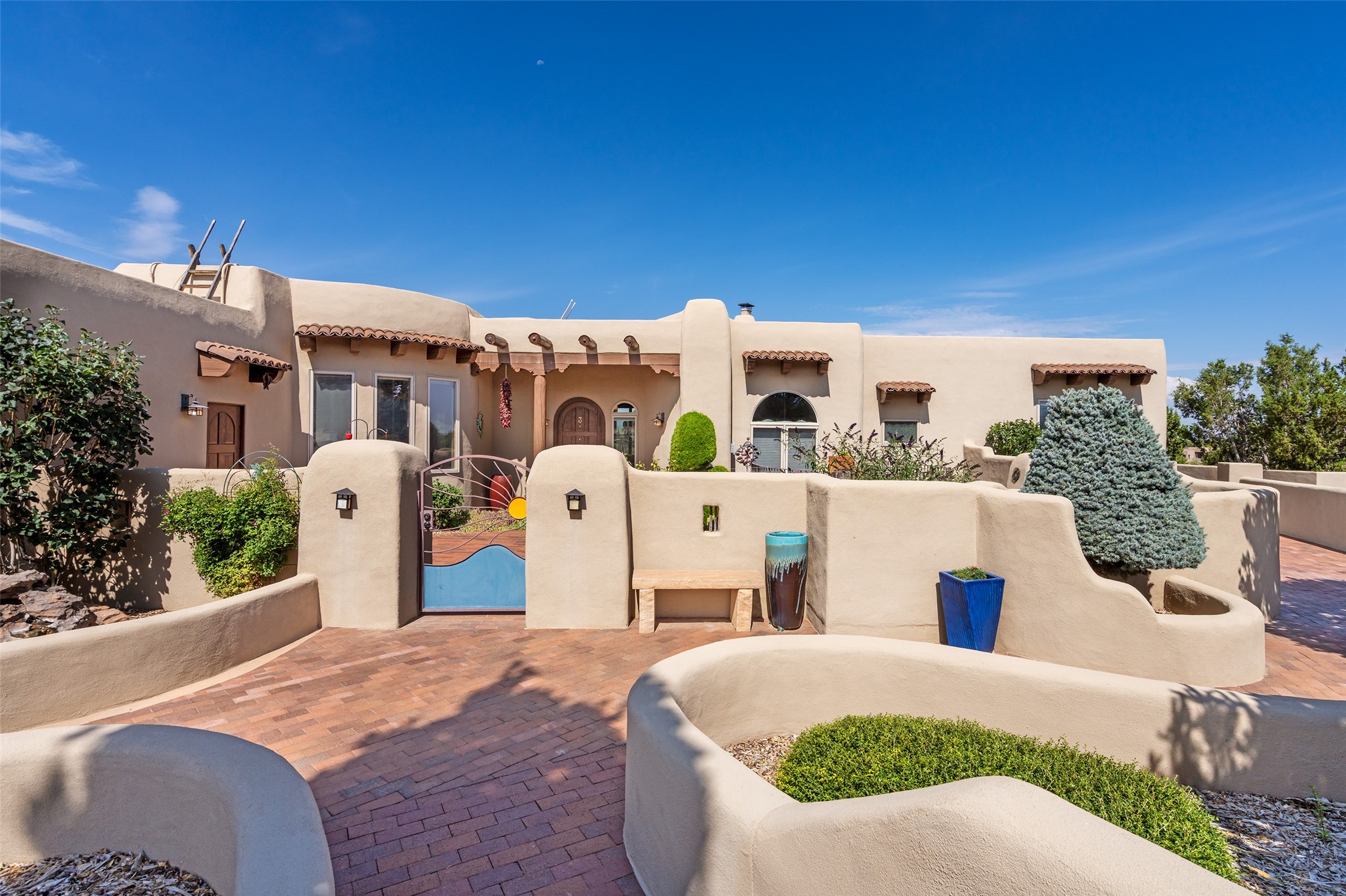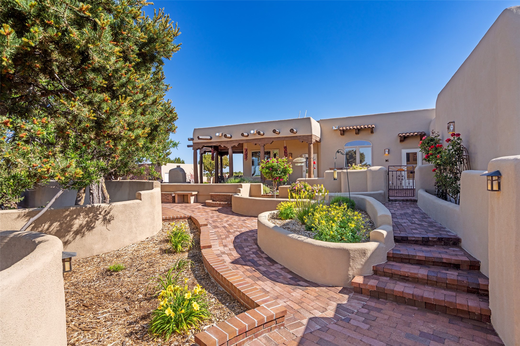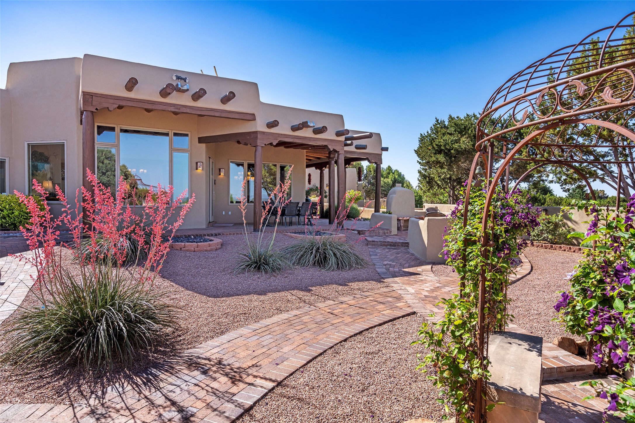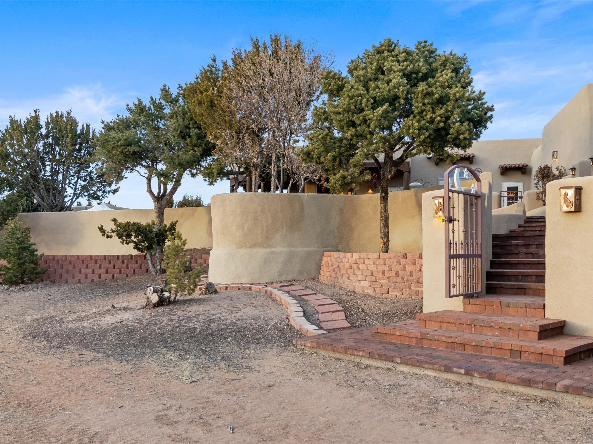 Inviting spaces inside and out, with incredible views all around. Just what you have been searching for! Quality construction placed perfectly on this 2.5 acre lot takes full advantage of our beautiful Sangre De Cristos, Ortiz, Sandia and Jemez mountains with breathtaking sunrises and sunsets. The floor plan welcomes unique and grand spacious areas of a peaceful home or generous areas for entertaining. Large pine vega beams/corbels accents throughout, large windows capture warm light and amazing mountainous views. Stylish kitchen with granite countertops, stainless steel appliances, maple cabinetry with high cabinets affixed with stunning stamped tin fronts allow versatility for all occasions. Foyer leads into a gorgeous Kiva fireplace in the living room. The master bedroom provides a relaxing oasis with its own sitting area and Kiva fireplace, a beautiful open bathroom space, walk-in closet and personal door to the portal with immediate access to an outdoor hot tub. WIRSBO PEX tubing keeps the radiant floor warm during the winter season. Outside, 3 Spanish heritage portals are enhanced with pine columns, beams/corbels and brick floors. A 2-car garage provides entry to the kitchen. The meticulously landscaped yard boasts an underground sprinkler system with a drip system keeping trees, bushes and flowers lush and beautiful. Front courtyard large area with outdoor table/chairs embraced by a raised circular iron fence.The expansive walkways challenge the square footage of the interior. Coordinating with walkways, over 1,200 linear feet of beautiful stucco walls and terraces adorn the outside. A coyote fence surrounds a spacious 2.5 acre lot with 2-sided colored entry gate requiring code access, along with a pedestrian gate similarly locked. ADT alarms wired for intruders and fire/CO1 alarms are used in the house and outbuildings. This home is truly breathtaking and an absolute must-see to appreciate all its beauty. Schedule your tour today!