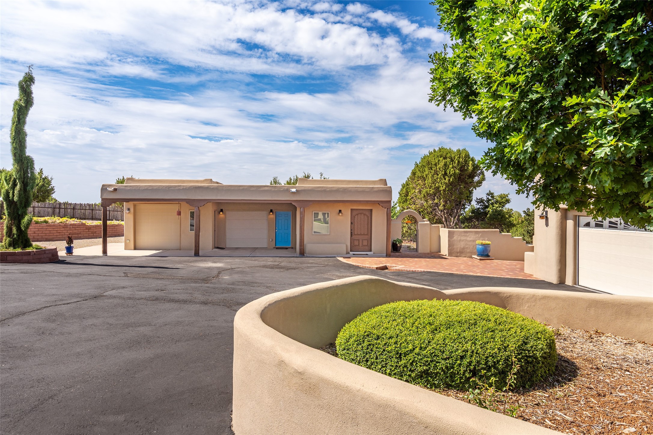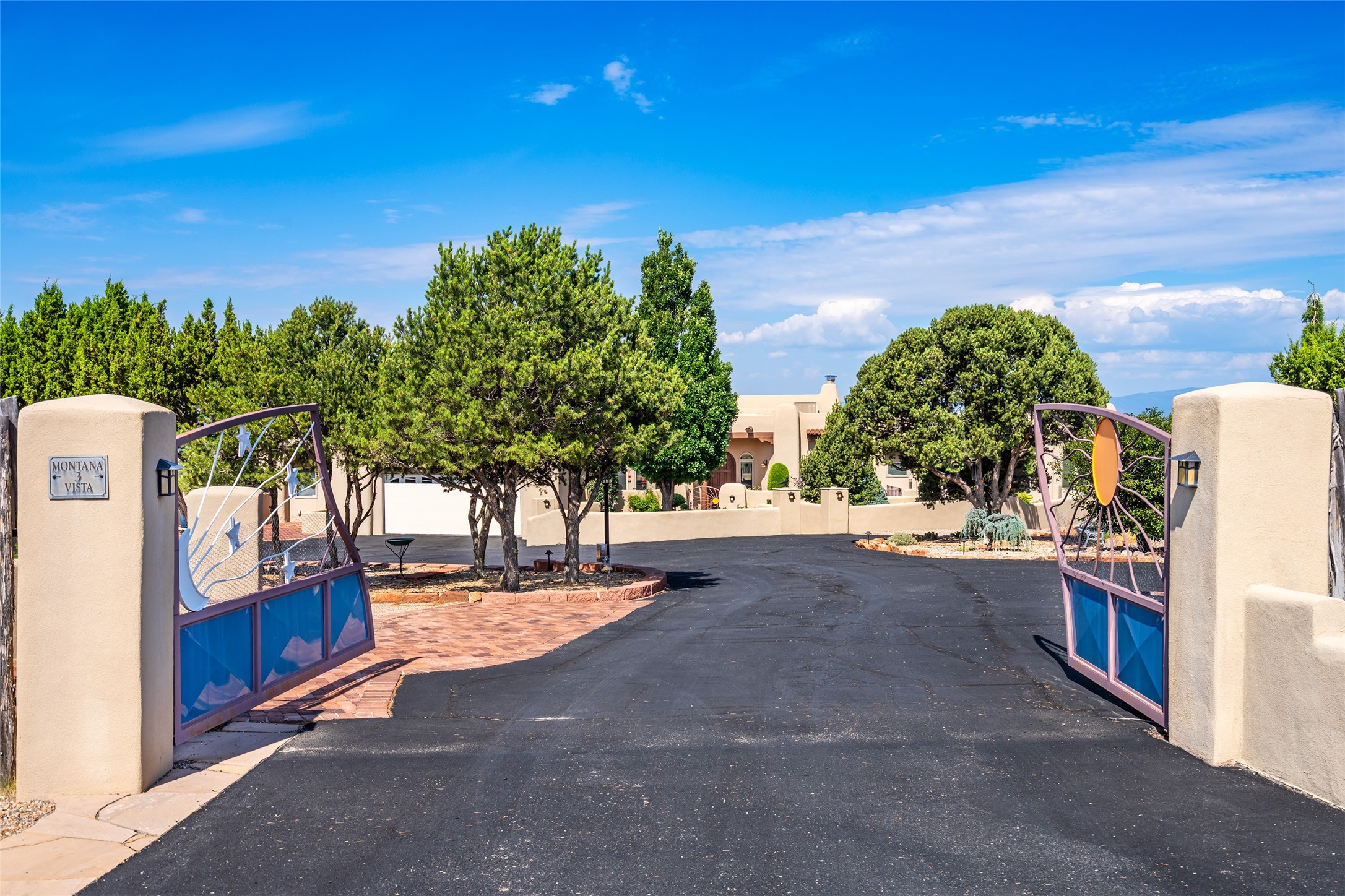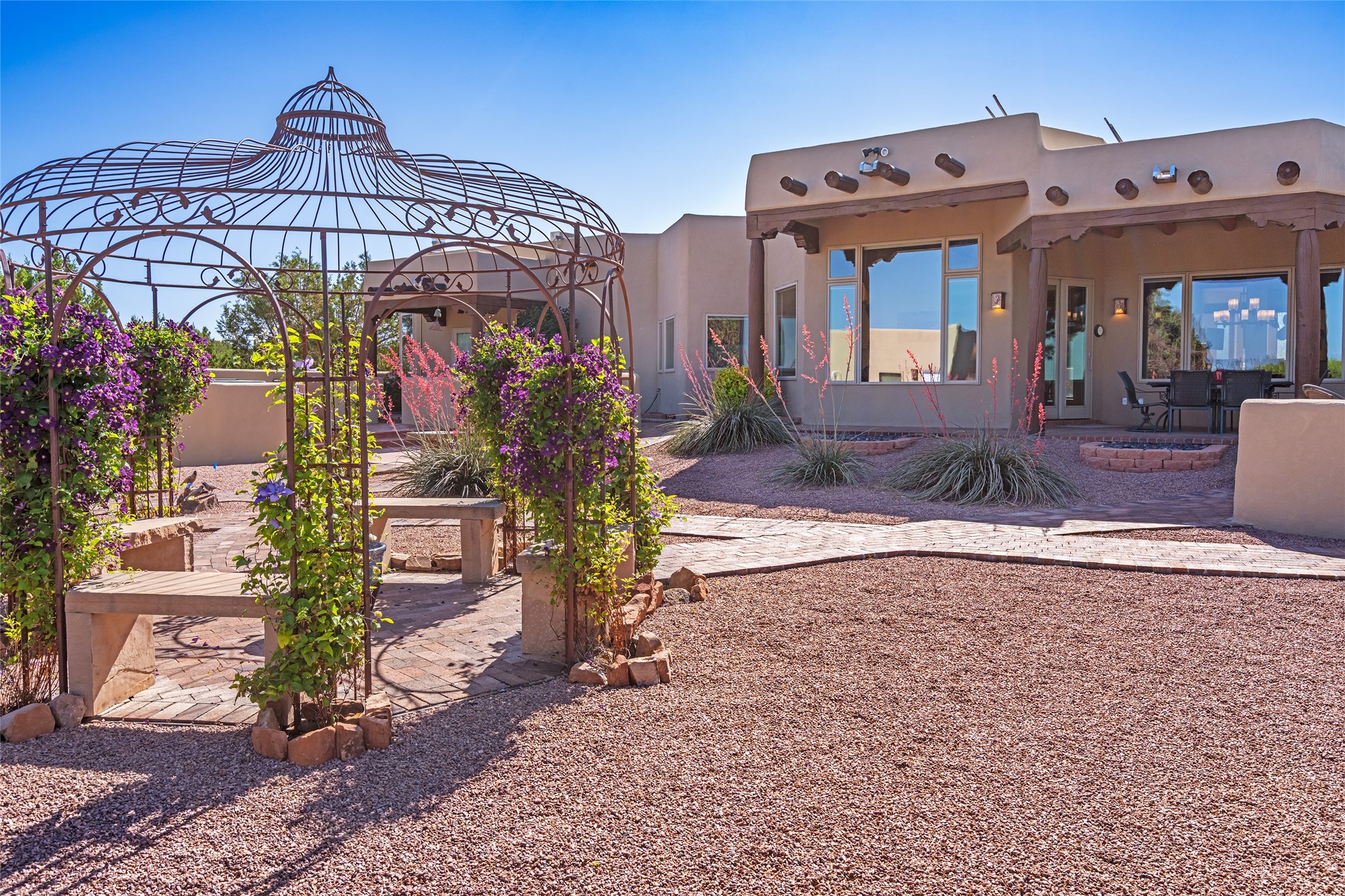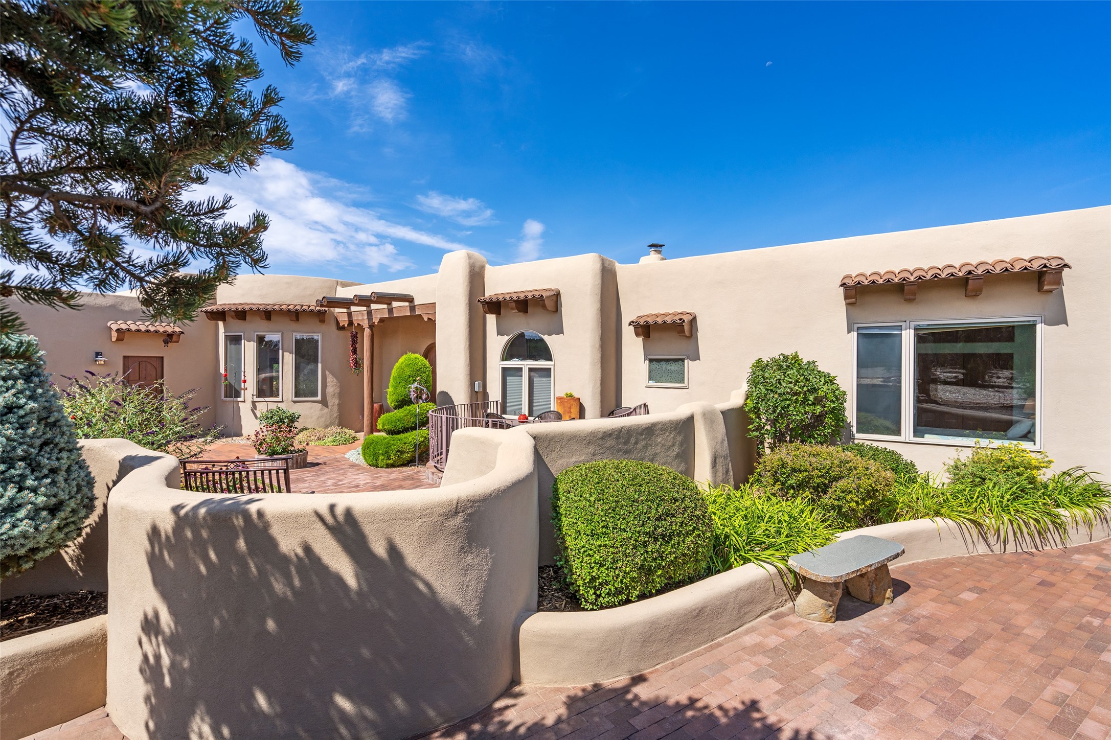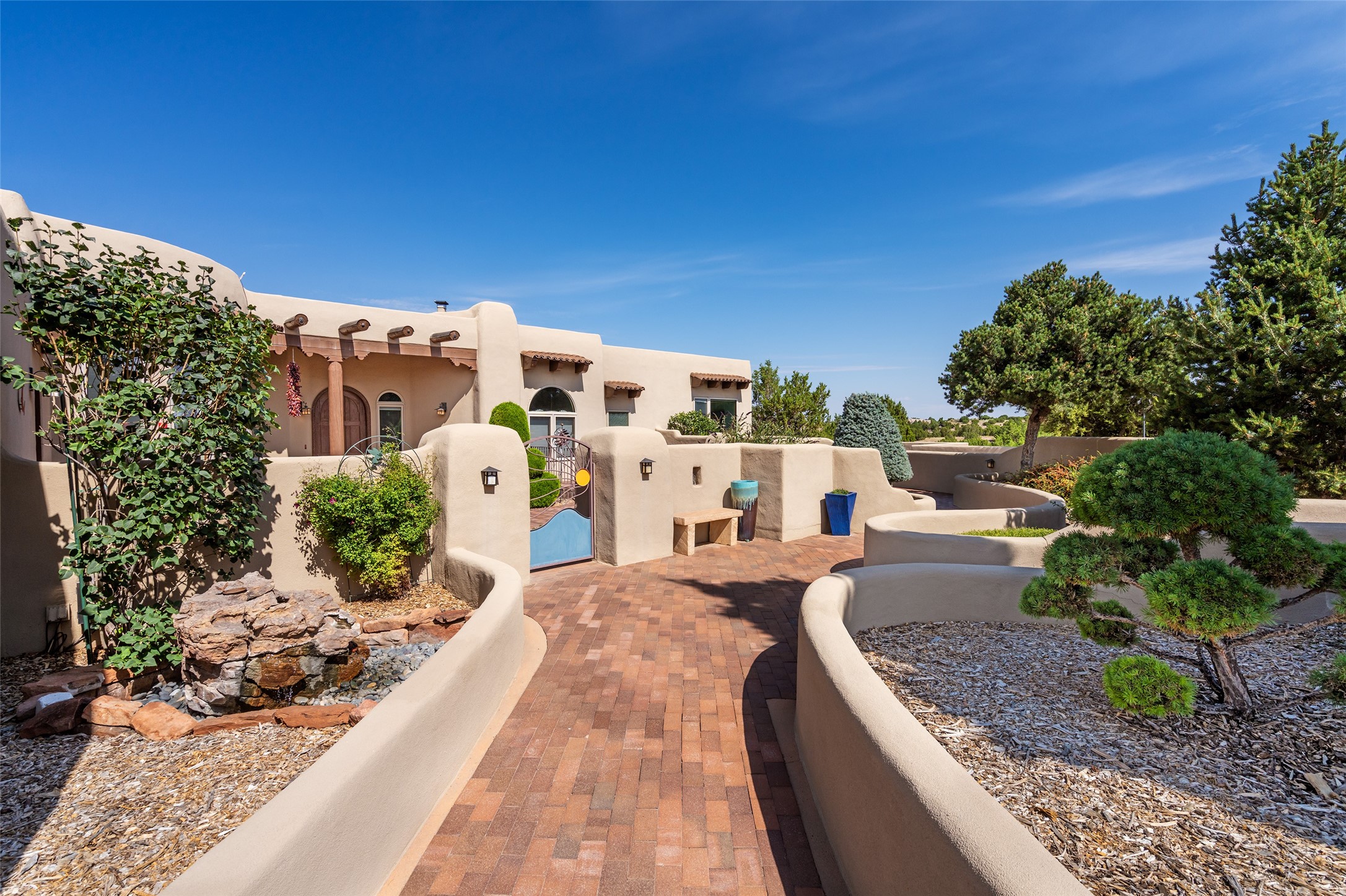 Inviting spaces inside and out, with incredible views all around. Just what you have been searching for! Quality construction placed perfectly on this 2.5 acre lot takes full advantage of our beautiful Sangre De Cristos, Ortiz, Sandia and Jemez mountains with breathtaking sunrises and sunsets. The floor plan welcomes unique and grand spacious areas of a peaceful home or generous areas for entertaining. Large pine vega beams/corbels accents throughout, large windows capture warm light and amazing mountainous views. Stylish kitchen with granite countertops, stainless steel appliances, maple cabinetry with high cabinets affixed with stunning stamped tin fronts allow versatility for all occasions. Foyer leads into a gorgeous Kiva fireplace in the living room. The master bedroom provides a relaxing oasis with its own sitting area and Kiva fireplace, a beautiful open bathroom space, walk-in closet and personal door to the portal with immediate access to an outdoor hot tub. WIRSBO PEX tubing keeps the radiant floor warm during the winter season. Outside, 3 Spanish heritage portals are enhanced with pine columns, beams/corbels and brick floors. A 2-car garage provides entry to the kitchen. The meticulously landscaped yard boasts an underground sprinkler system with a drip system keeping trees, bushes and flowers lush and beautiful. Front courtyard large area with outdoor table/chairs embraced by a raised circular iron fence.The expansive walkways challenge the square footage of the interior. Coordinating with walkways, over 1,200 linear feet of beautiful stucco walls and terraces adorn the outside. A coyote fence surrounds a spacious 2.5 acre lot with 2-sided colored entry gate requiring code access, along with a pedestrian gate similarly locked. ADT alarms wired for intruders and fire/CO1 alarms are used in the house and outbuildings. This home is truly breathtaking and an absolute must-see to appreciate all its beauty. Schedule your tour today!