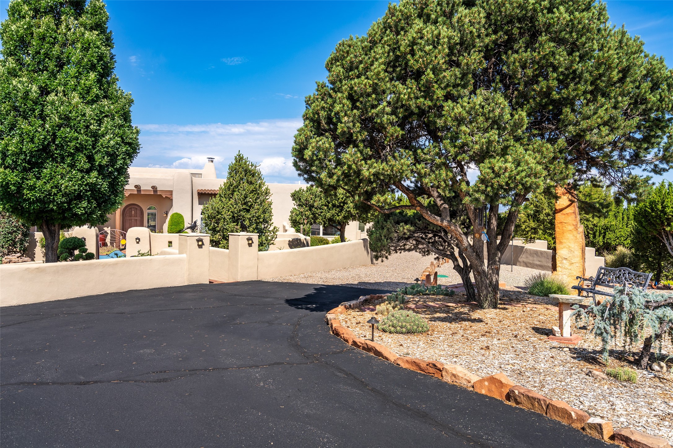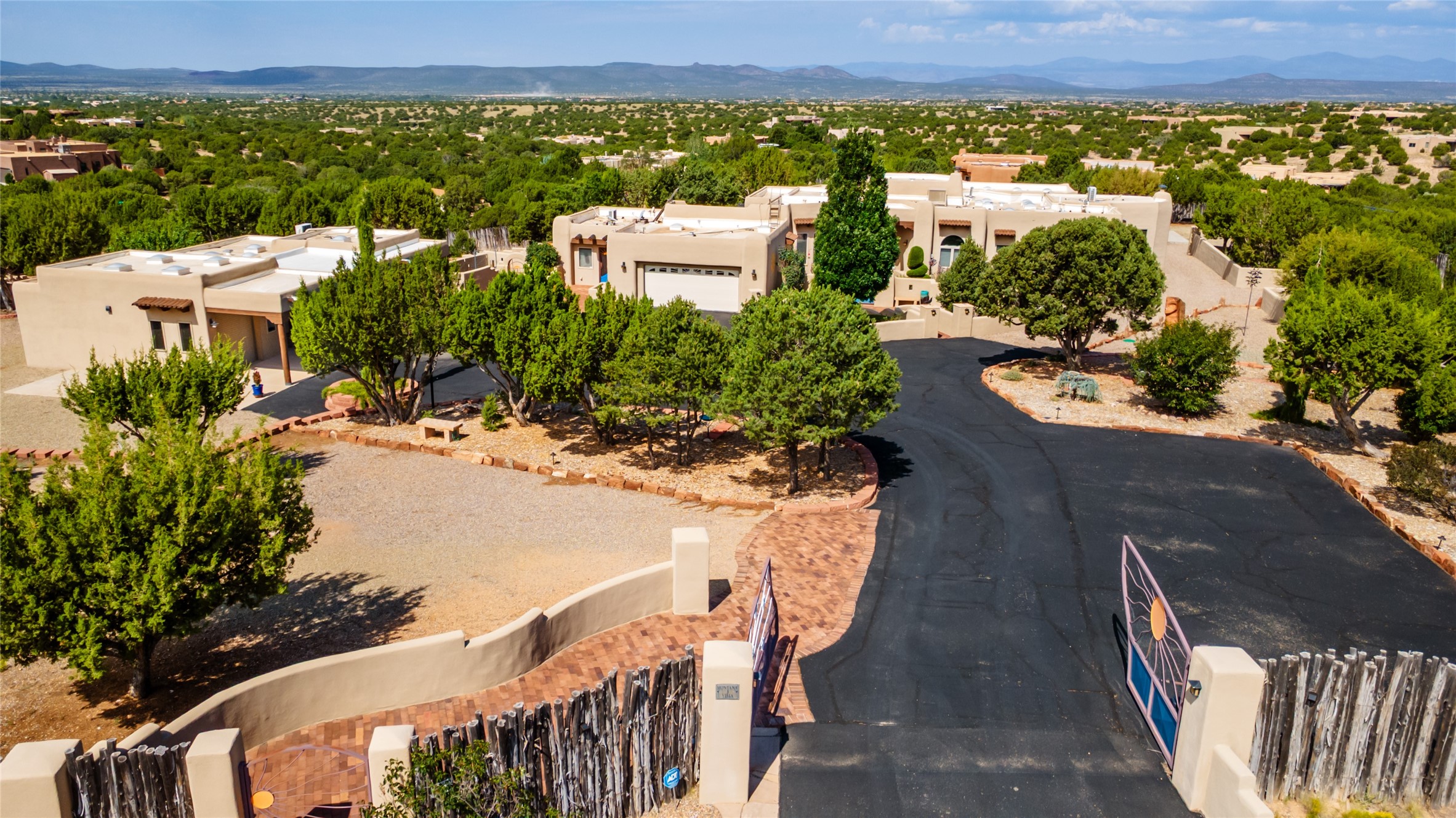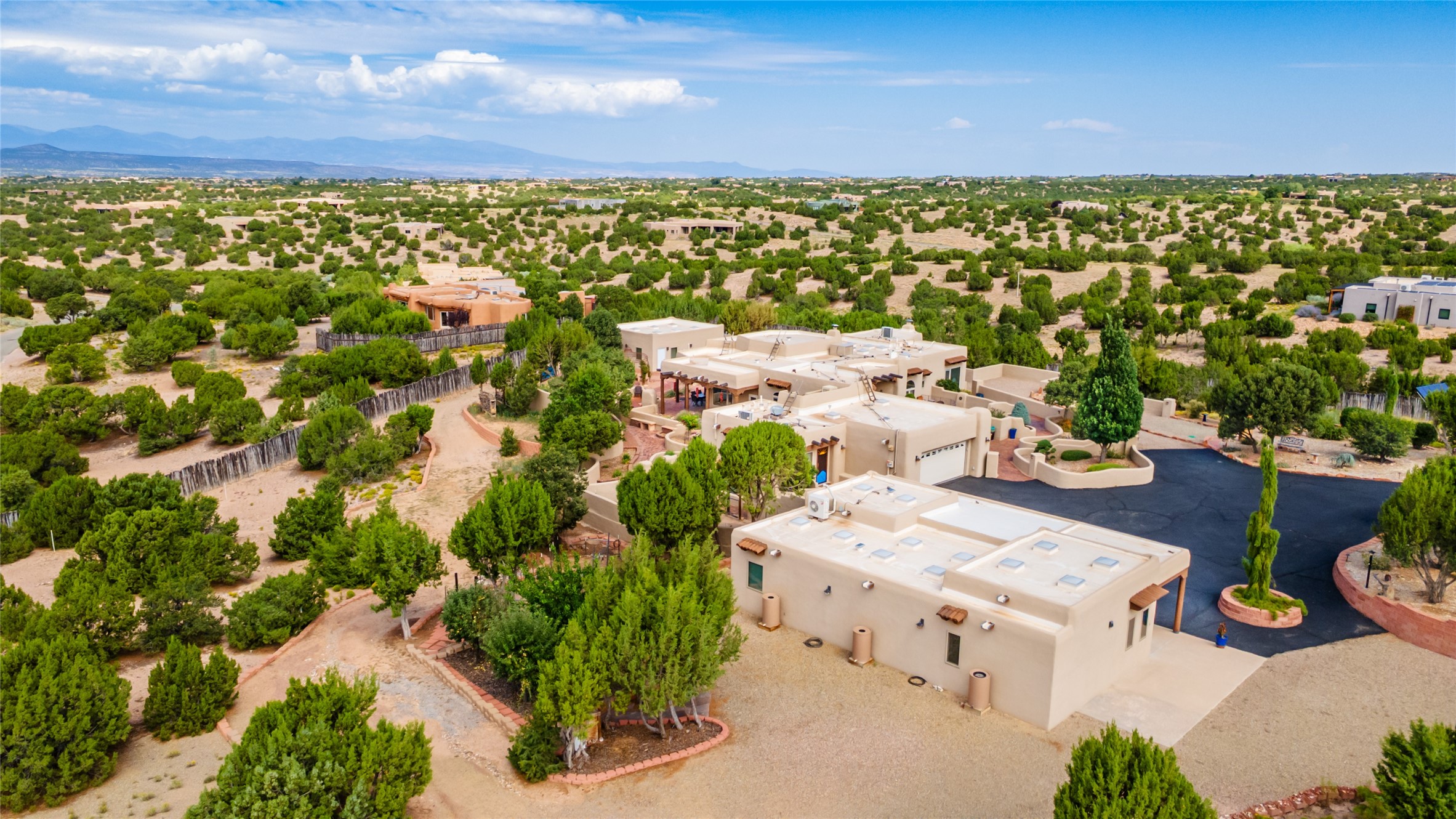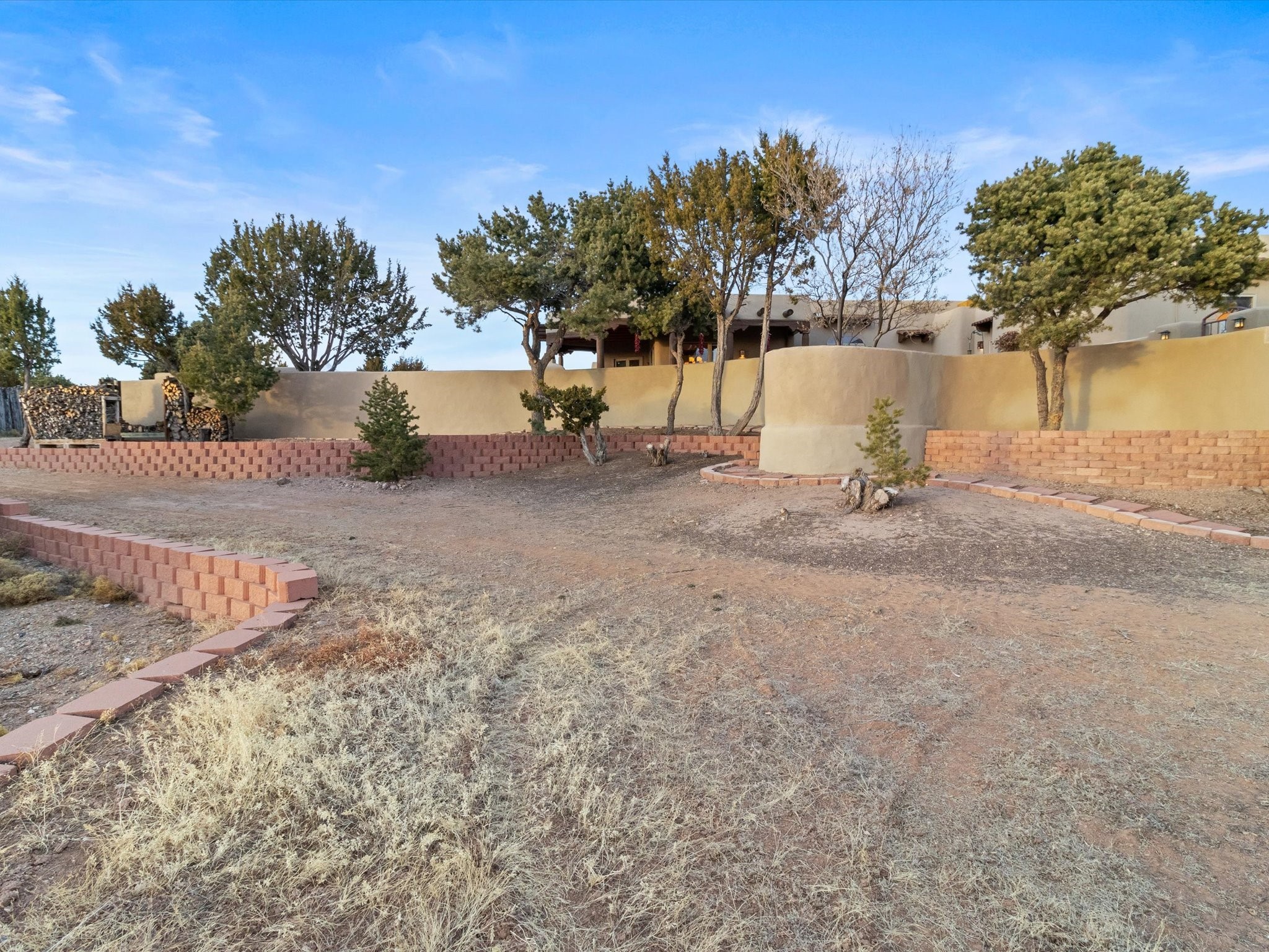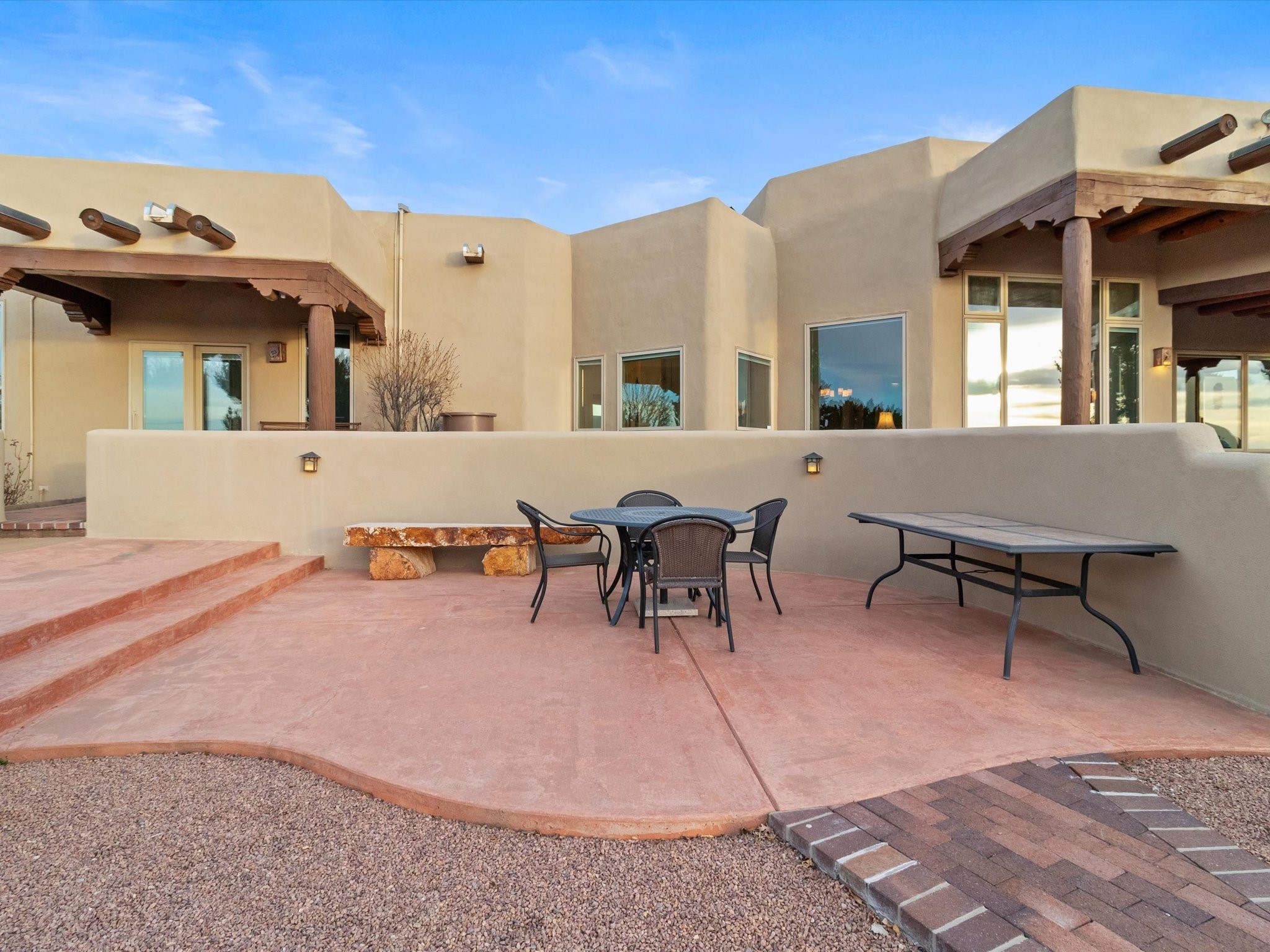 Inviting spaces inside and out, with incredible views all around. Just what you have been searching for! Quality construction placed perfectly on this 2.5 acre lot takes full advantage of our beautiful Sangre De Cristos, Ortiz, Sandia and Jemez mountains with breathtaking sunrises and sunsets. The floor plan welcomes unique and grand spacious areas of a peaceful home or generous areas for entertaining. Large pine vega beams/corbels accents throughout, large windows capture warm light and amazing mountainous views. Stylish kitchen with granite countertops, stainless steel appliances, maple cabinetry with high cabinets affixed with stunning stamped tin fronts allow versatility for all occasions. Foyer leads into a gorgeous Kiva fireplace in the living room. The master bedroom provides a relaxing oasis with its own sitting area and Kiva fireplace, a beautiful open bathroom space, walk-in closet and personal door to the portal with immediate access to an outdoor hot tub. WIRSBO PEX tubing keeps the radiant floor warm during the winter season. Outside, 3 Spanish heritage portals are enhanced with pine columns, beams/corbels and brick floors. A 2-car garage provides entry to the kitchen. The meticulously landscaped yard boasts an underground sprinkler system with a drip system keeping trees, bushes and flowers lush and beautiful. Front courtyard large area with outdoor table/chairs embraced by a raised circular iron fence.The expansive walkways challenge the square footage of the interior. Coordinating with walkways, over 1,200 linear feet of beautiful stucco walls and terraces adorn the outside. A coyote fence surrounds a spacious 2.5 acre lot with 2-sided colored entry gate requiring code access, along with a pedestrian gate similarly locked. ADT alarms wired for intruders and fire/CO1 alarms are used in the house and outbuildings. This home is truly breathtaking and an absolute must-see to appreciate all its beauty. Schedule your tour today!