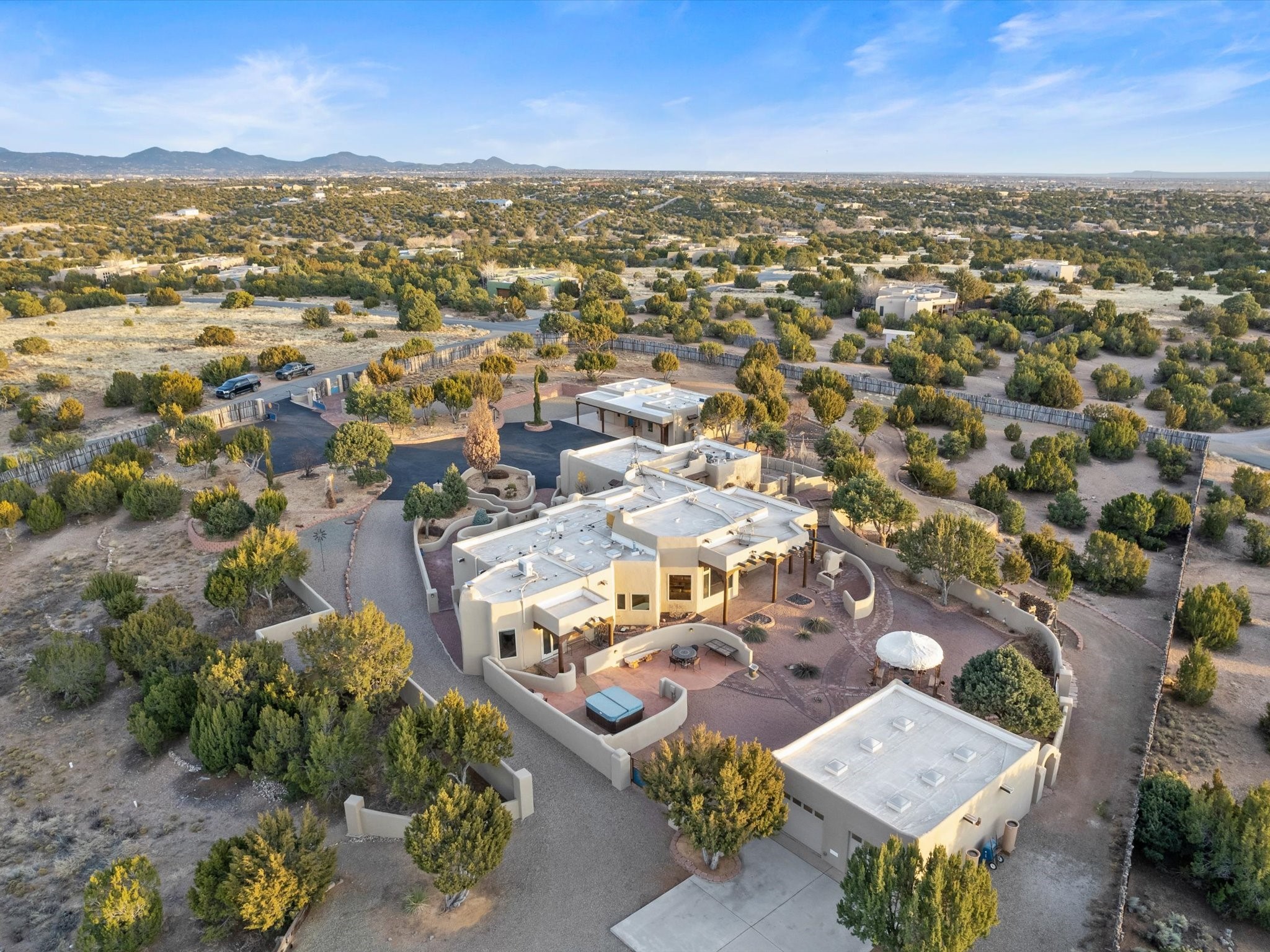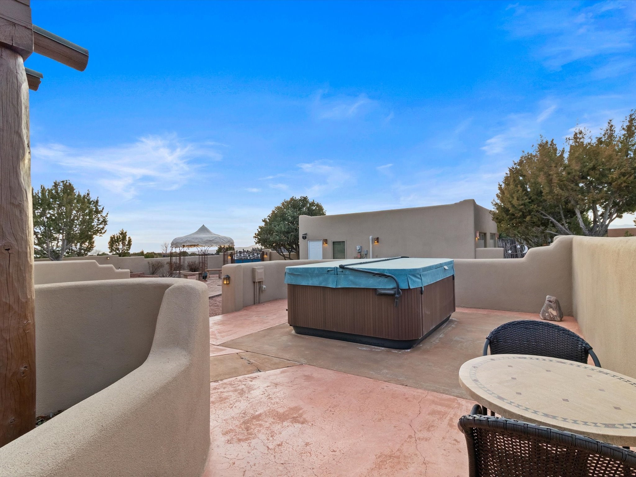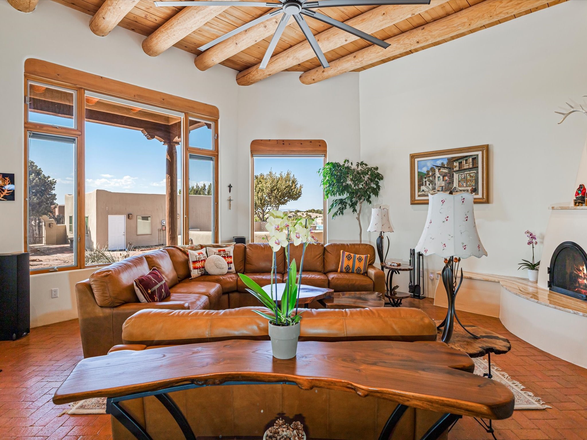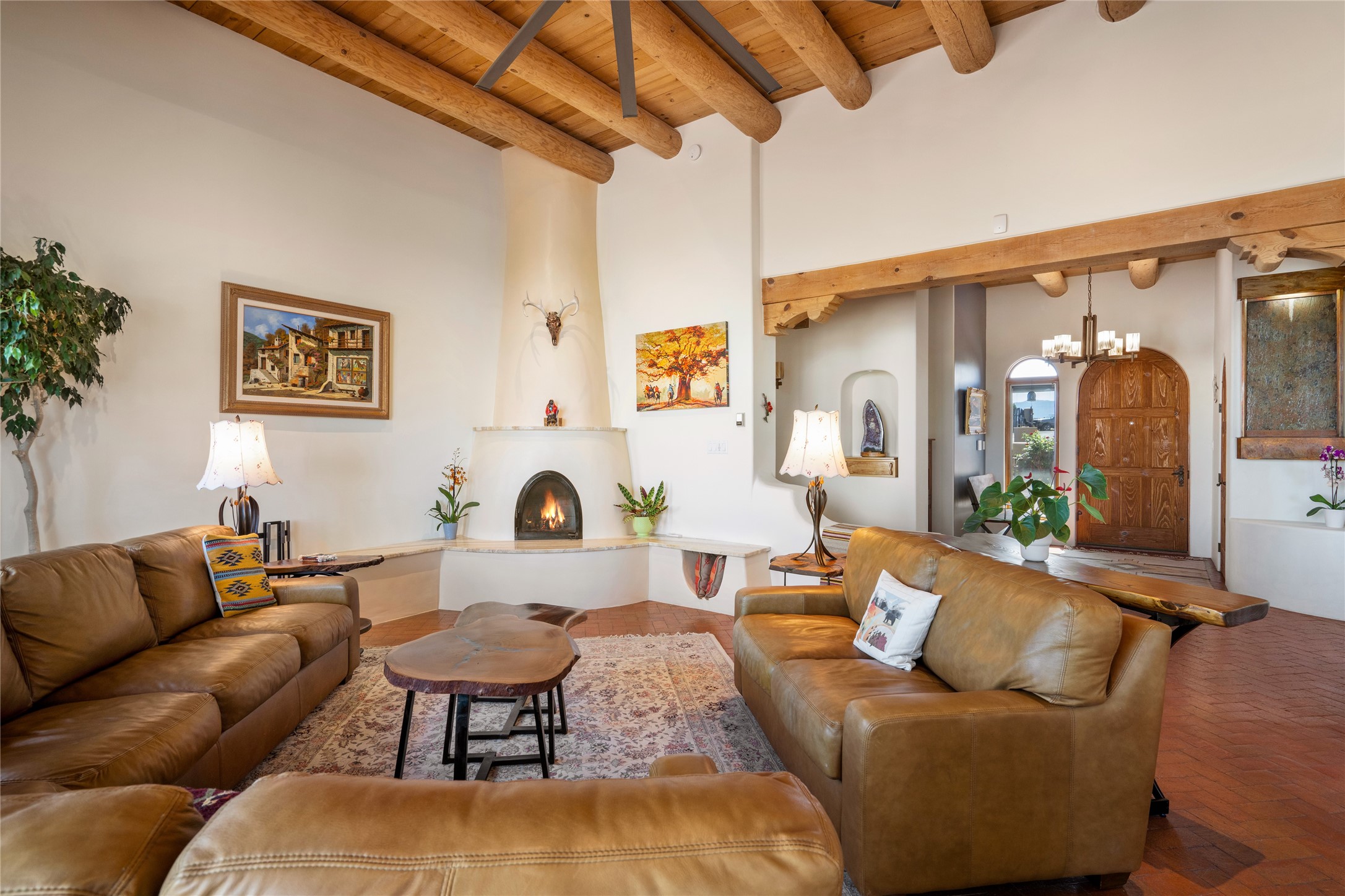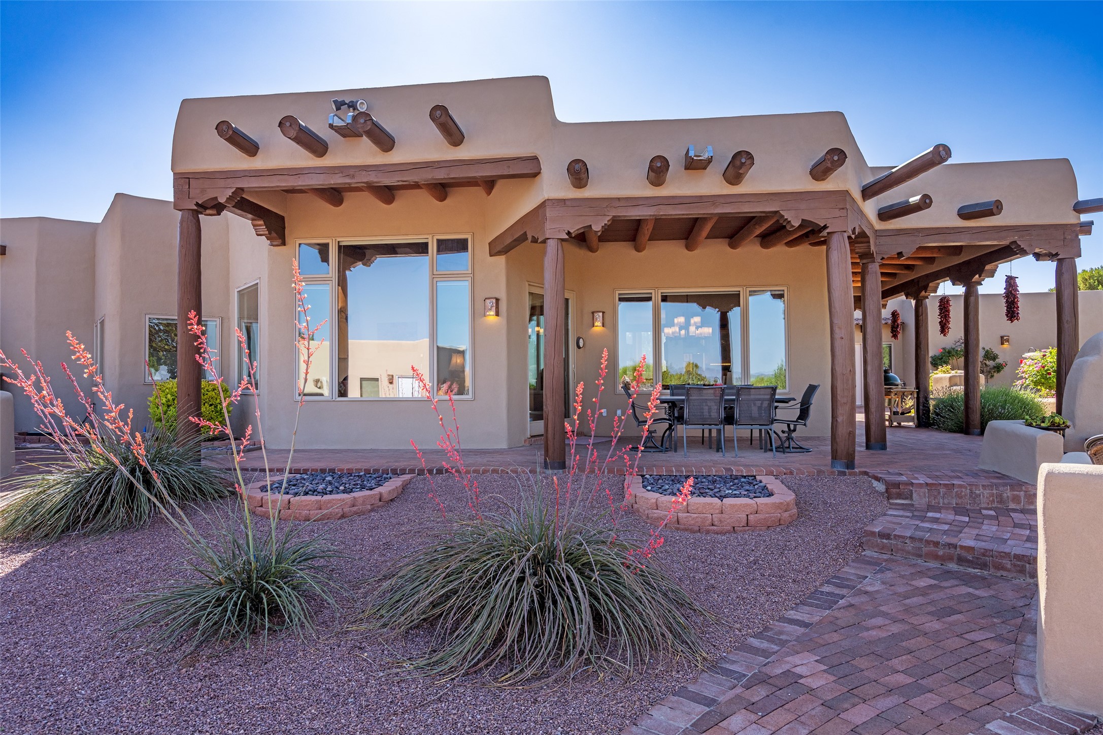 Inviting spaces inside and out, with incredible views all around. Just what you have been searching for! Quality construction placed perfectly on this 2.5 acre lot takes full advantage of our beautiful Sangre De Cristos, Ortiz, Sandia and Jemez mountains with breathtaking sunrises and sunsets. The floor plan welcomes unique and grand spacious areas of a peaceful home or generous areas for entertaining. Large pine vega beams/corbels accents throughout, large windows capture warm light and amazing mountainous views. Stylish kitchen with granite countertops, stainless steel appliances, maple cabinetry with high cabinets affixed with stunning stamped tin fronts allow versatility for all occasions. Foyer leads into a gorgeous Kiva fireplace in the living room. The master bedroom provides a relaxing oasis with its own sitting area and Kiva fireplace, a beautiful open bathroom space, walk-in closet and personal door to the portal with immediate access to an outdoor hot tub. WIRSBO PEX tubing keeps the radiant floor warm during the winter season. Outside, 3 Spanish heritage portals are enhanced with pine columns, beams/corbels and brick floors. A 2-car garage provides entry to the kitchen. The meticulously landscaped yard boasts an underground sprinkler system with a drip system keeping trees, bushes and flowers lush and beautiful. Front courtyard large area with outdoor table/chairs embraced by a raised circular iron fence.The expansive walkways challenge the square footage of the interior. Coordinating with walkways, over 1,200 linear feet of beautiful stucco walls and terraces adorn the outside. A coyote fence surrounds a spacious 2.5 acre lot with 2-sided colored entry gate requiring code access, along with a pedestrian gate similarly locked. ADT alarms wired for intruders and fire/CO1 alarms are used in the house and outbuildings. This home is truly breathtaking and an absolute must-see to appreciate all its beauty. Schedule your tour today!