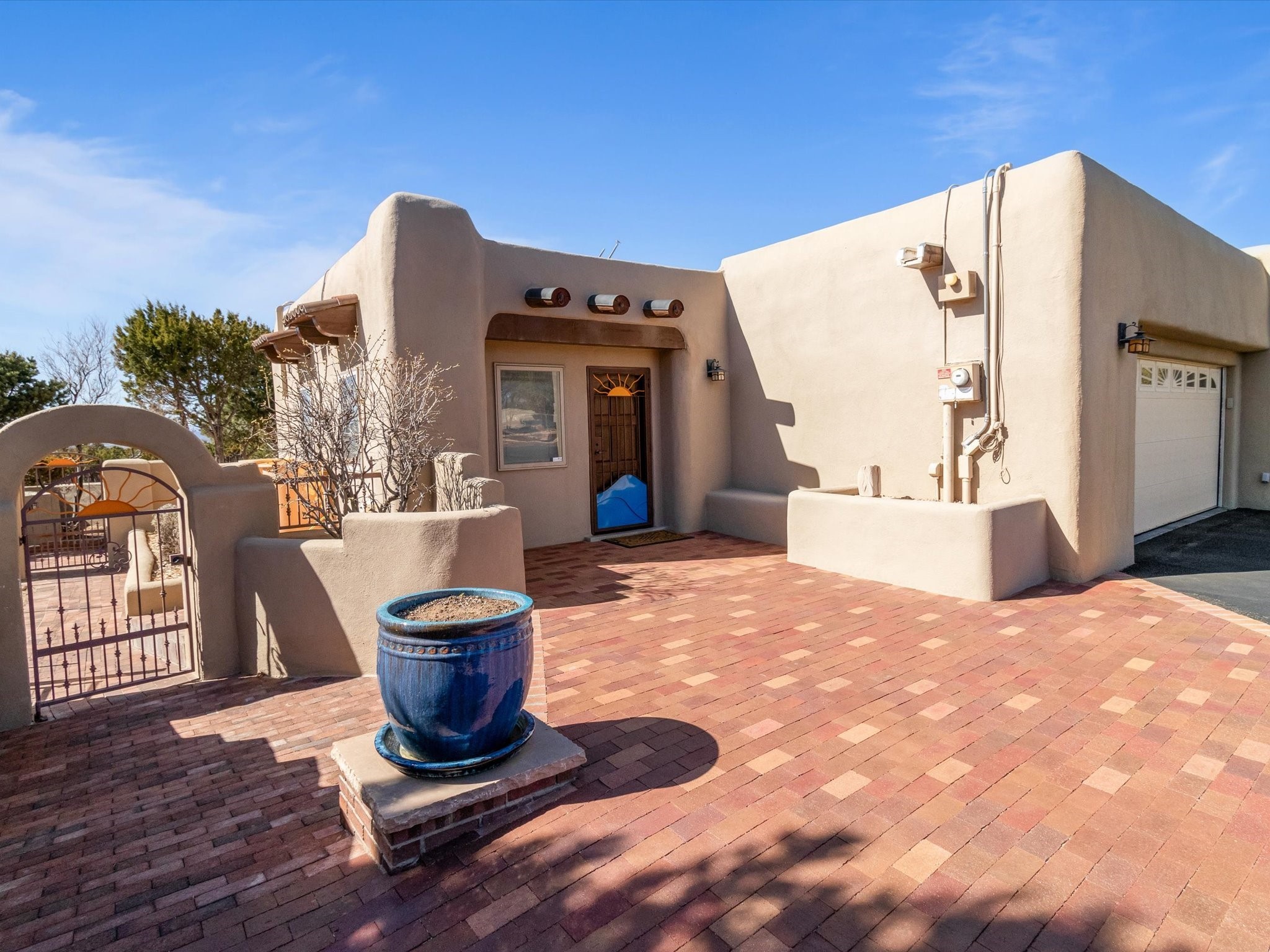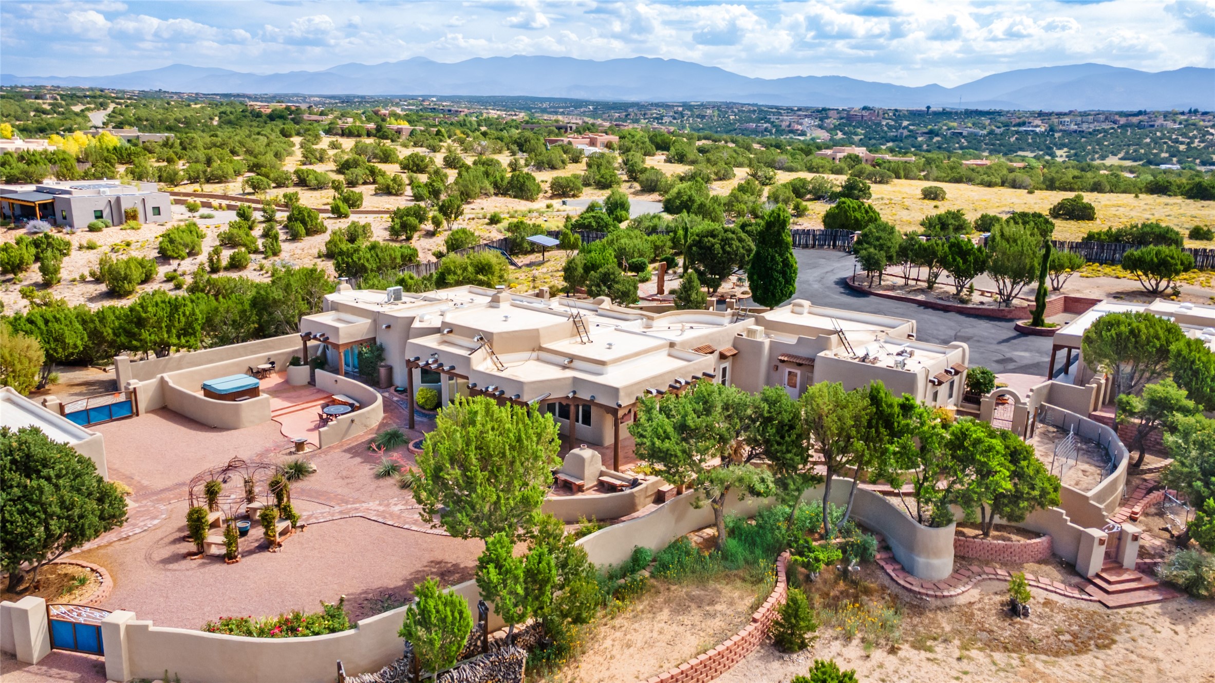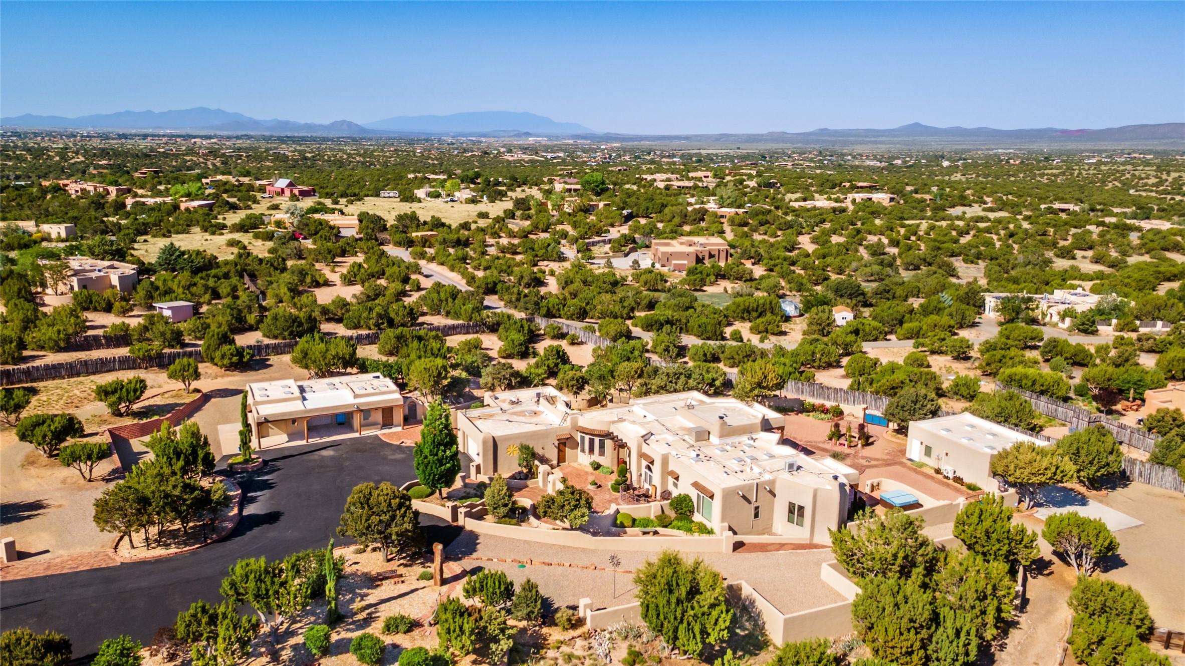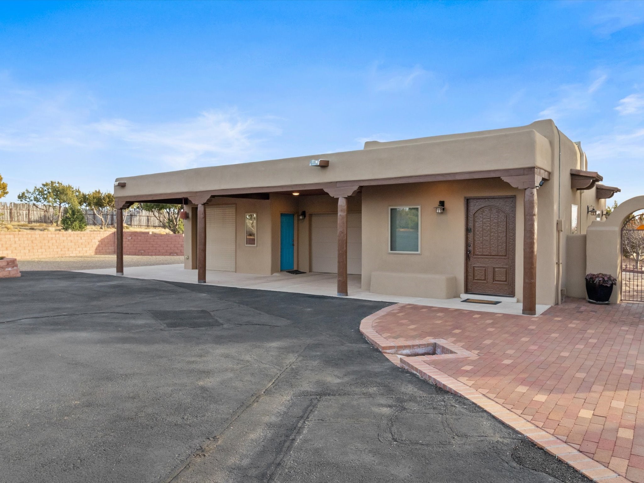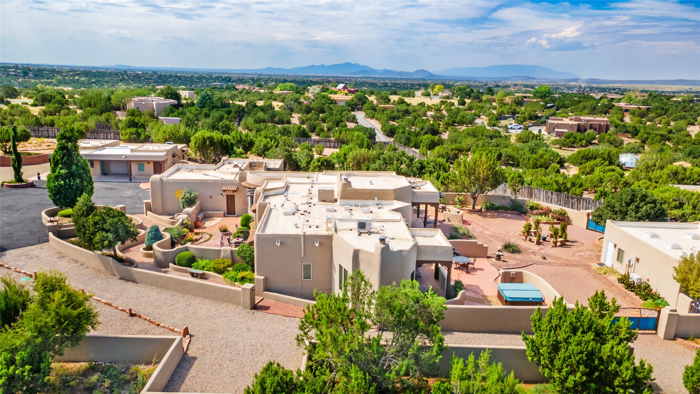 Inviting spaces inside and out, with incredible views all around. Just what you have been searching for! Quality construction placed perfectly on this 2.5 acre lot takes full advantage of our beautiful Sangre De Cristos, Ortiz, Sandia and Jemez mountains with breathtaking sunrises and sunsets. The floor plan welcomes unique and grand spacious areas of a peaceful home or generous areas for entertaining. Large pine vega beams/corbels accents throughout, large windows capture warm light and amazing mountainous views. Stylish kitchen with granite countertops, stainless steel appliances, maple cabinetry with high cabinets affixed with stunning stamped tin fronts allow versatility for all occasions. Foyer leads into a gorgeous Kiva fireplace in the living room. The master bedroom provides a relaxing oasis with its own sitting area and Kiva fireplace, a beautiful open bathroom space, walk-in closet and personal door to the portal with immediate access to an outdoor hot tub. WIRSBO PEX tubing keeps the radiant floor warm during the winter season. Outside, 3 Spanish heritage portals are enhanced with pine columns, beams/corbels and brick floors. A 2-car garage provides entry to the kitchen. The meticulously landscaped yard boasts an underground sprinkler system with a drip system keeping trees, bushes and flowers lush and beautiful. Front courtyard large area with outdoor table/chairs embraced by a raised circular iron fence.The expansive walkways challenge the square footage of the interior. Coordinating with walkways, over 1,200 linear feet of beautiful stucco walls and terraces adorn the outside. A coyote fence surrounds a spacious 2.5 acre lot with 2-sided colored entry gate requiring code access, along with a pedestrian gate similarly locked. ADT alarms wired for intruders and fire/CO1 alarms are used in the house and outbuildings. This home is truly breathtaking and an absolute must-see to appreciate all its beauty. Schedule your tour today!